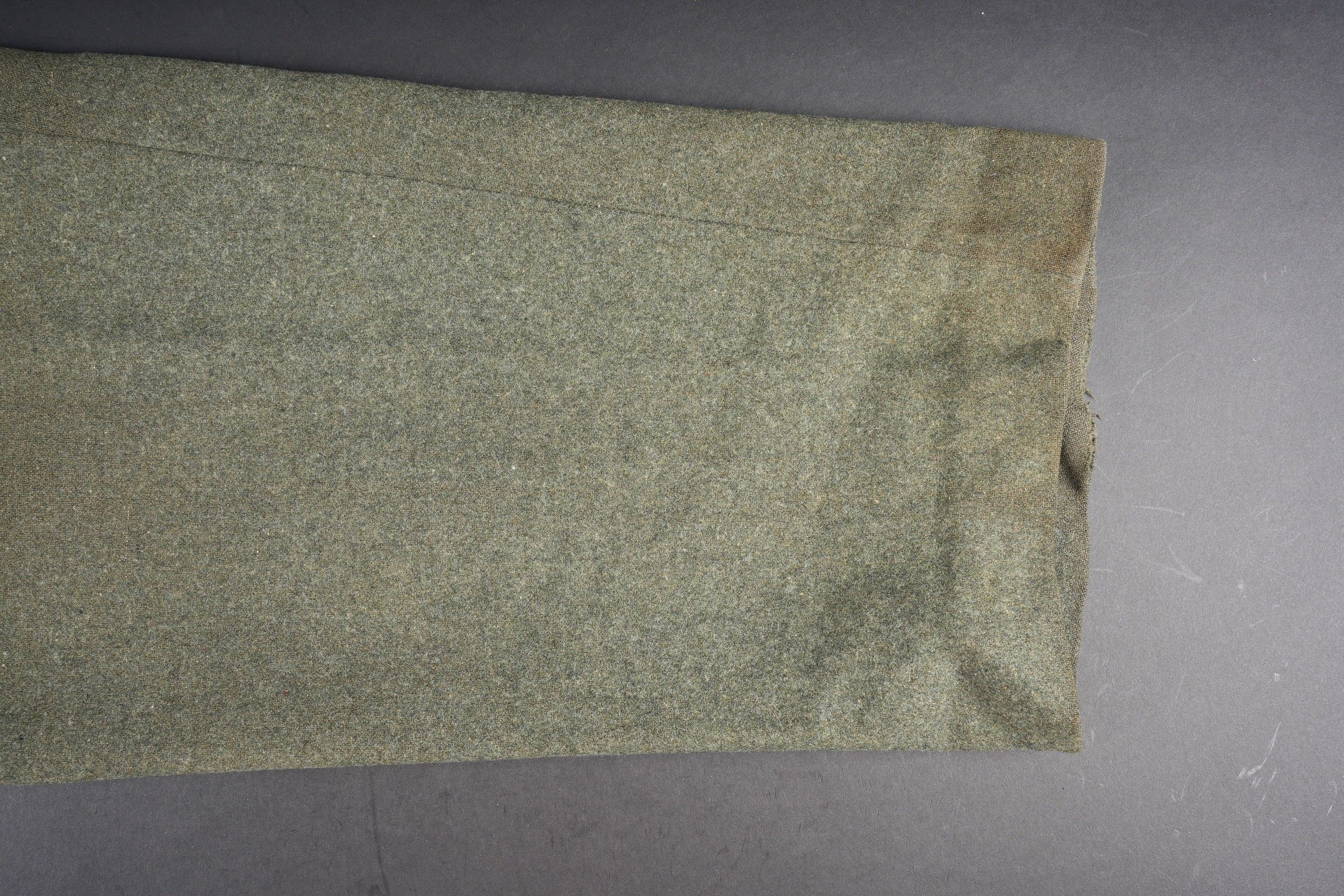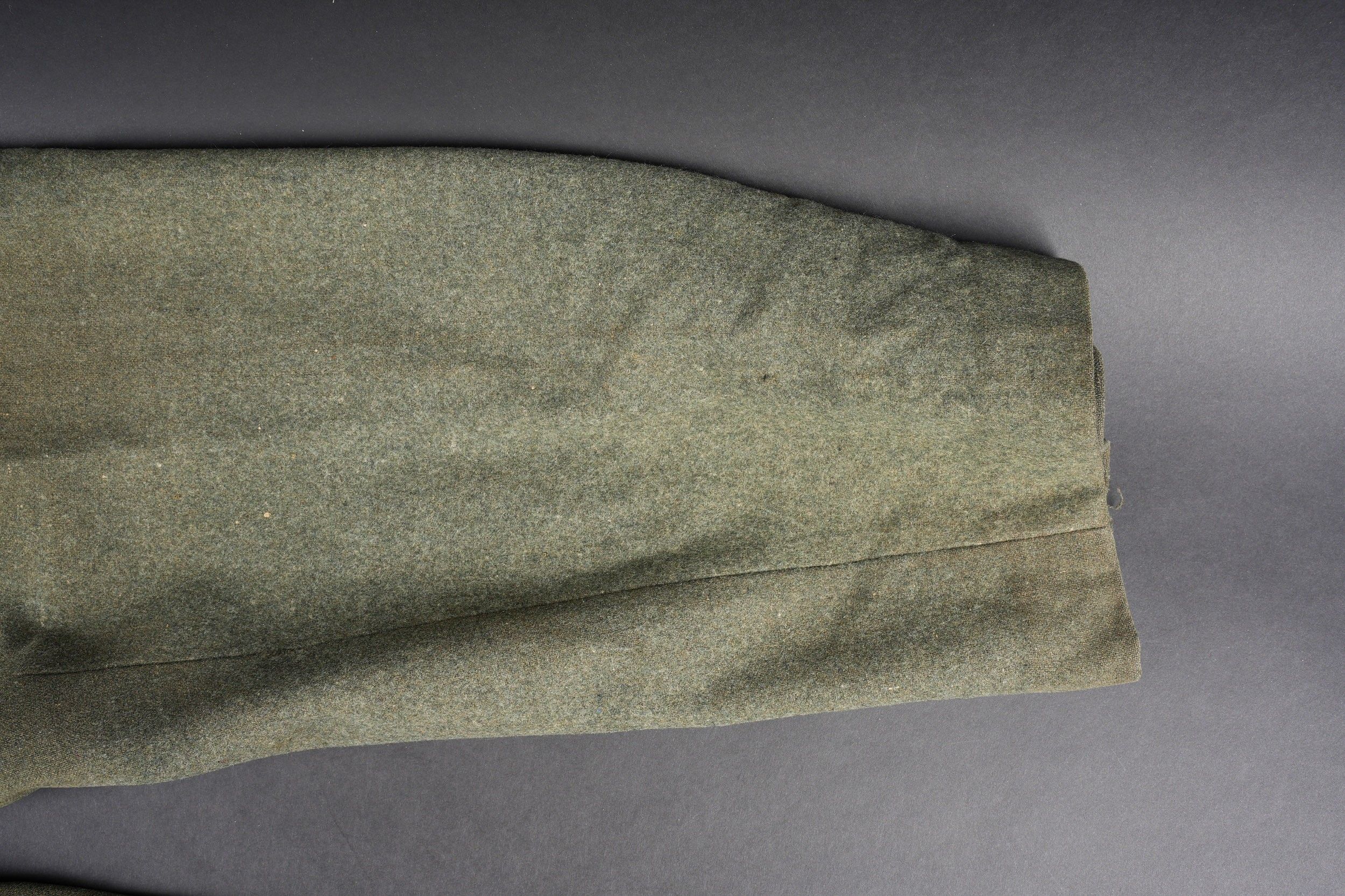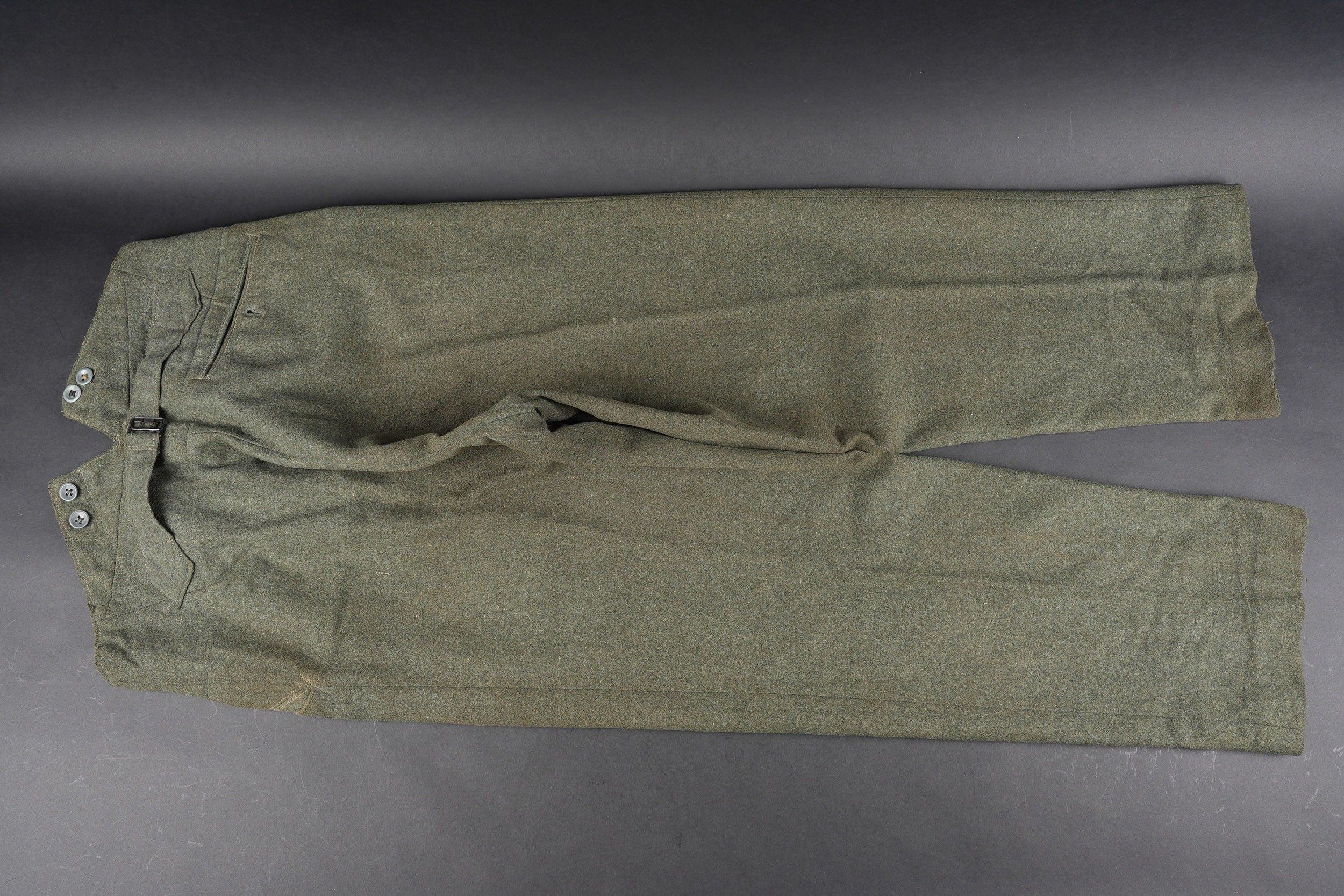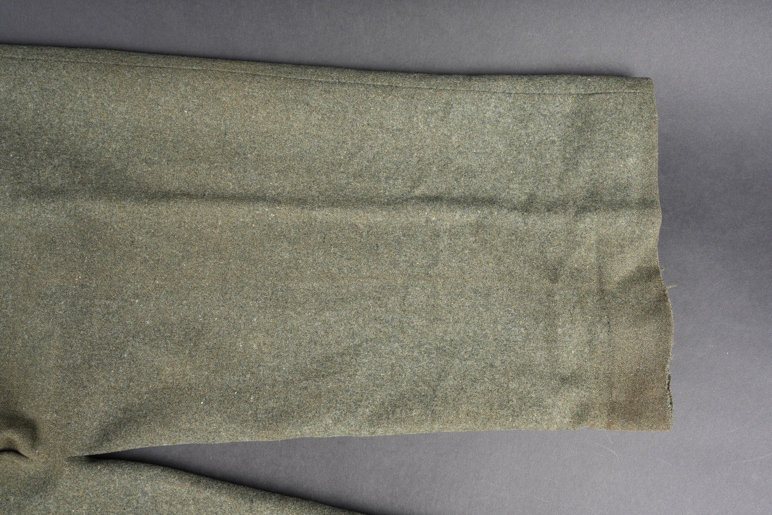 Heer M-40 trousers. Feldgrau cloth, all buttons present. Worn hem at bottom of legs. Martingale complete. Interior lined in white cotton fabric. Manufacturer's markings illegible. Size markings 78 88 0 111 102 W42. There is some wear and patina to the garment, as well as discrete moth marks. Condition II+. Heer M40 trousers. Made of Feldgrau wool, all buttons present. Hem worn at the leg bottoms. Martingale complete. White cotton lining. Maker's marks illegible. Size markings 78 88 0 111 102 W42. Some wear, patina, and minor moth traces. Condition II+.