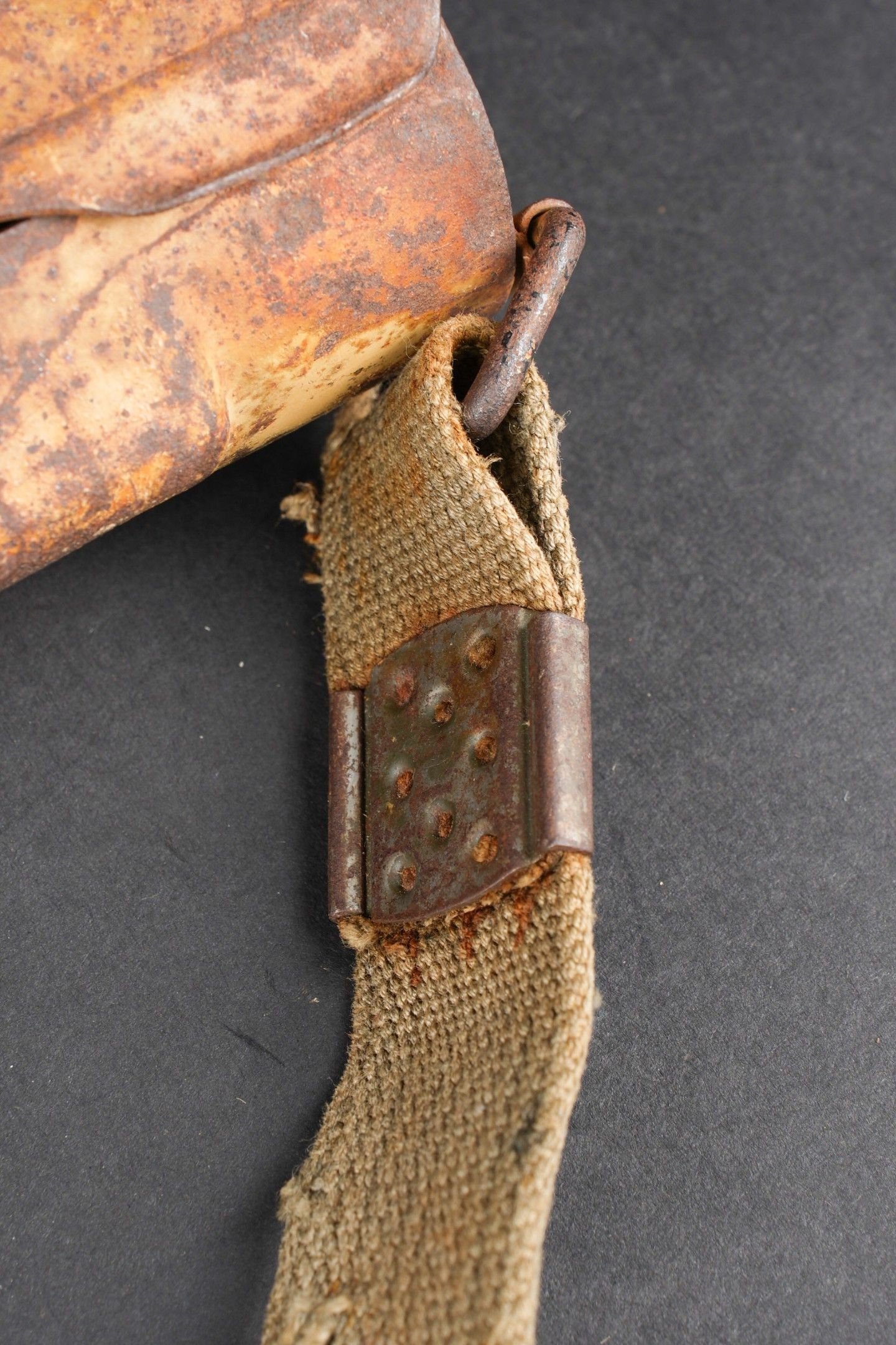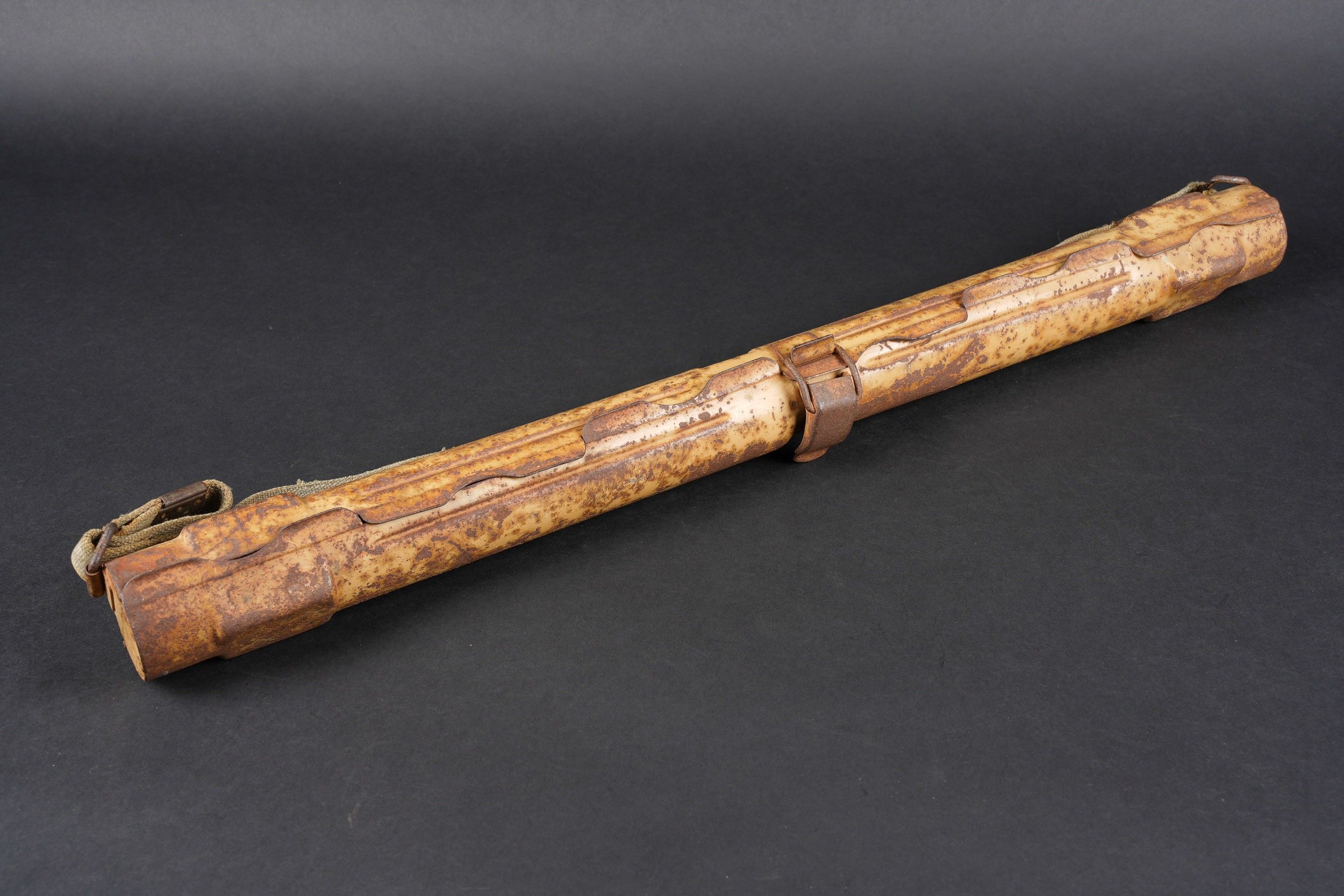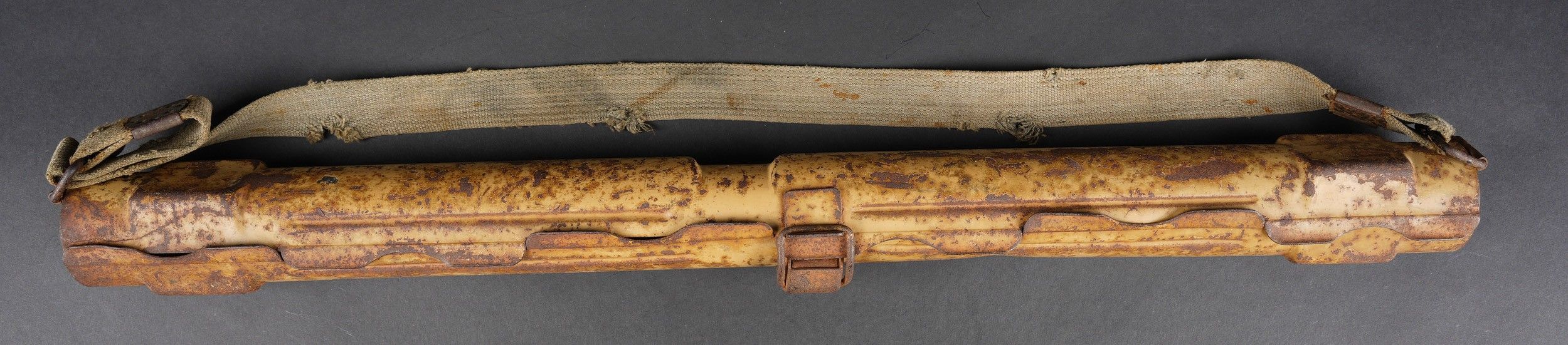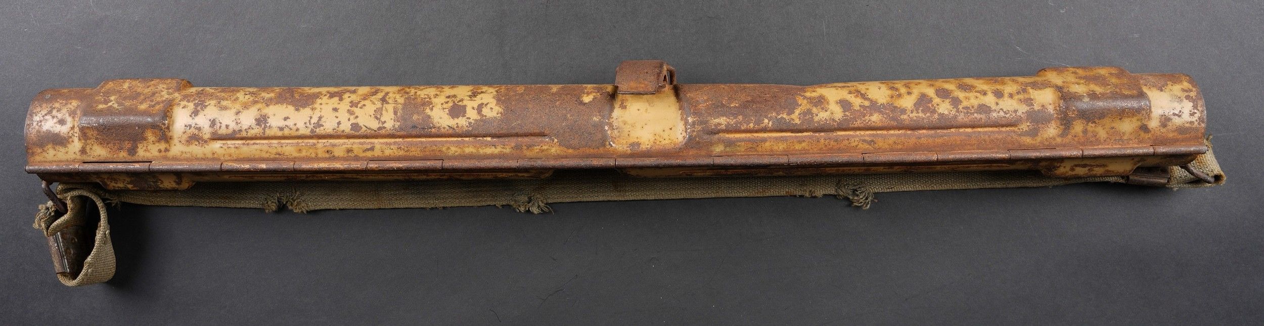 MG 3442 gun carrier. Made of metal. The locking hook is complete. 60% sand yellow paint. Some dents throughout. Interior also has sandy yellow paint. Made by Lauf Schützer 43 BRC. The original shoulder strap is complete, with a few visible tears. The metal reinforcements are well marked LUX. Some wear and patina. Condition II+. MG 3442 barrel carrier. Metal construction with complete locking latch. 60% tan paint remaining. Some dents throughout. Interior also painted tan. Marked Lauf Schützer 43 BRC. Original carrying strap complete with minor fraying. Metal fittings marked LUX. Shows wear and patina. Condition II+.