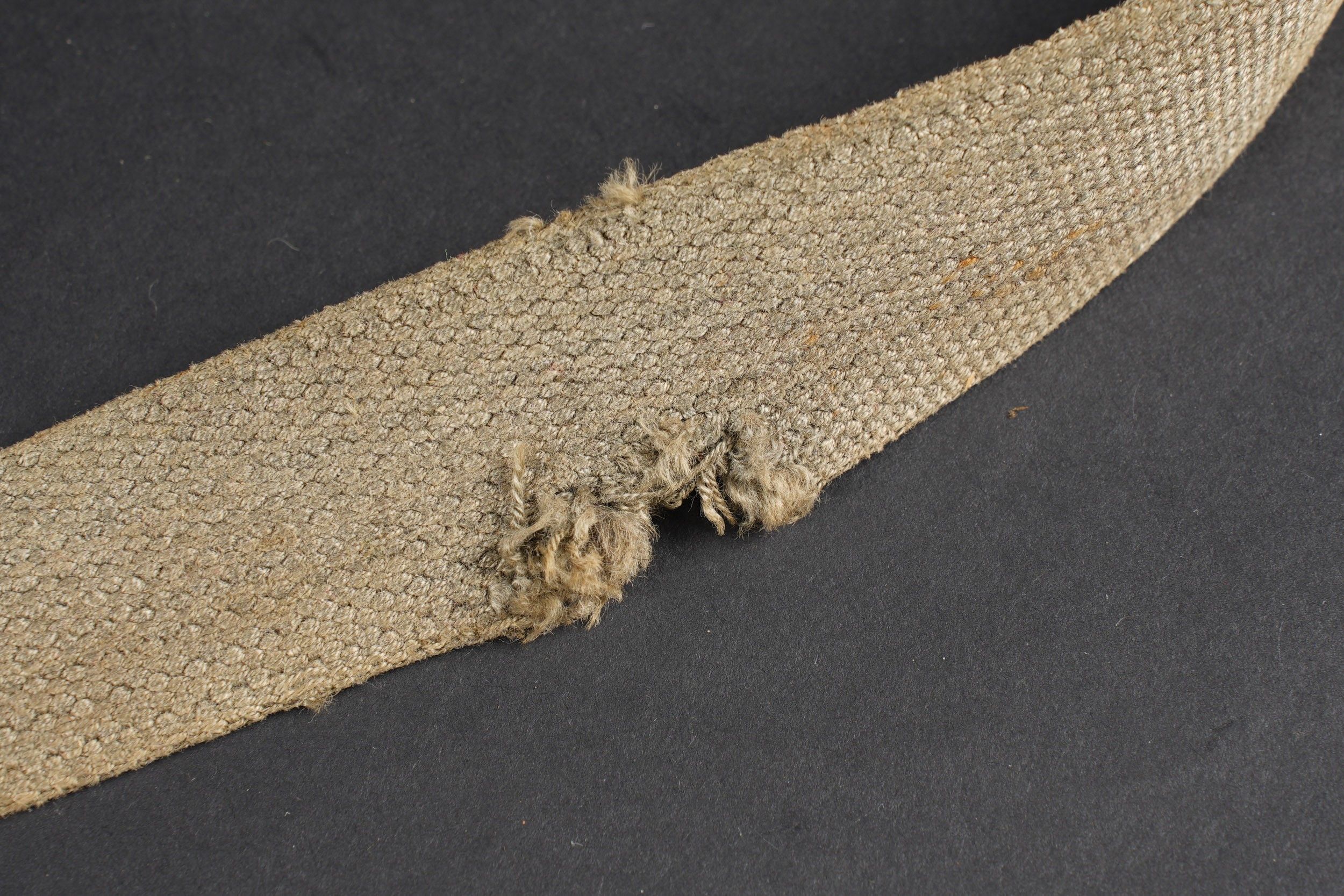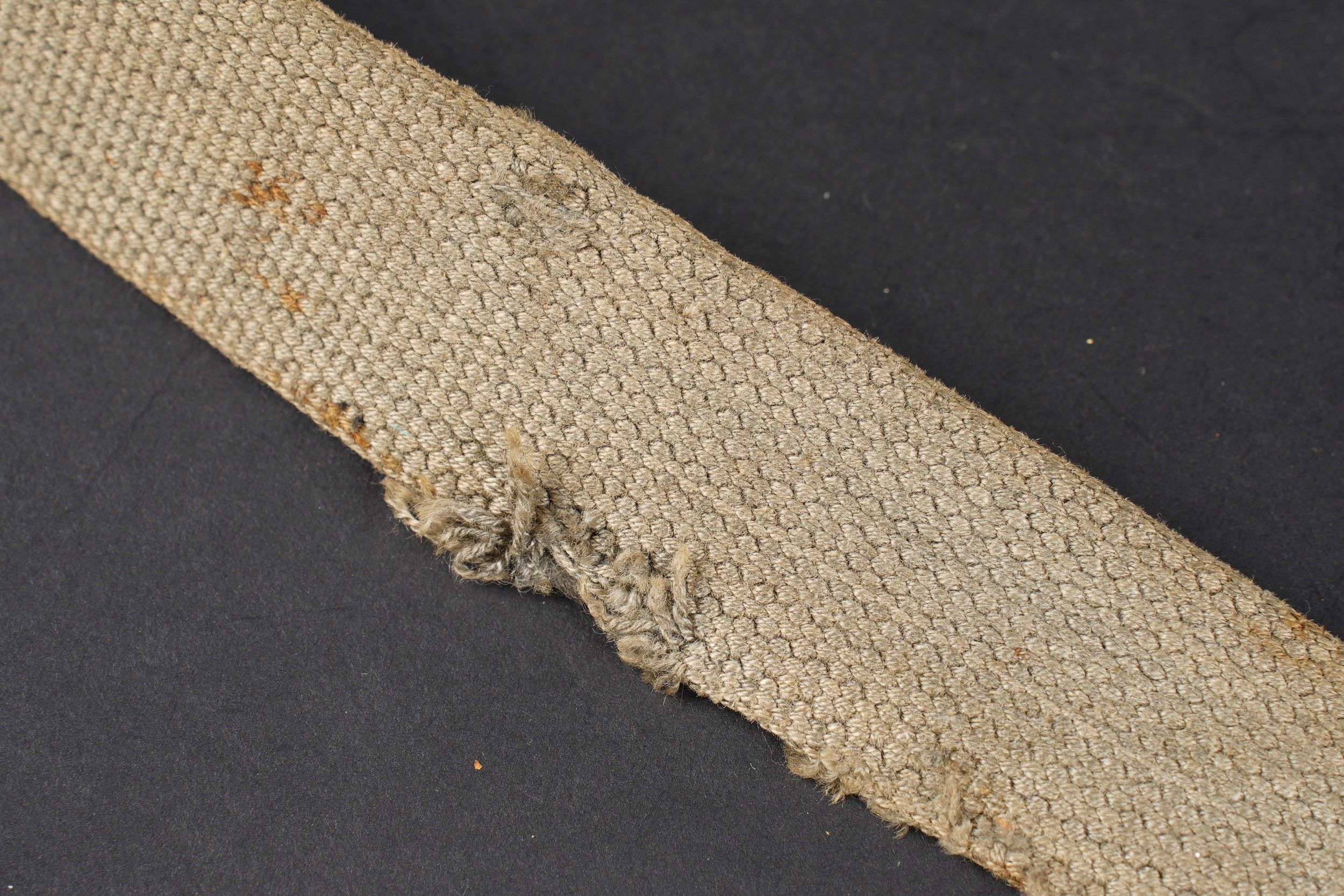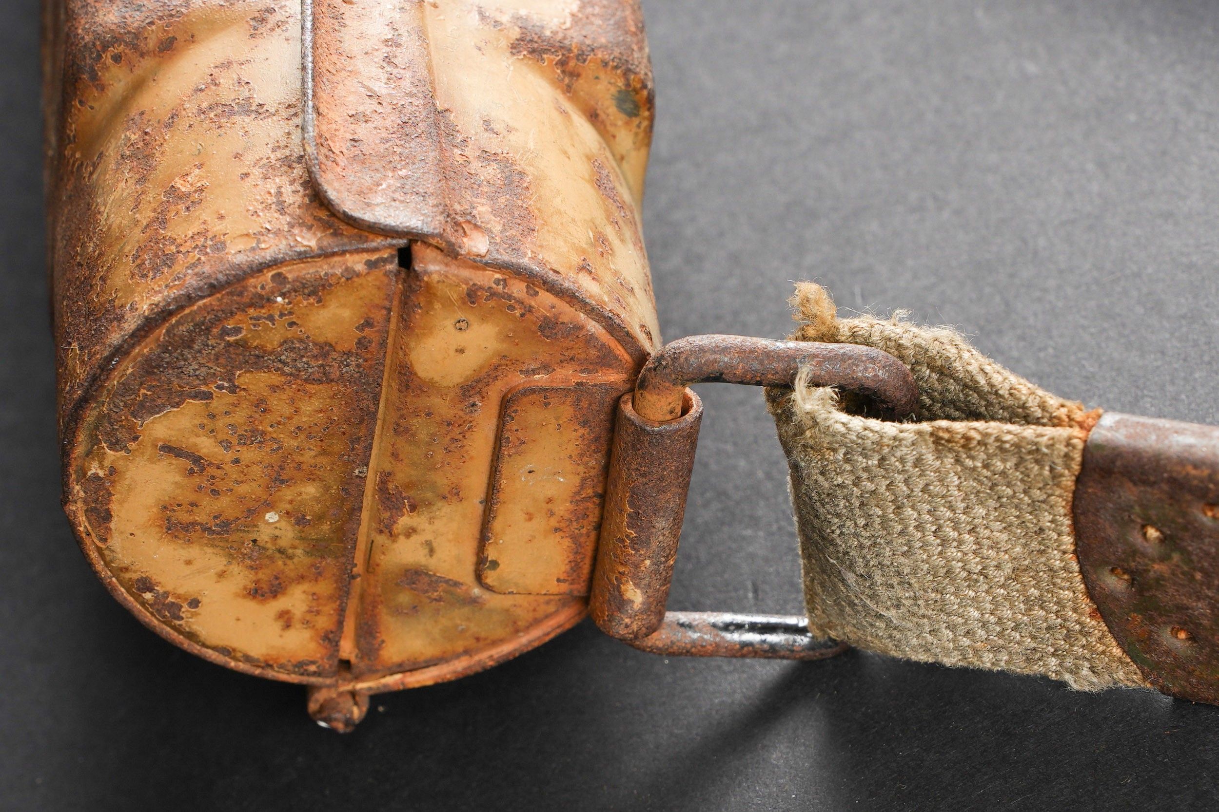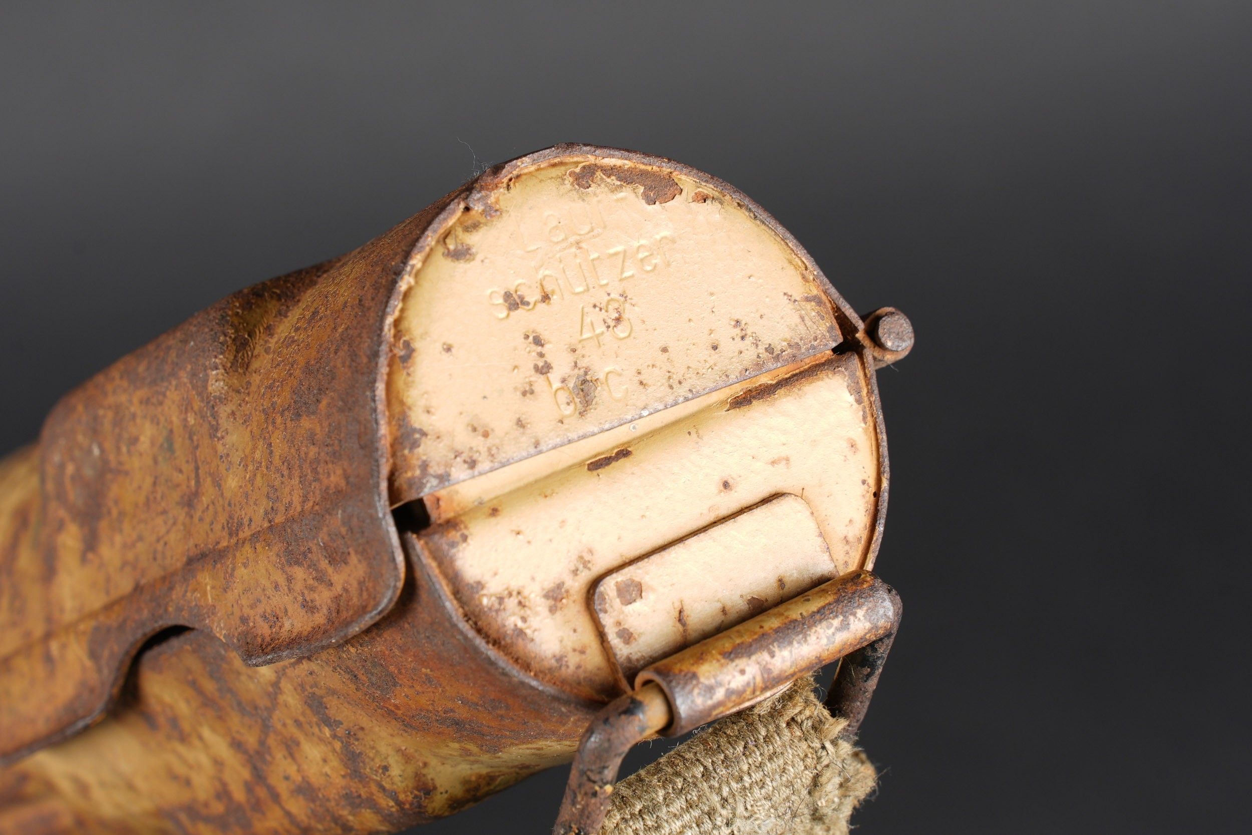 MG 3442 gun carrier. Made of metal. The locking hook is complete. 60% sand yellow paint. Some dents throughout. Interior also has sandy yellow paint. Made by Lauf Schützer 43 BRC. The original shoulder strap is complete, with a few visible tears. The metal reinforcements are well marked LUX. Some wear and patina. Condition II+. MG 3442 barrel carrier. Metal construction with complete locking latch. 60% tan paint remaining. Some dents throughout. Interior also painted tan. Marked Lauf Schützer 43 BRC. Original carrying strap complete with minor fraying. Metal fittings marked LUX. Shows wear and patina. Condition II+.
