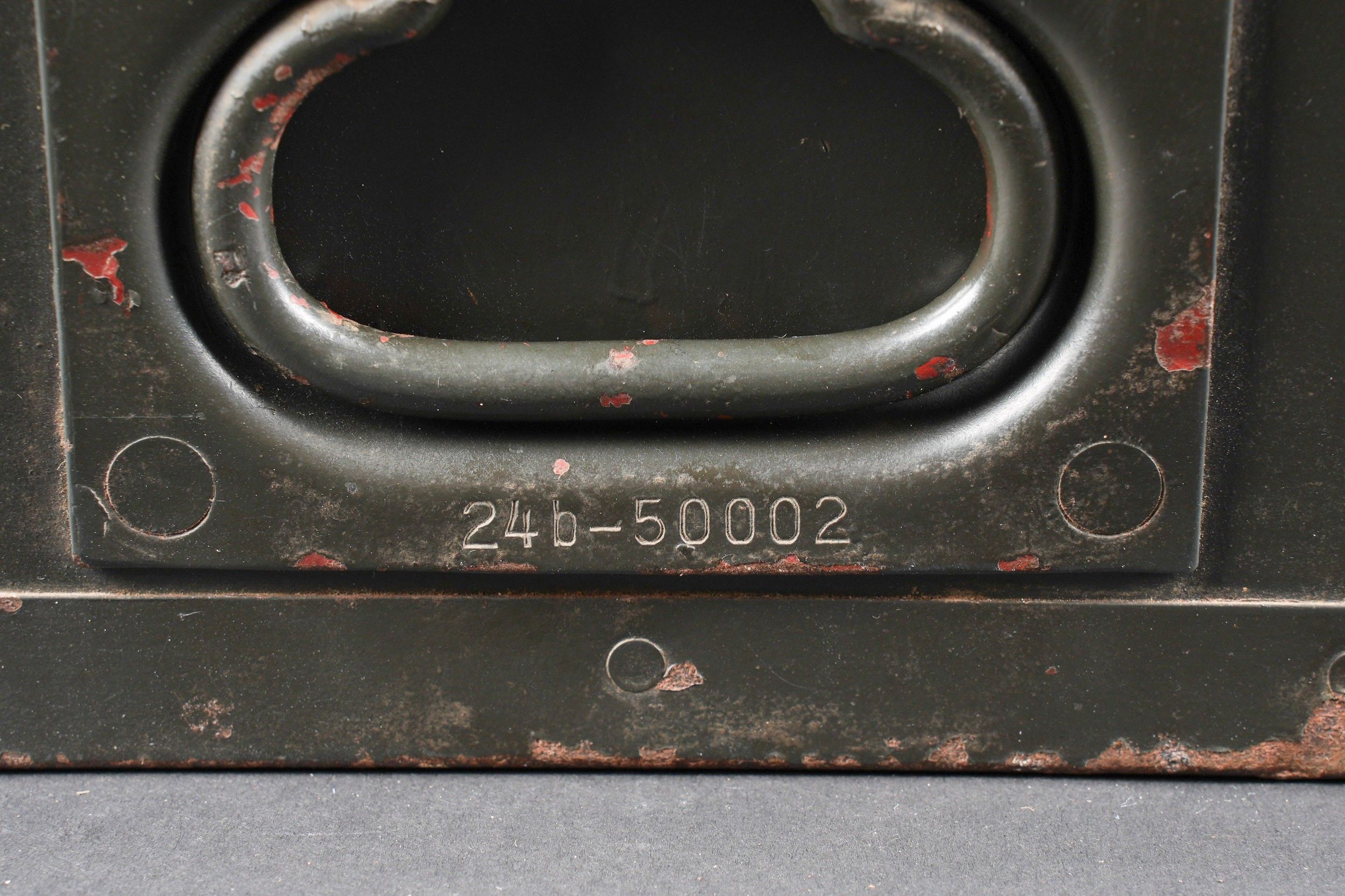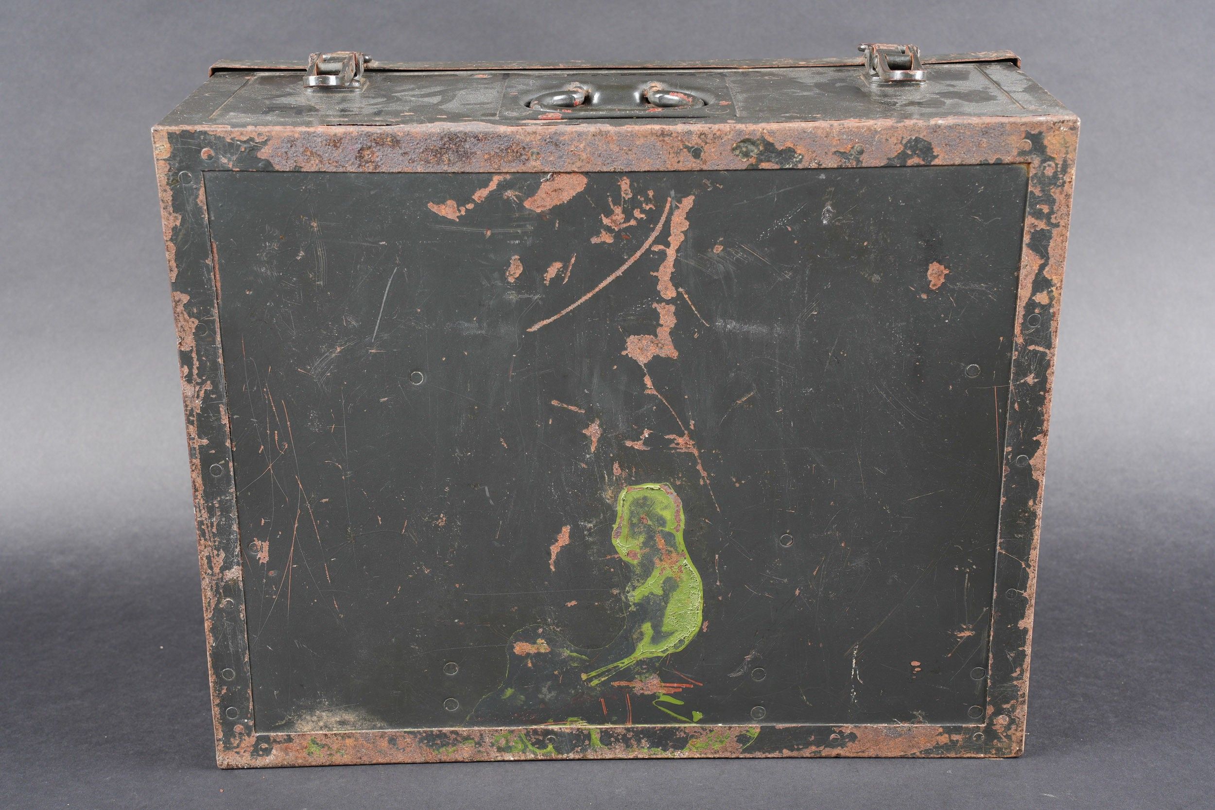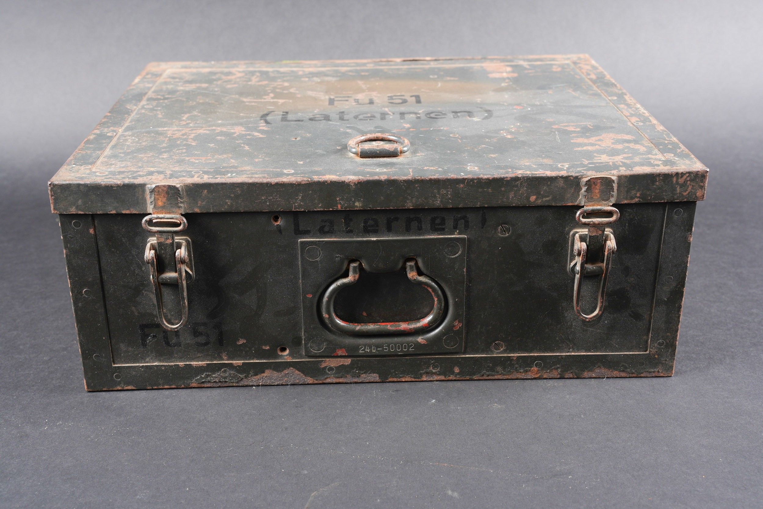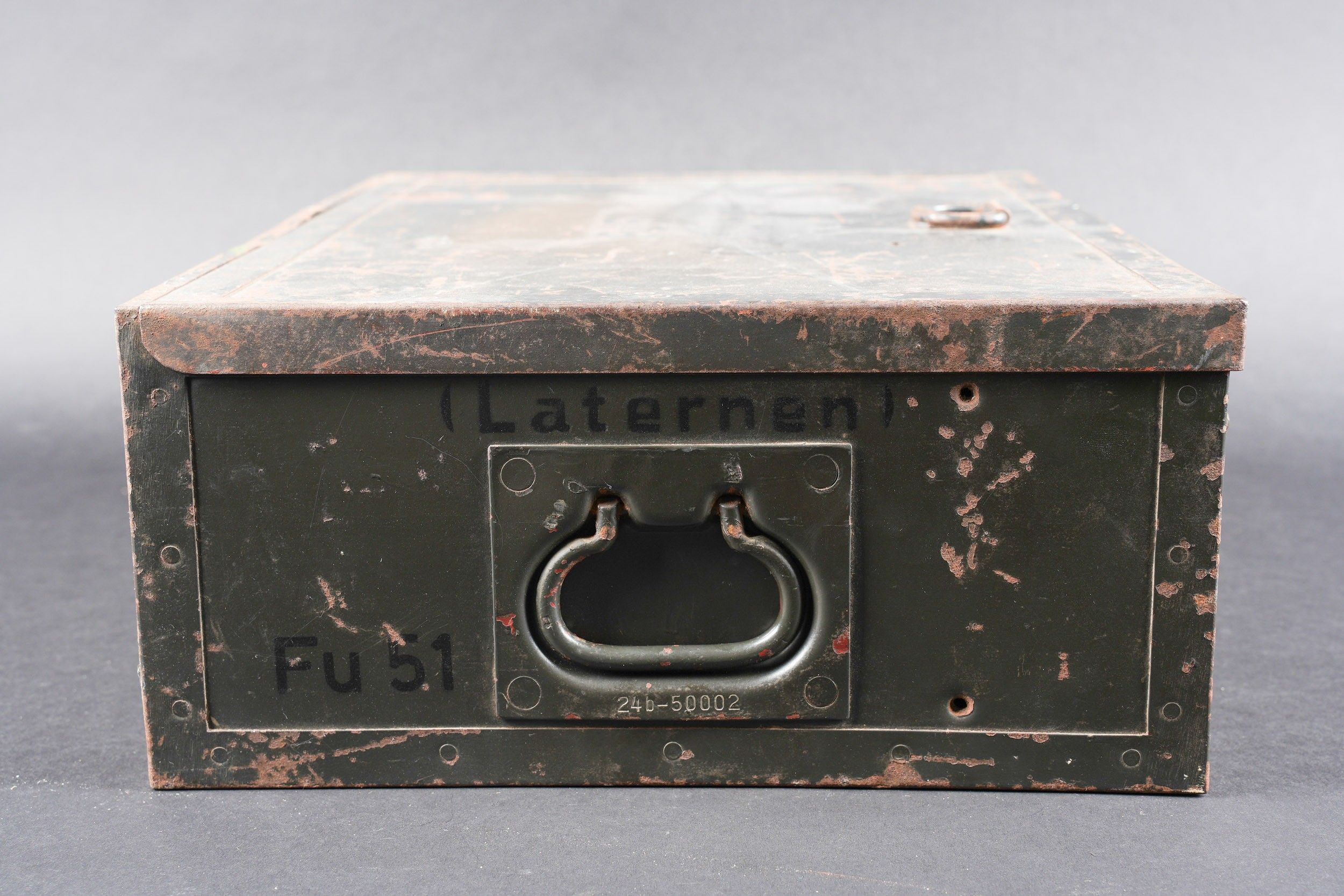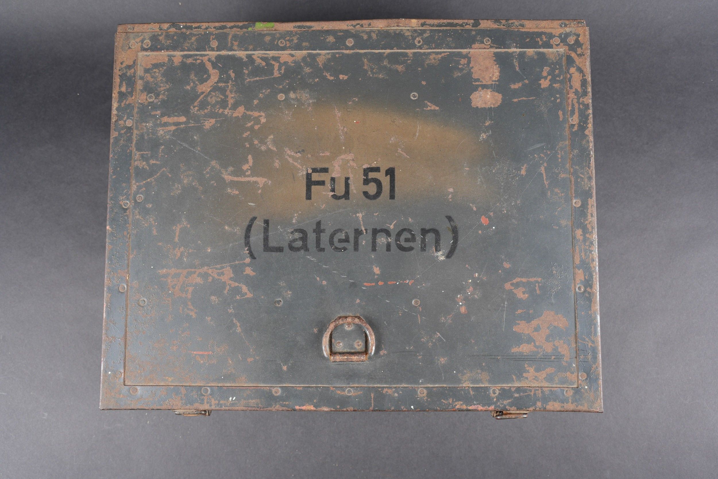 FU 51 lantern in case. Beautiful wooden case with metal reinforcements. 85% Feldgrau paintwork. Lid and sides marked FU 51 Lanternen. The locking hooks are functional. The carrying handle is present. Handle markings 24B-50002. Waa eagle present under lid, dated 1939. Containing two bakelite lanterns with carrying handles and fixing hook. Carbide filters present. Two bakelite cans are present and complete with caps. A metal crate, the closing hook is functional. All accessories are missing. The internal racks are missing. Some wear and patina to be noted. Condition II+. FU 51 lantern in box Fine wooden box with metal reinforcements, 85% Feldgrau paint remaining. Lid and sides marked FU 51 Lanternen. Functional closure hooks and carrying handle. Handle marked 24B-50002. Eagle Waa stamp under the lid, dated 1939. Contains two Bakelite lanterns with carrying handles and hanging hooks, carbide filters, two Bakelite fuel cans with caps, and one metal box with functional latch. Missing all small accessories and internal racks. Shows some wear and patina. Condition II+.