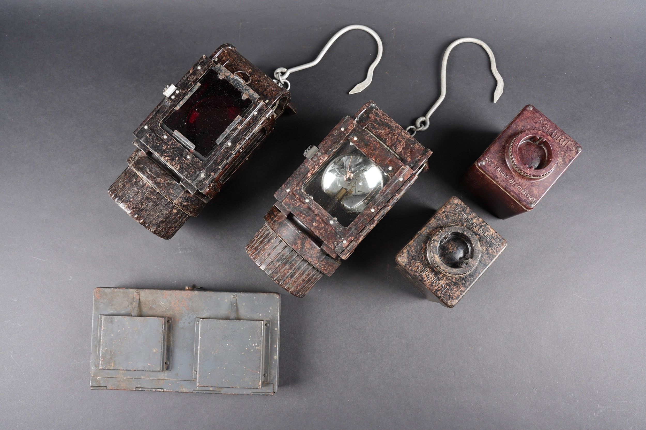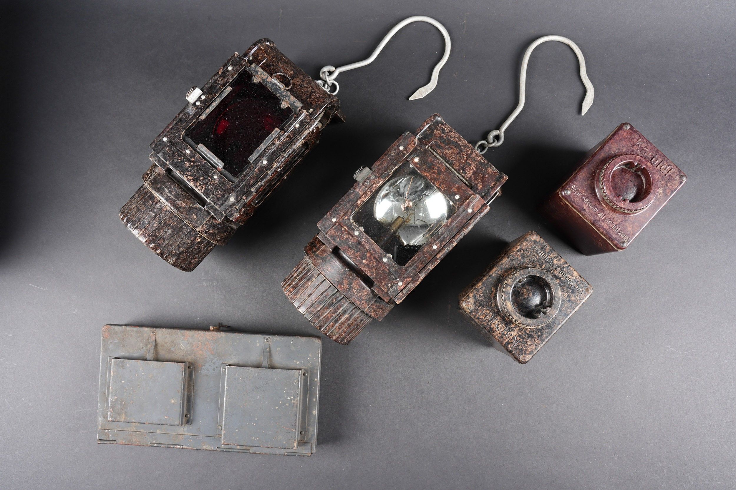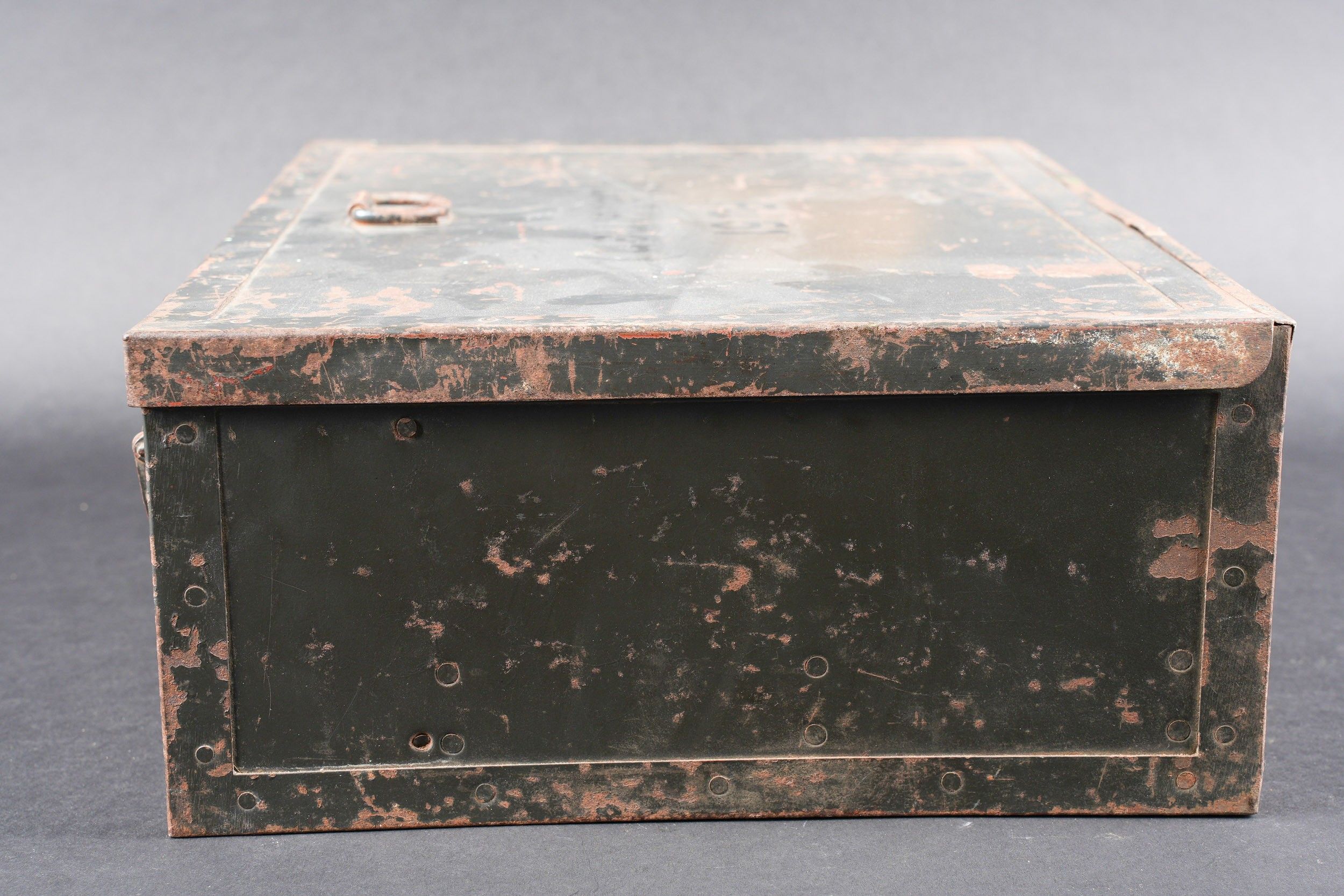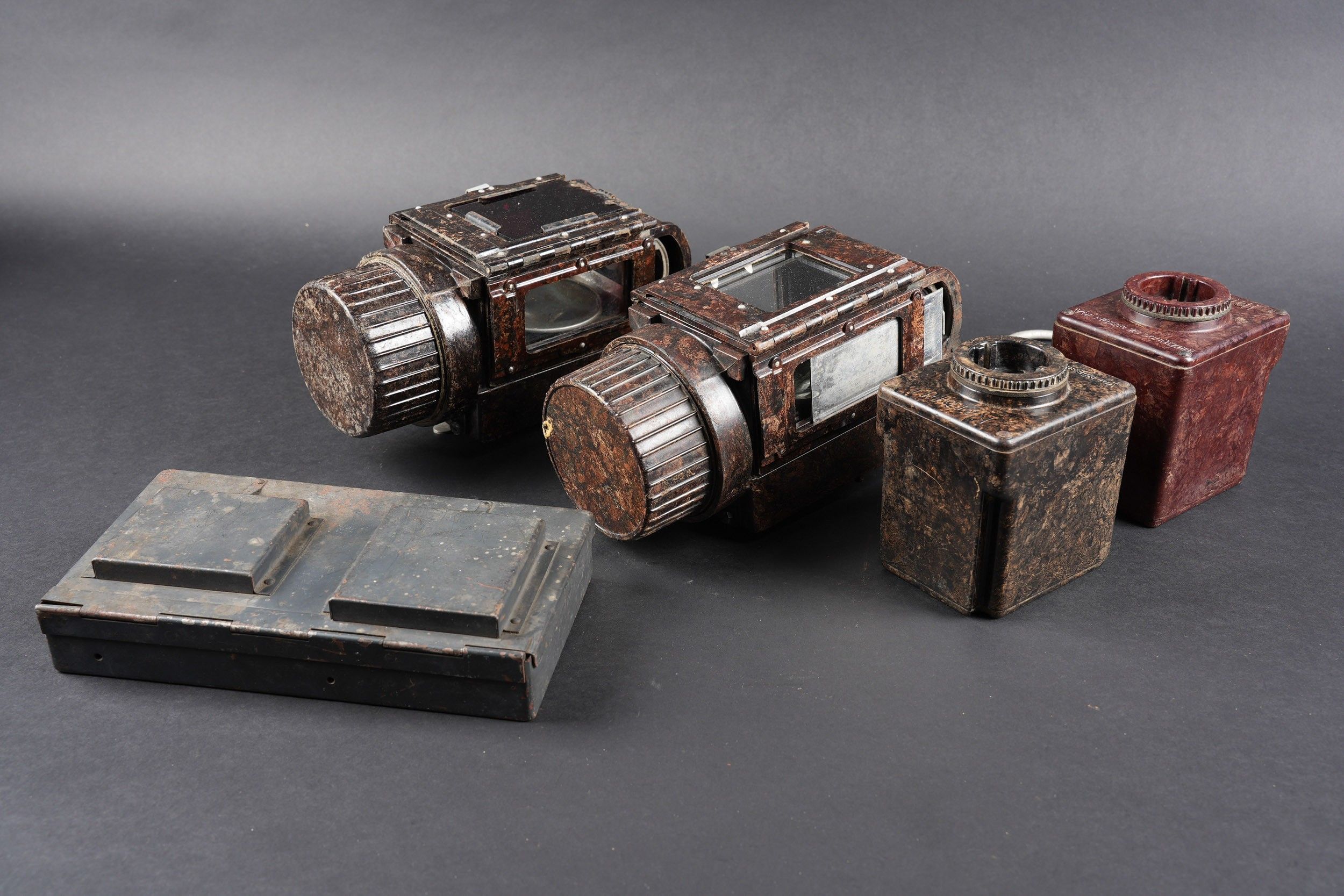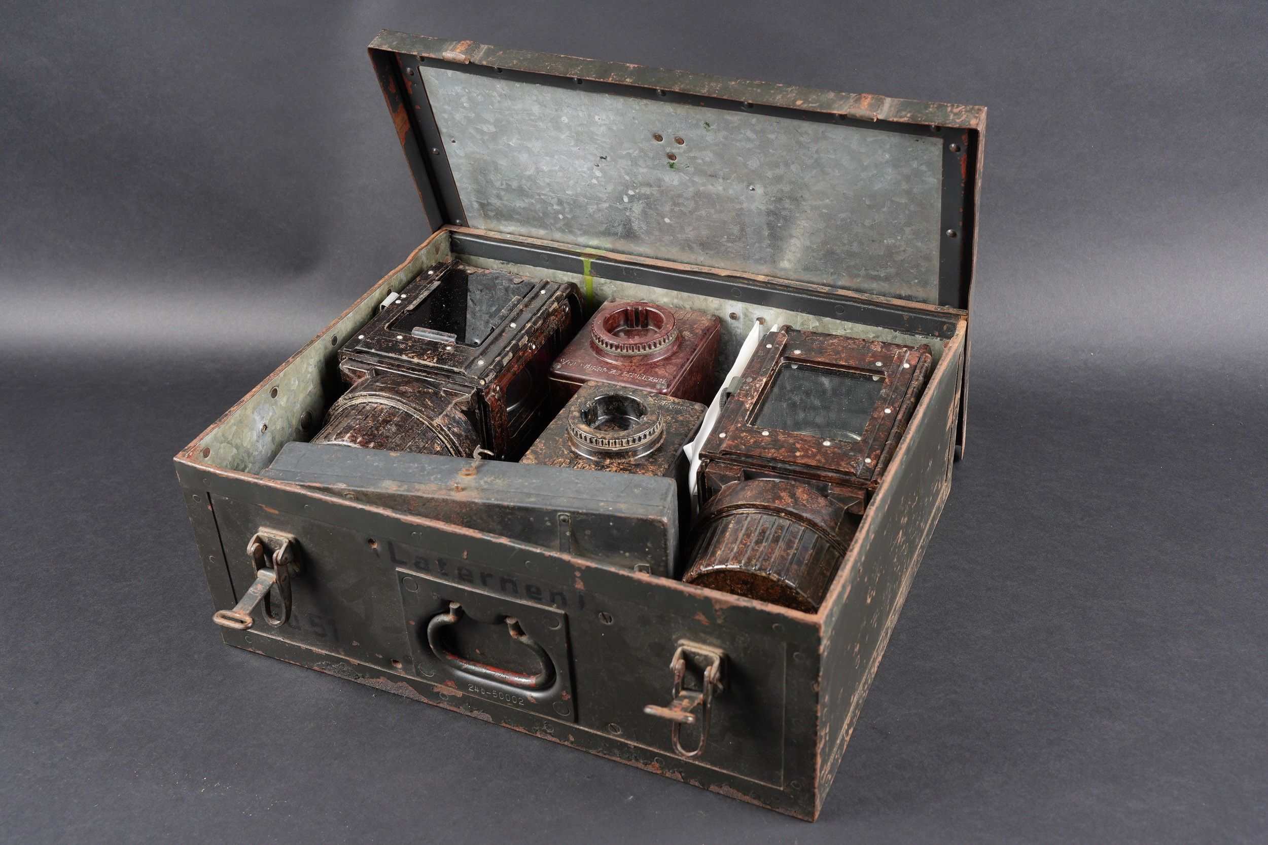 FU 51 lantern in case. Beautiful wooden case with metal reinforcements. 85% Feldgrau paintwork. Lid and sides marked FU 51 Lanternen. The locking hooks are functional. The carrying handle is present. Handle markings 24B-50002. Waa eagle present under lid, dated 1939. Containing two bakelite lanterns with carrying handles and fixing hook. Carbide filters present. Two bakelite cans are present and complete with caps. A metal crate, the closing hook is functional. All accessories are missing. The internal racks are missing. Some wear and patina to be noted. Condition II+. FU 51 lantern in box Fine wooden box with metal reinforcements, 85% Feldgrau paint remaining. Lid and sides marked FU 51 Lanternen. Functional closure hooks and carrying handle. Handle marked 24B-50002. Eagle Waa stamp under the lid, dated 1939. Contains two Bakelite lanterns with carrying handles and hanging hooks, carbide filters, two Bakelite fuel cans with caps, and one metal box with functional latch. Missing all small accessories and internal racks. Shows some wear and patina. Condition II+.