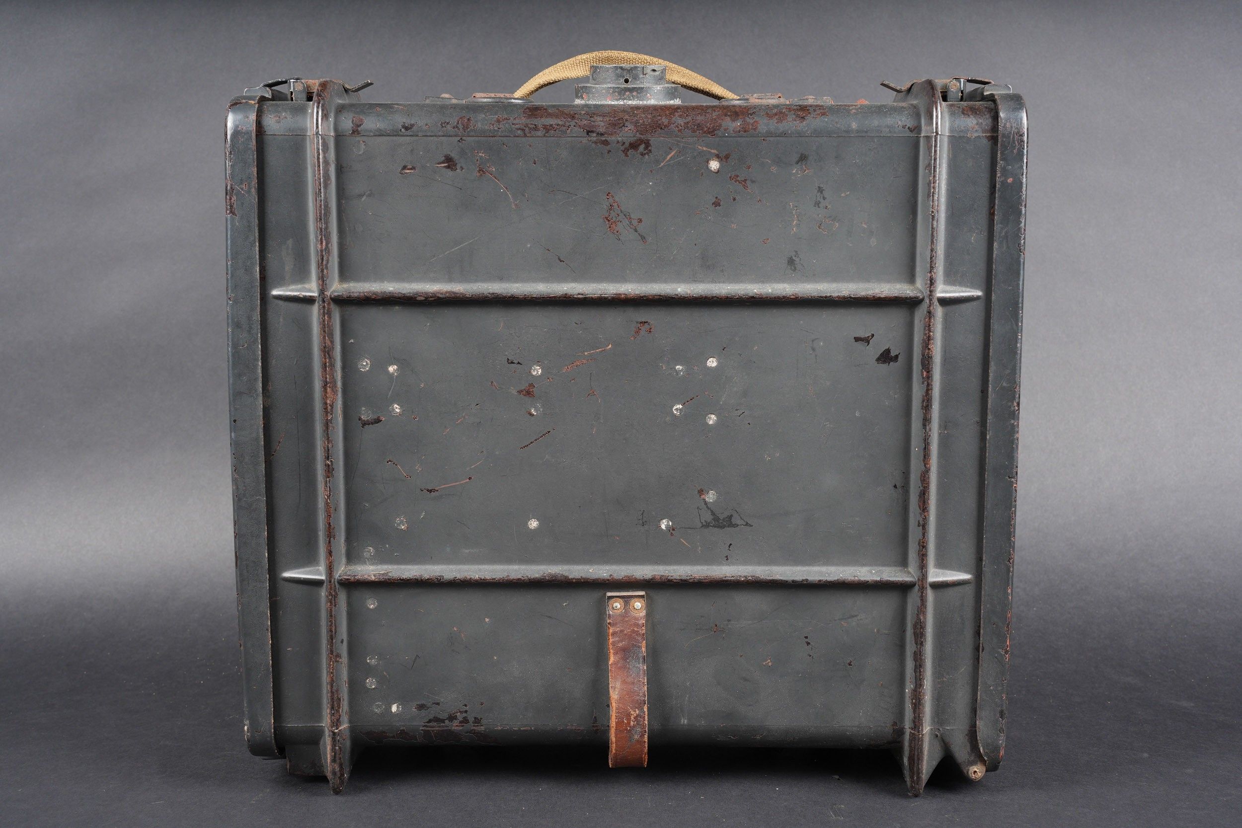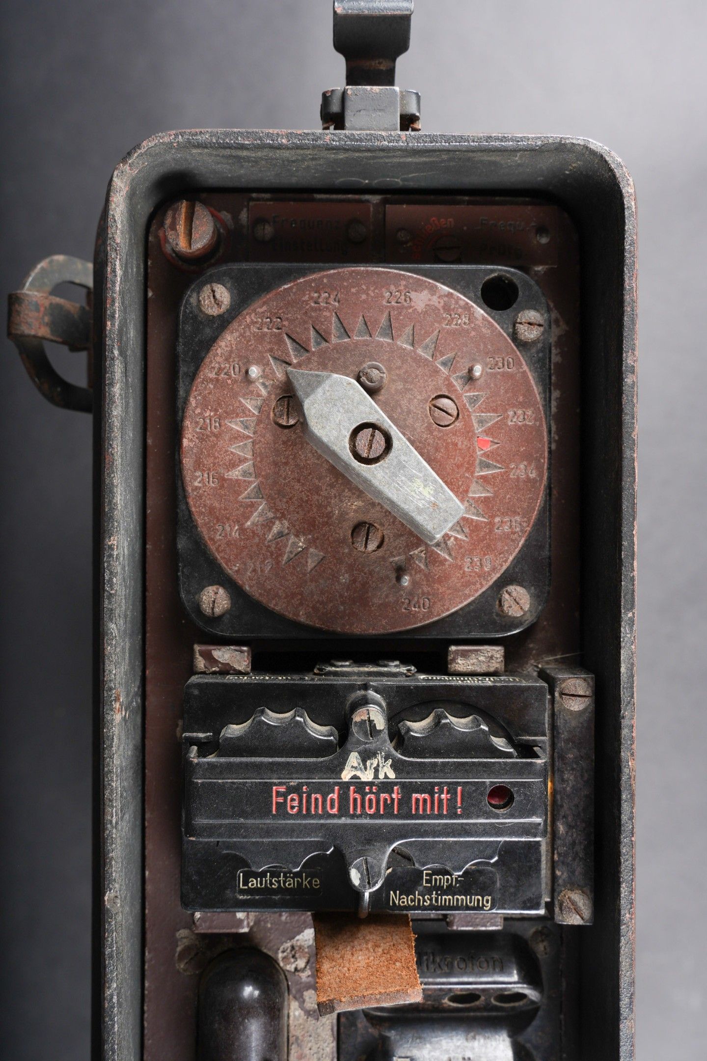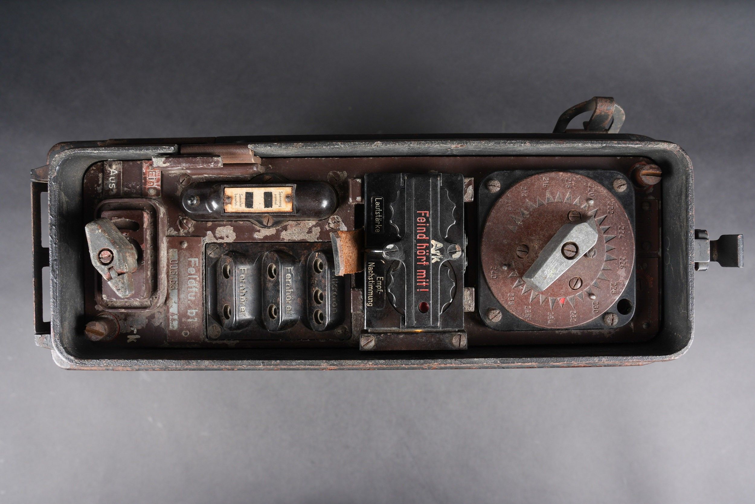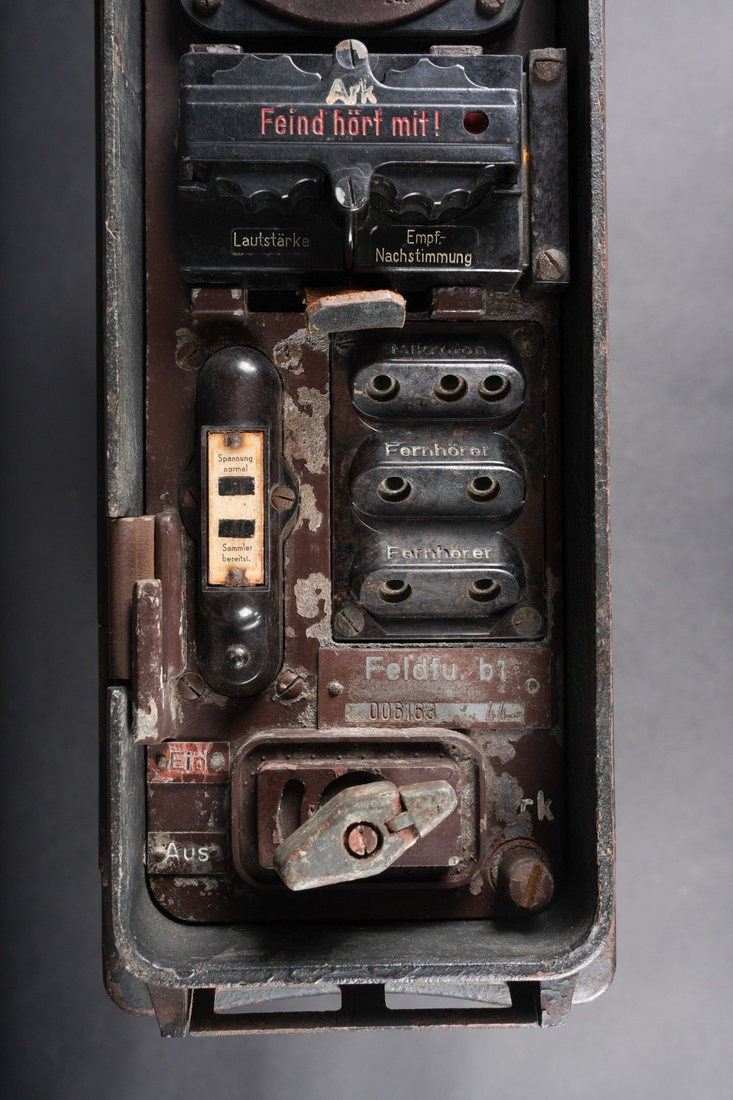German Feld Fu. In bakelite, 70% feldgrau paint. The canvas carrying handle is complete. Lid with two radio code plates. The shoulder strap hooks are present. The shoulder straps are missing. The left front panel is in very good condition, with a few cracks and missing edges and a complete inventory plate. All moving parts are functional. Plaque marked Feld FU BI, number 006163 1944. The voltage indicator is present, as are the microphone and radio headphone sockets. Detachable part of the control panel which includes volume control and frequency setting. Preset frequency control button. Frequency test button. The power switch can be seen through the cover. Opposite side has a red dot and Feldfu marking. All accessories on this side are missing, full inventory plate. The power cable is present. The antenna is missing. Some wear and patina. Condition II+. German Feld Fu Bakelite case with 70% Feldgrau paint. Complete canvas carrying handle. Lid fitted with two radio code plates. Strap hooks present, straps missing. Left panel in very good condition, minor cracks and losses along edges, complete inventory plate. All mechanical parts functional. Plate marked Feld Fu BI Nr. 006163 1944. Voltage indicator present, as well as sockets for microphone and headset. Detachable control panel with volume and frequency controls. Pre-set frequency dial and frequency test button. Power switch visible through the lid. Opposite panel marked with red dot and Feldfu inscription. Missing accessories on this side, complete inventory plate. Power cable present, antenna missing. Shows some wear and patina. Condition II+.