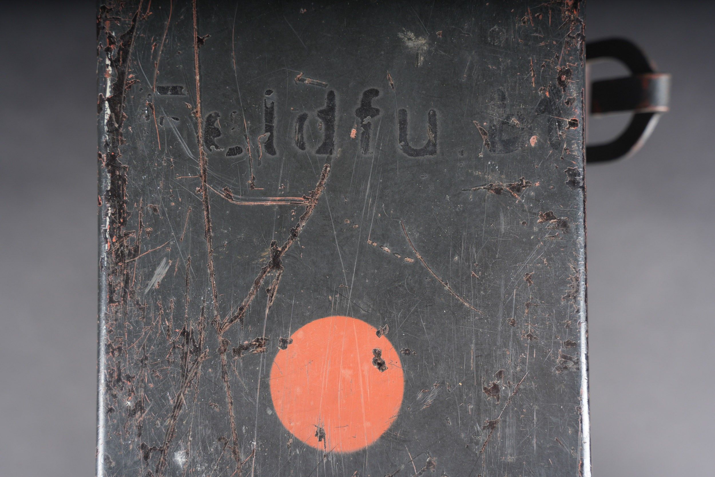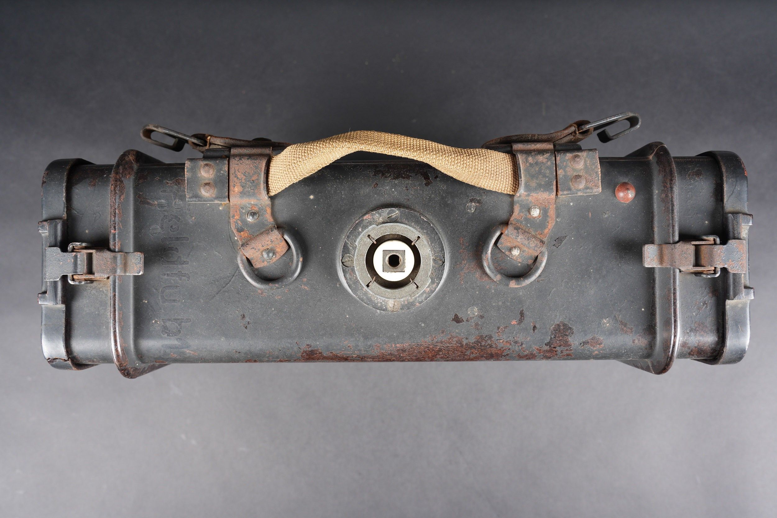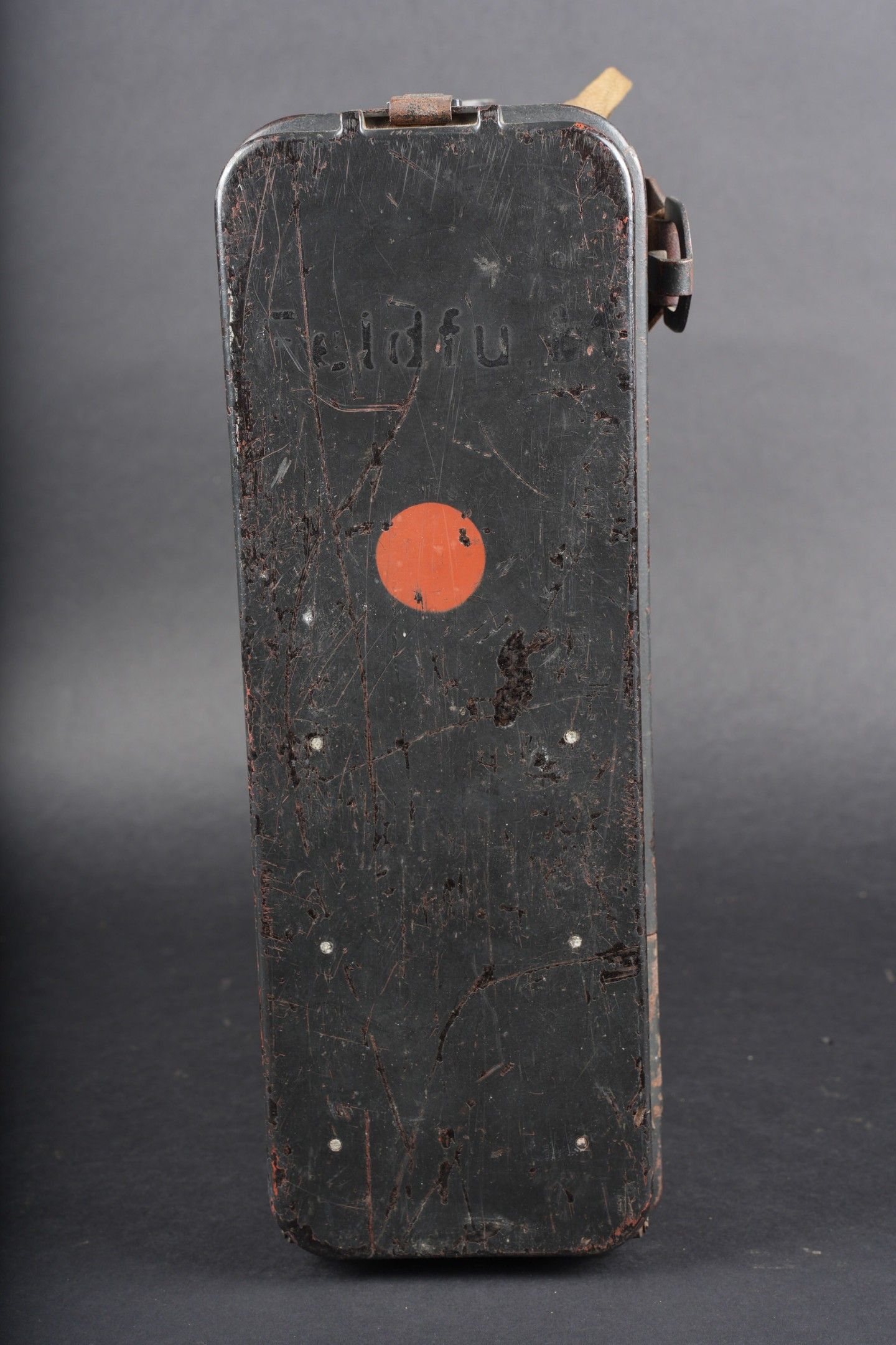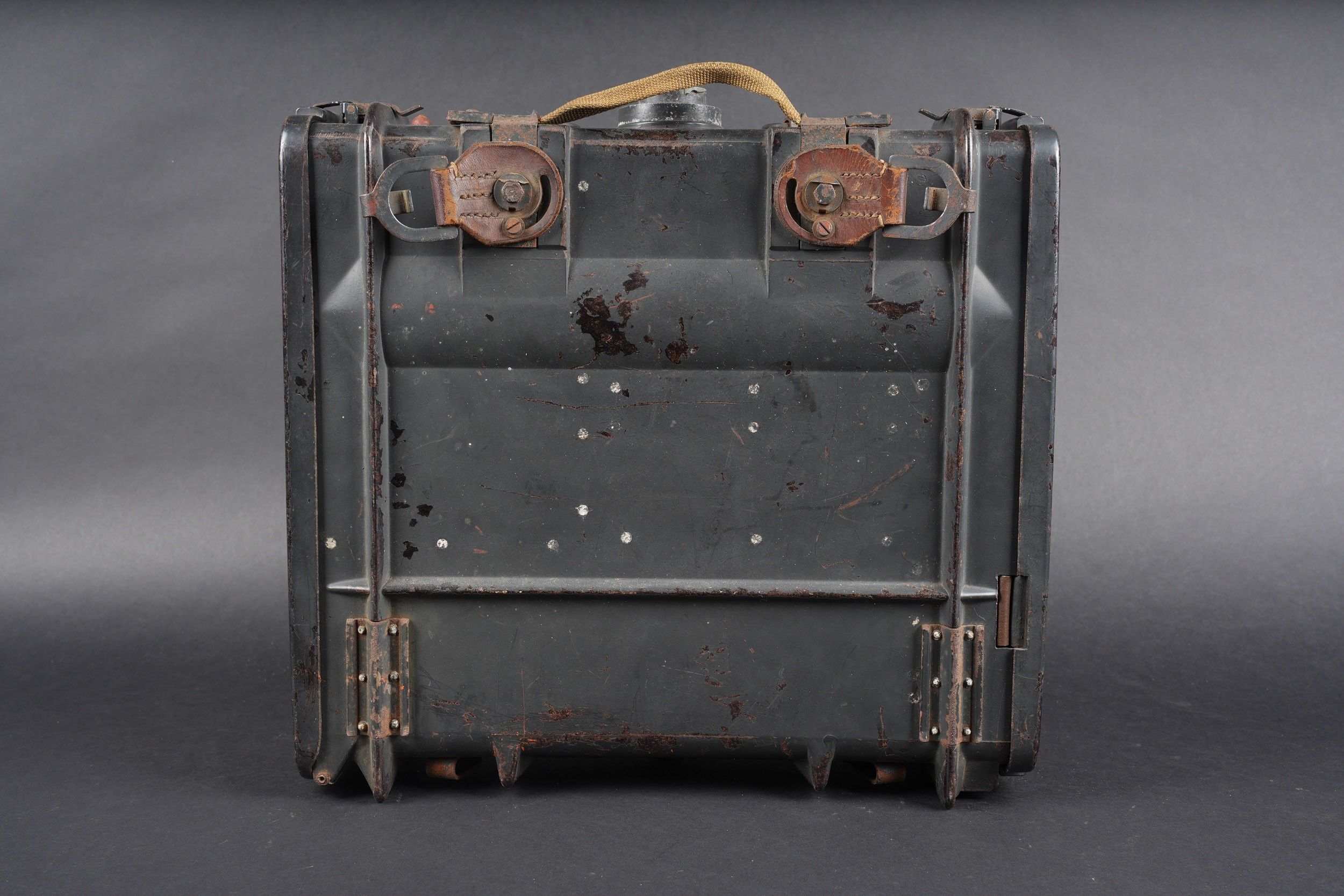 German Feld Fu. In bakelite, 70% feldgrau paint. The canvas carrying handle is complete. Lid with two radio code plates. The shoulder strap hooks are present. The shoulder straps are missing. The left front panel is in very good condition, with a few cracks and missing edges and a complete inventory plate. All moving parts are functional. Plaque marked Feld FU BI, number 006163 1944. The voltage indicator is present, as are the microphone and radio headphone sockets. Detachable part of the control panel which includes volume control and frequency setting. Preset frequency control button. Frequency test button. The power switch can be seen through the cover. Opposite side has a red dot and Feldfu marking. All accessories on this side are missing, full inventory plate. The power cable is present. The antenna is missing. Some wear and patina. Condition II+. German Feld Fu Bakelite case with 70% Feldgrau paint. Complete canvas carrying handle. Lid fitted with two radio code plates. Strap hooks present, straps missing. Left panel in very good condition, minor cracks and losses along edges, complete inventory plate. All mechanical parts functional. Plate marked Feld Fu BI Nr. 006163 1944. Voltage indicator present, as well as sockets for microphone and headset. Detachable control panel with volume and frequency controls. Pre-set frequency dial and frequency test button. Power switch visible through the lid. Opposite panel marked with red dot and Feldfu inscription. Missing accessories on this side, complete inventory plate. Power cable present, antenna missing. Shows some wear and patina. Condition II+.