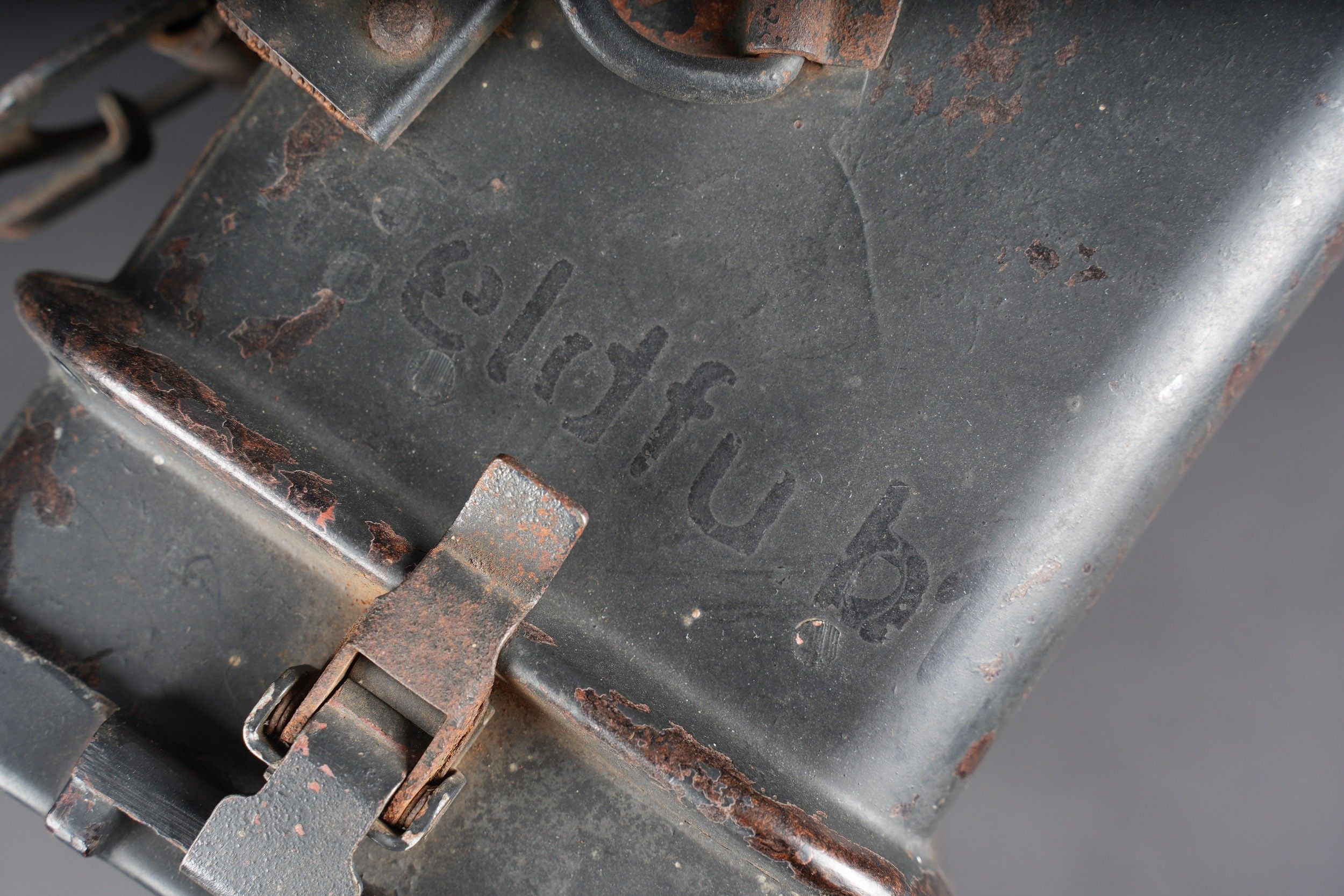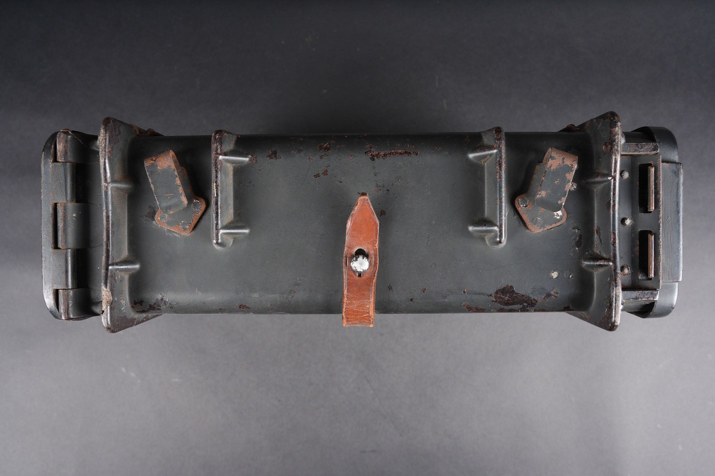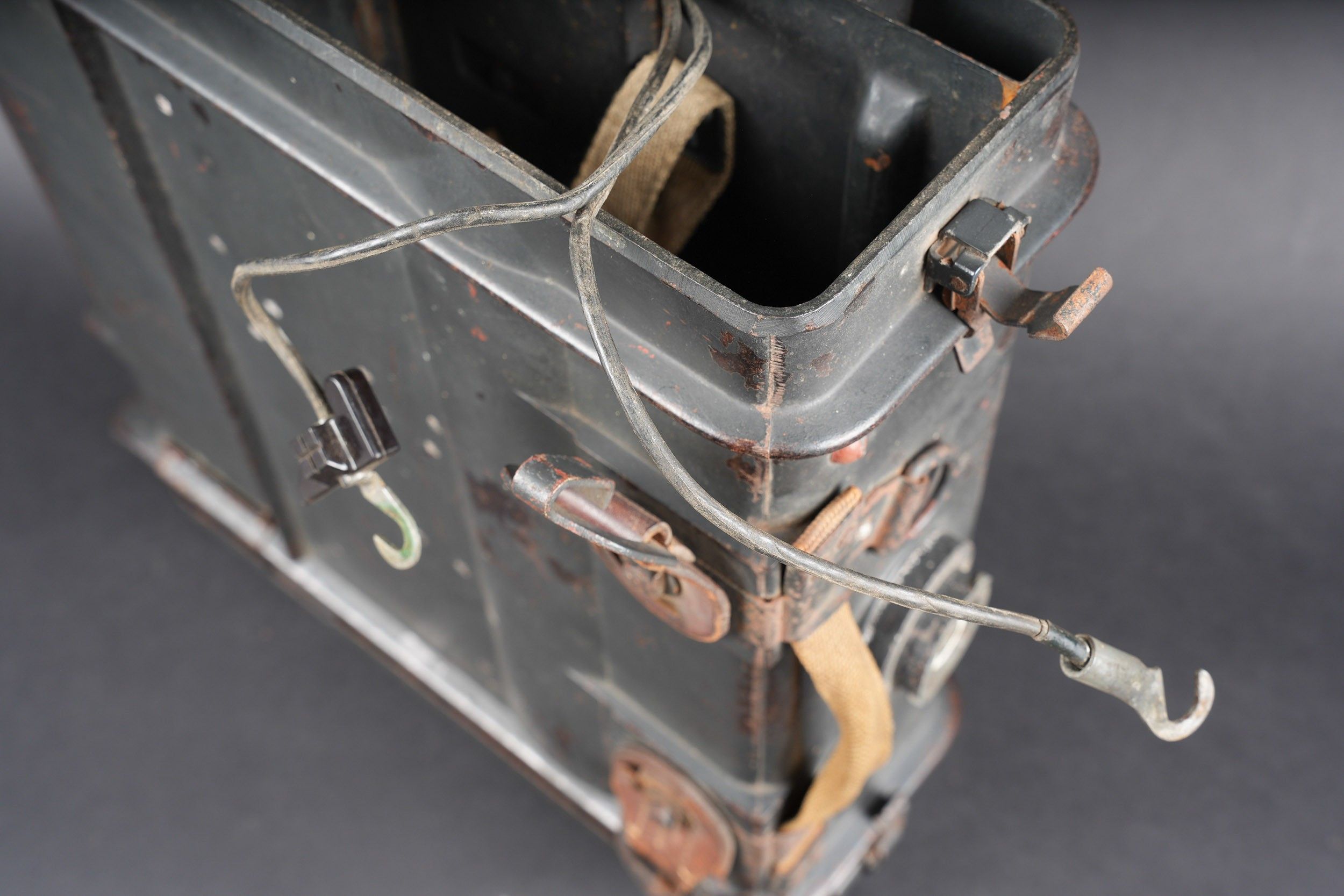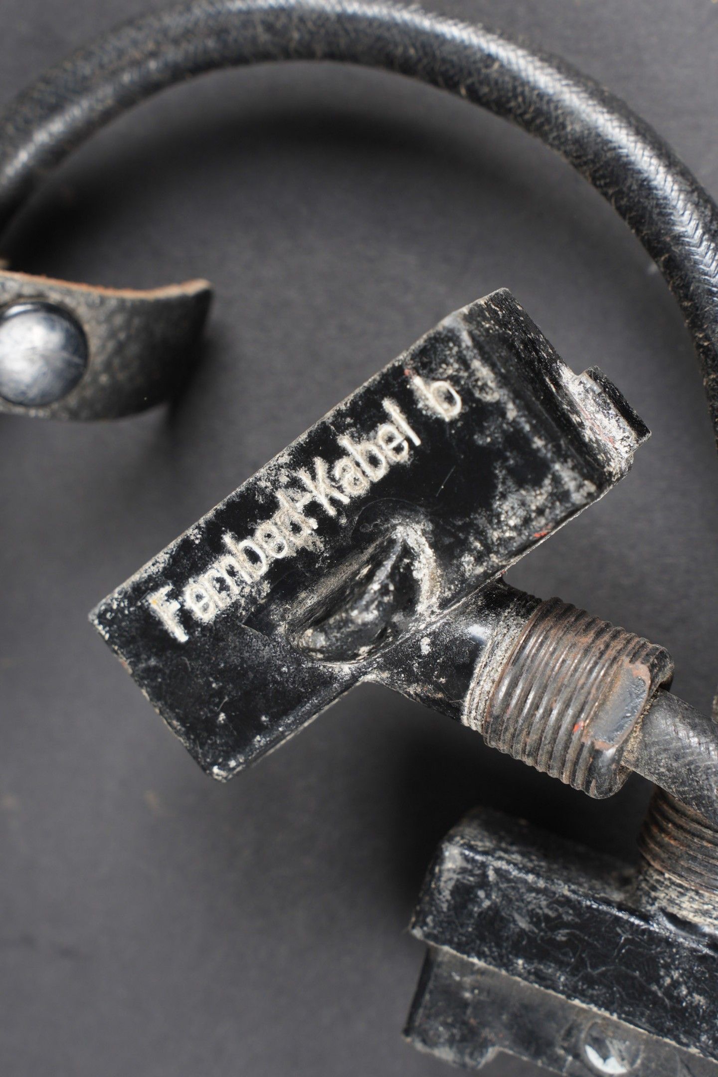 German Feld Fu. In bakelite, 70% feldgrau paint. The canvas carrying handle is complete. Lid with two radio code plates. The shoulder strap hooks are present. The shoulder straps are missing. The left front panel is in very good condition, with a few cracks and missing edges and a complete inventory plate. All moving parts are functional. Plaque marked Feld FU BI, number 006163 1944. The voltage indicator is present, as are the microphone and radio headphone sockets. Detachable part of the control panel which includes volume control and frequency setting. Preset frequency control button. Frequency test button. The power switch can be seen through the cover. Opposite side has a red dot and Feldfu marking. All accessories on this side are missing, full inventory plate. The power cable is present. The antenna is missing. Some wear and patina. Condition II+. German Feld Fu Bakelite case with 70% Feldgrau paint. Complete canvas carrying handle. Lid fitted with two radio code plates. Strap hooks present, straps missing. Left panel in very good condition, minor cracks and losses along edges, complete inventory plate. All mechanical parts functional. Plate marked Feld Fu BI Nr. 006163 1944. Voltage indicator present, as well as sockets for microphone and headset. Detachable control panel with volume and frequency controls. Pre-set frequency dial and frequency test button. Power switch visible through the lid. Opposite panel marked with red dot and Feldfu inscription. Missing accessories on this side, complete inventory plate. Power cable present, antenna missing. Shows some wear and patina. Condition II+.