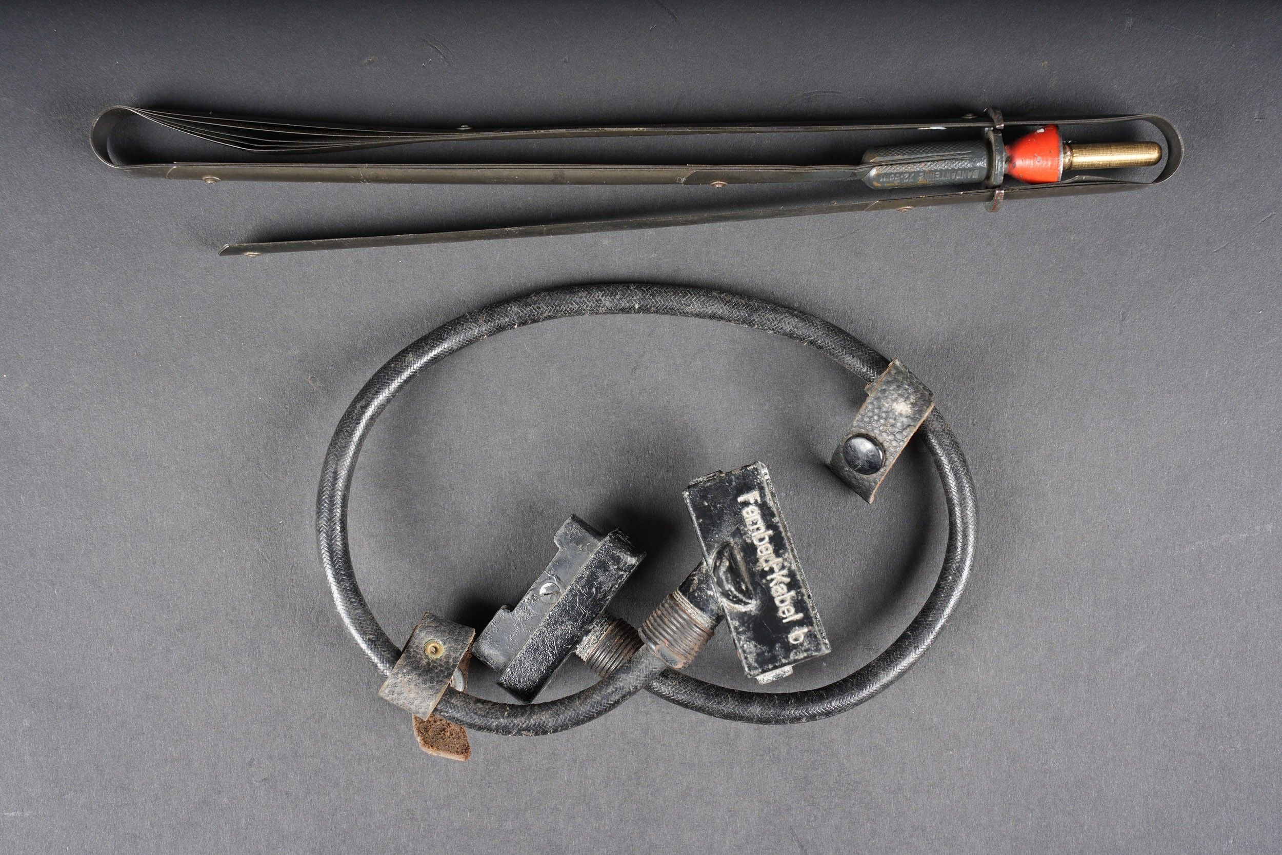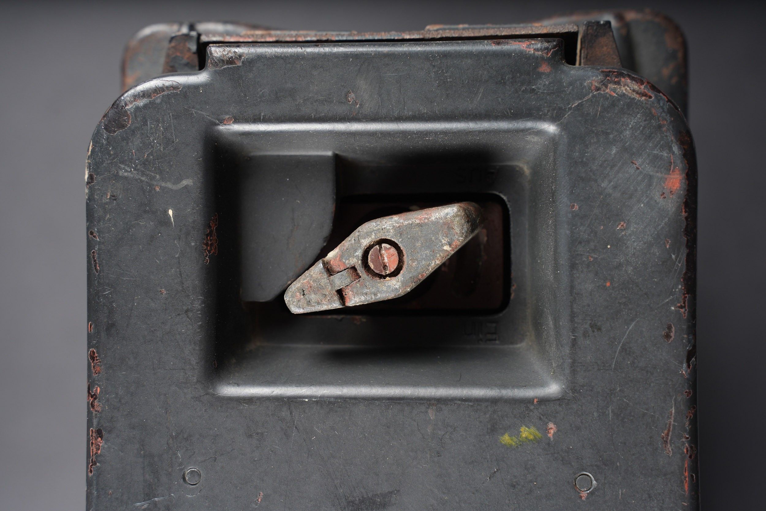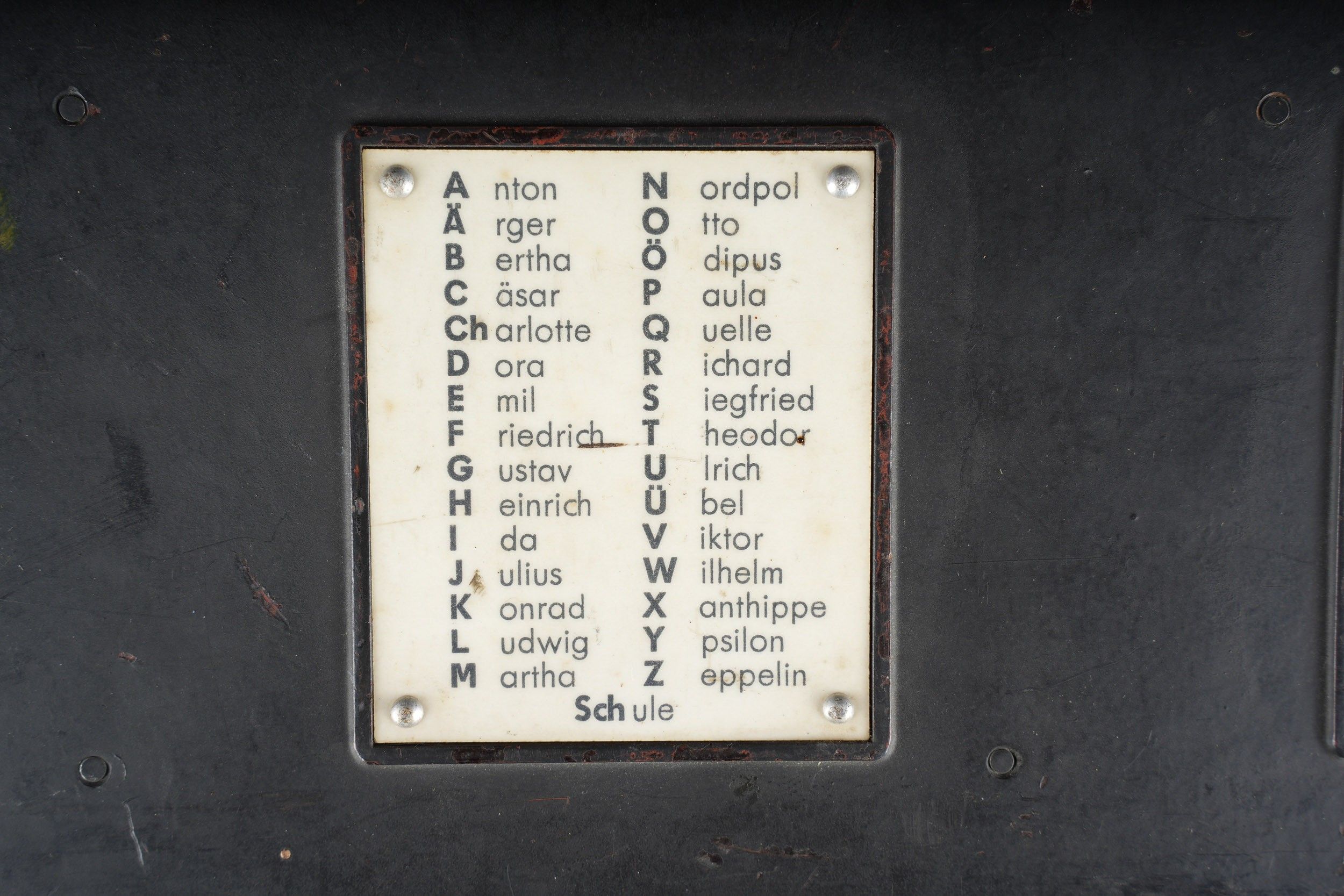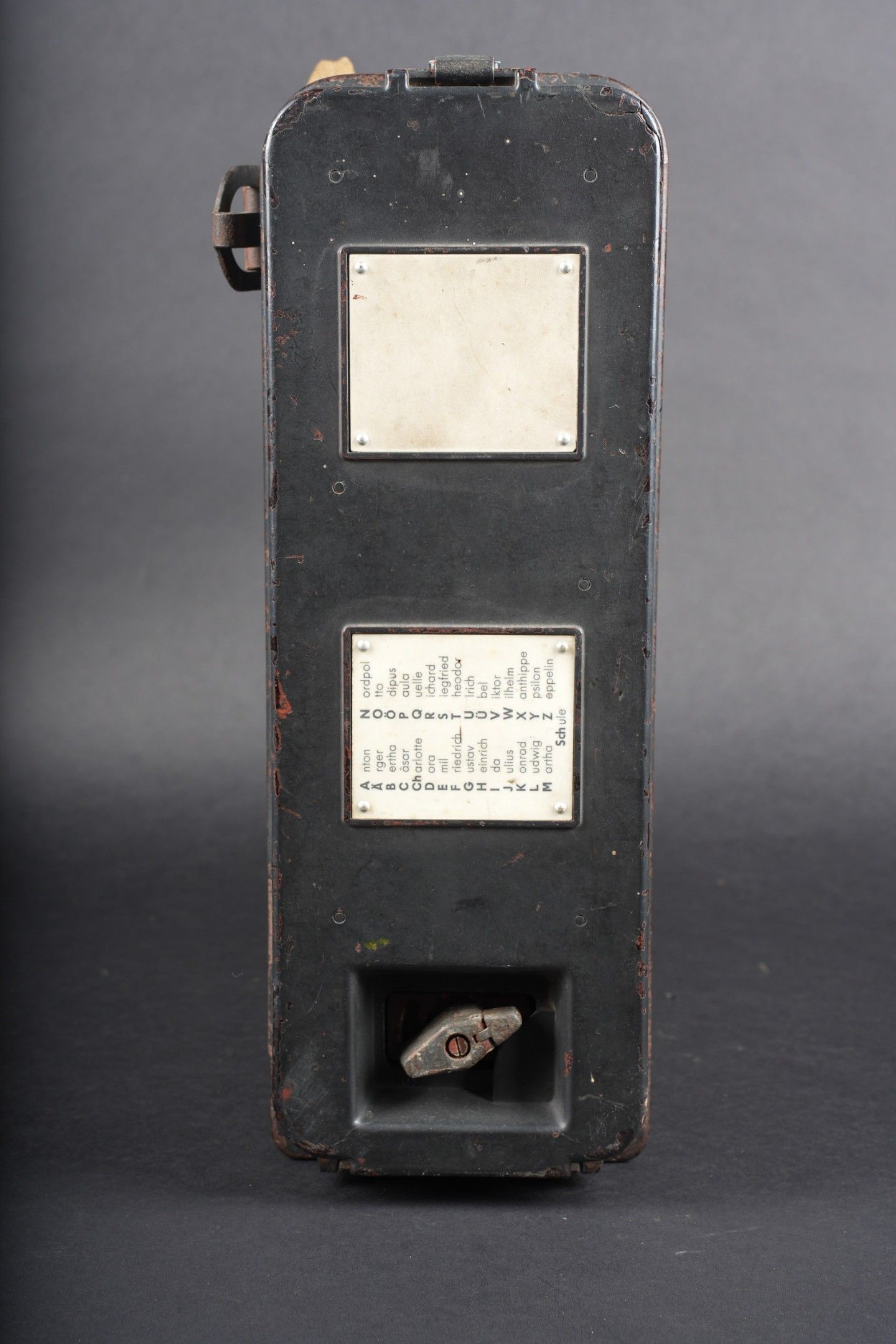 German Feld Fu. In bakelite, 70% feldgrau paint. The canvas carrying handle is complete. Lid with two radio code plates. The shoulder strap hooks are present. The shoulder straps are missing. The left front panel is in very good condition, with a few cracks and missing edges and a complete inventory plate. All moving parts are functional. Plaque marked Feld FU BI, number 006163 1944. The voltage indicator is present, as are the microphone and radio headphone sockets. Detachable part of the control panel which includes volume control and frequency setting. Preset frequency control button. Frequency test button. The power switch can be seen through the cover. Opposite side has a red dot and Feldfu marking. All accessories on this side are missing, full inventory plate. The power cable is present. The antenna is missing. Some wear and patina. Condition II+. German Feld Fu Bakelite case with 70% Feldgrau paint. Complete canvas carrying handle. Lid fitted with two radio code plates. Strap hooks present, straps missing. Left panel in very good condition, minor cracks and losses along edges, complete inventory plate. All mechanical parts functional. Plate marked Feld Fu BI Nr. 006163 1944. Voltage indicator present, as well as sockets for microphone and headset. Detachable control panel with volume and frequency controls. Pre-set frequency dial and frequency test button. Power switch visible through the lid. Opposite panel marked with red dot and Feldfu inscription. Missing accessories on this side, complete inventory plate. Power cable present, antenna missing. Shows some wear and patina. Condition II+.
