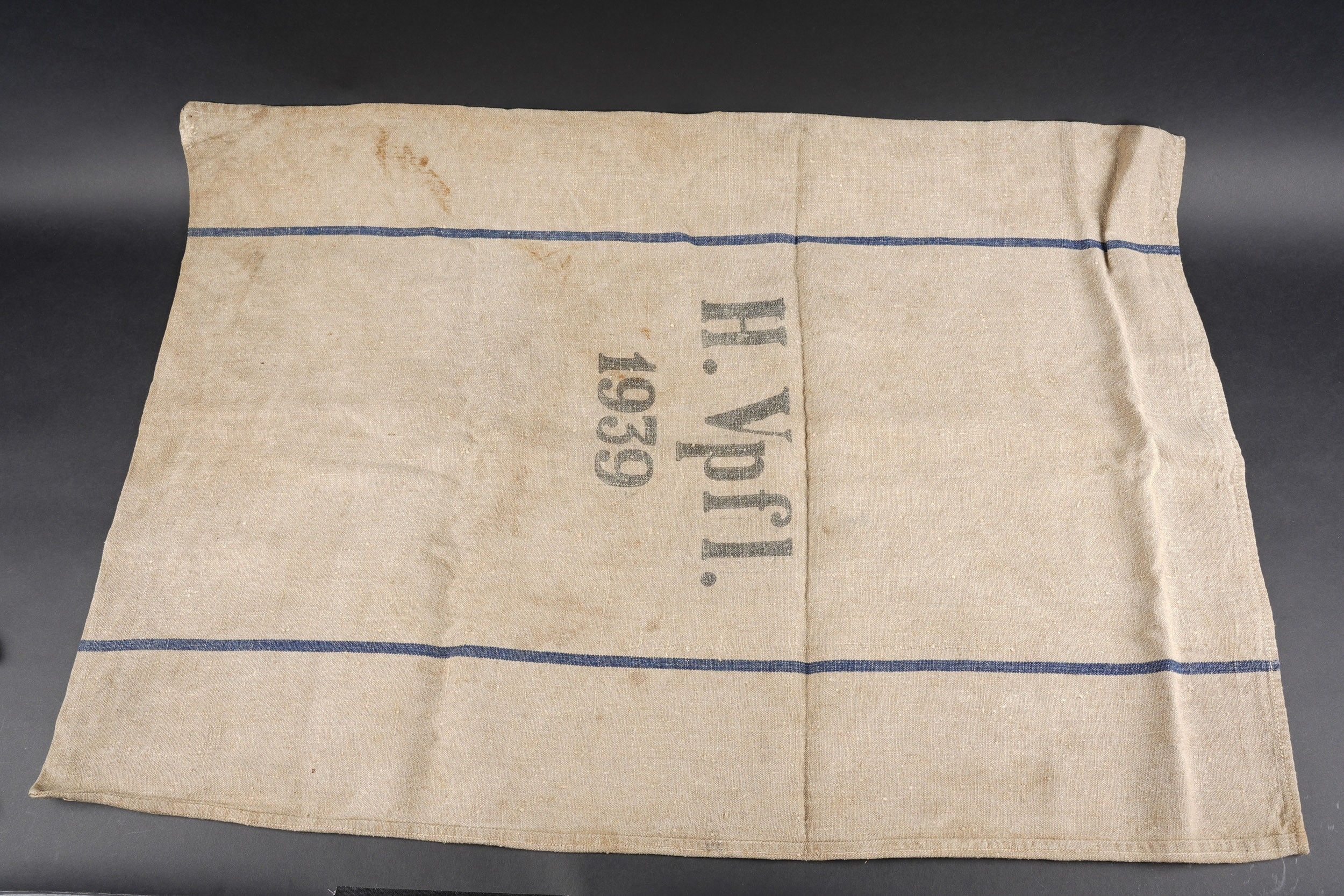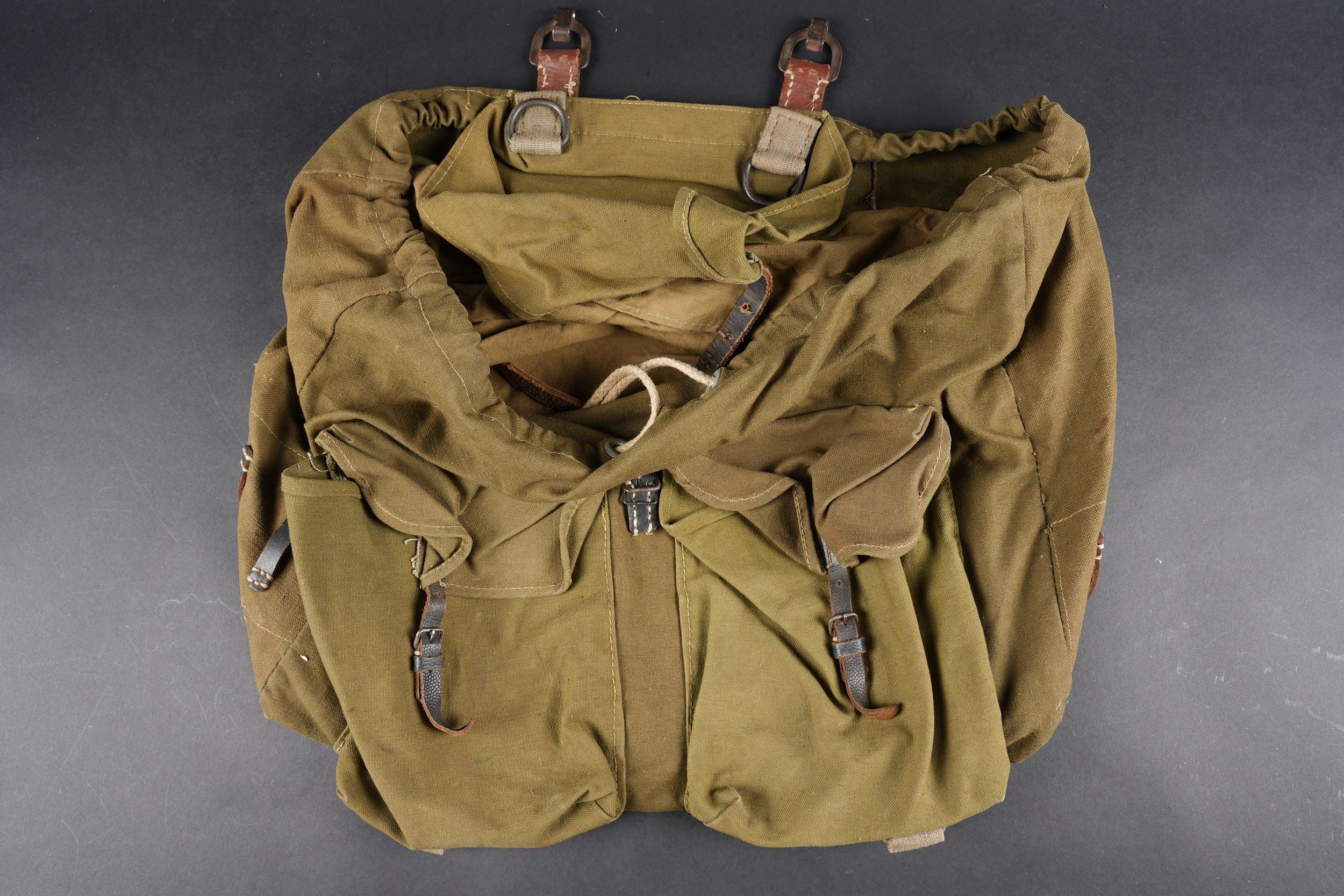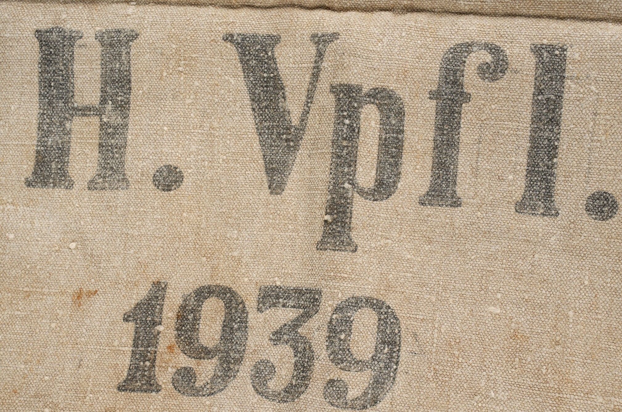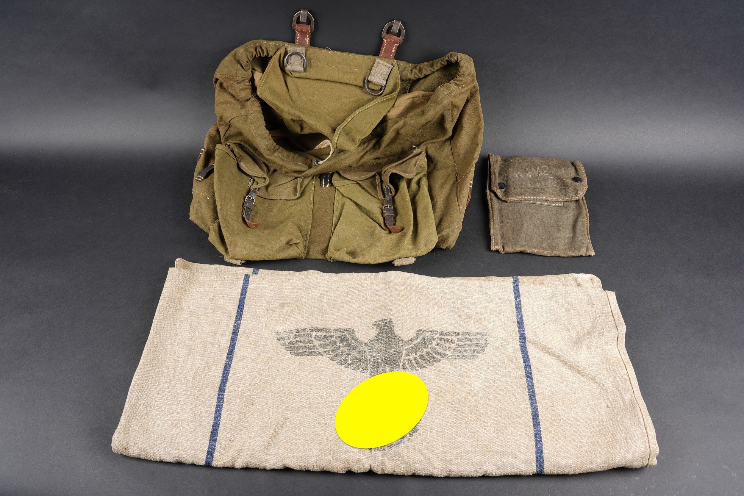 German equipment. Comprising a rucksack in heavy Feldgrau canvas and black leather. The straps are missing. Drawstring is present. Dated 1944. A heavy unbleached canvas living bag, with German eagle, dated 1939. A Feldgrau heavy canvas pouch, empty, marked KW 27, the press studs are functional. Some wear and patina. Condition II+. German equipment Including one large Feldgrau canvas and black leather rucksack, missing shoulder straps but with drawstring intact, dated 1944. One cream canvas ration bag with fine German eagle, dated 1939. One empty heavy Feldgrau canvas pouch marked KW 27, press studs functional. Shows some wear and patina. Condition II+.