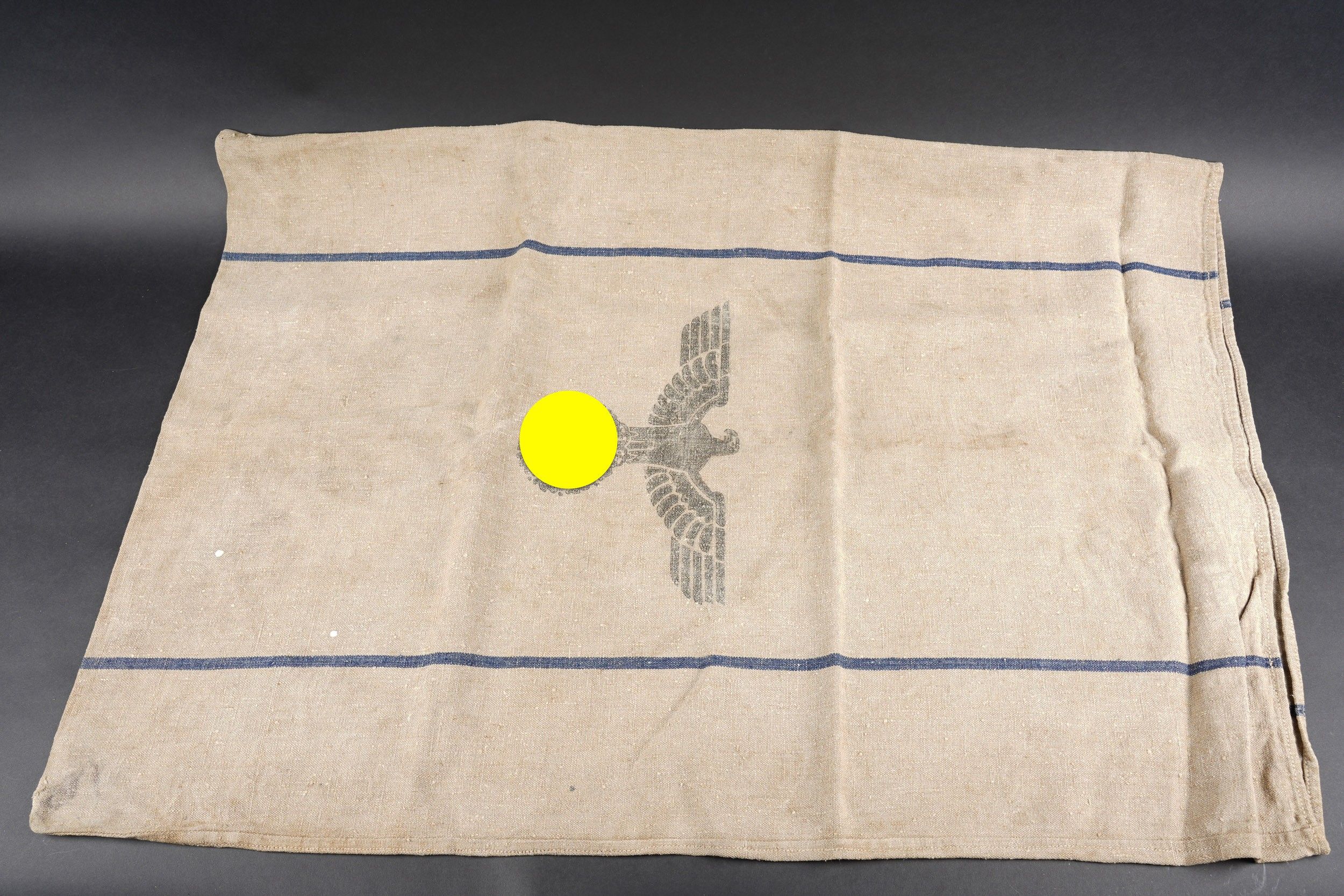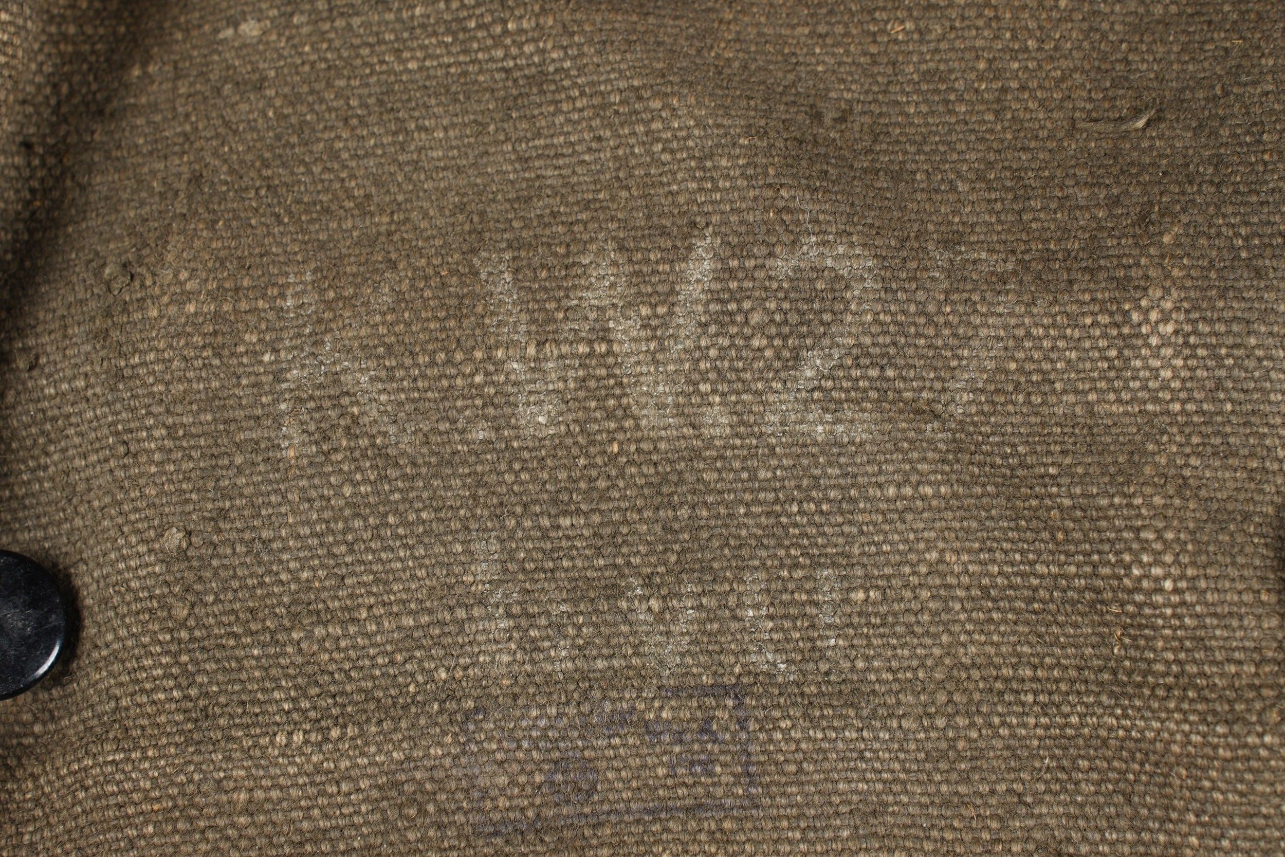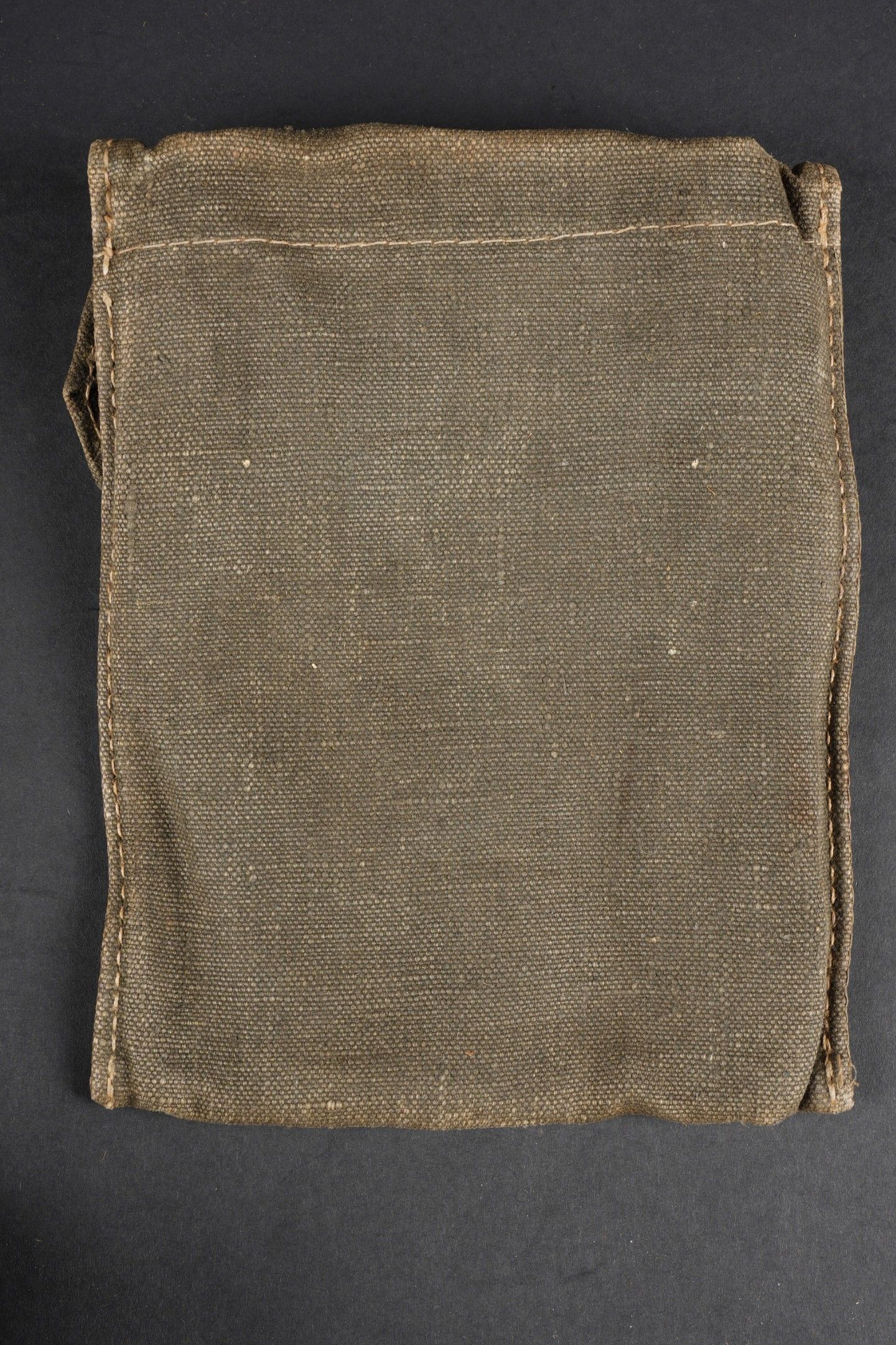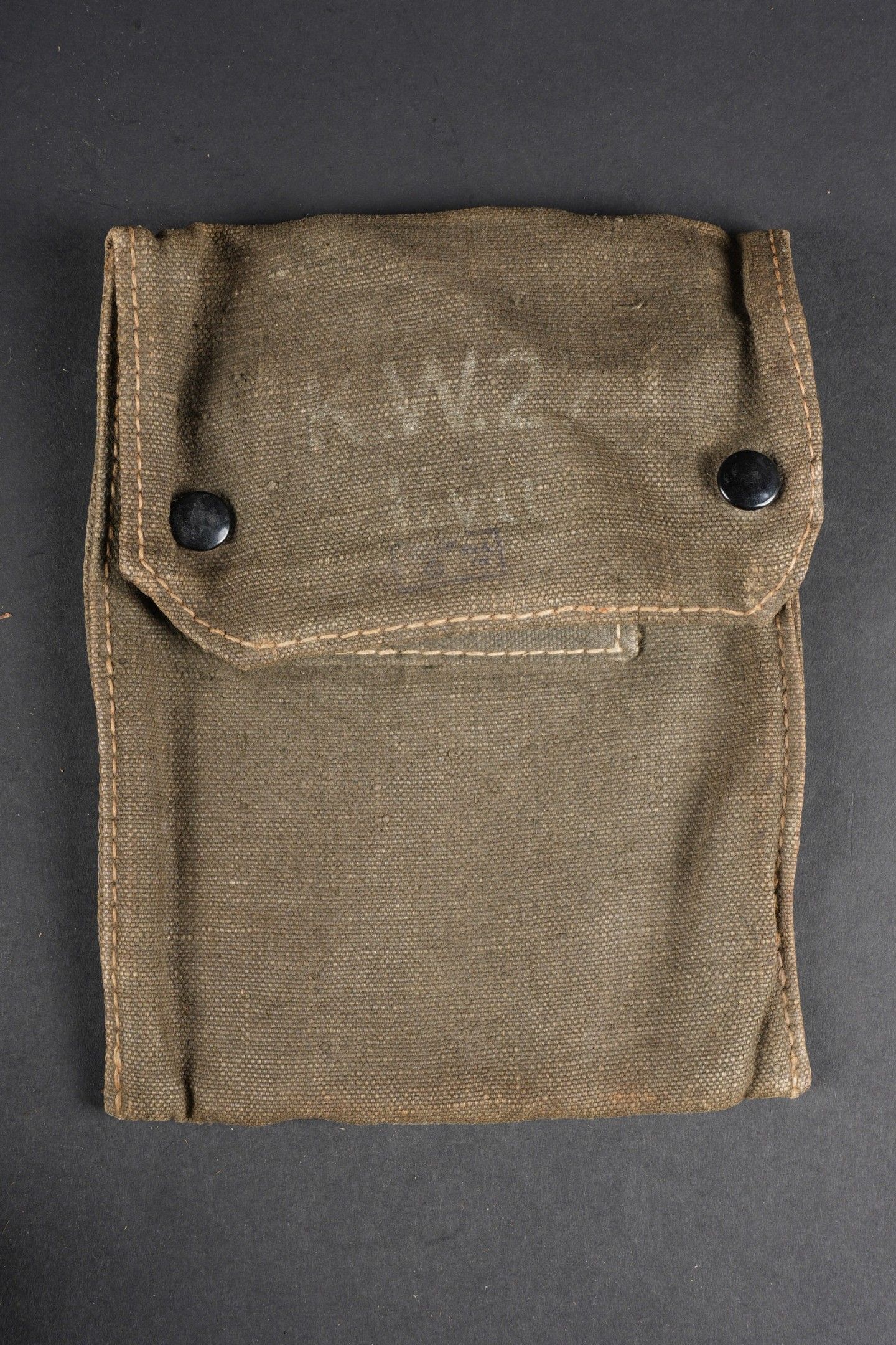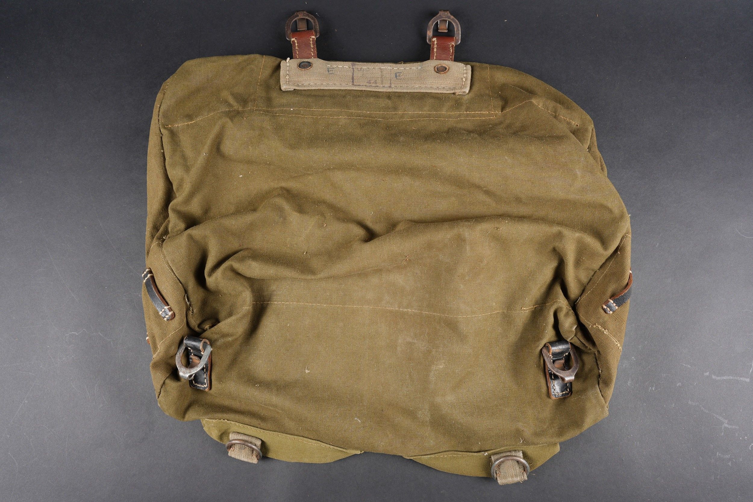 German equipment. Comprising a rucksack in heavy Feldgrau canvas and black leather. The straps are missing. Drawstring is present. Dated 1944. A heavy unbleached canvas living bag, with German eagle, dated 1939. A Feldgrau heavy canvas pouch, empty, marked KW 27, the press studs are functional. Some wear and patina. Condition II+. German equipment Including one large Feldgrau canvas and black leather rucksack, missing shoulder straps but with drawstring intact, dated 1944. One cream canvas ration bag with fine German eagle, dated 1939. One empty heavy Feldgrau canvas pouch marked KW 27, press studs functional. Shows some wear and patina. Condition II+.