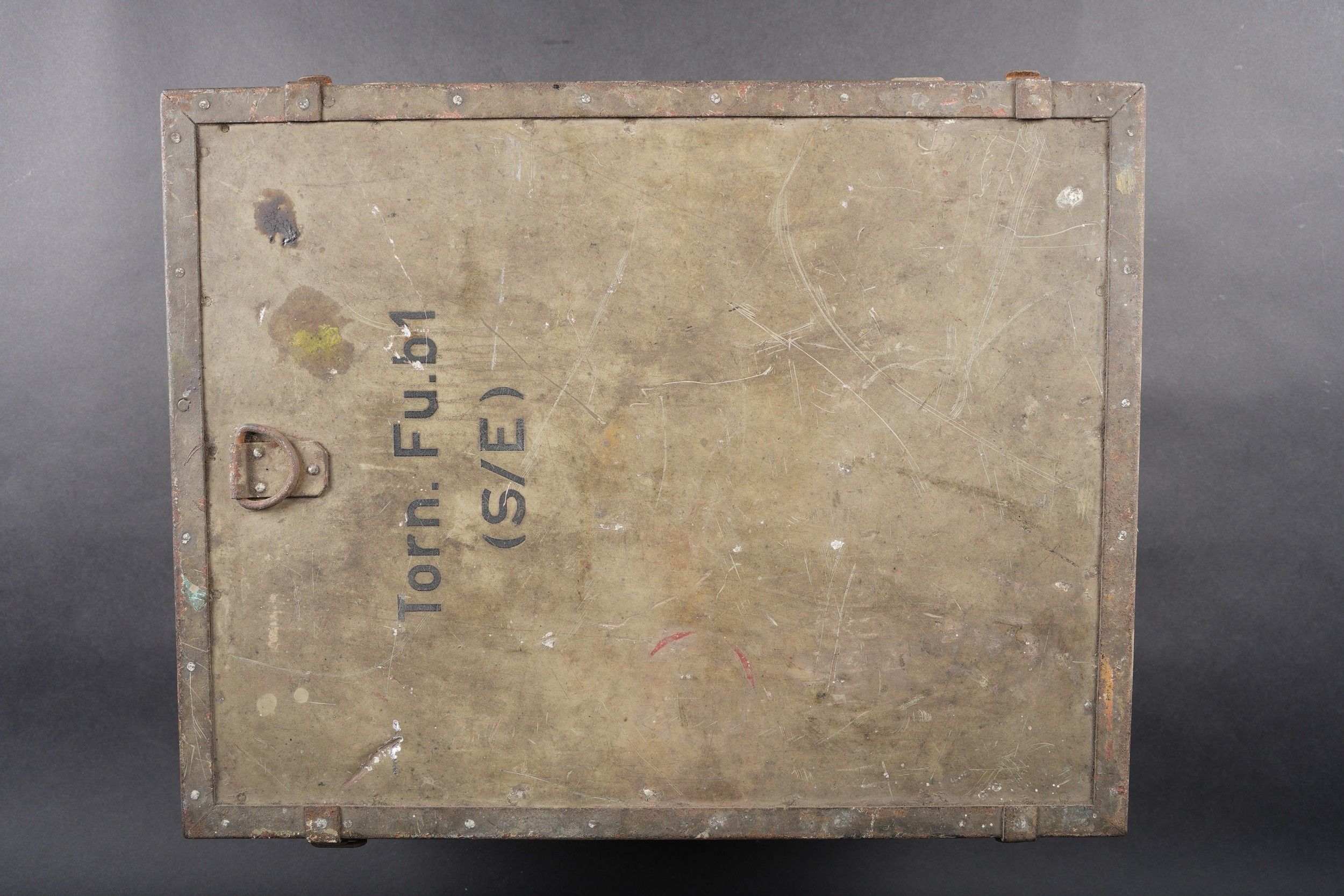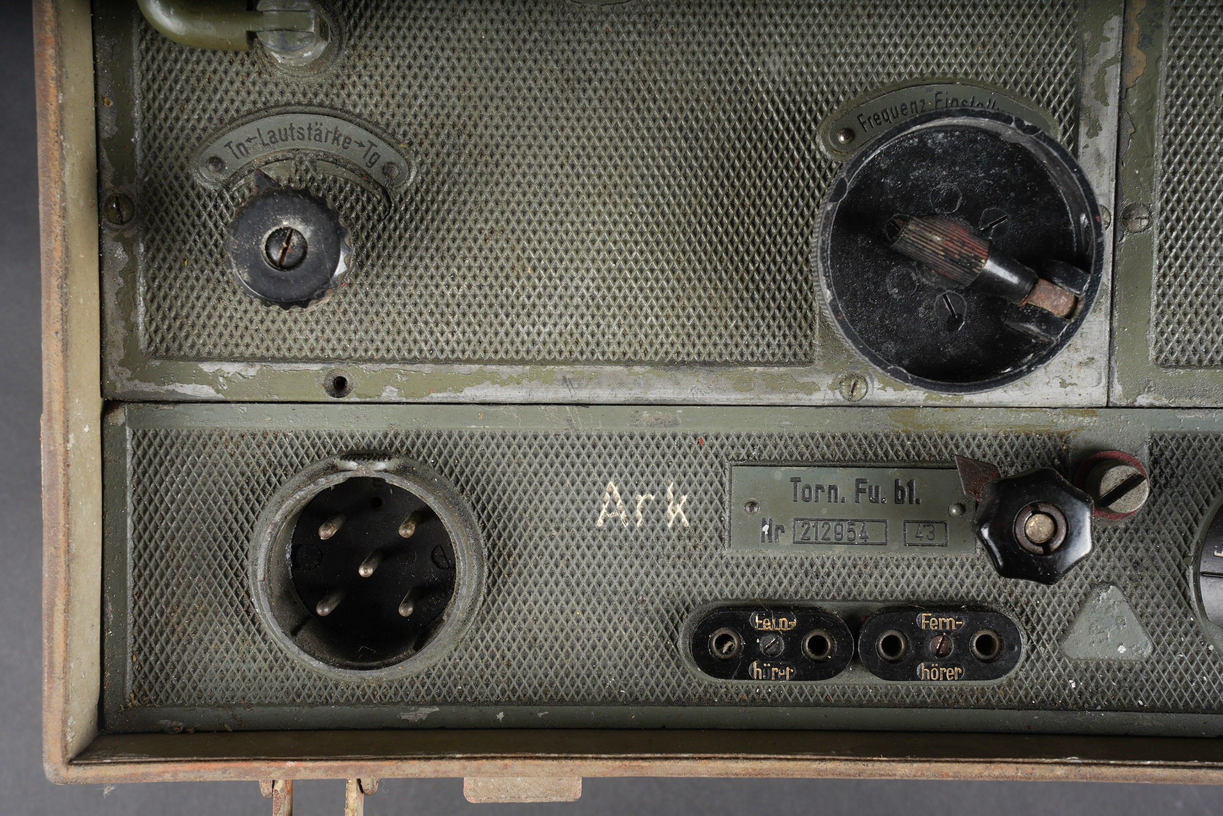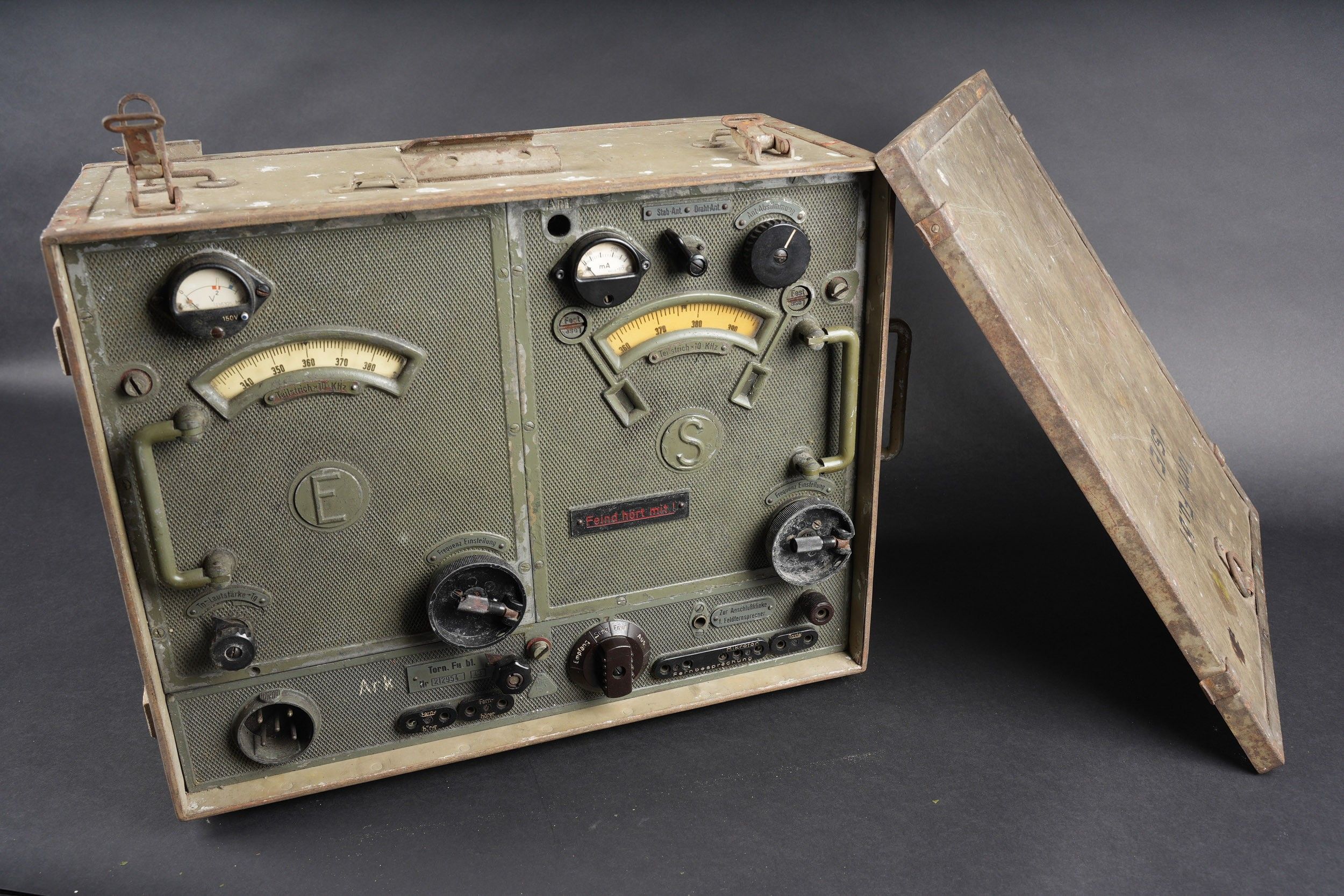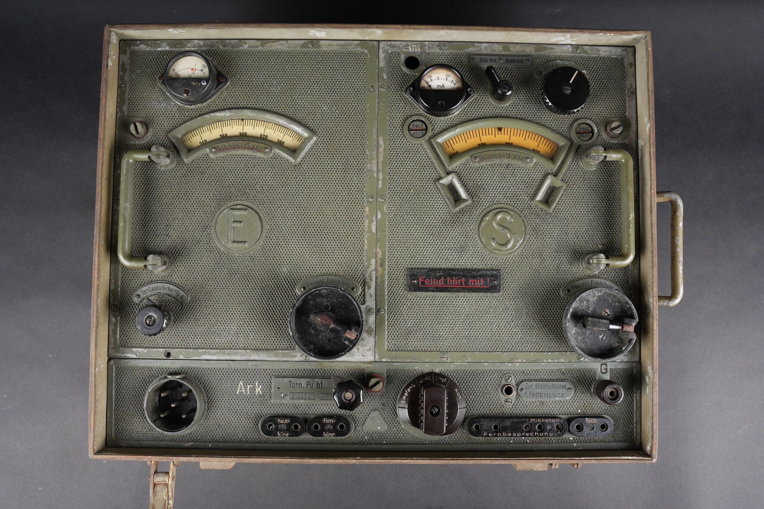 Torn FU B1 transceiver. Metal case with numerous reinforcements. Carrying handle included. Feldgrau paintwork at 80. Torn FU B1 SE markings on the lid. The locking hooks are present. All moving parts are functional. 80% Feldgrau internal paintwork. White ARK paint markings. Plaque marked Torn FU B1 number 212954, dated 1943. The case has not been disassembled in order to check the internal components. Some wear and patina. Condition II+. Torn.Fu.B1 transceiver Metal housing with multiple reinforcements. Carrying handle present. 80% Feldgrau paint remaining. Marked on lid Torn FU B1 SE. Closure latches functional. All moving parts operational. Interior Feldgrau paint at 80%. White paint marking ARK. Nameplate marked Torn FU B1 Nr. 212954, dated 1943. Unit not disassembled to inspect internal components. Shows some wear and patina. Condition II+.