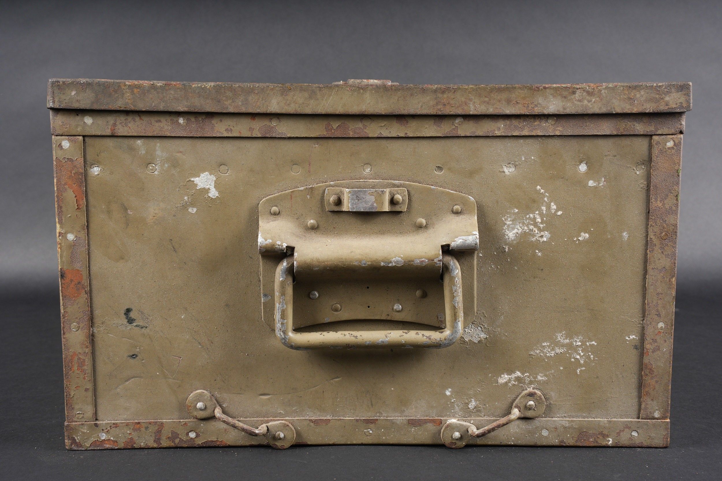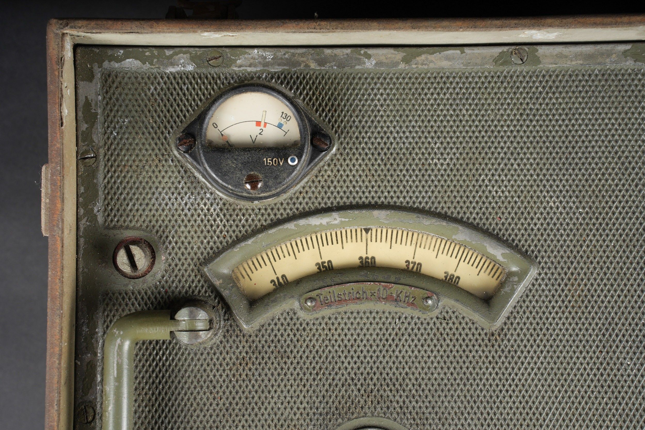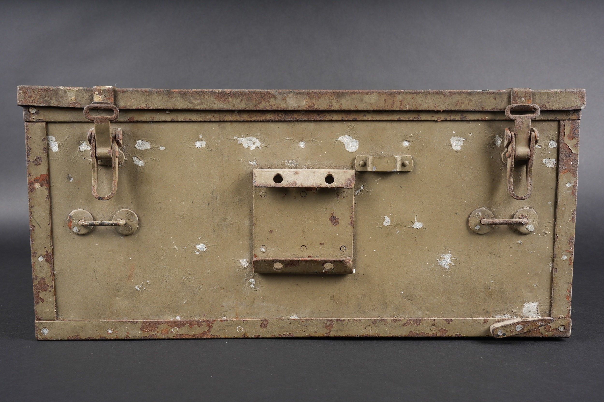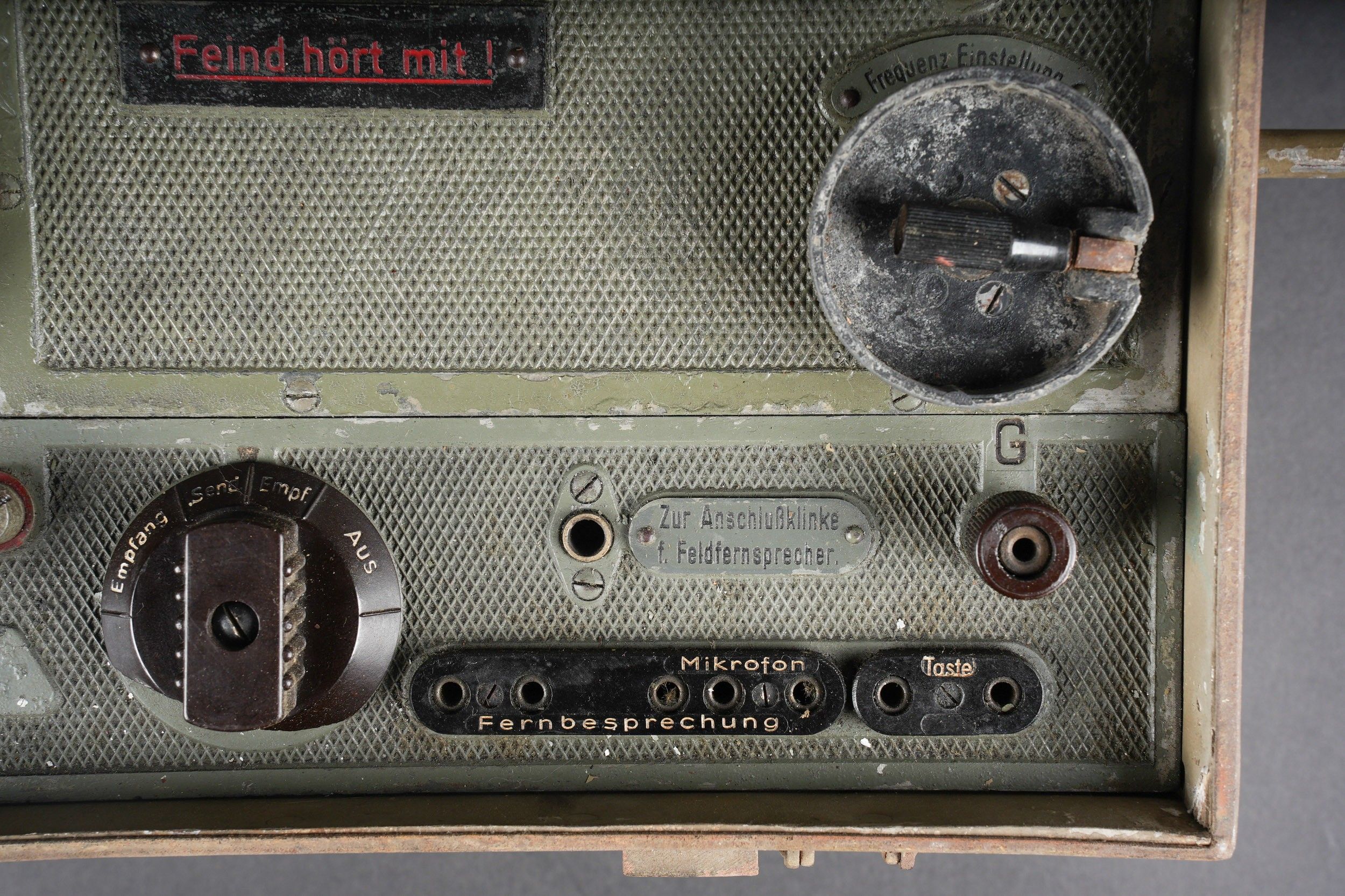 Torn FU B1 transceiver. Metal case with numerous reinforcements. Carrying handle included. Feldgrau paintwork at 80. Torn FU B1 SE markings on the lid. The locking hooks are present. All moving parts are functional. 80% Feldgrau internal paintwork. White ARK paint markings. Plaque marked Torn FU B1 number 212954, dated 1943. The case has not been disassembled in order to check the internal components. Some wear and patina. Condition II+. Torn.Fu.B1 transceiver Metal housing with multiple reinforcements. Carrying handle present. 80% Feldgrau paint remaining. Marked on lid Torn FU B1 SE. Closure latches functional. All moving parts operational. Interior Feldgrau paint at 80%. White paint marking ARK. Nameplate marked Torn FU B1 Nr. 212954, dated 1943. Unit not disassembled to inspect internal components. Shows some wear and patina. Condition II+.