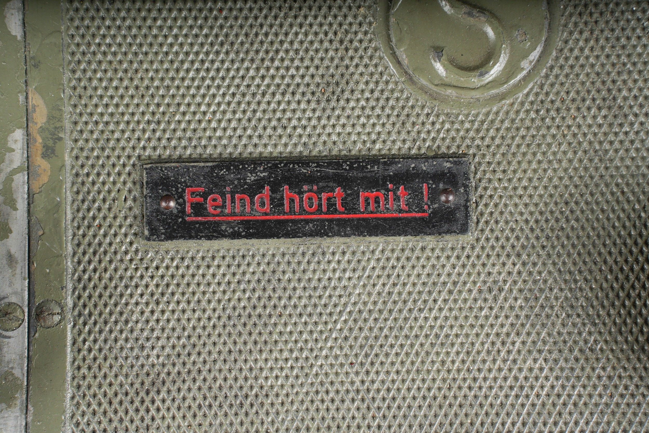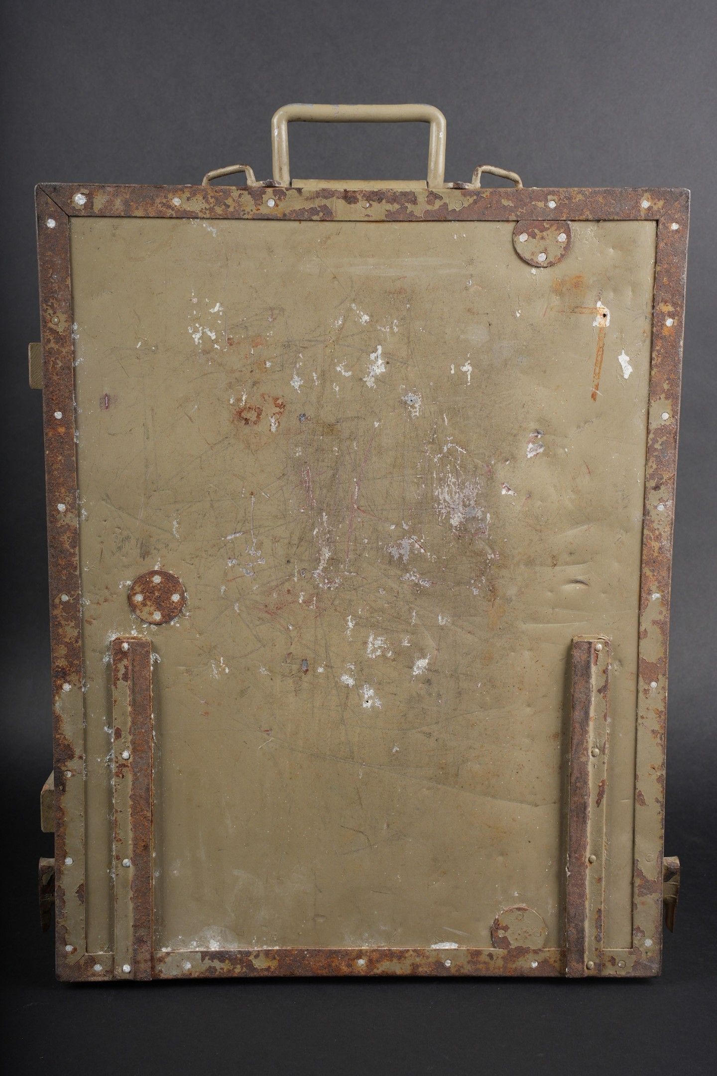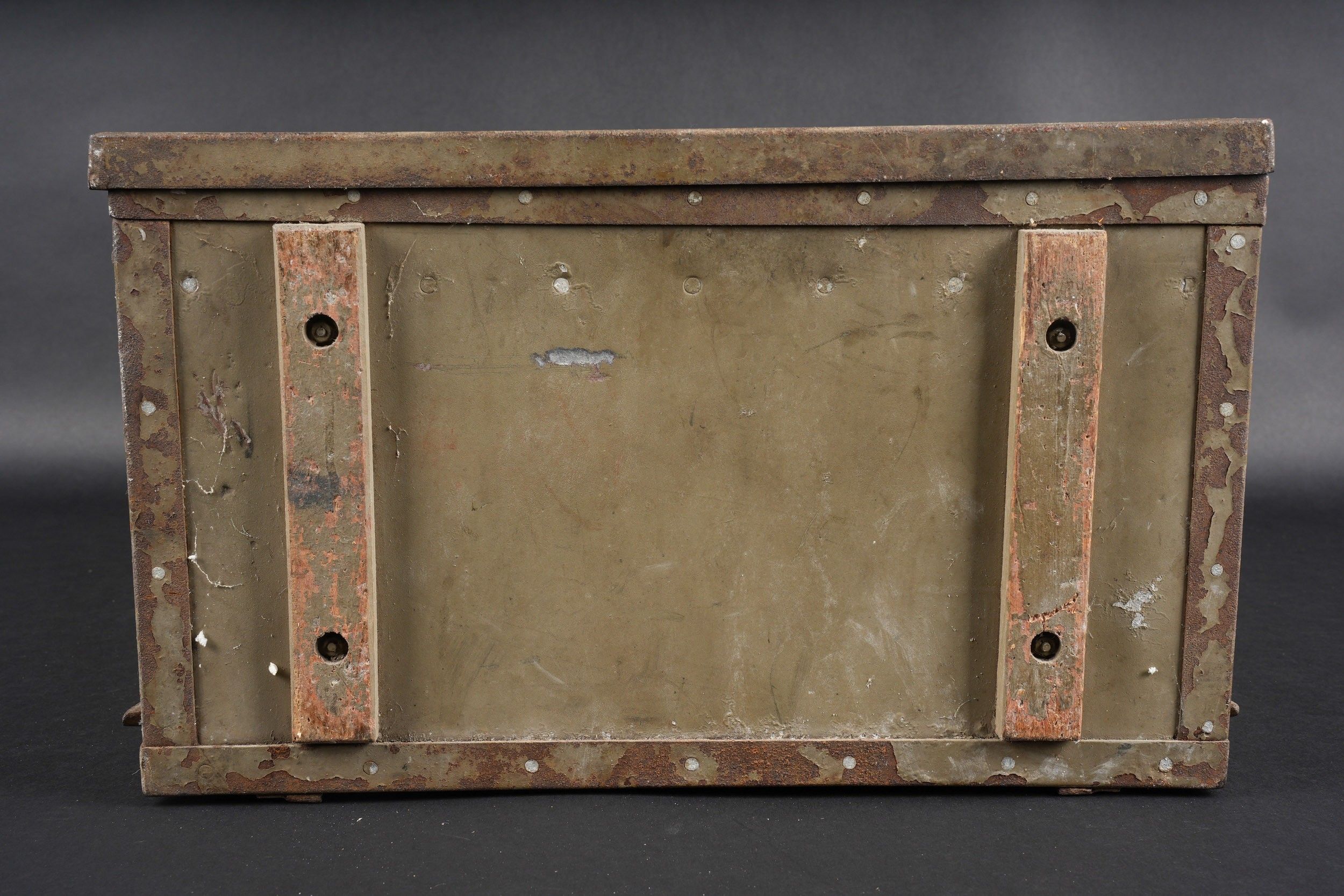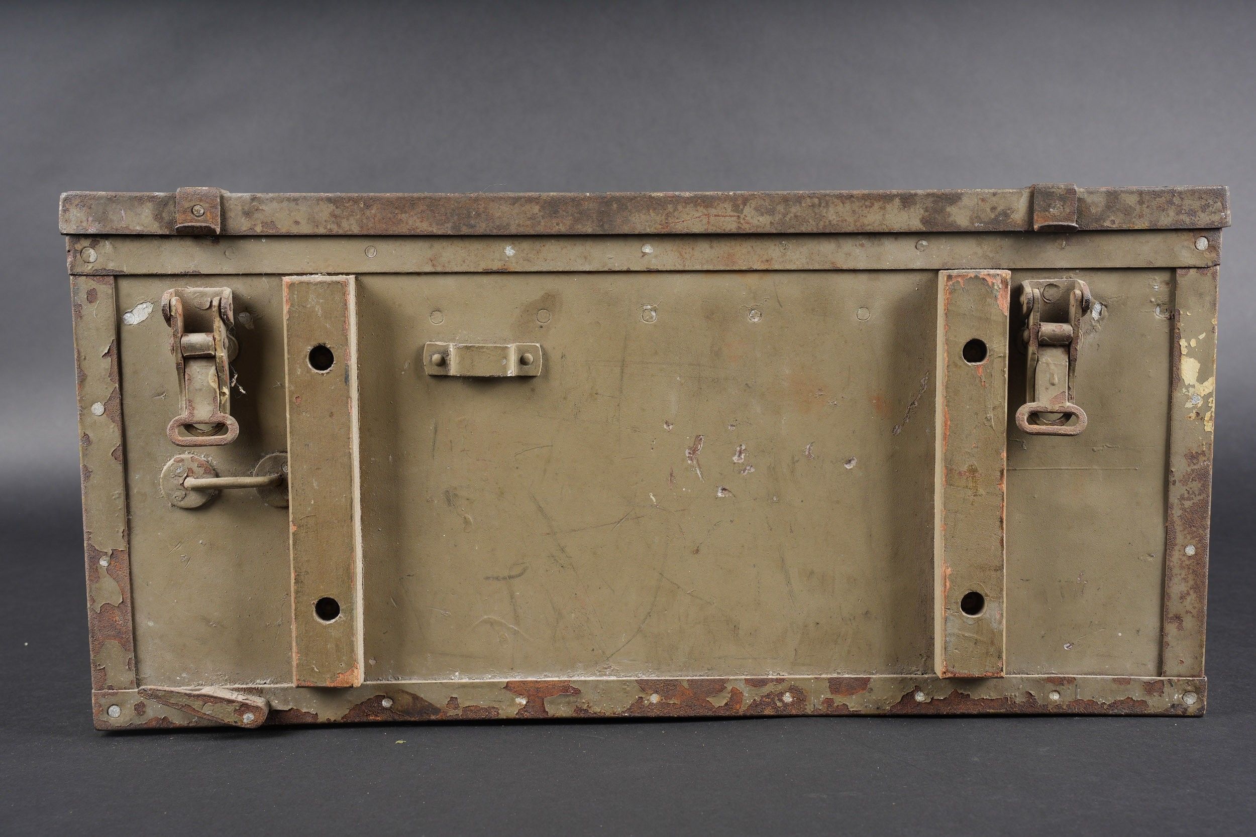 Torn FU B1 transceiver. Metal case with numerous reinforcements. Carrying handle included. Feldgrau paintwork at 80. Torn FU B1 SE markings on the lid. The locking hooks are present. All moving parts are functional. 80% Feldgrau internal paintwork. White ARK paint markings. Plaque marked Torn FU B1 number 212954, dated 1943. The case has not been disassembled in order to check the internal components. Some wear and patina. Condition II+. Torn.Fu.B1 transceiver Metal housing with multiple reinforcements. Carrying handle present. 80% Feldgrau paint remaining. Marked on lid Torn FU B1 SE. Closure latches functional. All moving parts operational. Interior Feldgrau paint at 80%. White paint marking ARK. Nameplate marked Torn FU B1 Nr. 212954, dated 1943. Unit not disassembled to inspect internal components. Shows some wear and patina. Condition II+.