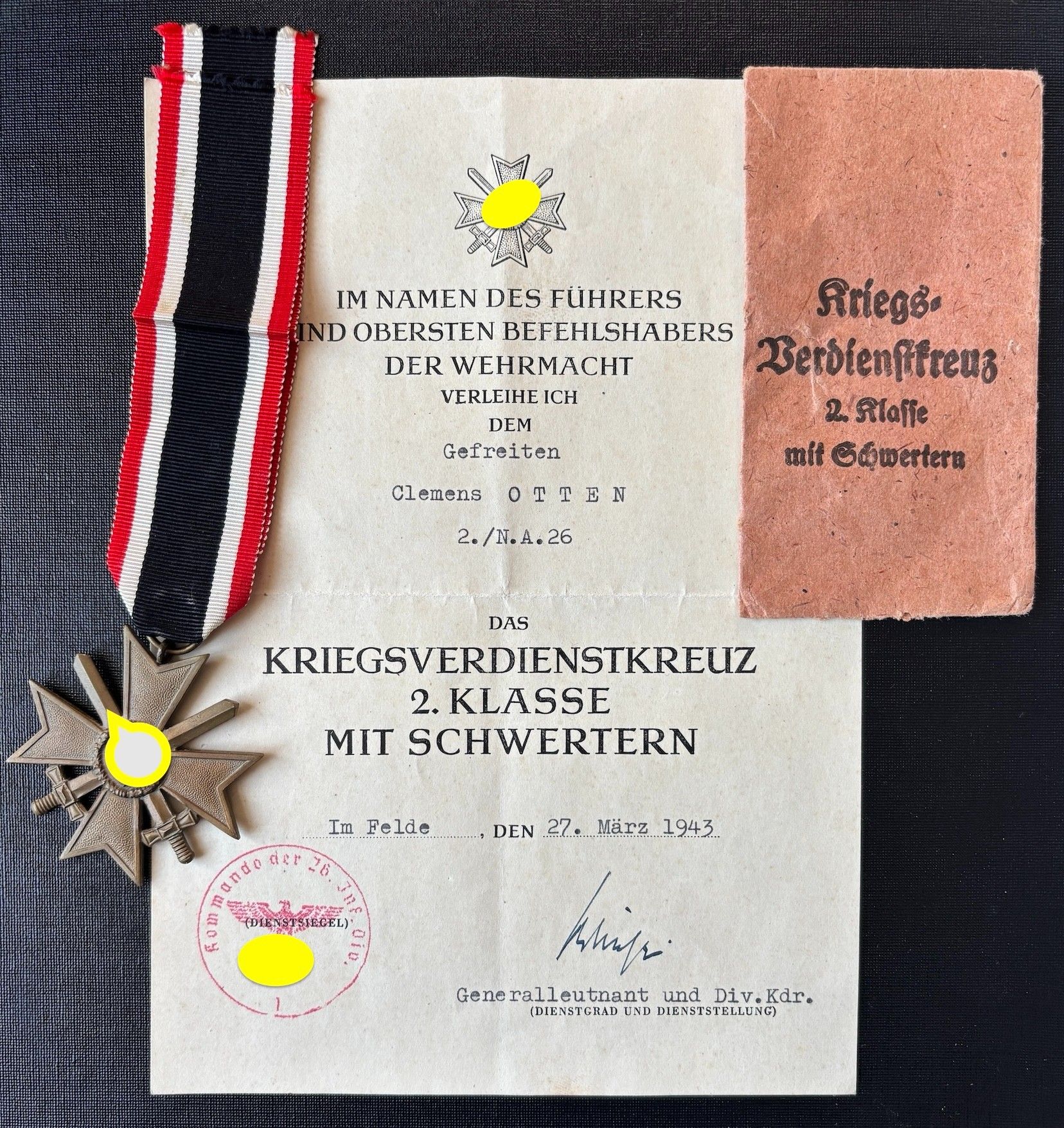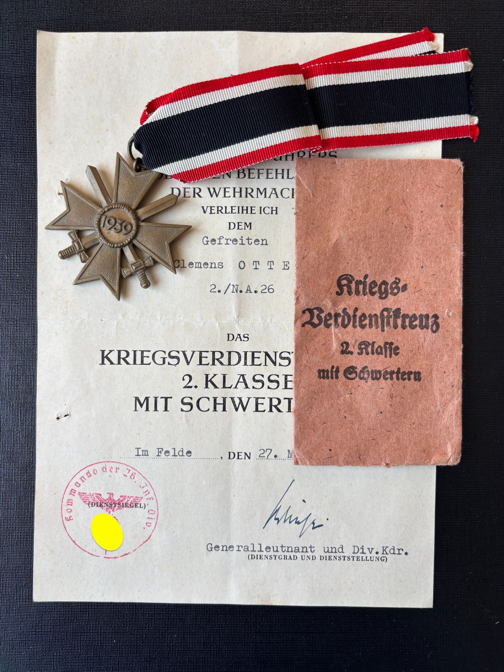 KVK second-class diploma with ribbon. Paper diploma awarded to Gefreiten Clemens Otten of 2 NA 26, 27 March 1943. Attached is a KVK second class with swords and pouch. Some wear and patina to be noted. Condition II+. KVK Second Class Certificate with Ribbon. Paper certificate awarded to Gefreiter Clemens Otten of 2 NA 26 on 27 March 1943 together with a War Merit Cross Second Class with Swords and its packet showing light wear and a period patina Condition II+