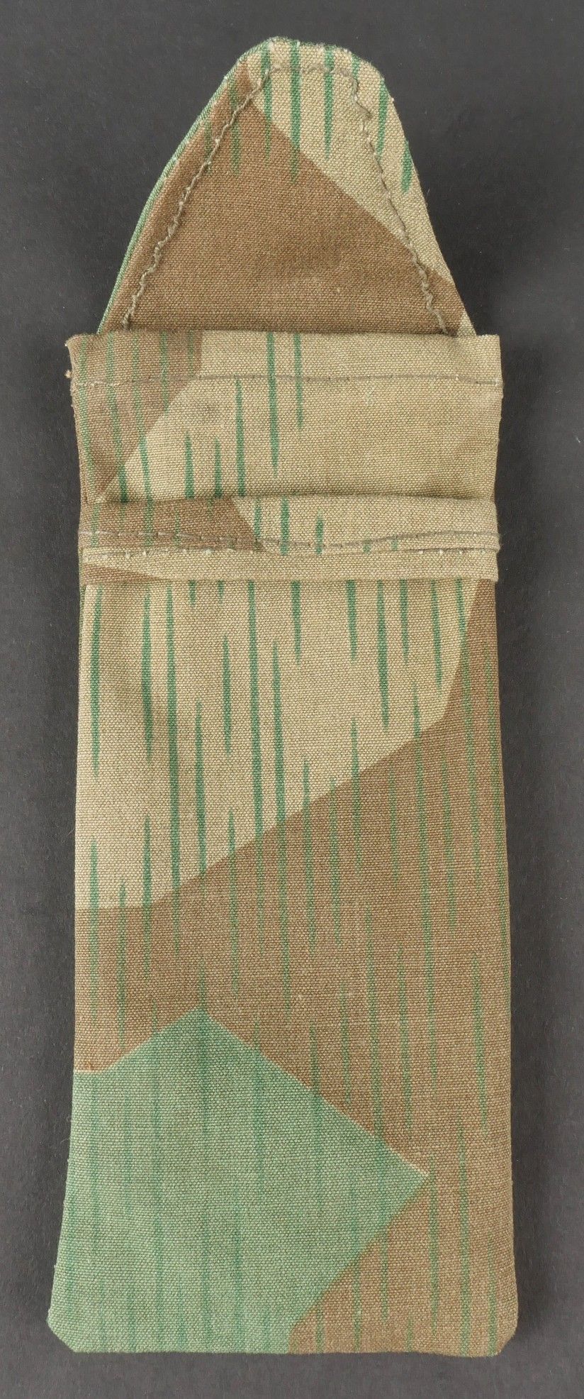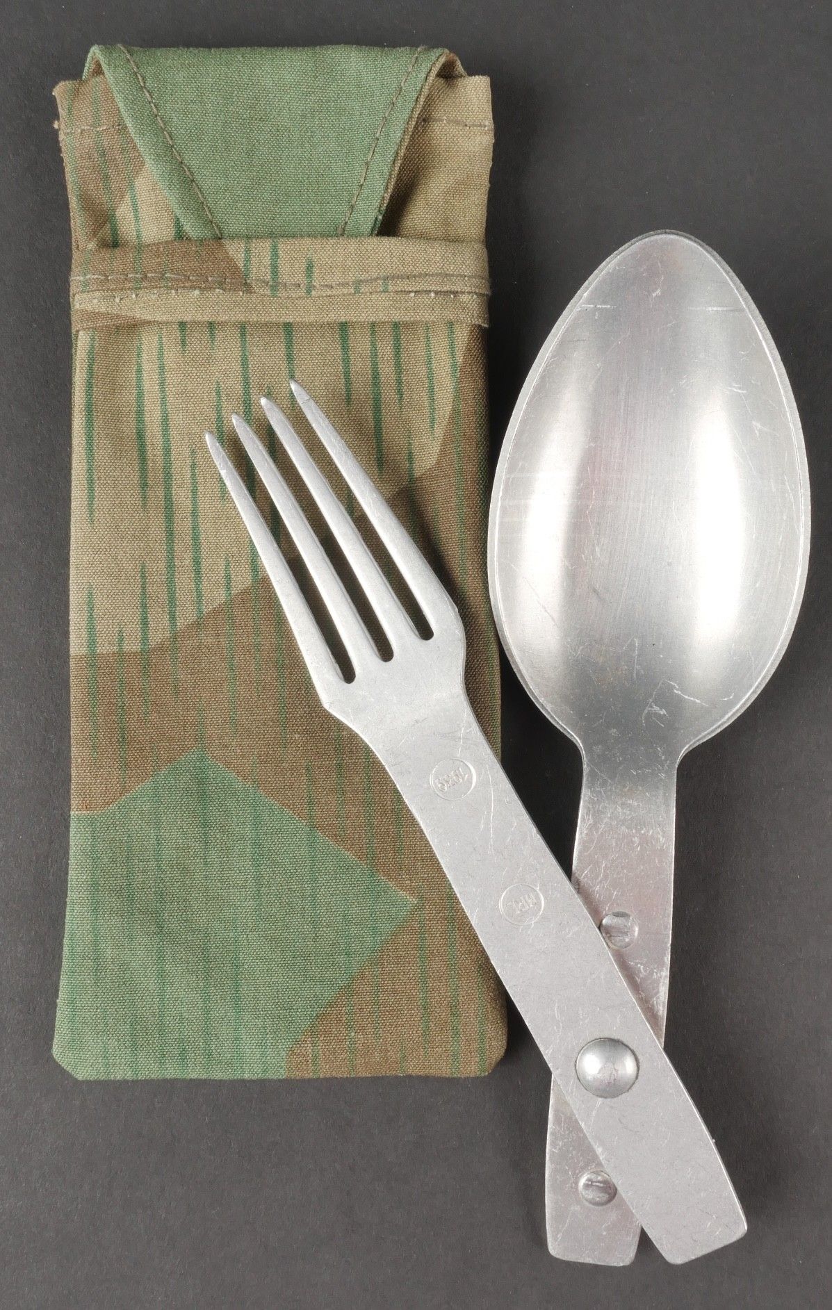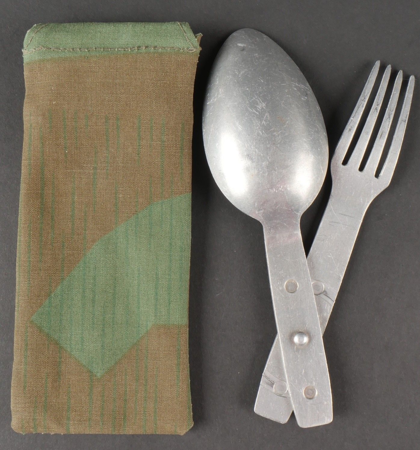 German individual cutlery. Individual aluminium cutlery, made by HRE 1939. Field-made cover in camouflaged shiny fabric. Beautifully made. Some wear and patina. Condition II+. German individual cutlery Aluminium field cutlery set, maker HRE 1939. Field-made camouflage-patterned fabric pouch, finely crafted. Shows some wear and patina. Condition II+.