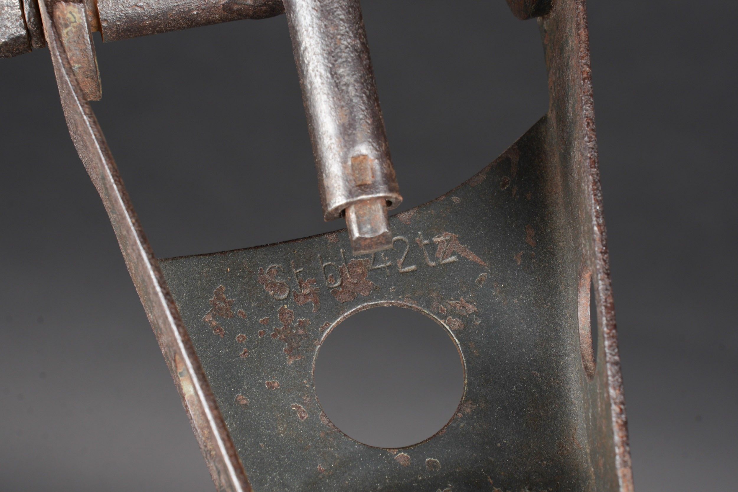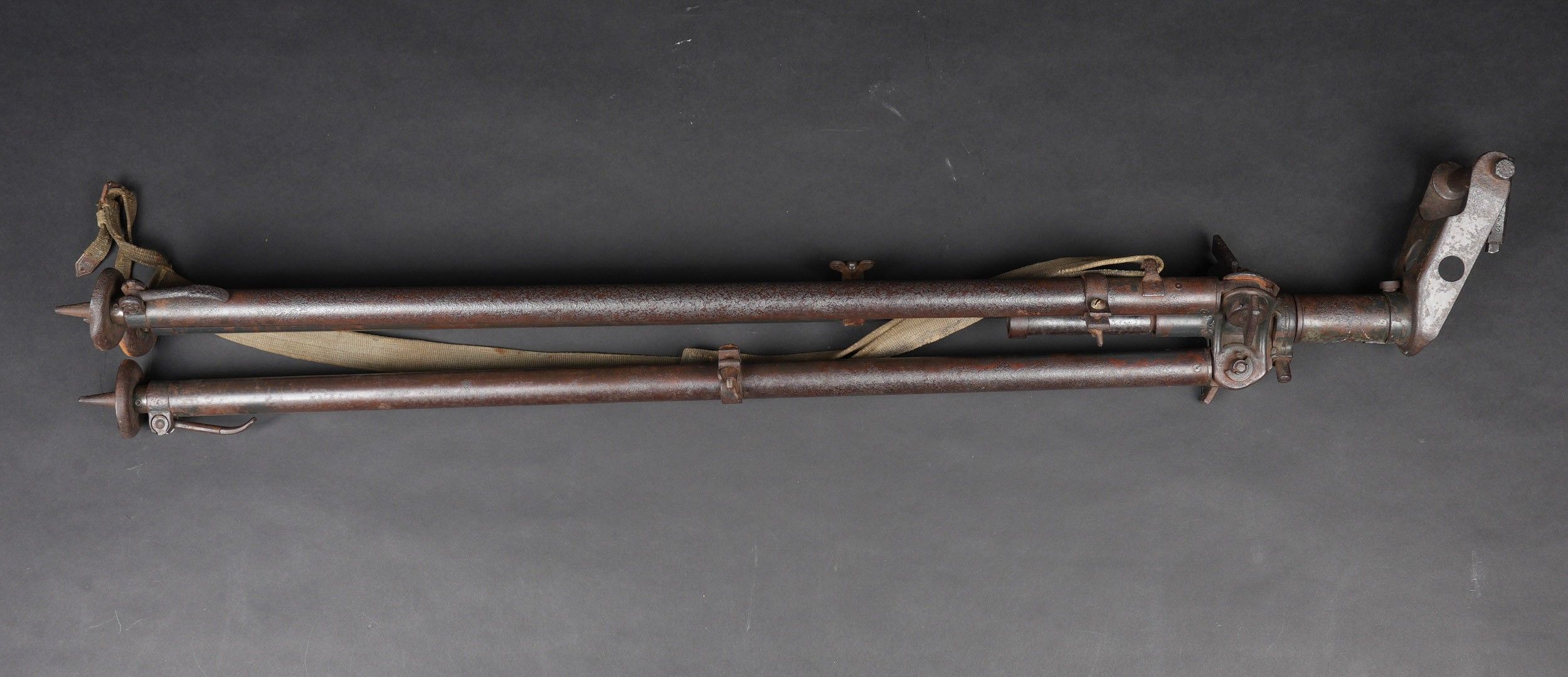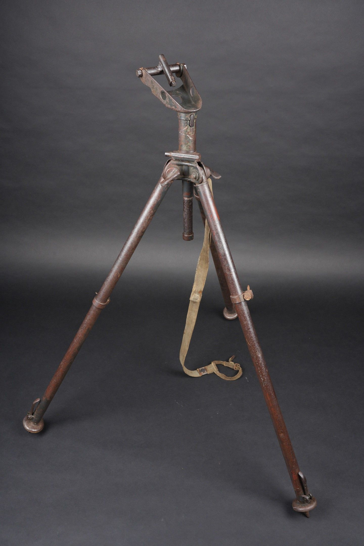 MG 42 anti-aircraft carriage. Metal tripod, telescopic tubes. All moving parts are functional. Paintwork almost missing. Rare complete carrying strap. The metal reinforcements are marked LUX. BRC manufacture with Waa eagles. Metal cradle, also unpainted. Marked ST BL 42 TZ. The MG 42 attachment system is oxidised, marked Lager 42 and CNX 43. Entirely period. Some wear and oxidation. Condition II+. MG 42 anti-aircraft tripod. Metal tripod with telescopic legs. All moving parts functional. Paint nearly gone. Rare complete carrying strap present. Metal fittings marked LUX. Maker BRC with eagle Waa stamps. Cradle also in bare metal, marked ST BL 42 TZ. MG 42 mounting system oxidized, marked Lager 42 and CNX 43. Fully period original assembly. Shows wear and oxidation. Condition II+.