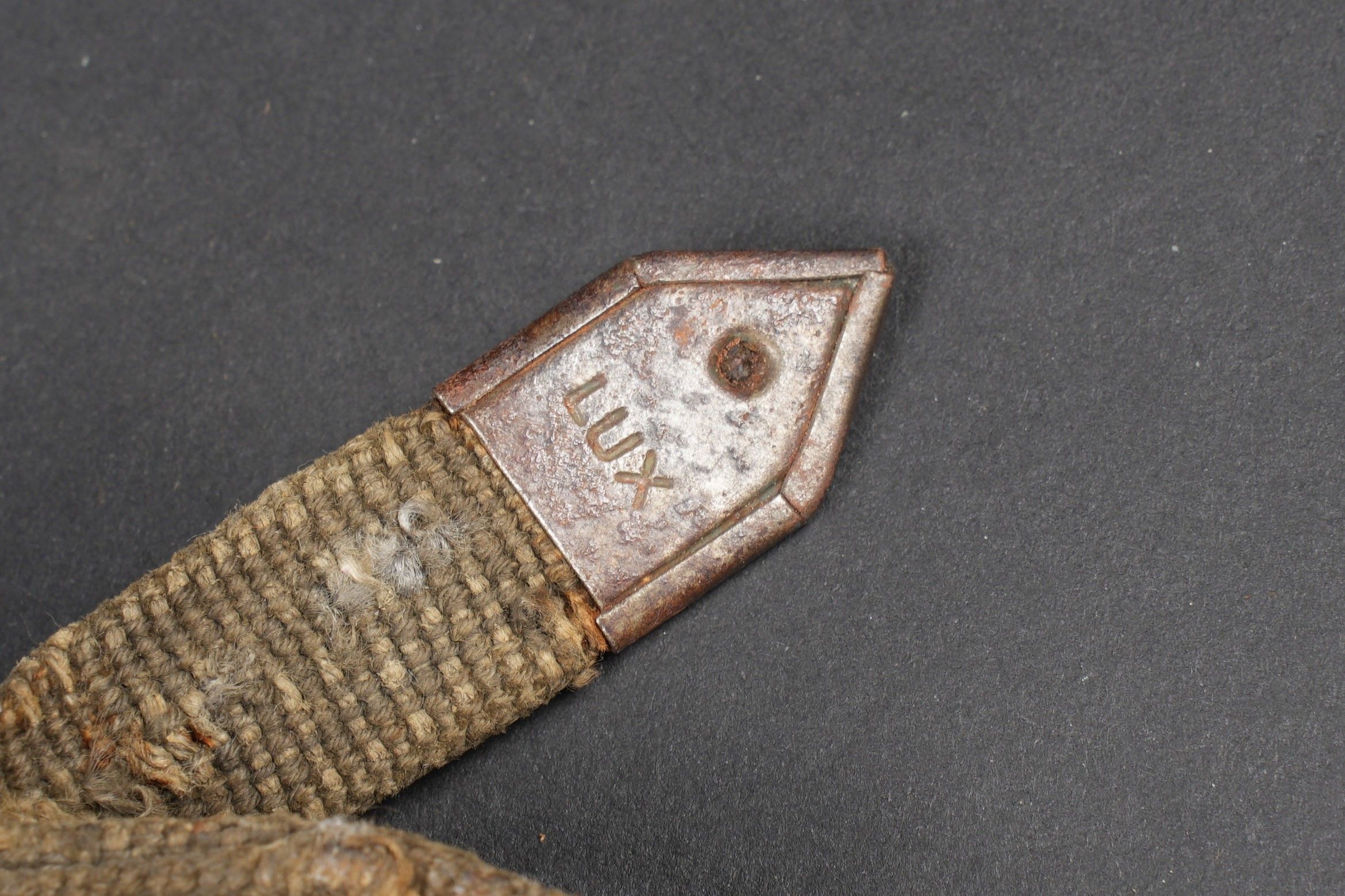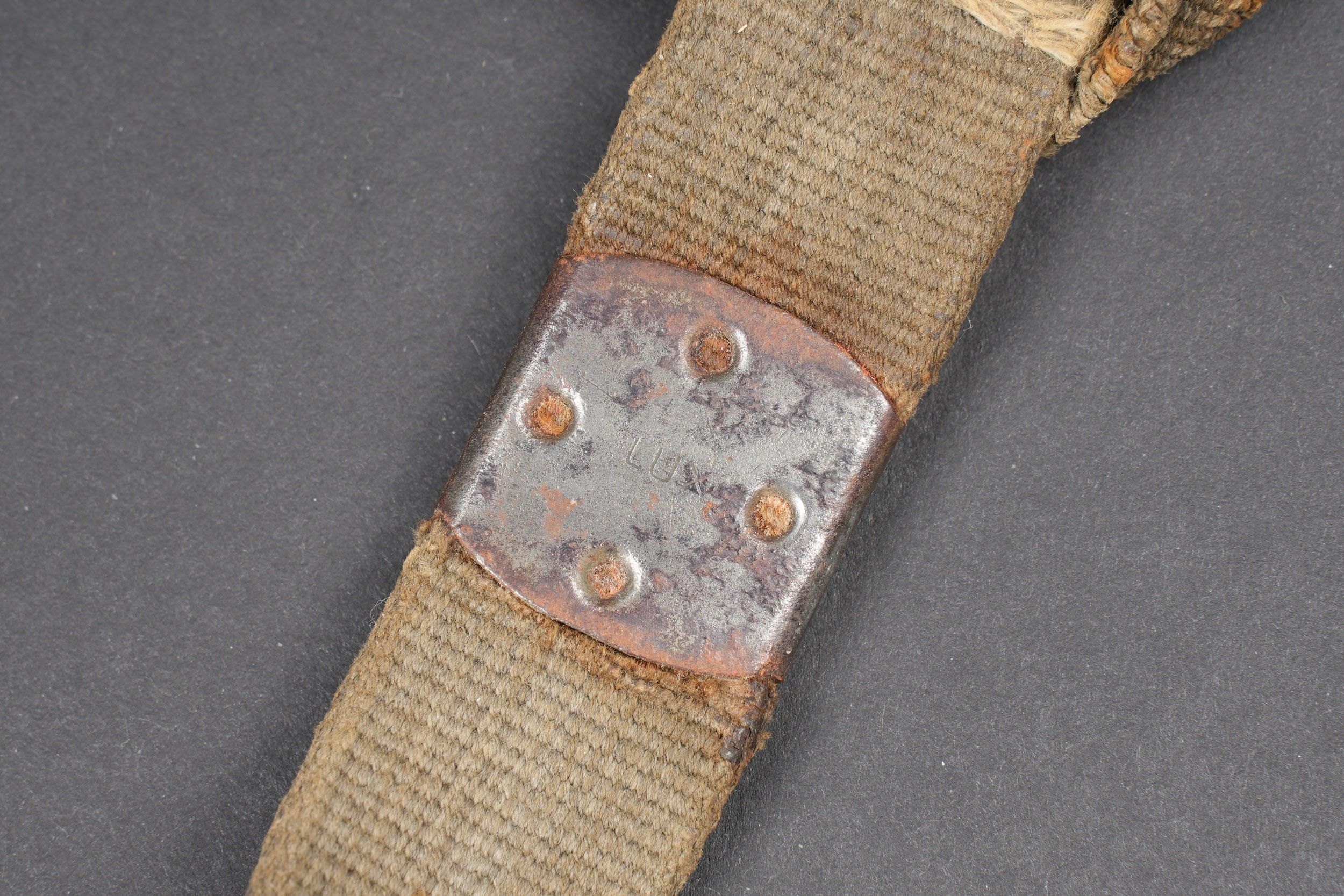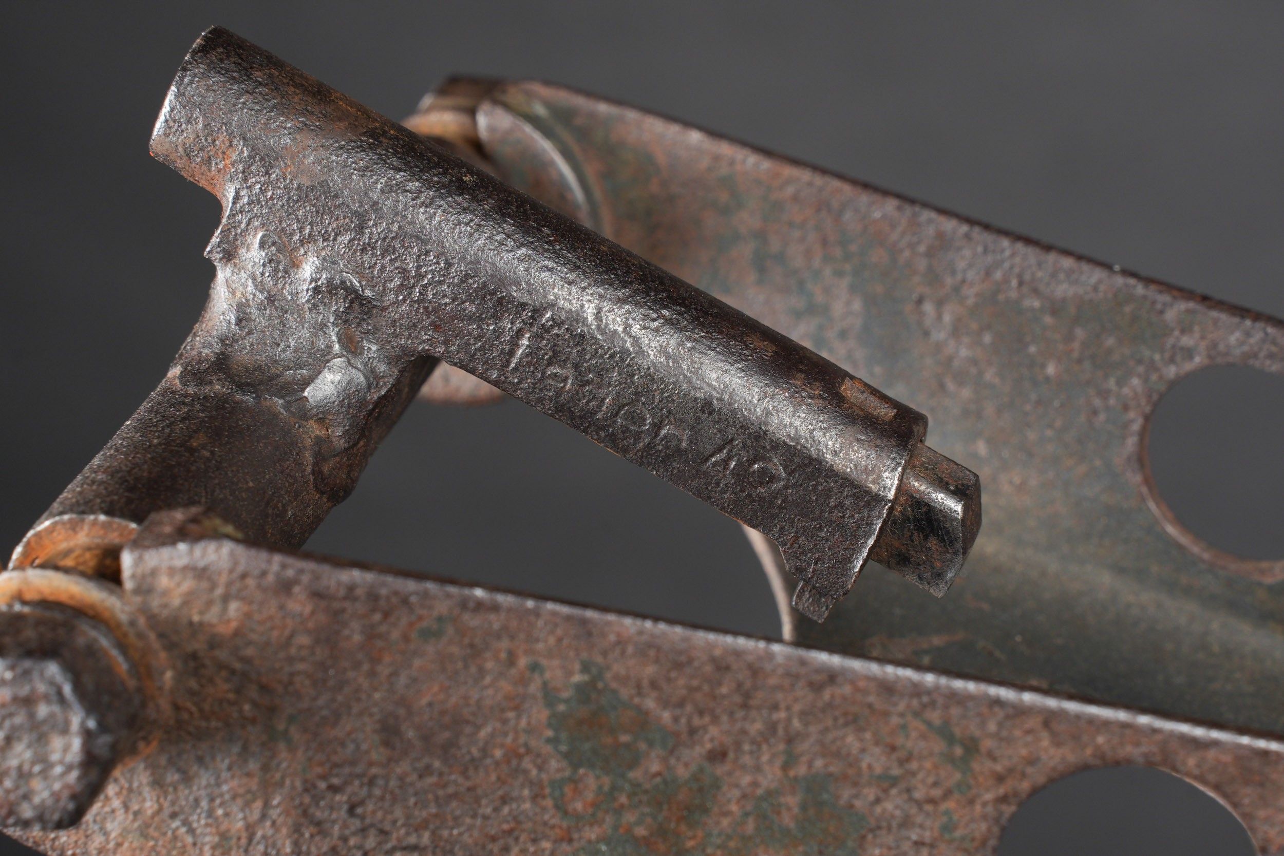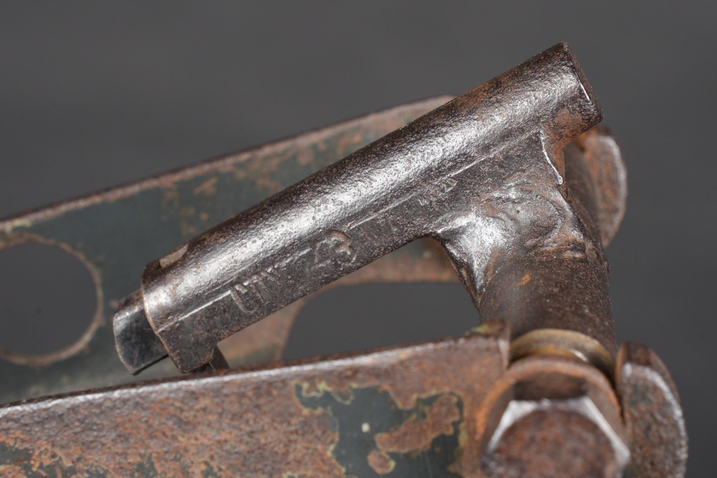 MG 42 anti-aircraft carriage. Metal tripod, telescopic tubes. All moving parts are functional. Paintwork almost missing. Rare complete carrying strap. The metal reinforcements are marked LUX. BRC manufacture with Waa eagles. Metal cradle, also unpainted. Marked ST BL 42 TZ. The MG 42 attachment system is oxidised, marked Lager 42 and CNX 43. Entirely period. Some wear and oxidation. Condition II+. MG 42 anti-aircraft tripod. Metal tripod with telescopic legs. All moving parts functional. Paint nearly gone. Rare complete carrying strap present. Metal fittings marked LUX. Maker BRC with eagle Waa stamps. Cradle also in bare metal, marked ST BL 42 TZ. MG 42 mounting system oxidized, marked Lager 42 and CNX 43. Fully period original assembly. Shows wear and oxidation. Condition II+.
