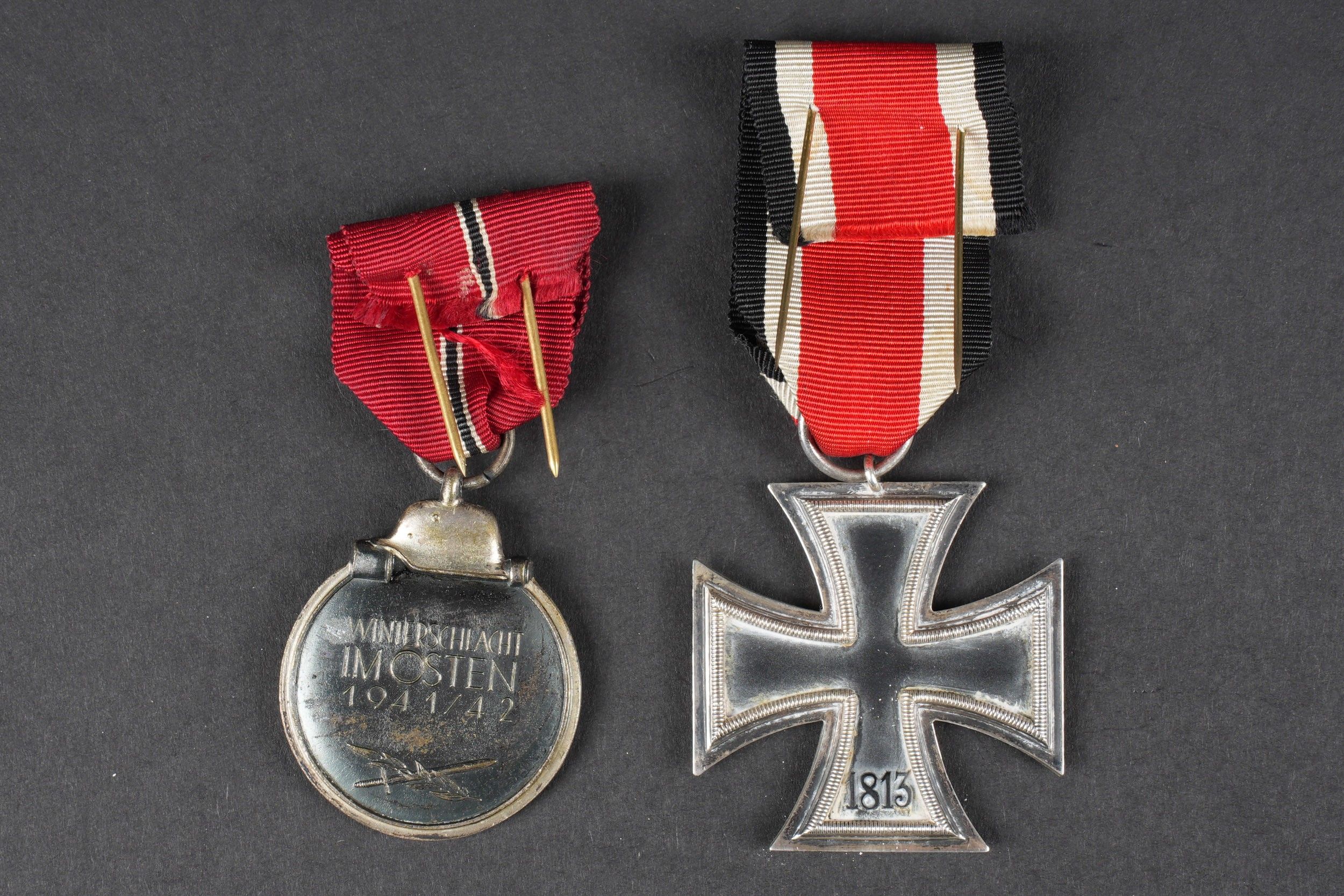 German insignia. Comprising an Iron Cross Second Class, complete with ribbon, modern pin to back, made in three parts, no visible markings. An Eastern Front medal, complete with ribbon, modern pin to back. Some wear and patina to be noted. Condition II+. German insignia. Includes an Iron Cross 2nd Class with ribbon, three-part construction, no visible maker's mark, modern pin on reverse, and an Eastern Front Medal with ribbon, modern pin on reverse. Shows wear and patina. Condition II+.