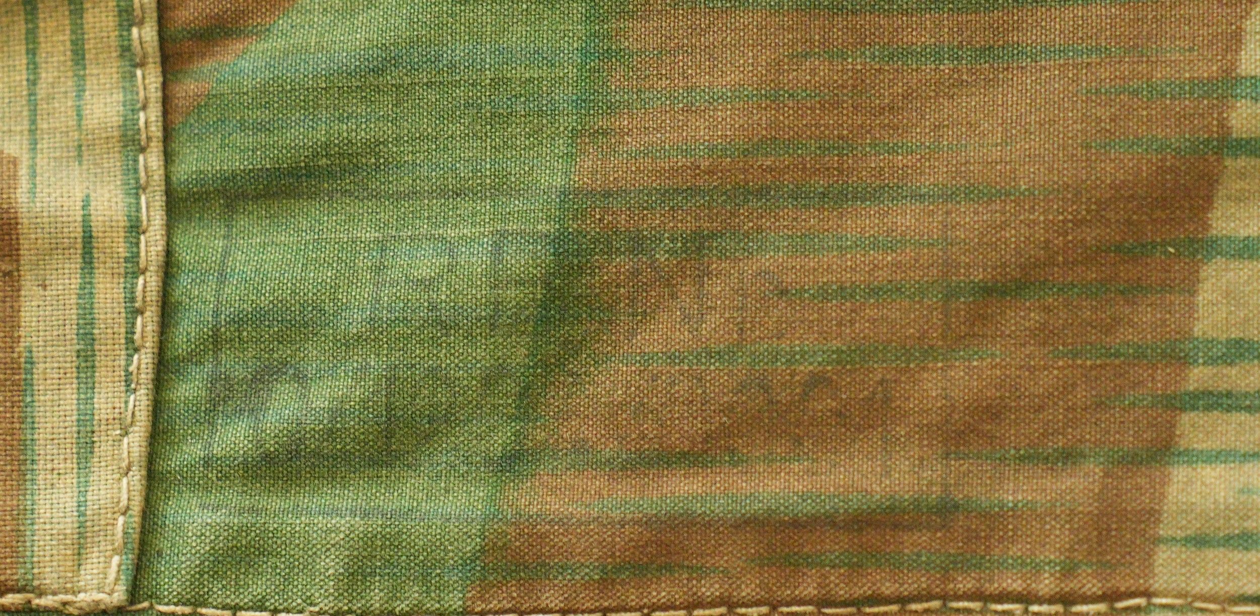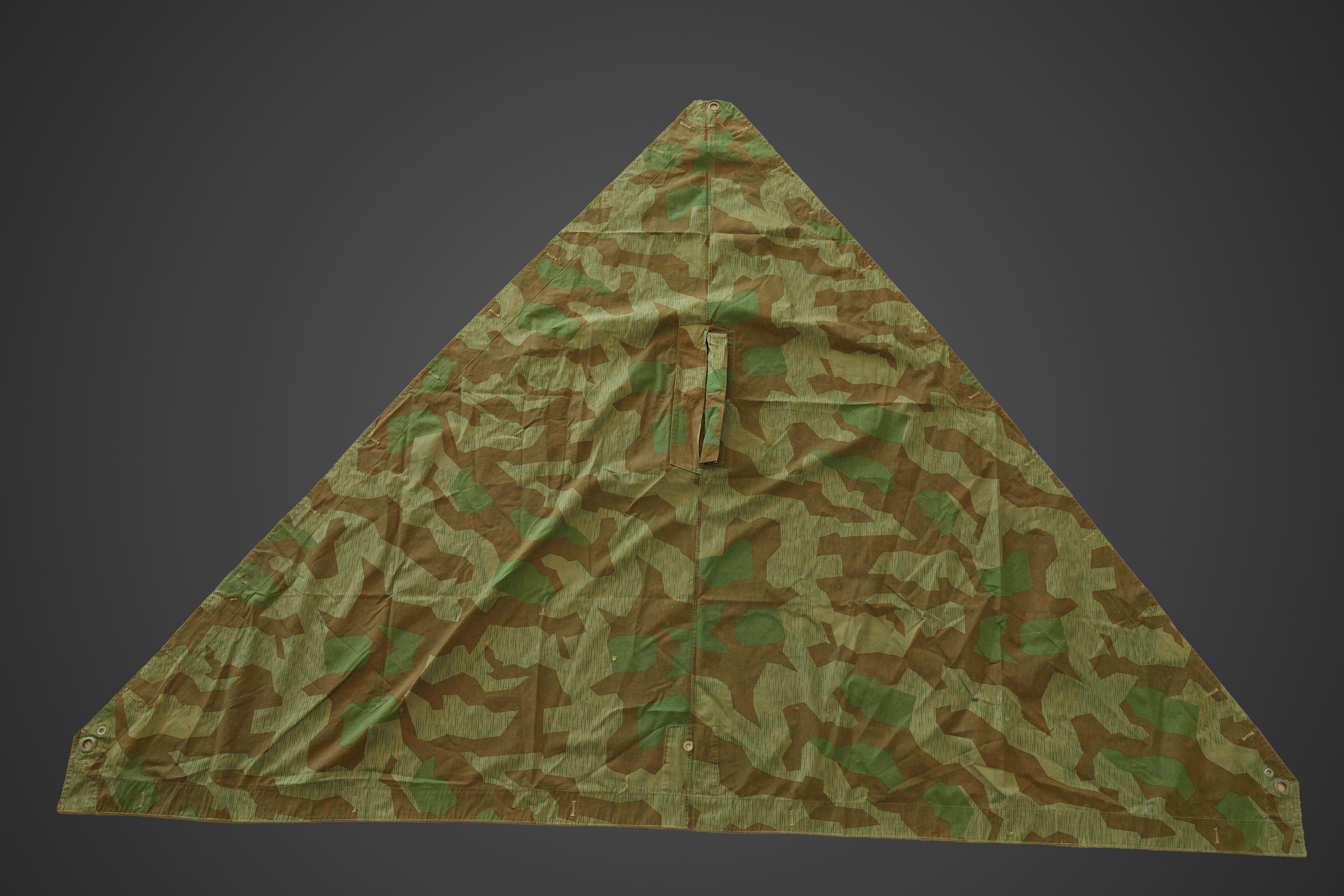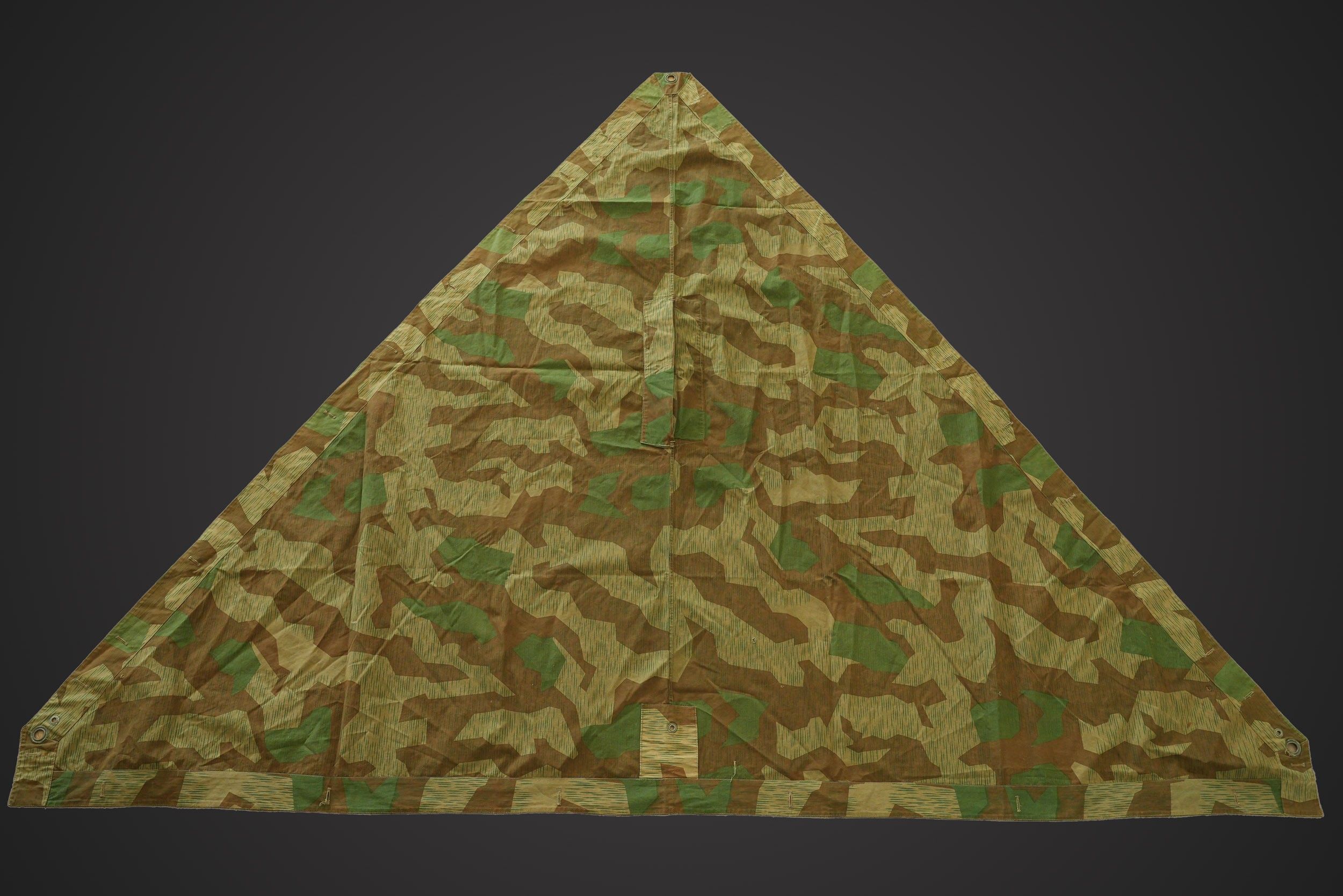 Heer tent canvas. Bright camouflage, the colours are very vivid. Most of the buttons are present. The cords are missing. RBNr markings partially illegible. Some wear and patina, as well as a few stains and tears. Condition II+. Heer tent section. Splinter camouflage pattern with vivid colours. Most buttons present, cords missing. Partially legible RBNr markings. Shows wear, patina, and some stains and snags. Condition II+.