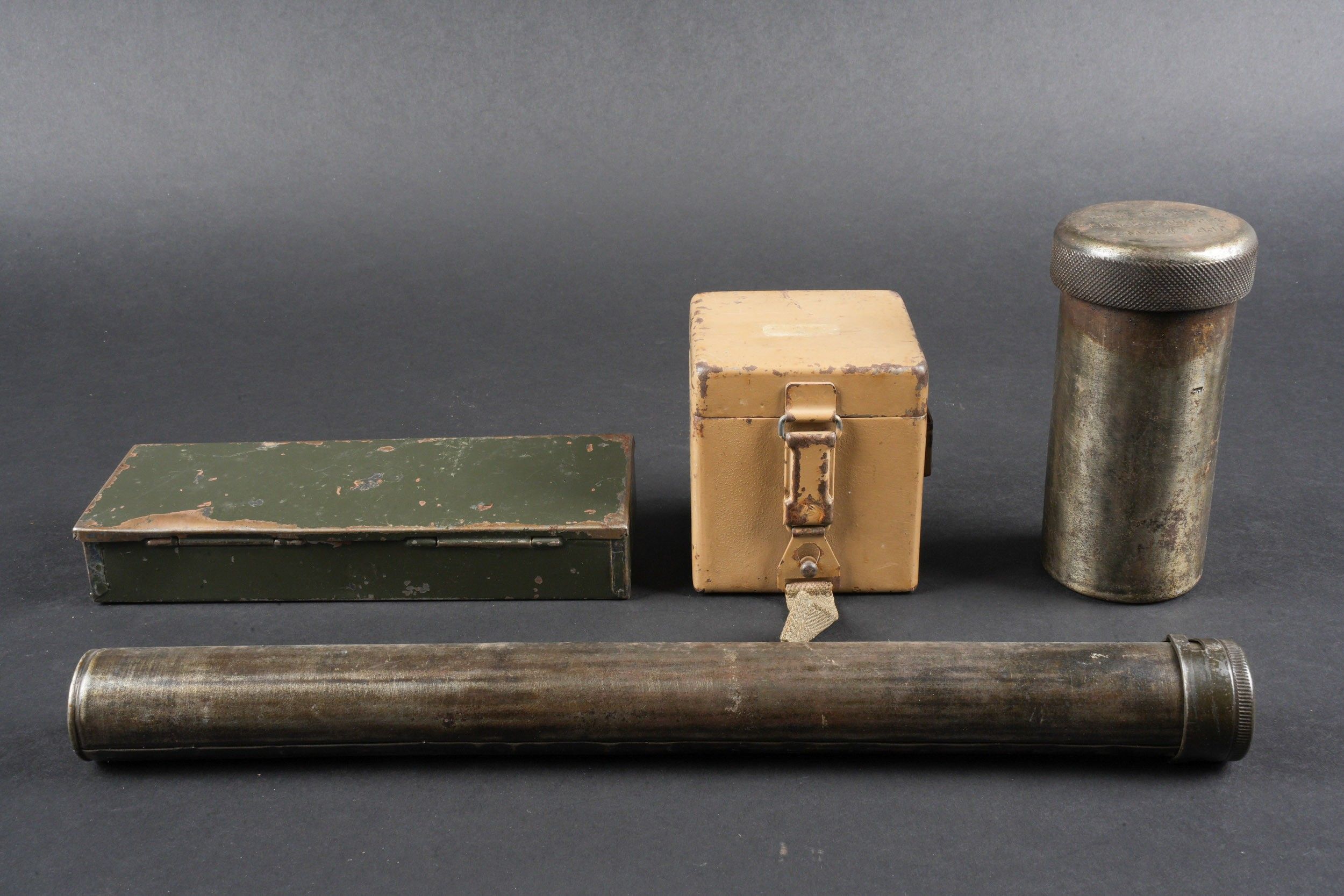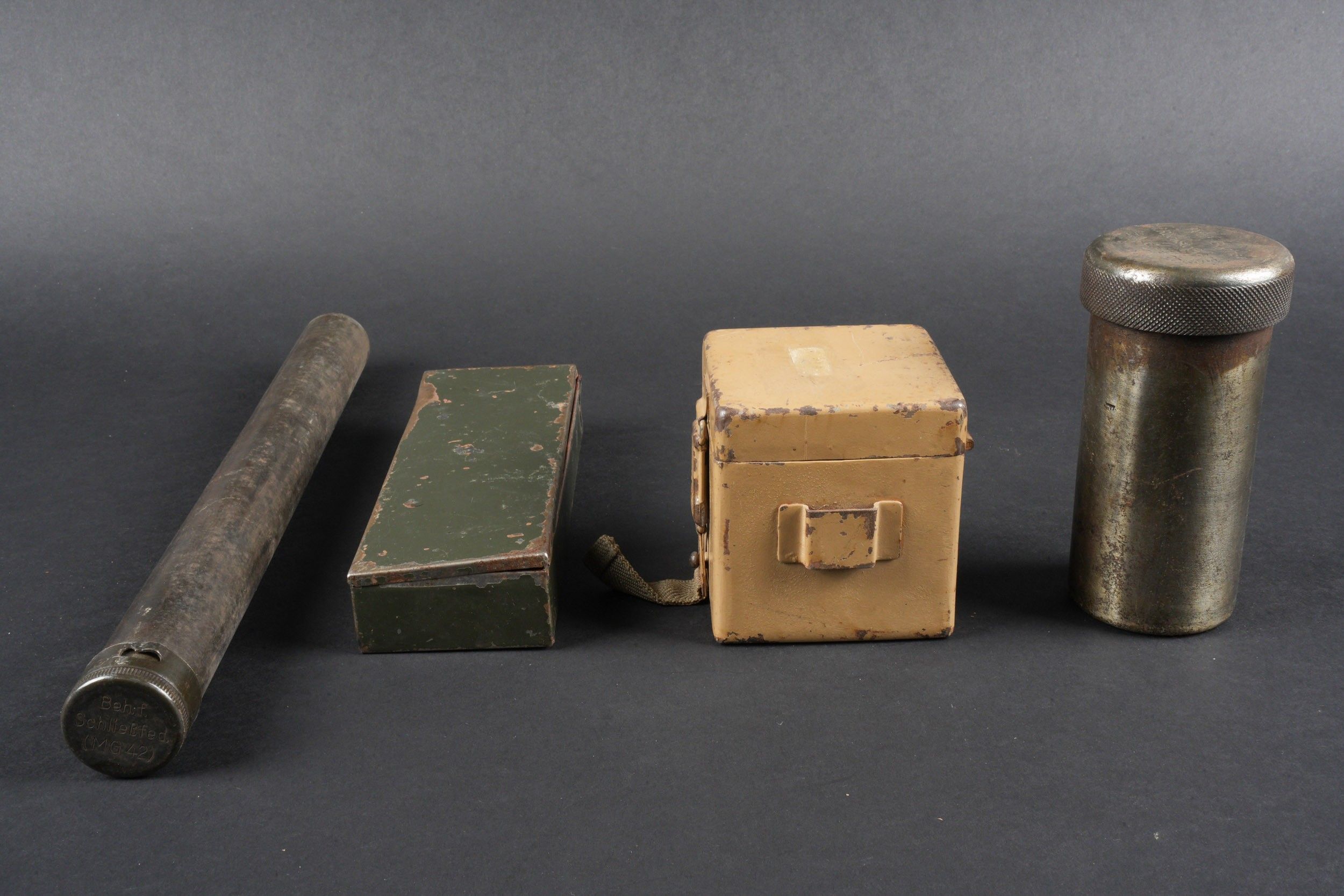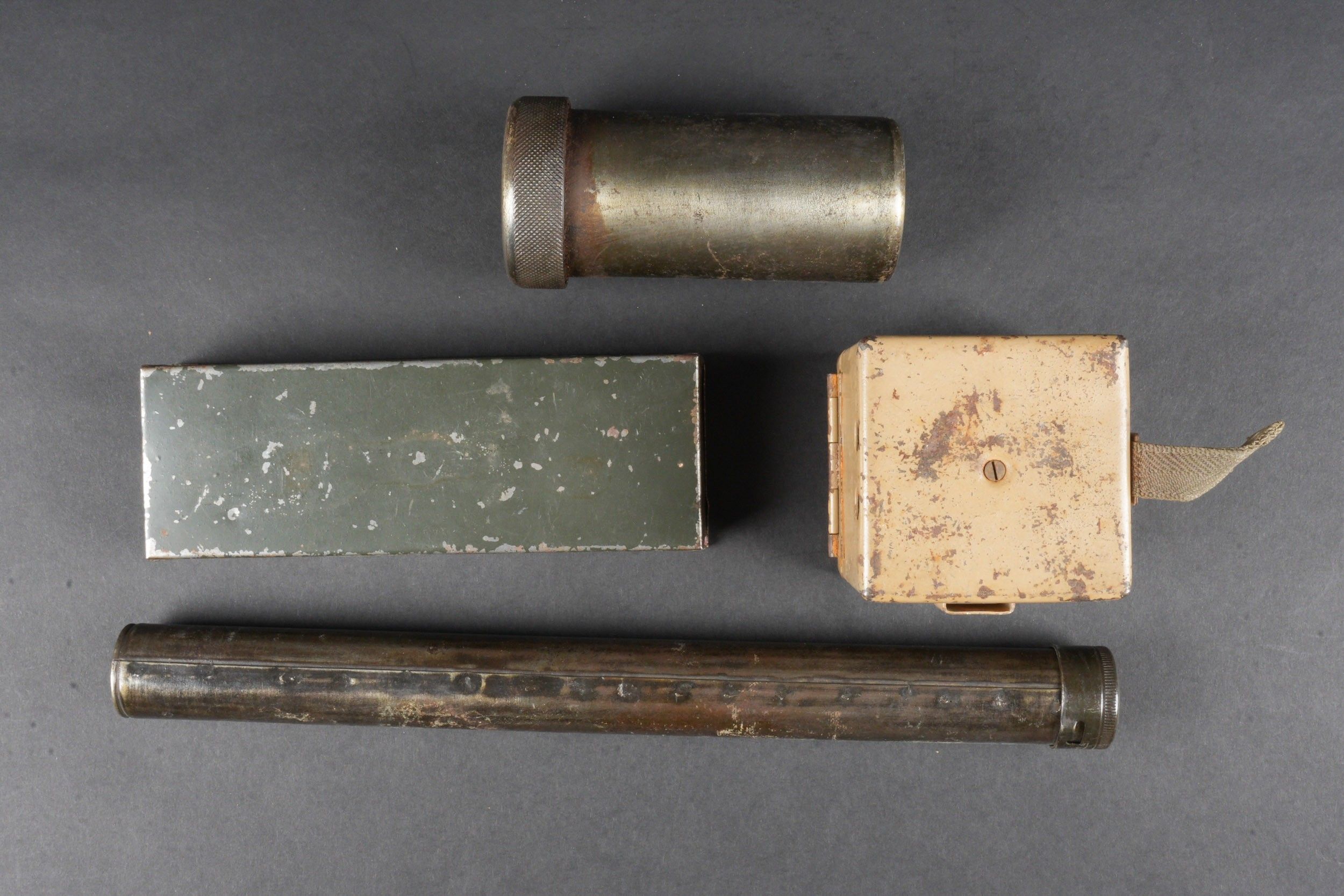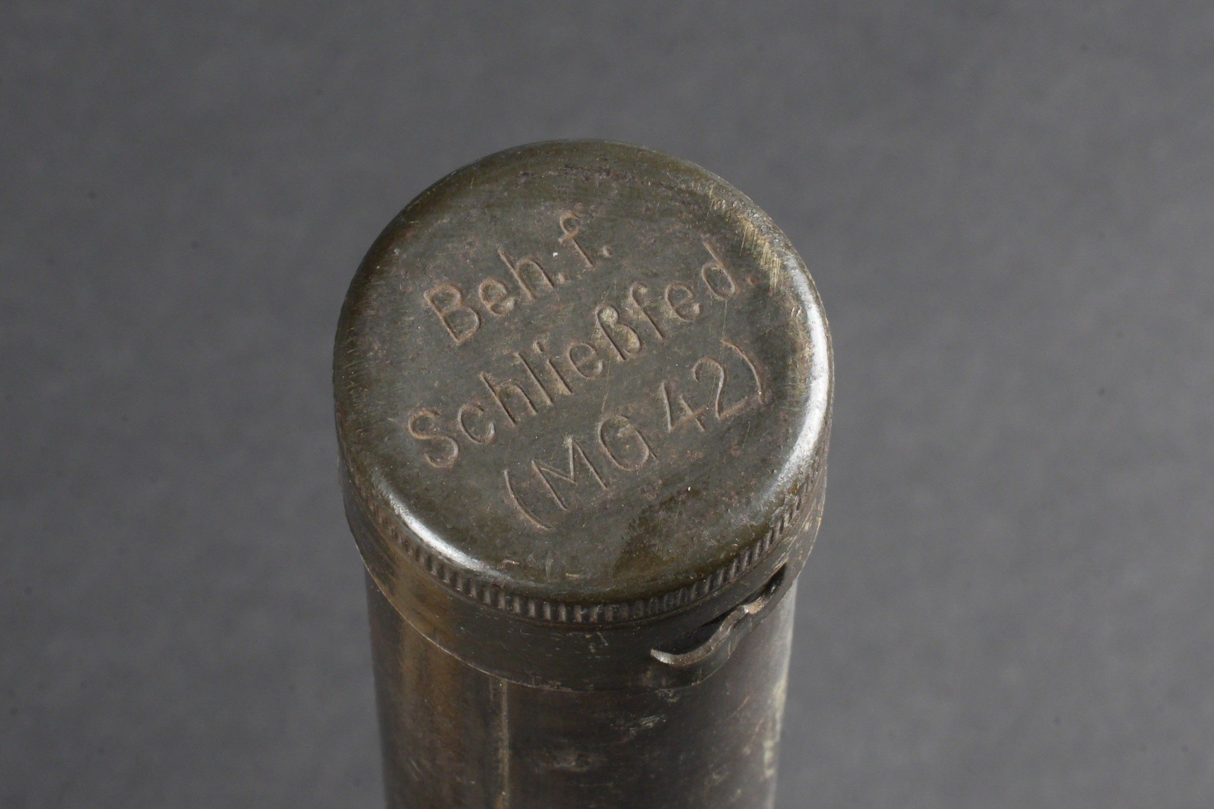 MG accessories. Comprising a metal battery box, 70% sand yellow paint. Pull tab complete. DDV manufacture, with beautiful Waa eagle. Felt reinforcement under the lid. The internal bakelite racks are present. Spare parts box, metal, 70% paint, empty, internal racks present. A metal box, with its lid marked Petr Buchse f Rückstossverst z MG 42 ddf. A metal tube, with cap, marked Beh F Schliessfed MG 42, BUH 42 manufacture. All boxes are empty. Some wear and patina to be noted. Condition II+. MG accessories. Includes a metal battery box with 70% tan paint, complete pull cord, maker DDV with eagle Waa, felt padding under lid, and intact bakelite inner racks. Also a metal spare parts box, 70% paint, empty with inner racks. Another metal box marked Petr Büchse f Rückstossverst z MG 42 ddf. One metal tube with cap marked Beh F Schliessfed MG 42 BUH 42. All boxes empty. Shows wear and patina. Condition II+.