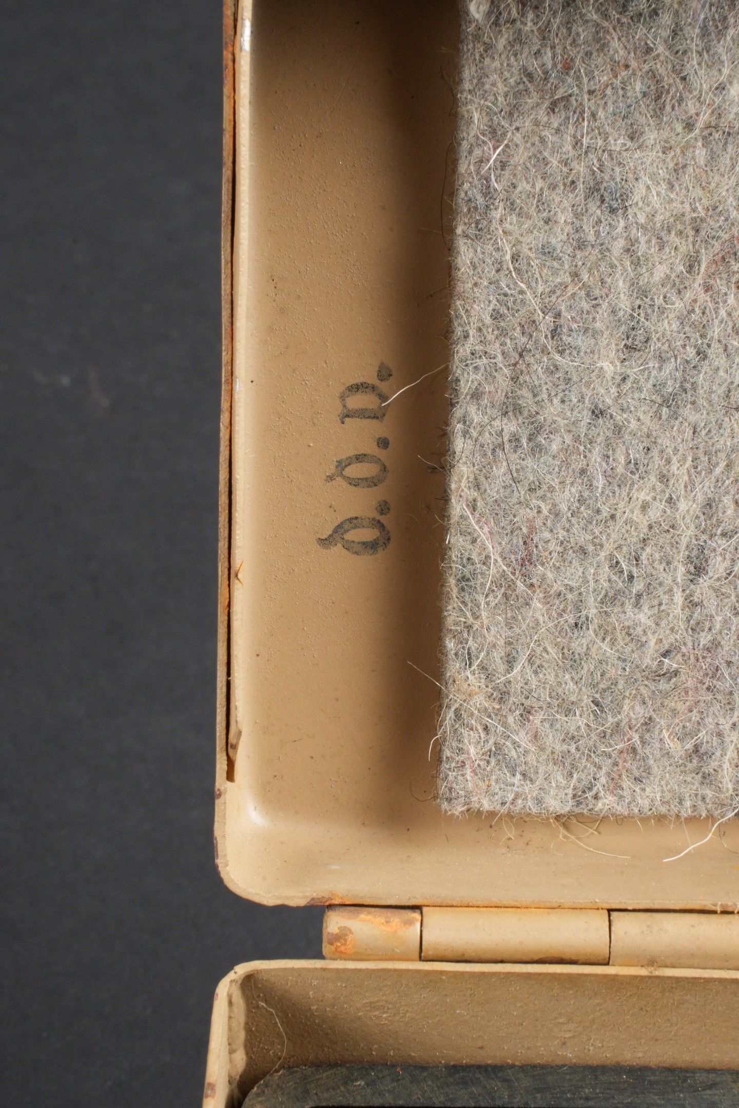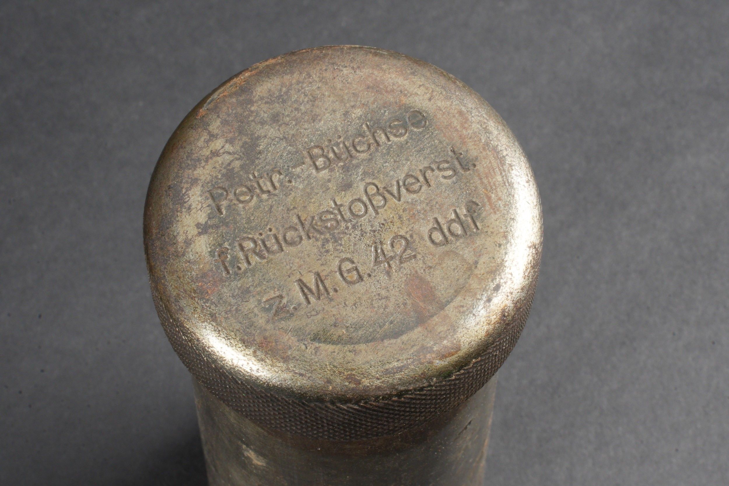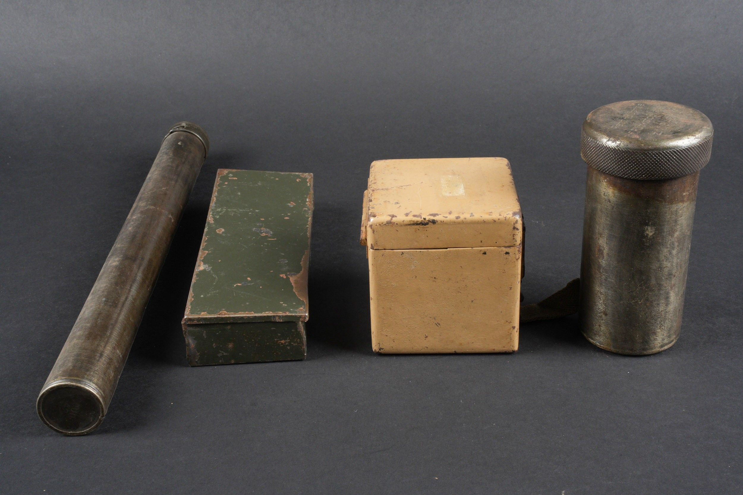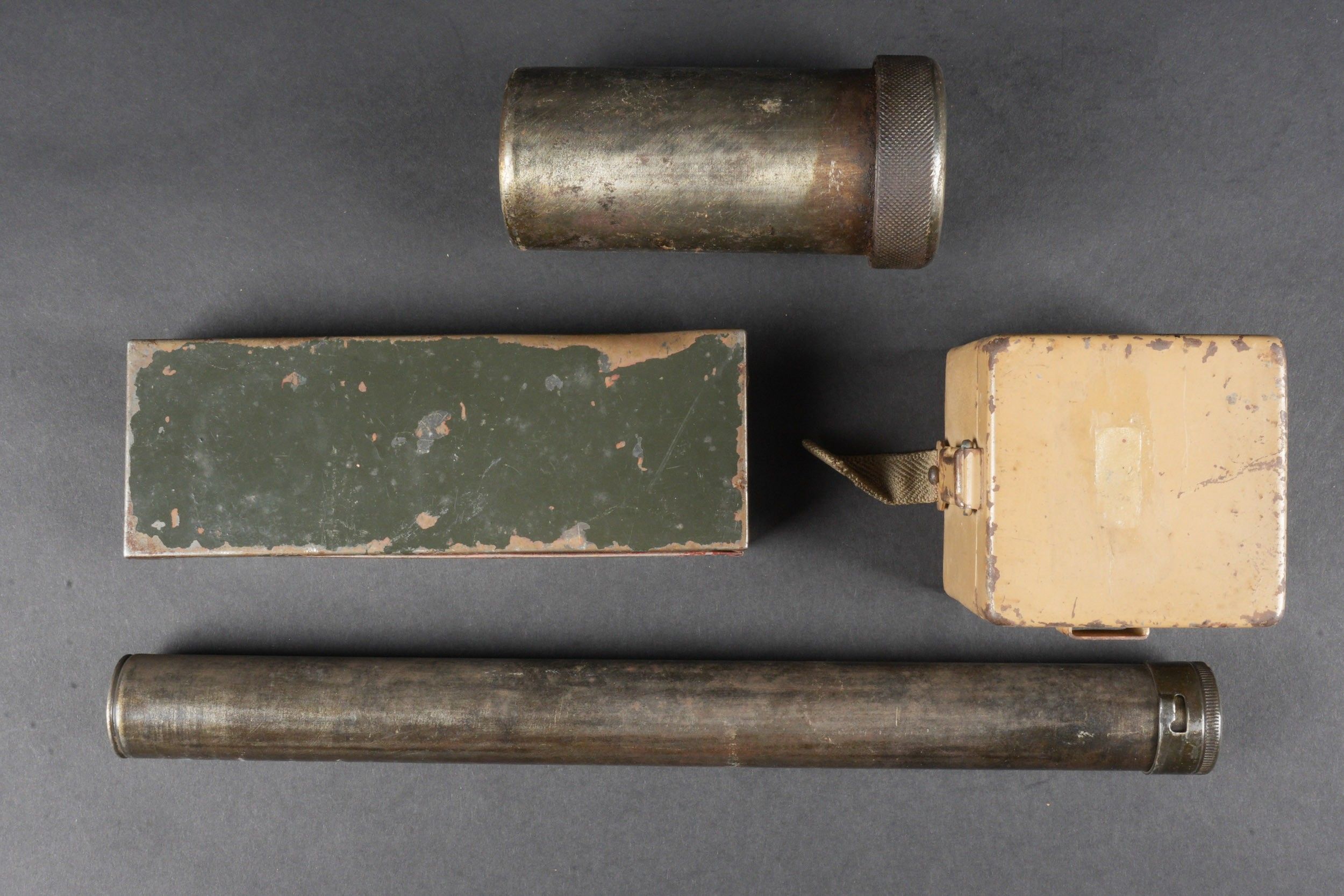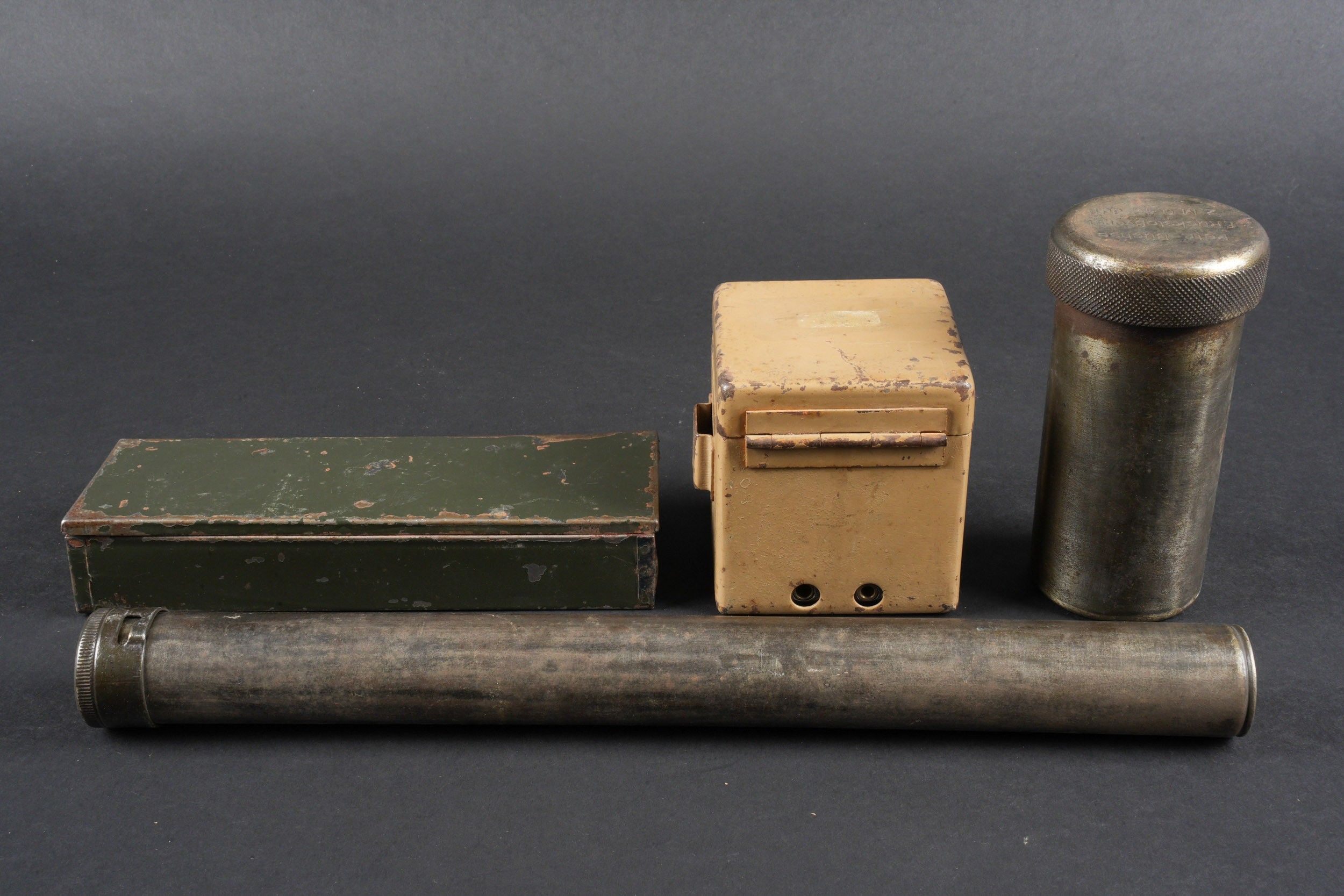 MG accessories. Comprising a metal battery box, 70% sand yellow paint. Pull tab complete. DDV manufacture, with beautiful Waa eagle. Felt reinforcement under the lid. The internal bakelite racks are present. Spare parts box, metal, 70% paint, empty, internal racks present. A metal box, with its lid marked Petr Buchse f Rückstossverst z MG 42 ddf. A metal tube, with cap, marked Beh F Schliessfed MG 42, BUH 42 manufacture. All boxes are empty. Some wear and patina to be noted. Condition II+. MG accessories. Includes a metal battery box with 70% tan paint, complete pull cord, maker DDV with eagle Waa, felt padding under lid, and intact bakelite inner racks. Also a metal spare parts box, 70% paint, empty with inner racks. Another metal box marked Petr Büchse f Rückstossverst z MG 42 ddf. One metal tube with cap marked Beh F Schliessfed MG 42 BUH 42. All boxes empty. Shows wear and patina. Condition II+.
