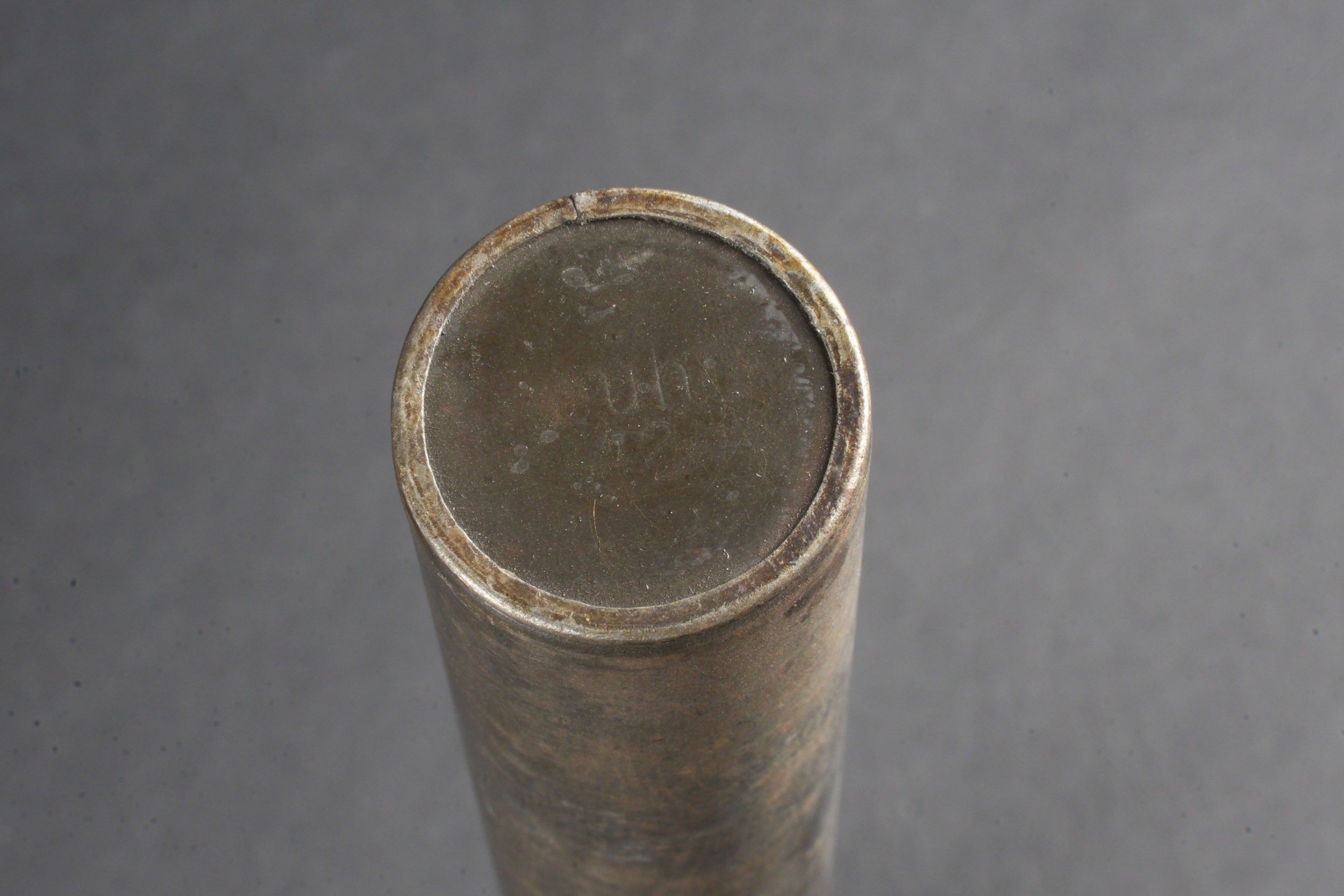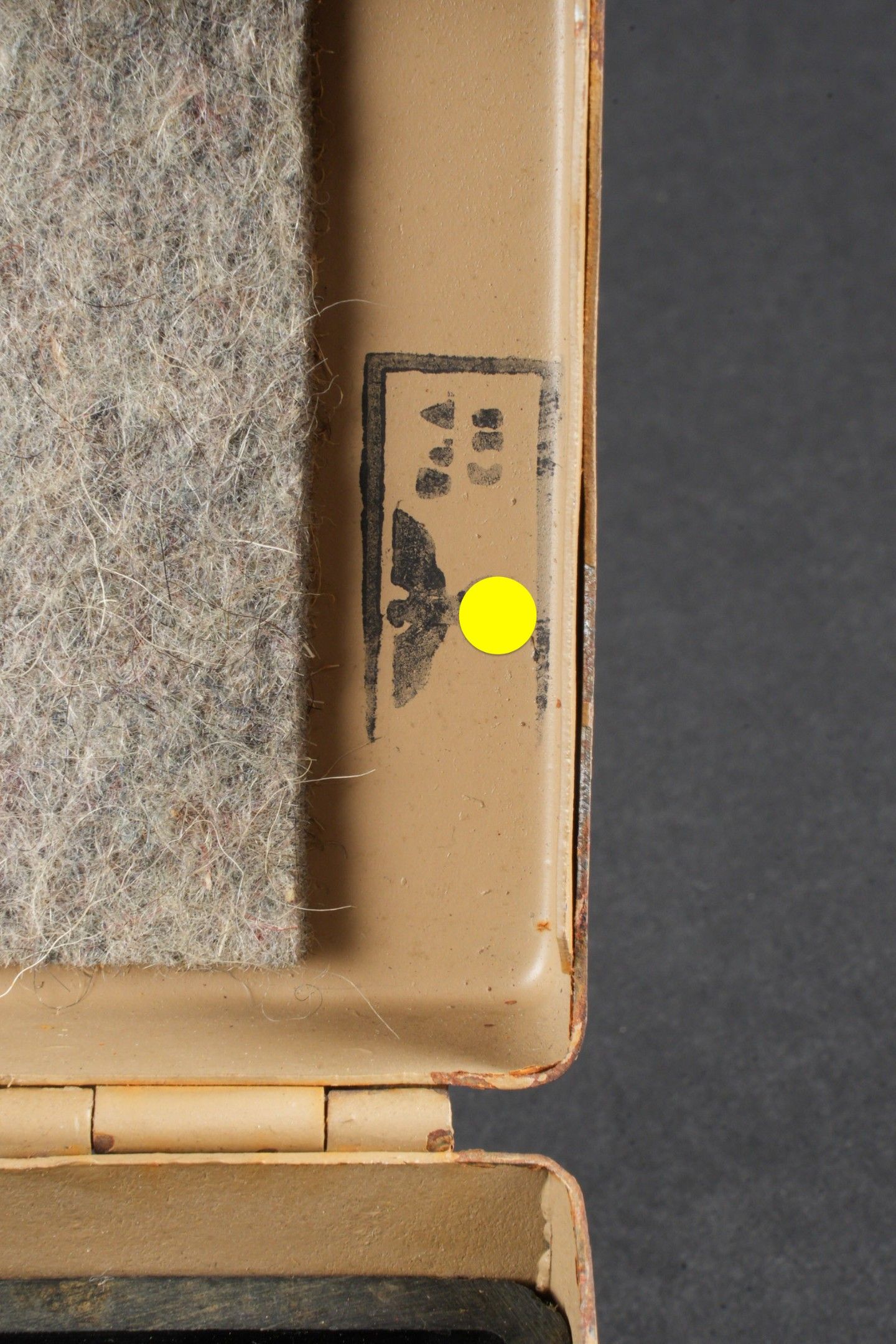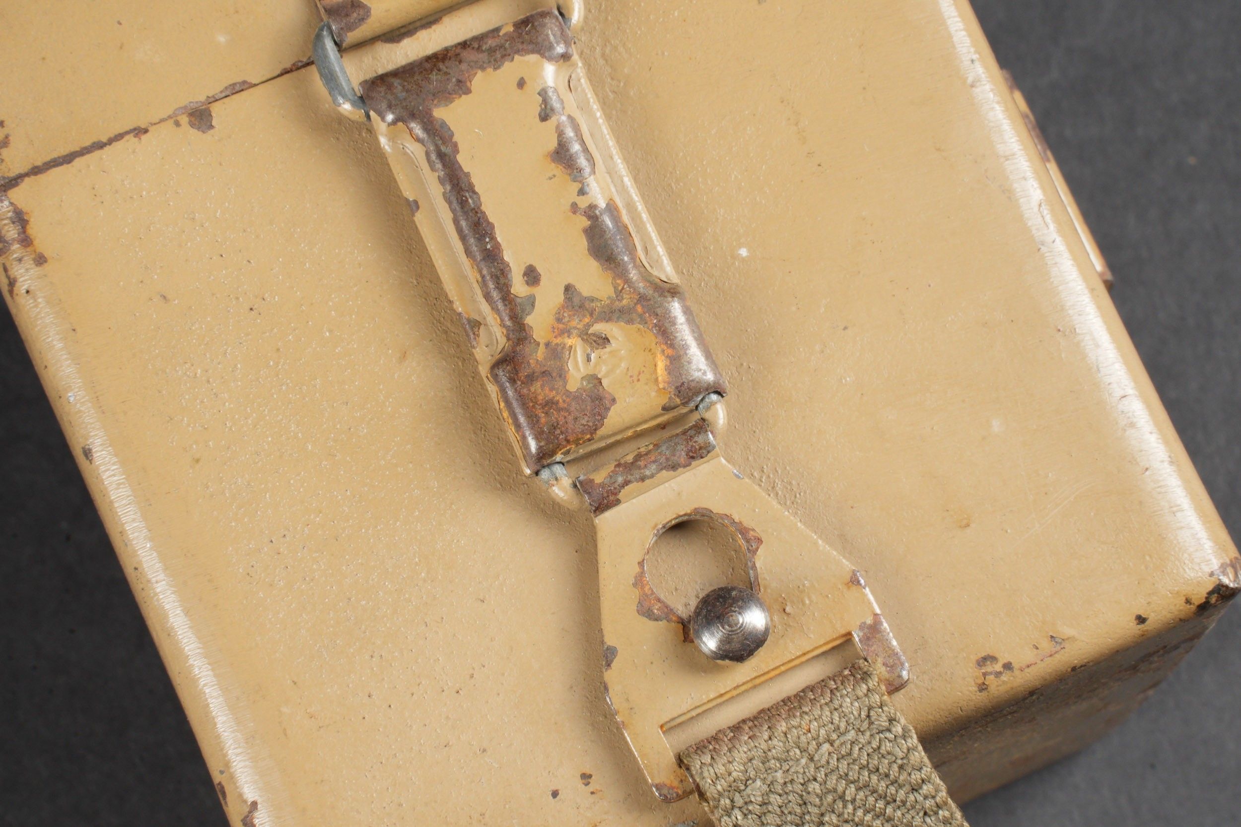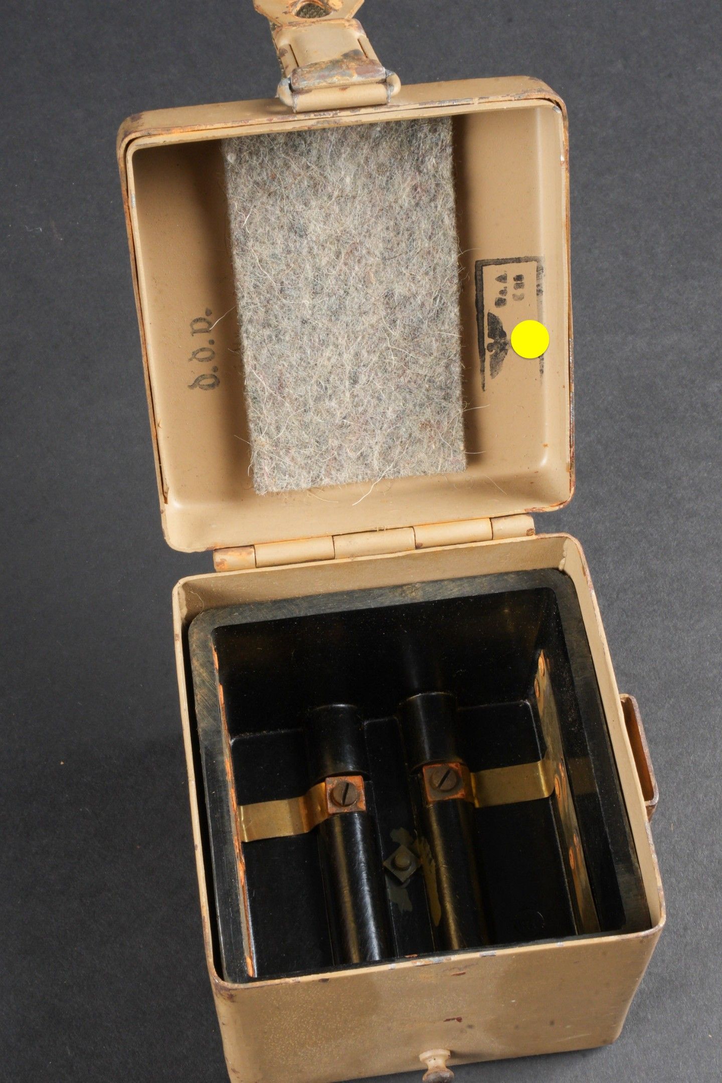 MG accessories. Comprising a metal battery box, 70% sand yellow paint. Pull tab complete. DDV manufacture, with beautiful Waa eagle. Felt reinforcement under the lid. The internal bakelite racks are present. Spare parts box, metal, 70% paint, empty, internal racks present. A metal box, with its lid marked Petr Buchse f Rückstossverst z MG 42 ddf. A metal tube, with cap, marked Beh F Schliessfed MG 42, BUH 42 manufacture. All boxes are empty. Some wear and patina to be noted. Condition II+. MG accessories. Includes a metal battery box with 70% tan paint, complete pull cord, maker DDV with eagle Waa, felt padding under lid, and intact bakelite inner racks. Also a metal spare parts box, 70% paint, empty with inner racks. Another metal box marked Petr Büchse f Rückstossverst z MG 42 ddf. One metal tube with cap marked Beh F Schliessfed MG 42 BUH 42. All boxes empty. Shows wear and patina. Condition II+.