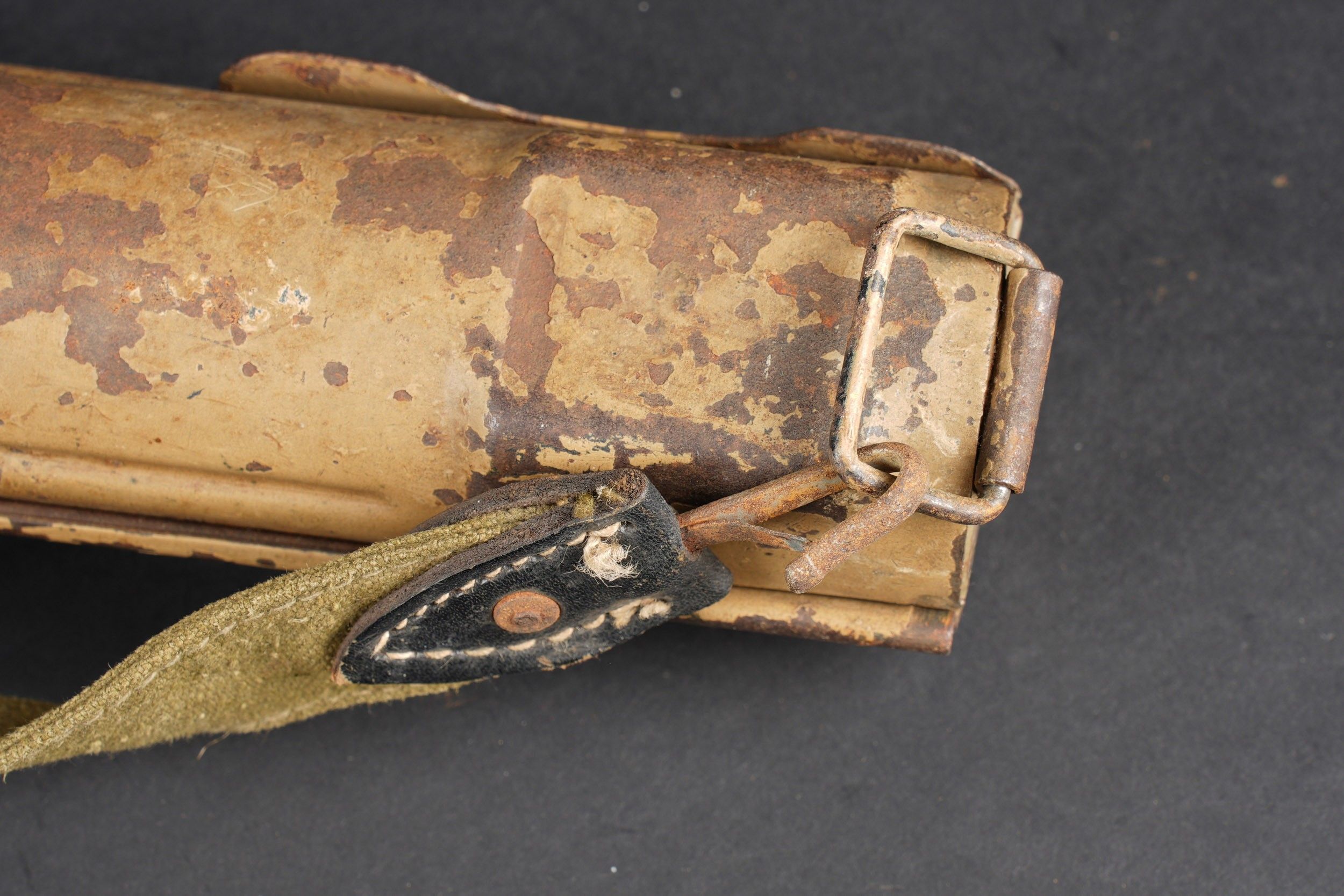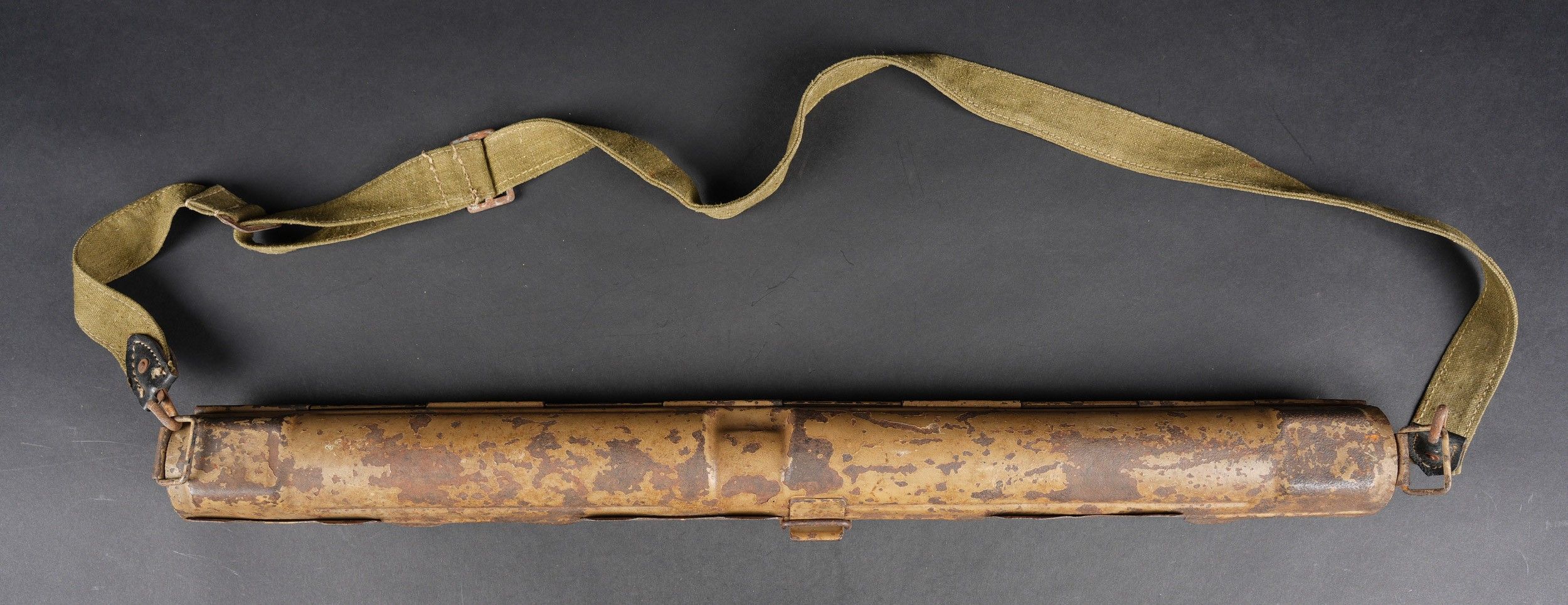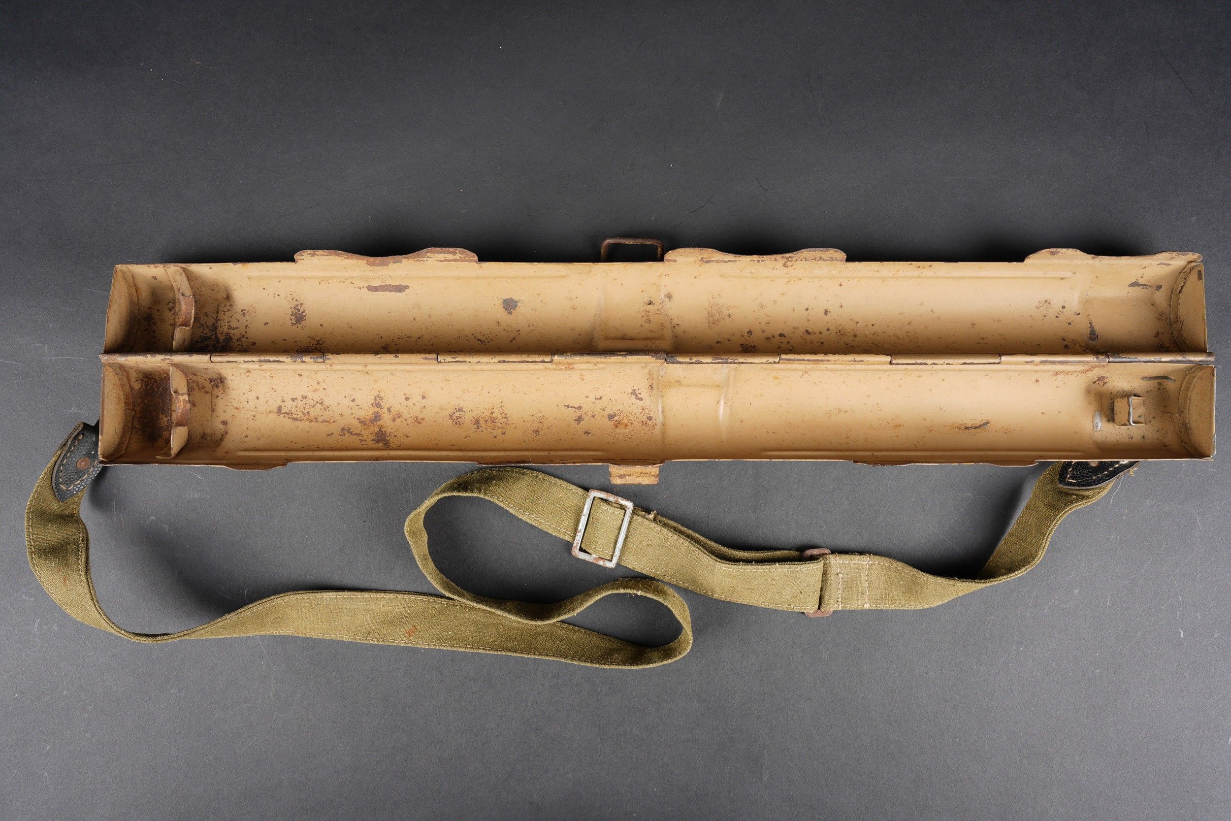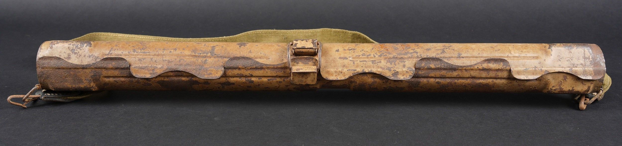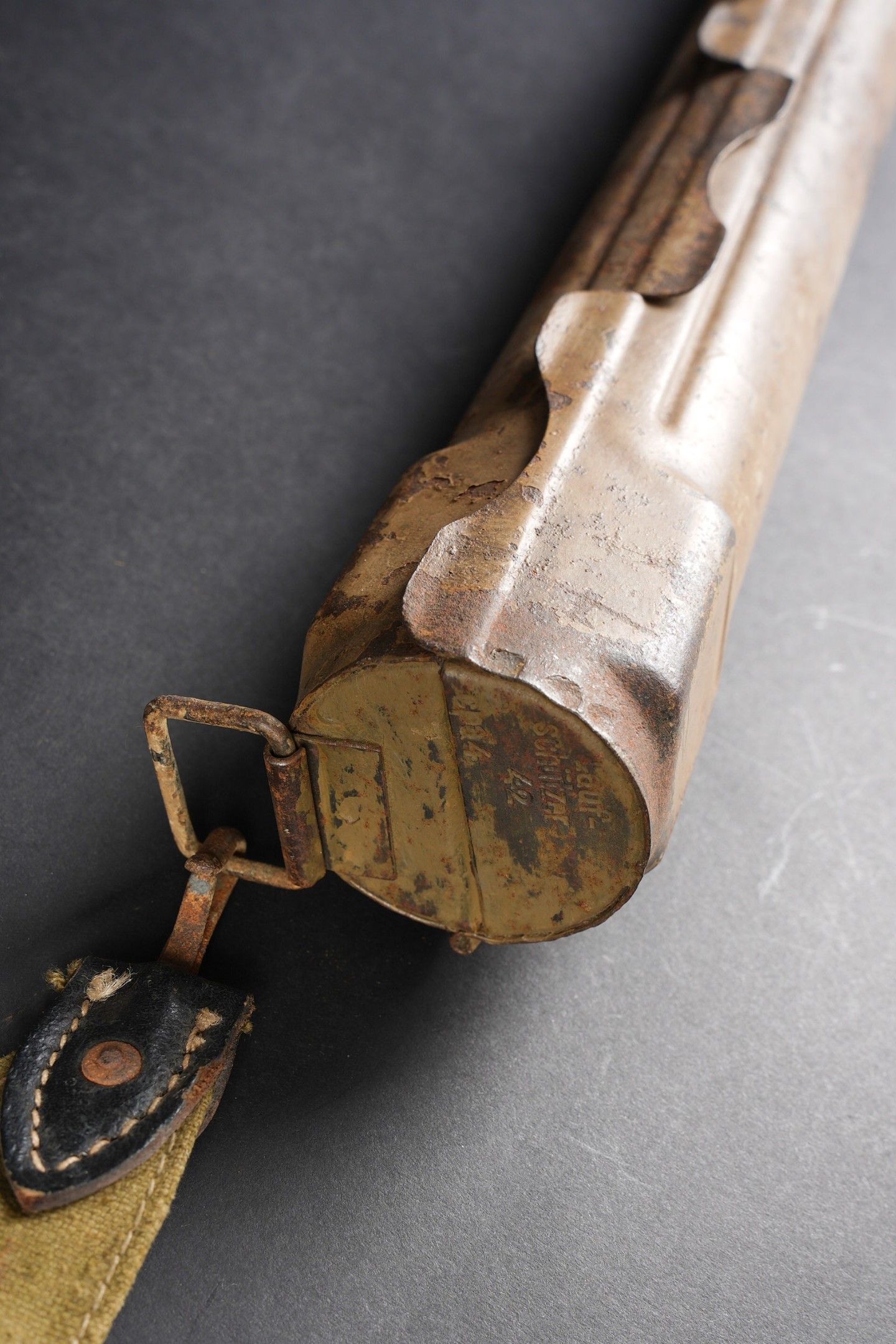 MG 3442 gun carrier. Made of metal. The locking hook is complete. 70% sand yellow paint. Interior also has sandy yellow paint. Made by Lauf Schützer 42 CPA 4. The carrying strap has been replaced by a breadbag strap in Feldgrau canvas. The snap hooks are functional. Markings are illegible. Some wear and patina. Condition II+. MG 3442 barrel carrier. Metal construction with complete latch. 70% tan paint remaining, including interior. Marked Lauf Schützer 42 CPA 4. Carry strap replaced with a Feldgrau breadbag strap. Carabiners functional. Markings illegible. Shows wear and patina. Condition II+.