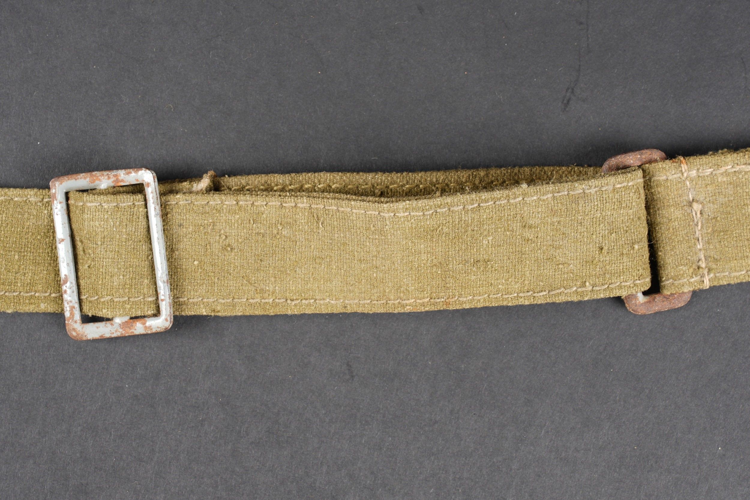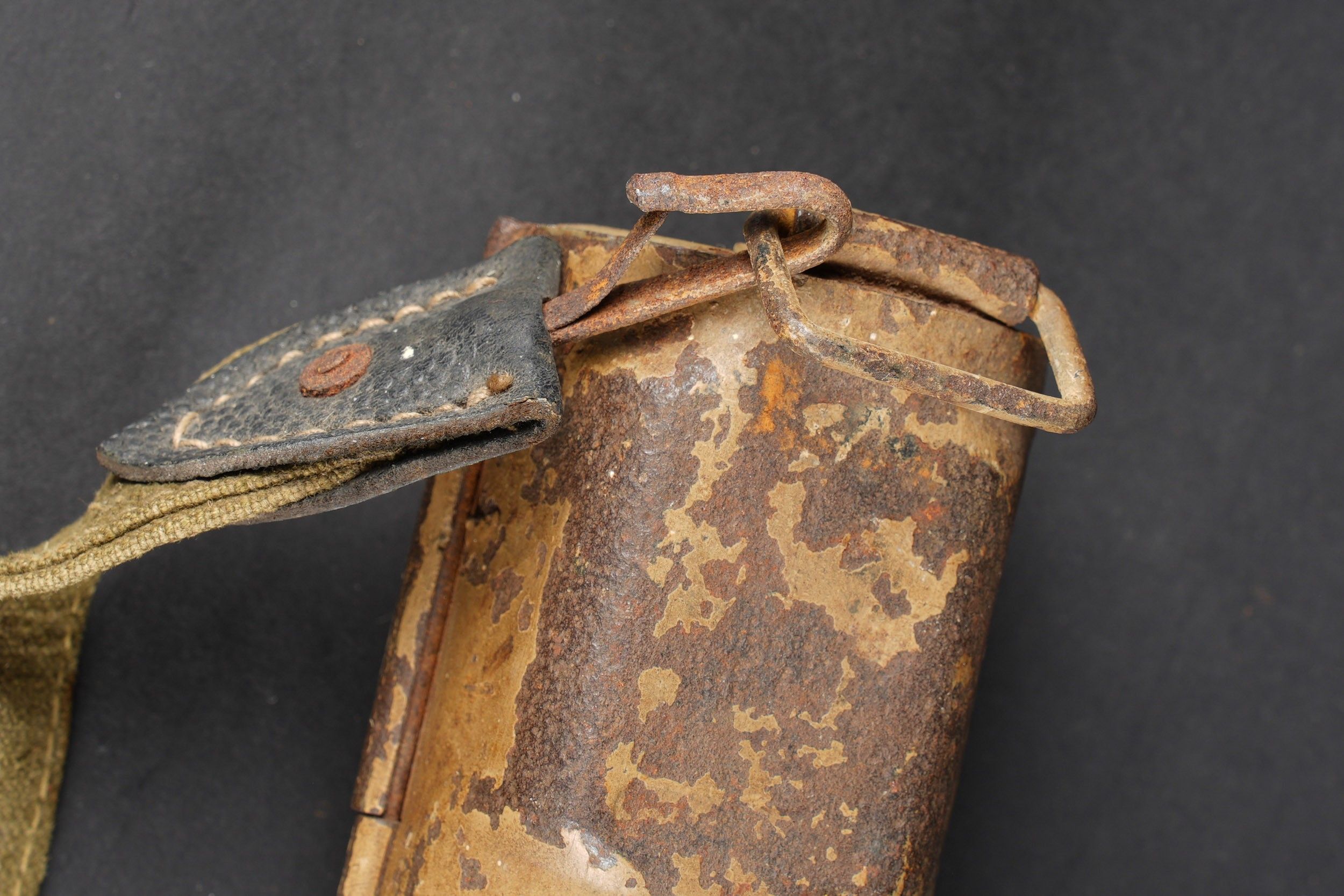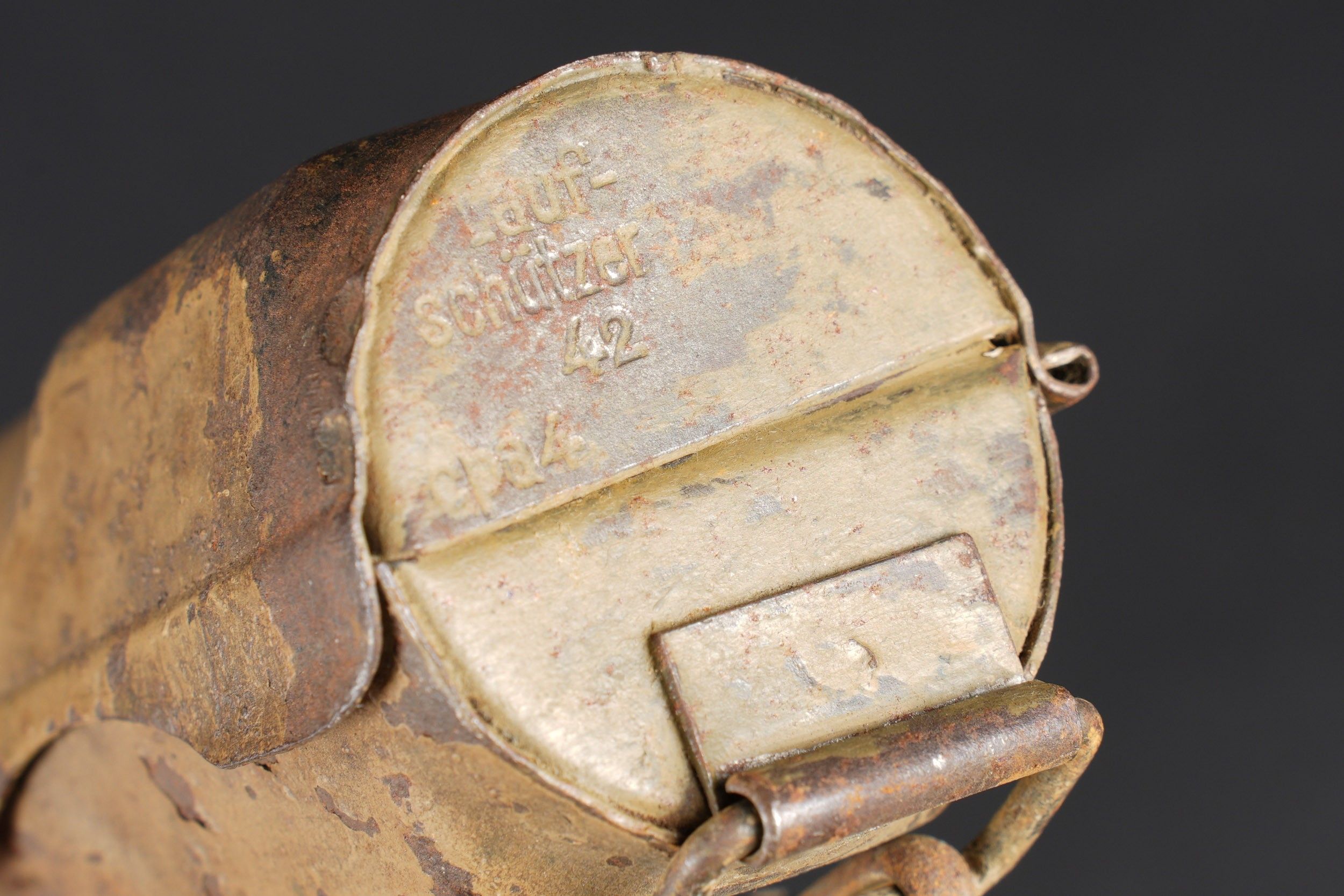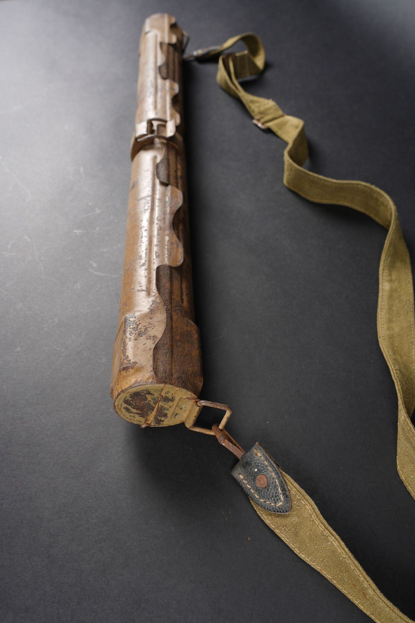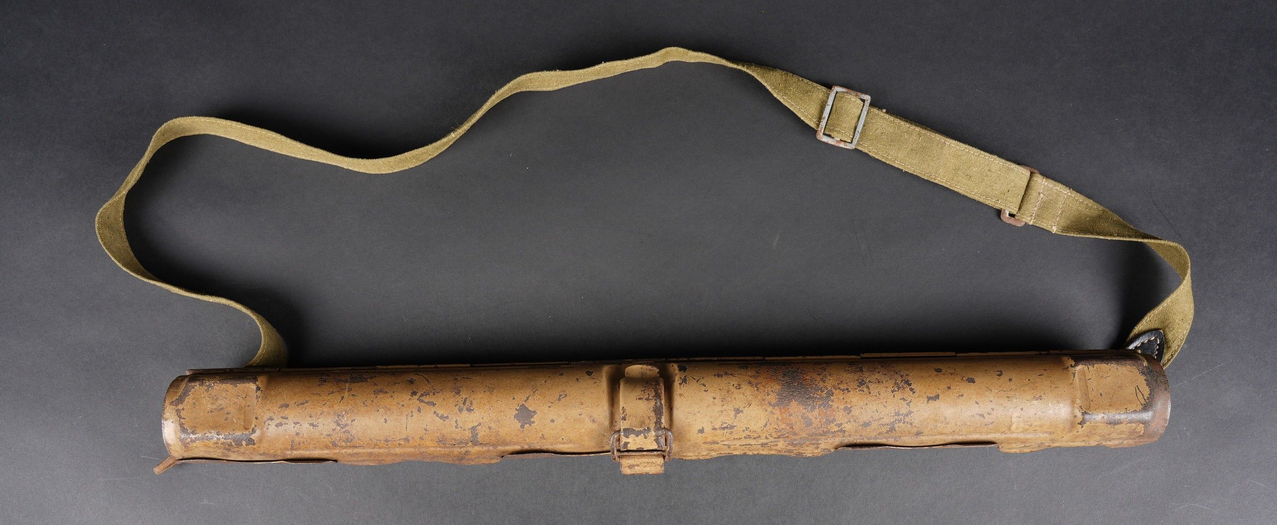 MG 3442 gun carrier. Made of metal. The locking hook is complete. 70% sand yellow paint. Interior also has sandy yellow paint. Made by Lauf Schützer 42 CPA 4. The carrying strap has been replaced by a breadbag strap in Feldgrau canvas. The snap hooks are functional. Markings are illegible. Some wear and patina. Condition II+. MG 3442 barrel carrier. Metal construction with complete latch. 70% tan paint remaining, including interior. Marked Lauf Schützer 42 CPA 4. Carry strap replaced with a Feldgrau breadbag strap. Carabiners functional. Markings illegible. Shows wear and patina. Condition II+.