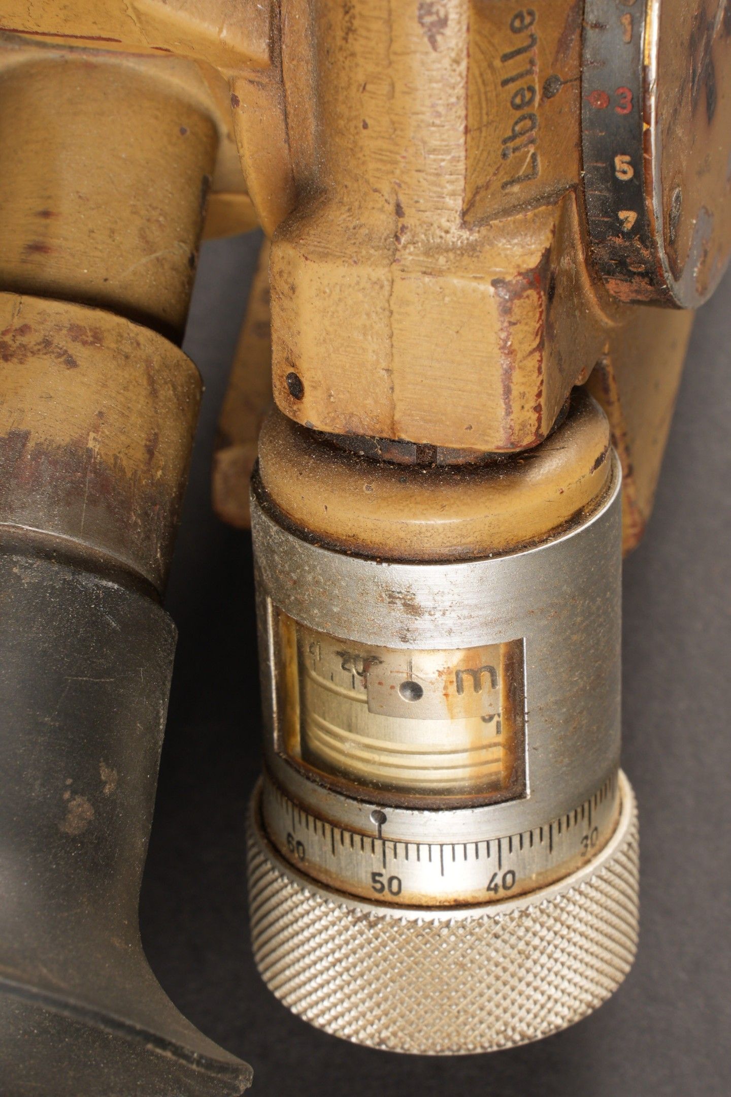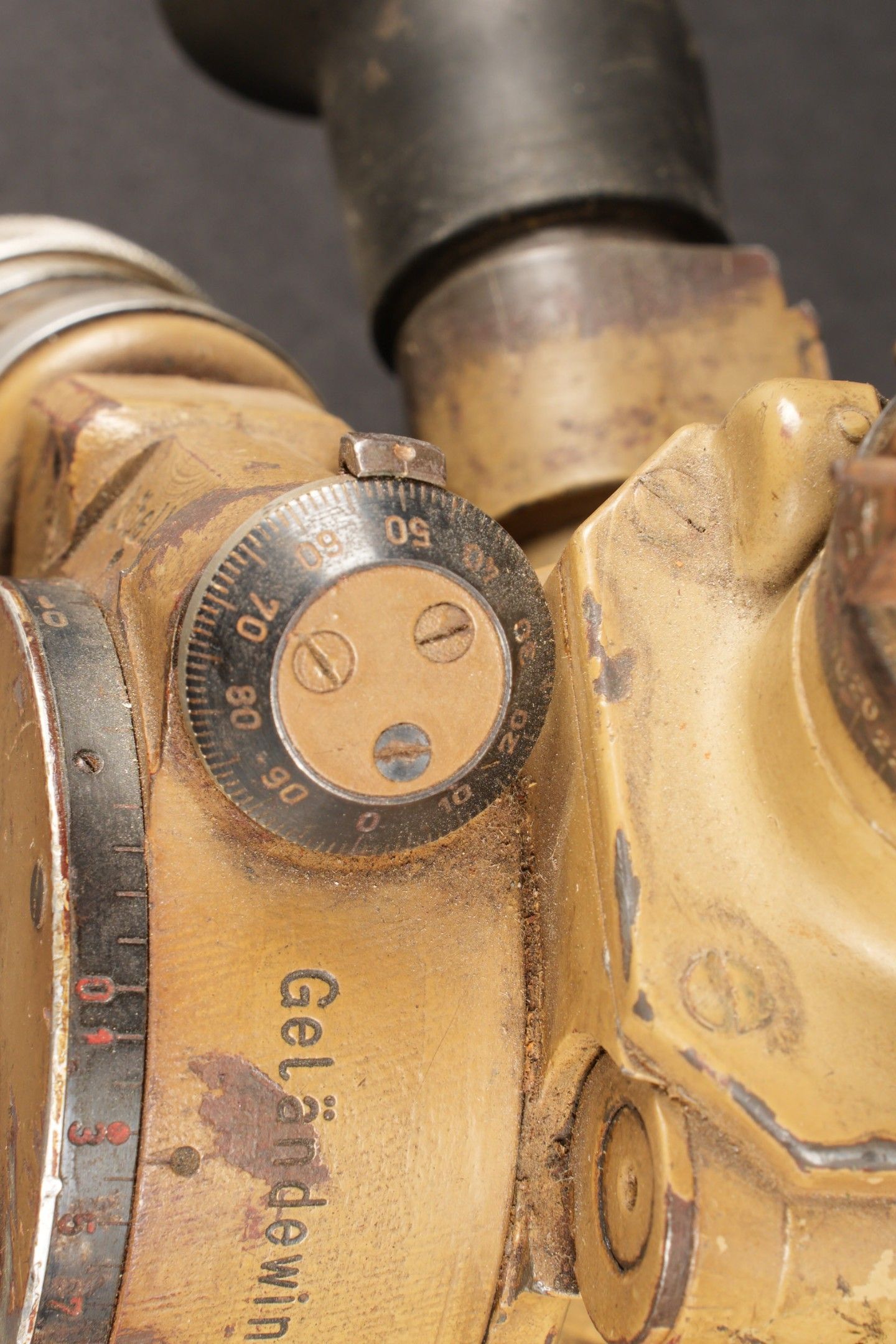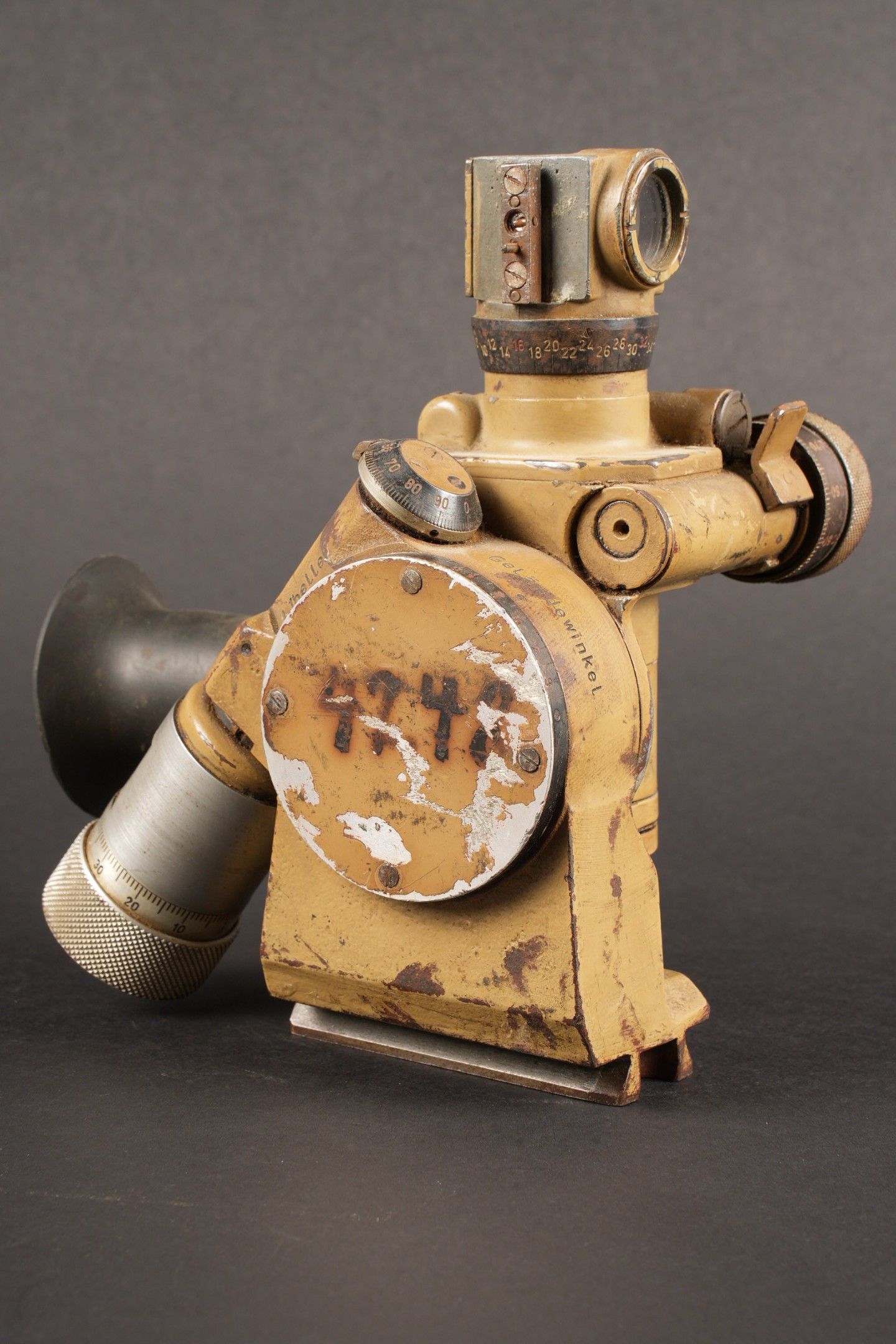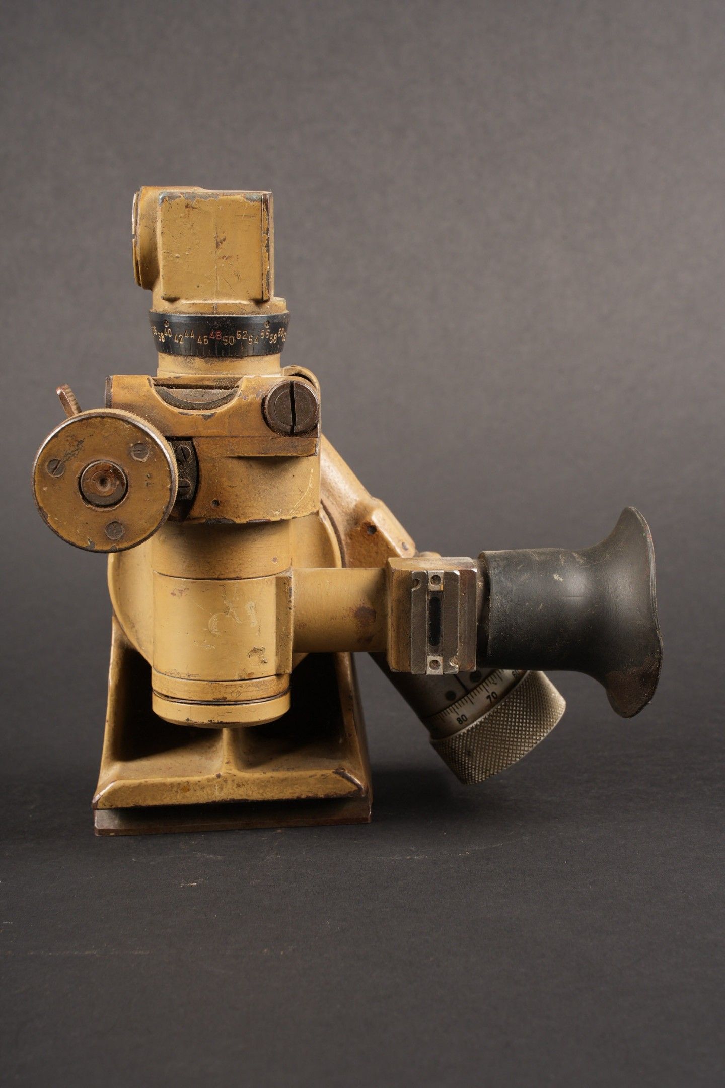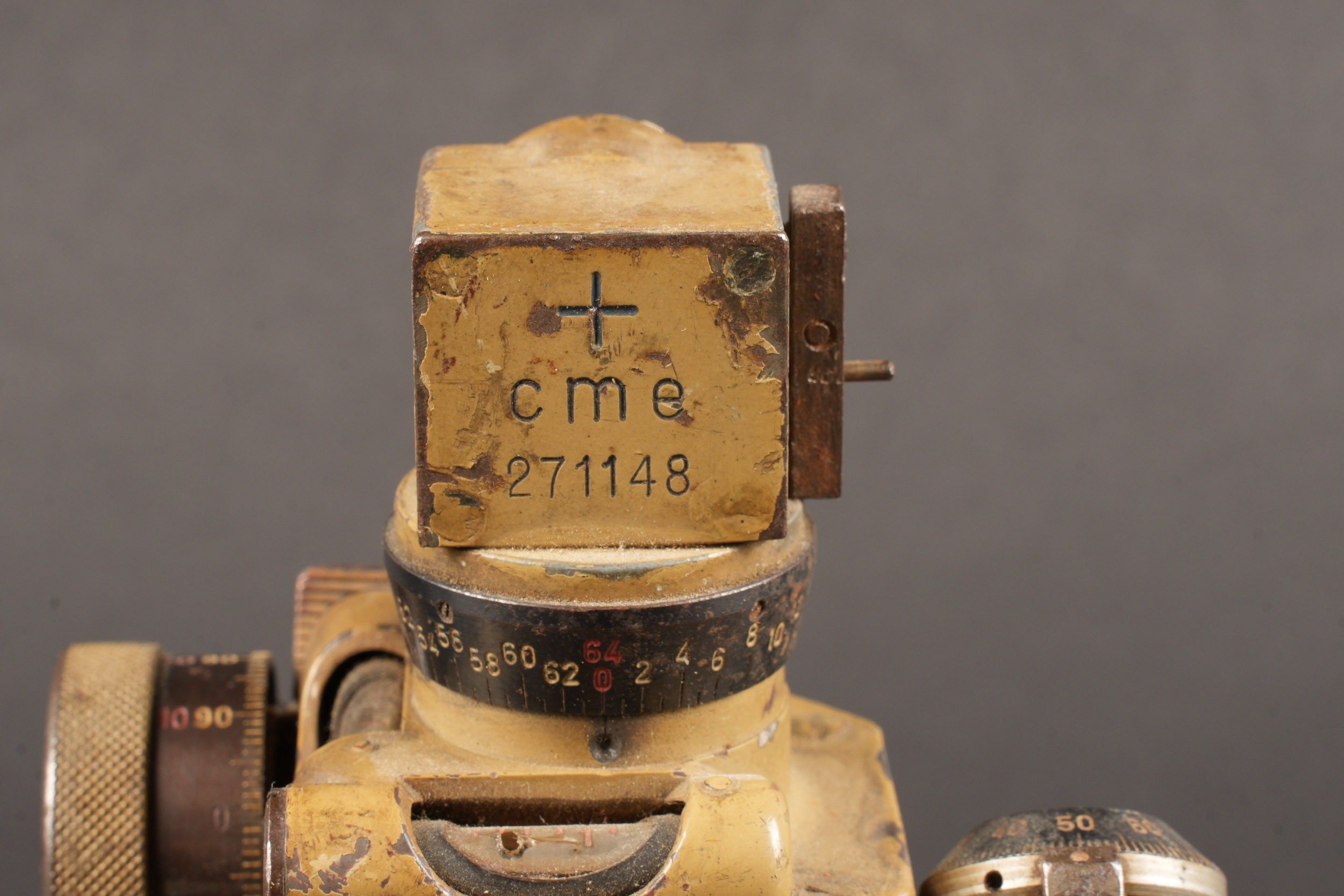 Scope for MG 3442 machine gun. Made of metal. 80% sand yellow paint. Manufacture cme 247748. Blue cross indicating cold weather use. All moving parts are functional. Paint markings on side 4748. Rubber bonnet complete. Clear graduated optics with some staining. Some wear and patina. Condition II+. MG 3442 optical sight. Metal construction, 80% tan paint remaining. Marked cme 247748. Blue cross indicates use in cold climates. All adjustments functional. Serial number 4748 painted on side. Rubber eyecup intact. Clear, graduated optics with minor specks. Shows wear and patina. Condition II+.
