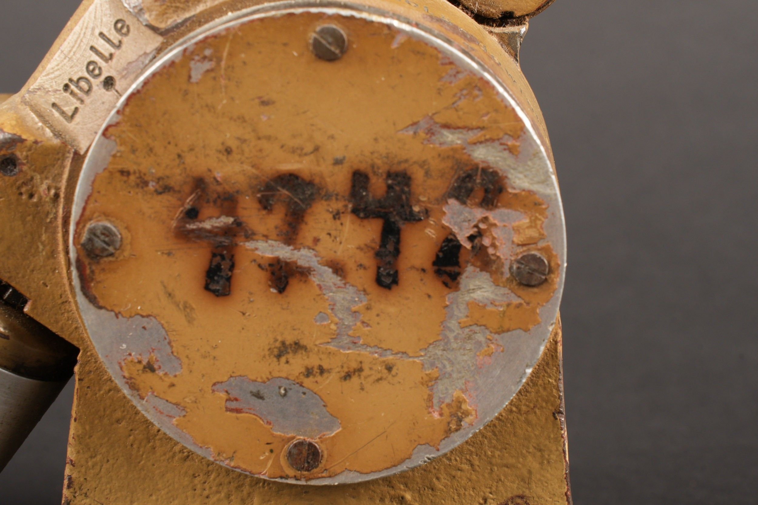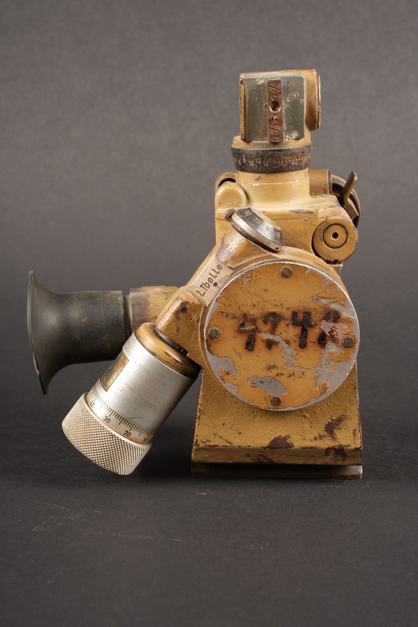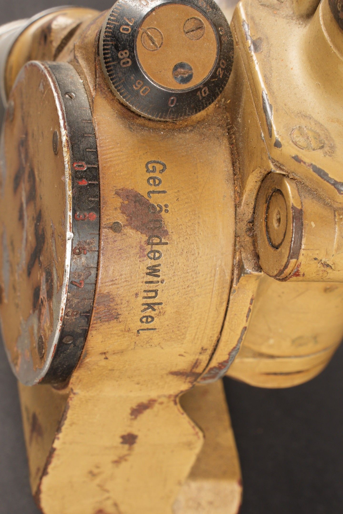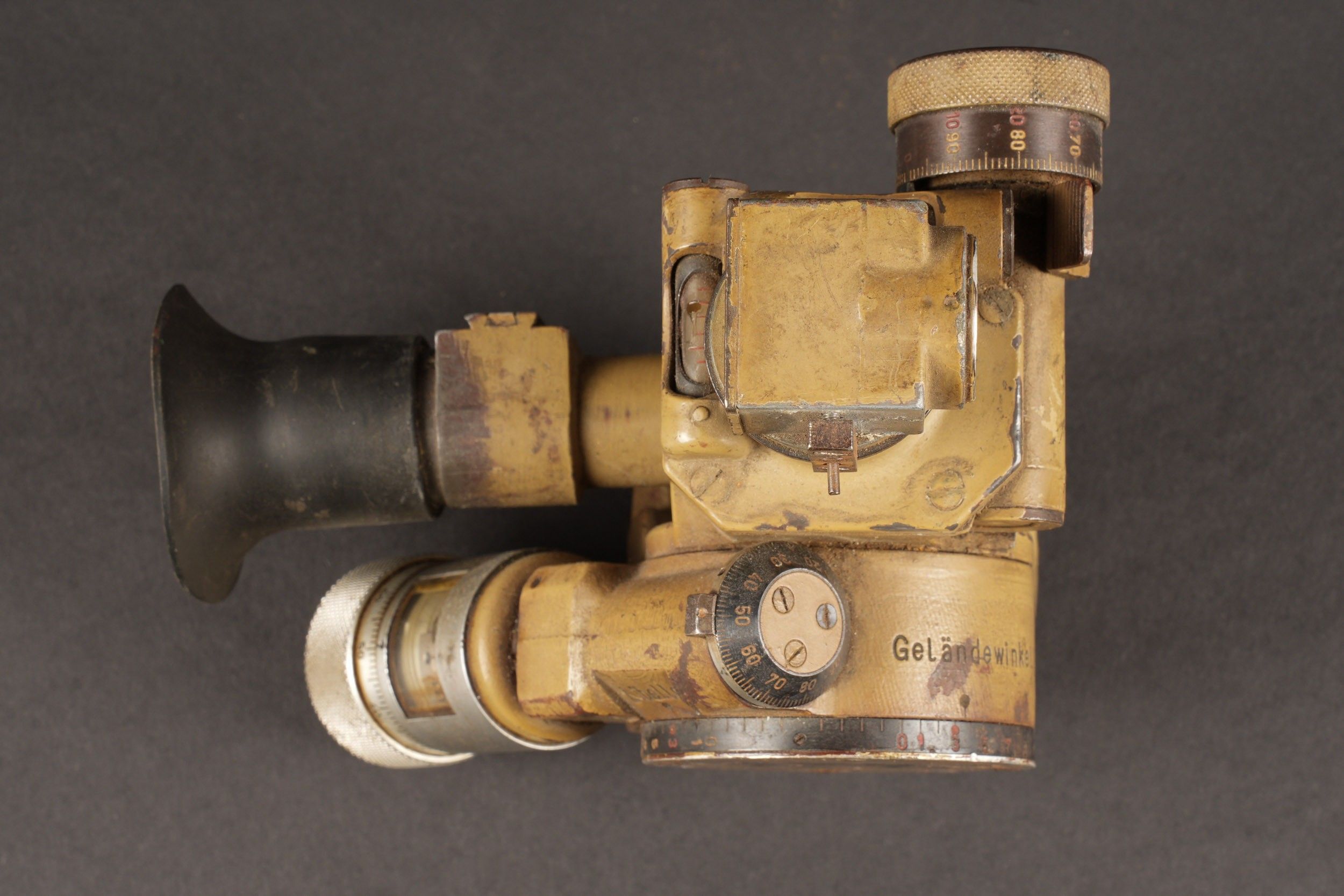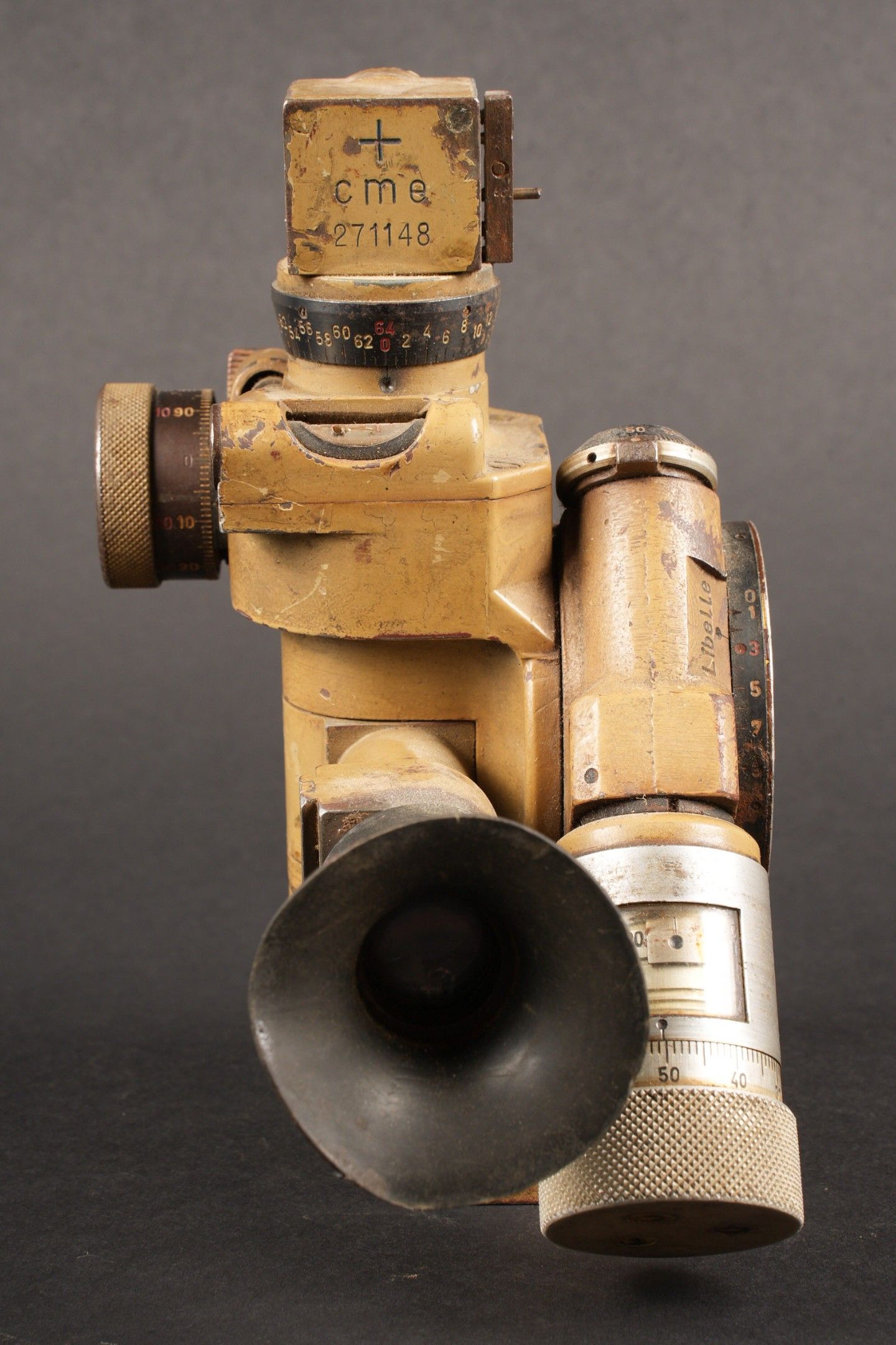 Scope for MG 3442 machine gun. Made of metal. 80% sand yellow paint. Manufacture cme 247748. Blue cross indicating cold weather use. All moving parts are functional. Paint markings on side 4748. Rubber bonnet complete. Clear graduated optics with some staining. Some wear and patina. Condition II+. MG 3442 optical sight. Metal construction, 80% tan paint remaining. Marked cme 247748. Blue cross indicates use in cold climates. All adjustments functional. Serial number 4748 painted on side. Rubber eyecup intact. Clear, graduated optics with minor specks. Shows wear and patina. Condition II+.