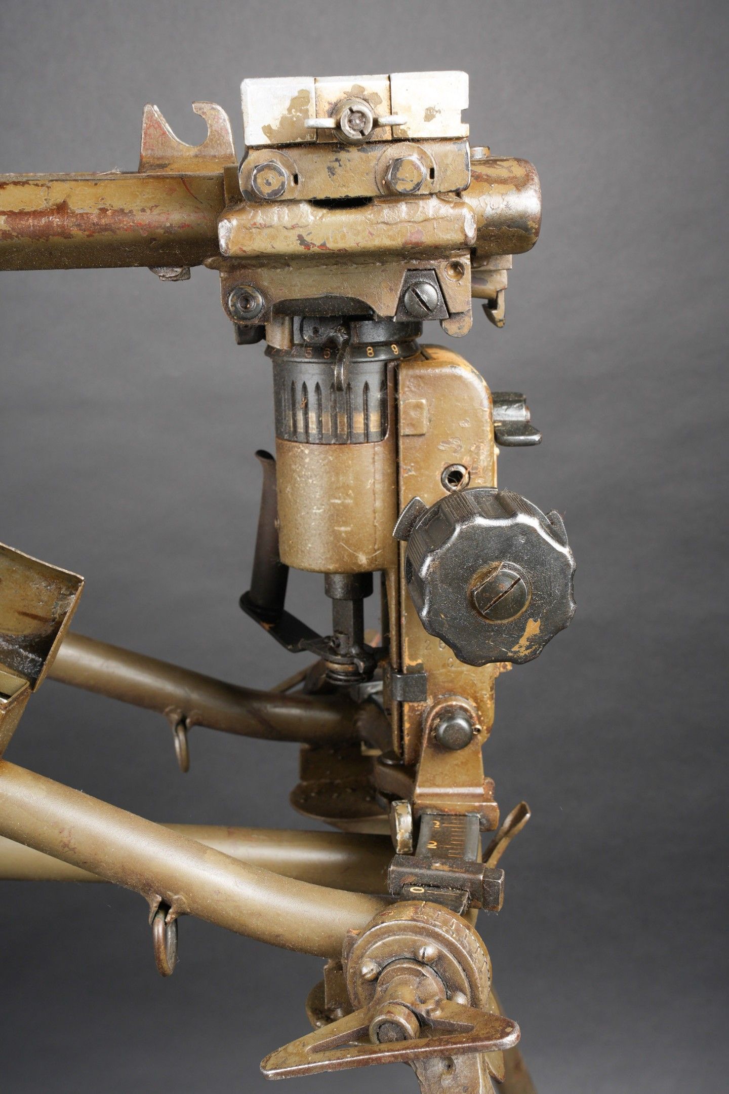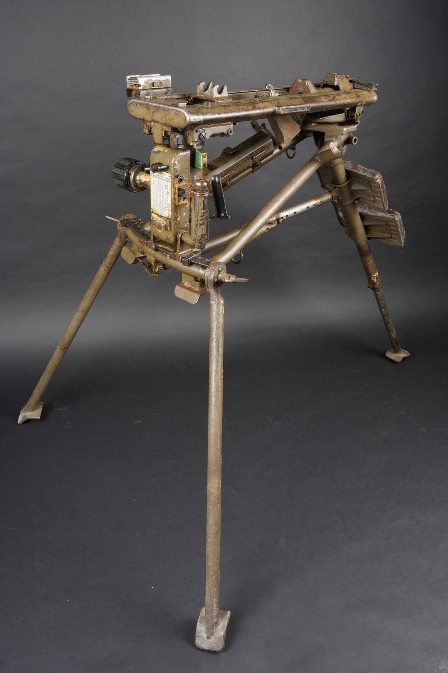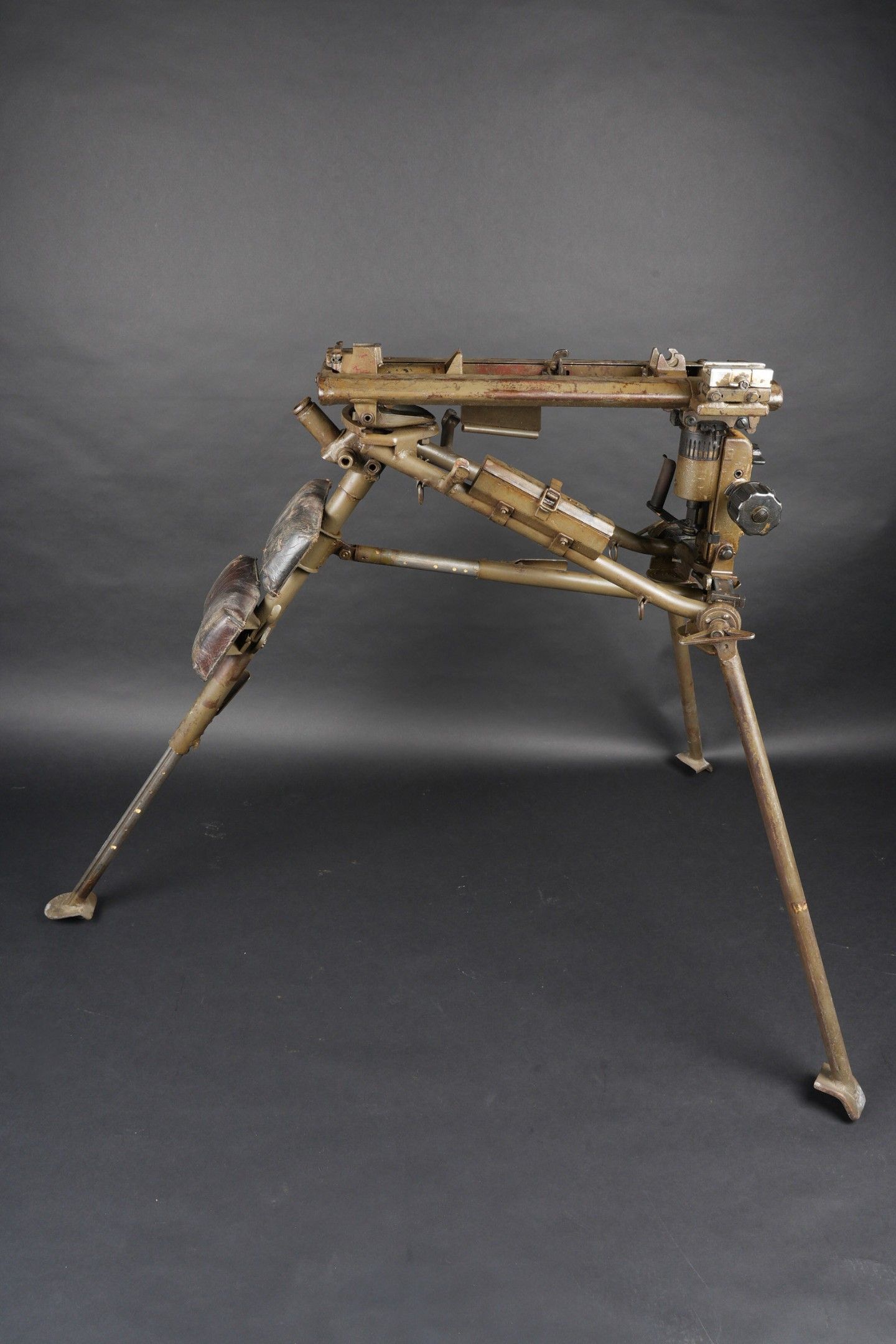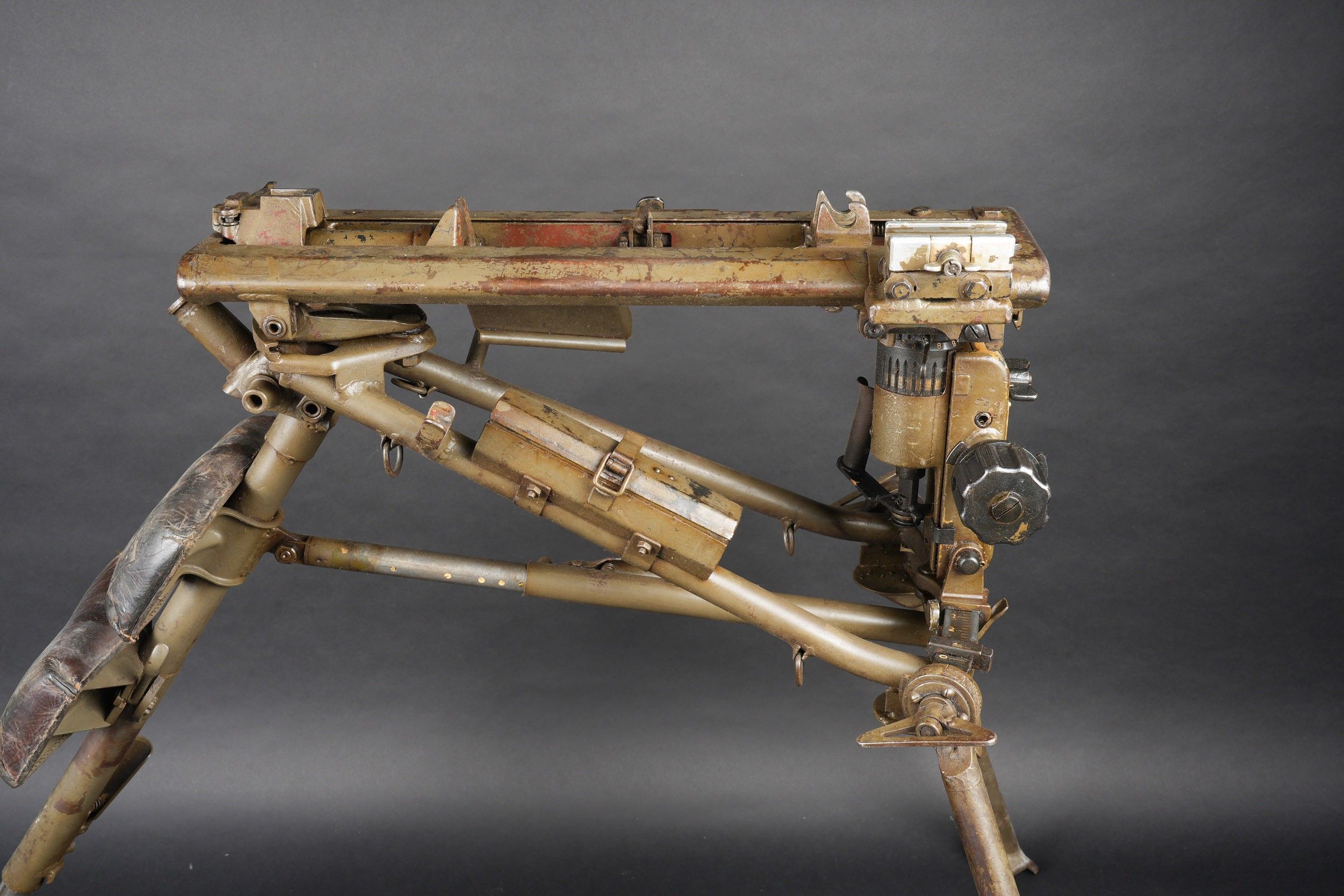 Lafette MG 3442 carriage. Adjustable tubular structure. All moving parts are functional. 70% Feldgrau paint. Manufactured by AXX 1941. Number 267C. The tool box is present on the side. Brown bakelite wheel. The automatic firing handle is functional. The leather cushions are complete. The upper part is marked FSU 1943, number 3529a Note some wear and patina. Condition II+. MG 3442 Lafette mount. Adjustable tubular frame. All moving parts functional. 70% Feldgrau paint remaining. Marked AXX 1941, number 267C. Tool box mounted on side, brown bakelite adjustment knob, working trigger handle, leather pads complete. Upper frame marked FSU 1943, number 3529a. Shows service wear and patina. Condition II+.