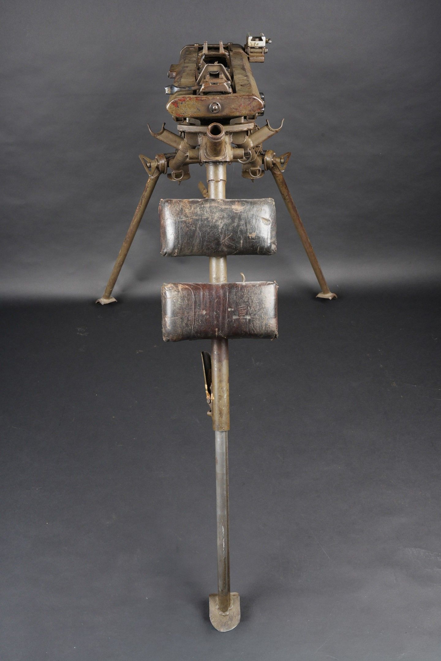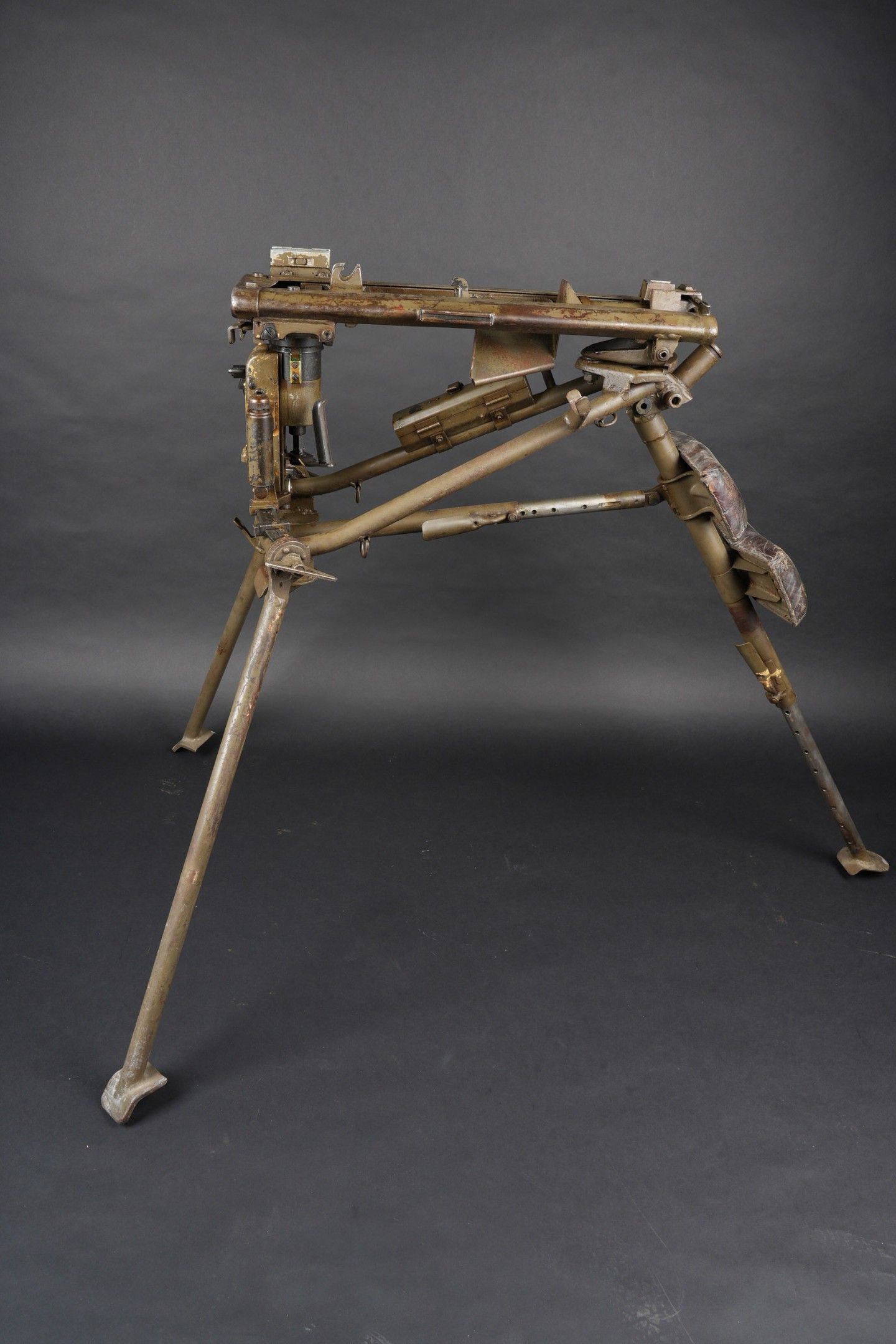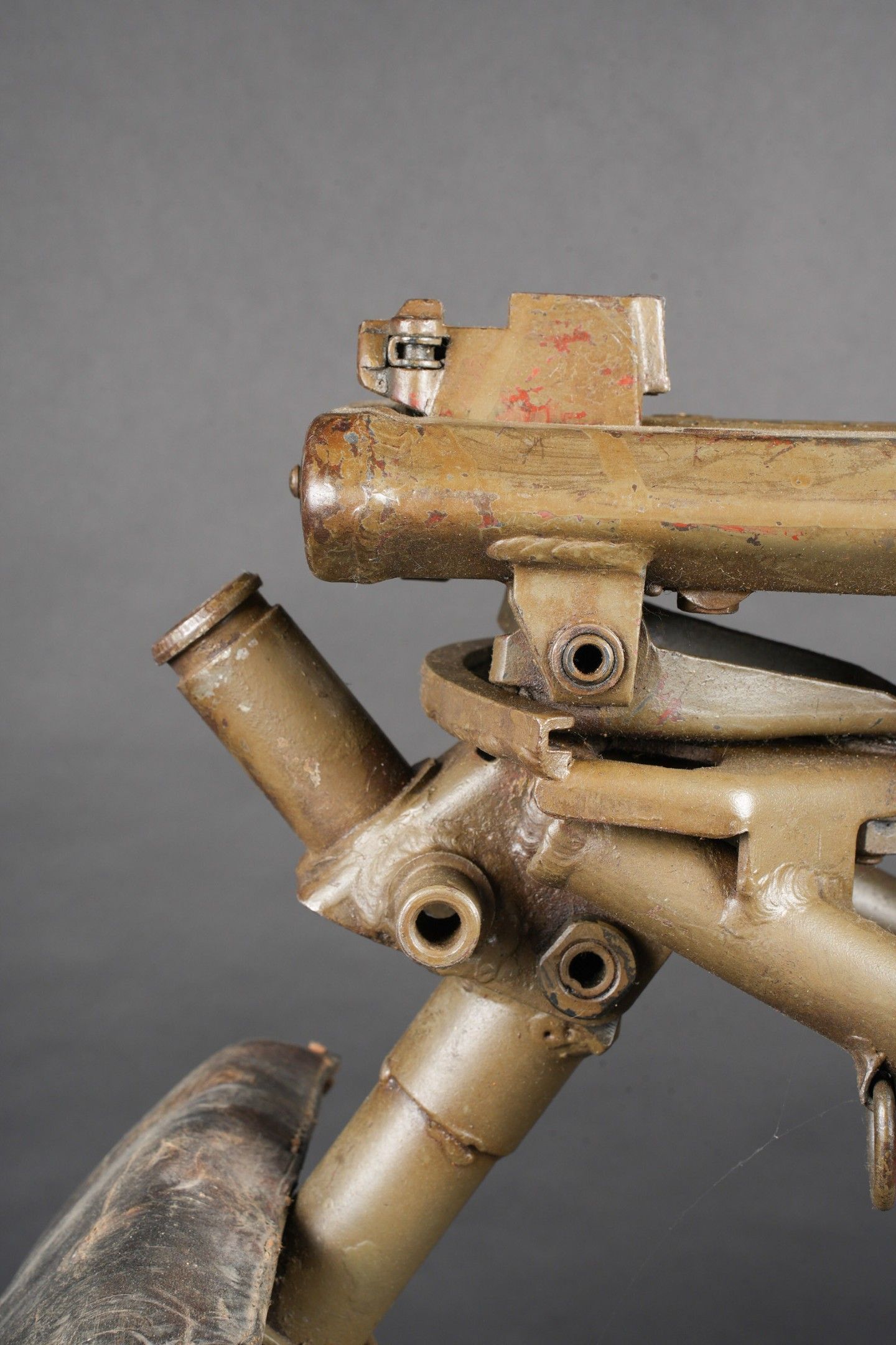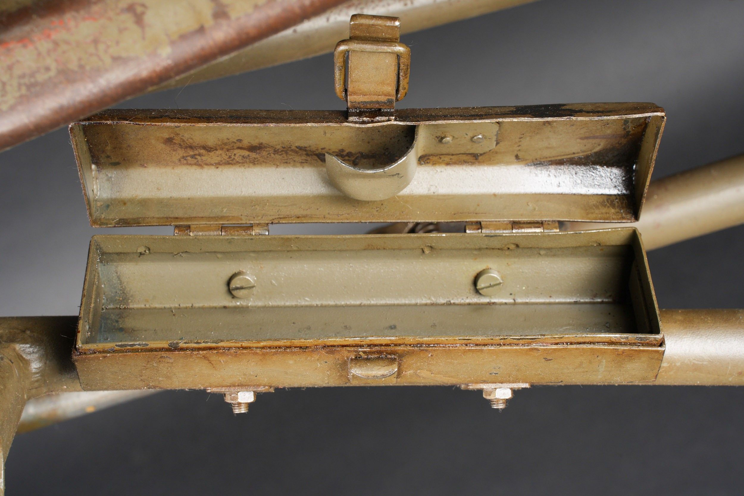 Lafette MG 3442 carriage. Adjustable tubular structure. All moving parts are functional. 70% Feldgrau paint. Manufactured by AXX 1941. Number 267C. The tool box is present on the side. Brown bakelite wheel. The automatic firing handle is functional. The leather cushions are complete. The upper part is marked FSU 1943, number 3529a Note some wear and patina. Condition II+. MG 3442 Lafette mount. Adjustable tubular frame. All moving parts functional. 70% Feldgrau paint remaining. Marked AXX 1941, number 267C. Tool box mounted on side, brown bakelite adjustment knob, working trigger handle, leather pads complete. Upper frame marked FSU 1943, number 3529a. Shows service wear and patina. Condition II+.