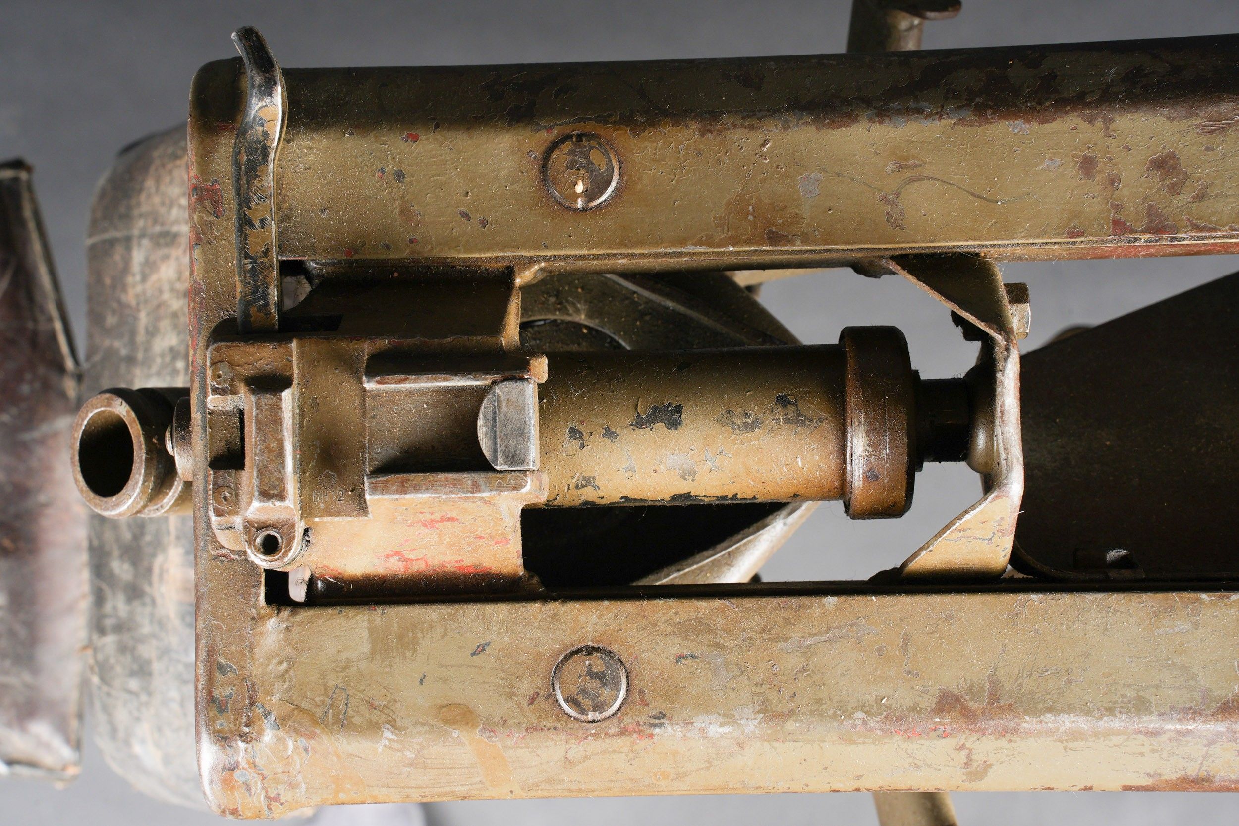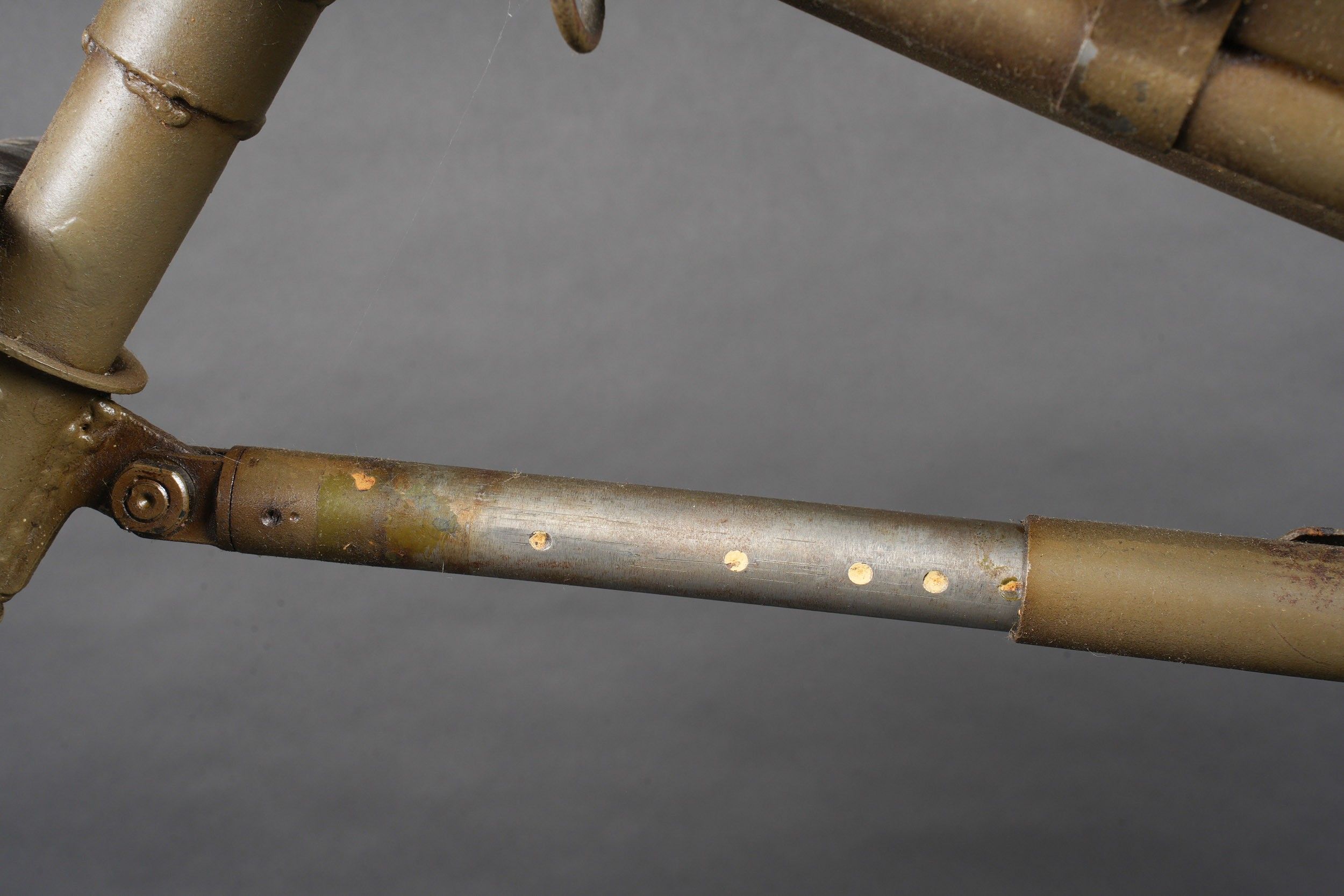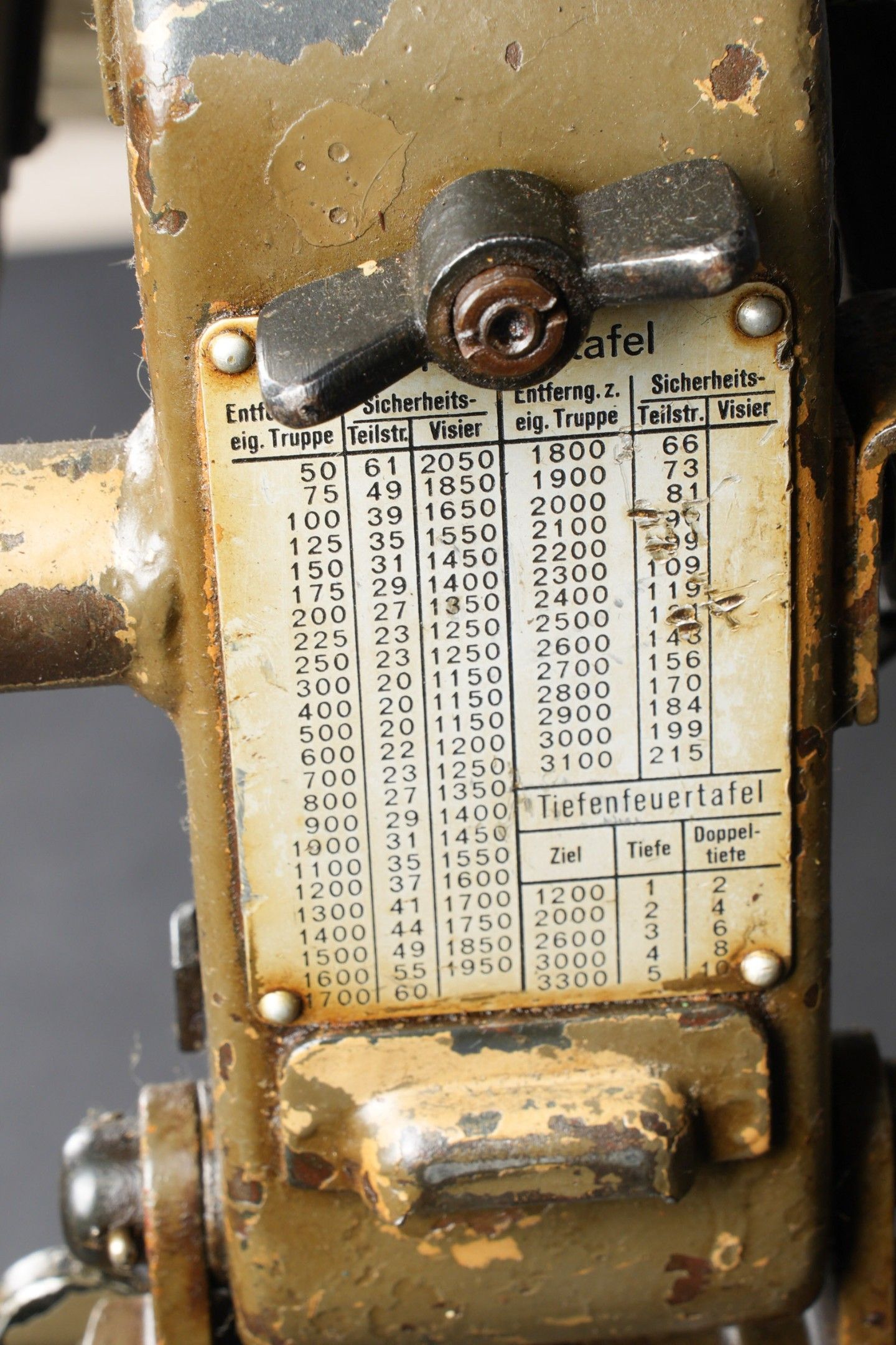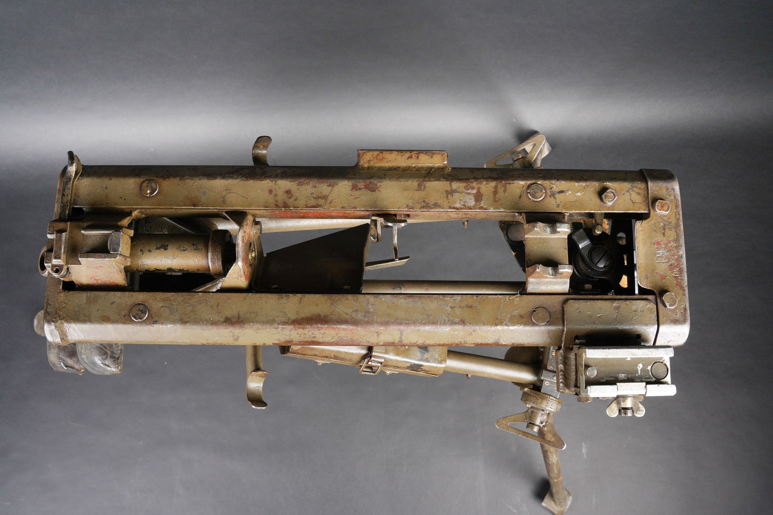 Lafette MG 3442 carriage. Adjustable tubular structure. All moving parts are functional. 70% Feldgrau paint. Manufactured by AXX 1941. Number 267C. The tool box is present on the side. Brown bakelite wheel. The automatic firing handle is functional. The leather cushions are complete. The upper part is marked FSU 1943, number 3529a Note some wear and patina. Condition II+. MG 3442 Lafette mount. Adjustable tubular frame. All moving parts functional. 70% Feldgrau paint remaining. Marked AXX 1941, number 267C. Tool box mounted on side, brown bakelite adjustment knob, working trigger handle, leather pads complete. Upper frame marked FSU 1943, number 3529a. Shows service wear and patina. Condition II+.