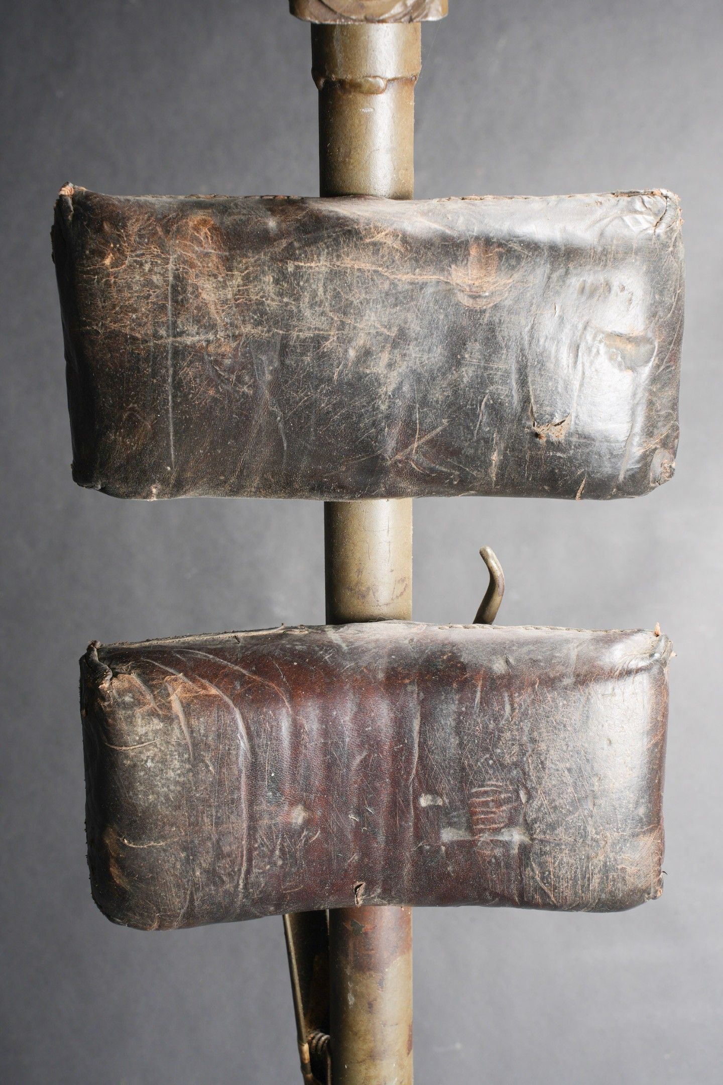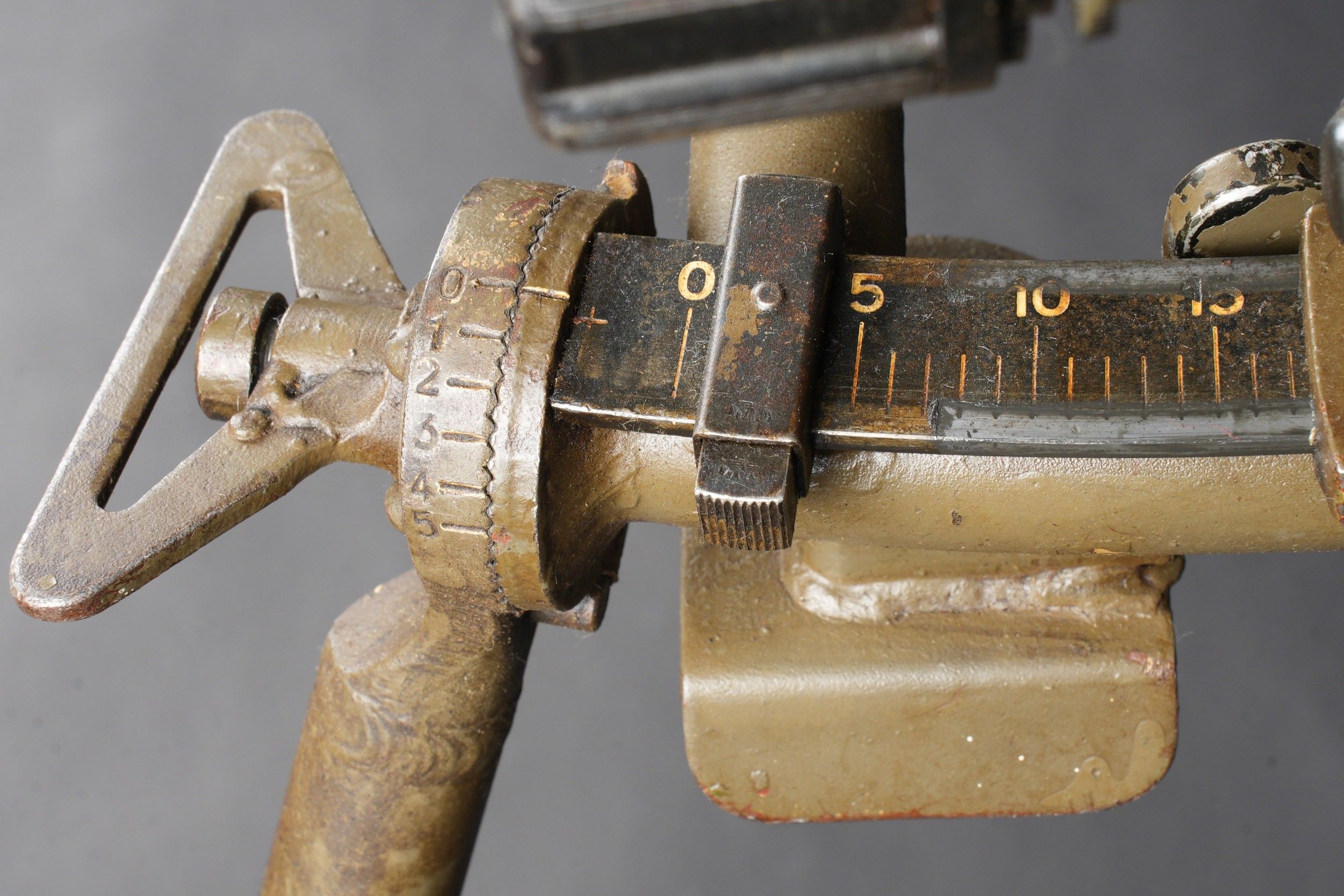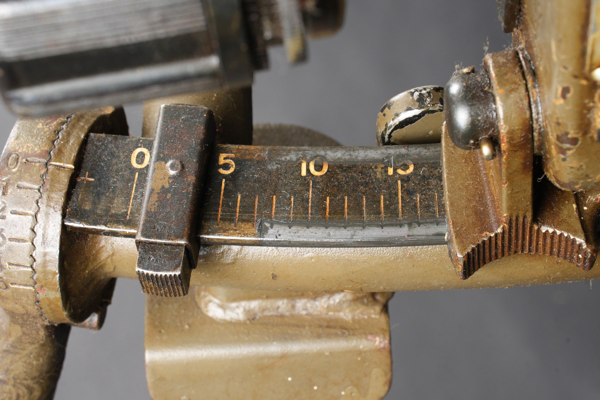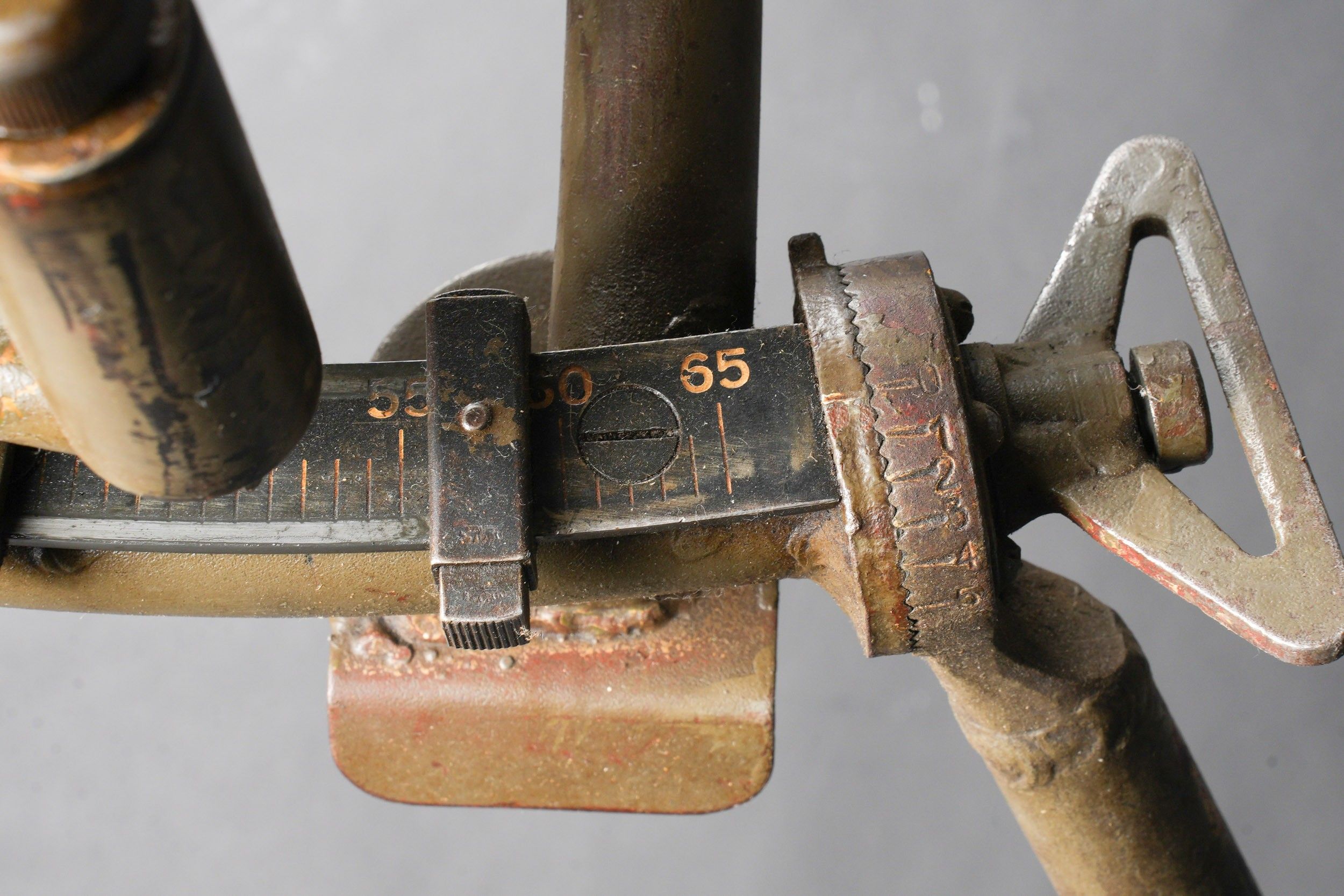 Lafette MG 3442 carriage. Adjustable tubular structure. All moving parts are functional. 70% Feldgrau paint. Manufactured by AXX 1941. Number 267C. The tool box is present on the side. Brown bakelite wheel. The automatic firing handle is functional. The leather cushions are complete. The upper part is marked FSU 1943, number 3529a Note some wear and patina. Condition II+. MG 3442 Lafette mount. Adjustable tubular frame. All moving parts functional. 70% Feldgrau paint remaining. Marked AXX 1941, number 267C. Tool box mounted on side, brown bakelite adjustment knob, working trigger handle, leather pads complete. Upper frame marked FSU 1943, number 3529a. Shows service wear and patina. Condition II+.