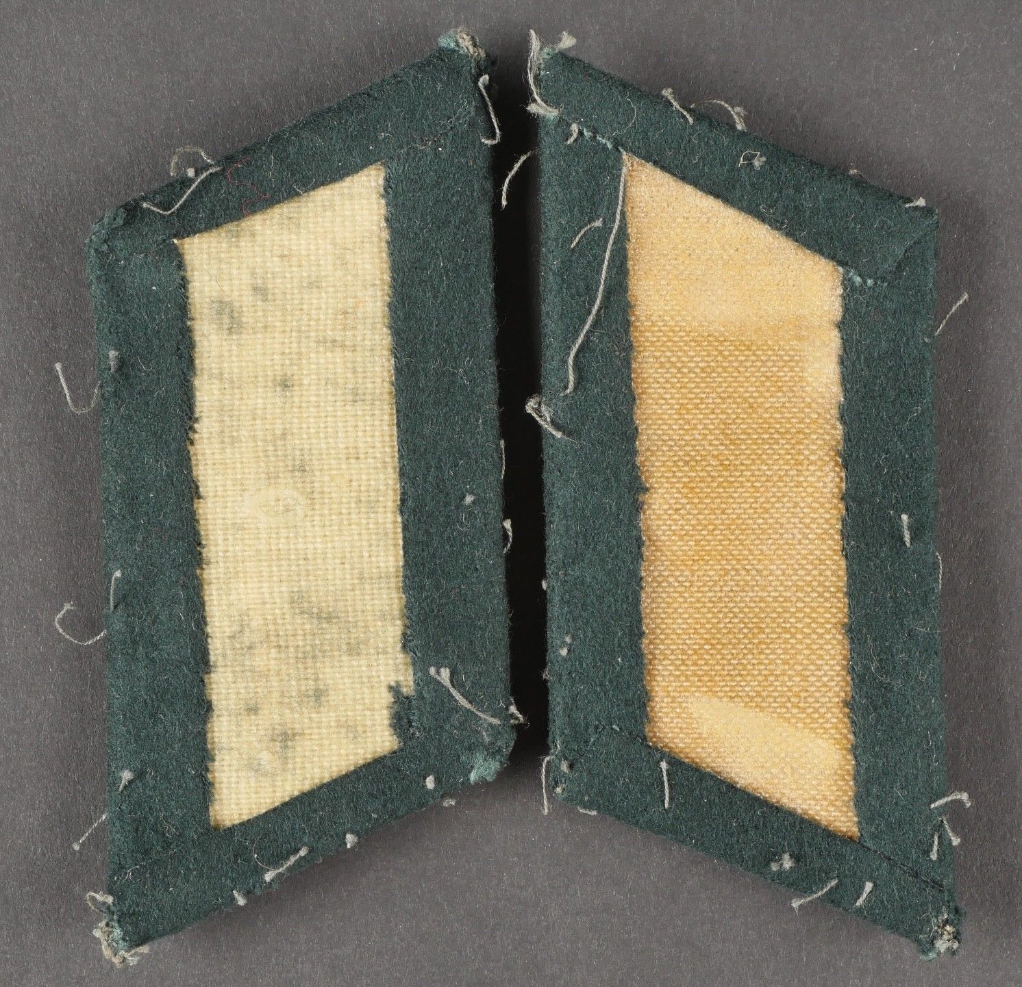 Pioneer pair of officer's collar tabs. Uniform pair, complete. The silver piping is partially oxidised. Detached from a jacket. Some wear and patina. Condition II+. Pair of Pioneer officer collar tabs Matching pair, complete. Silver wire braid partially oxidised. Removed from a tunic. Shows some wear and patina. Condition II+.
