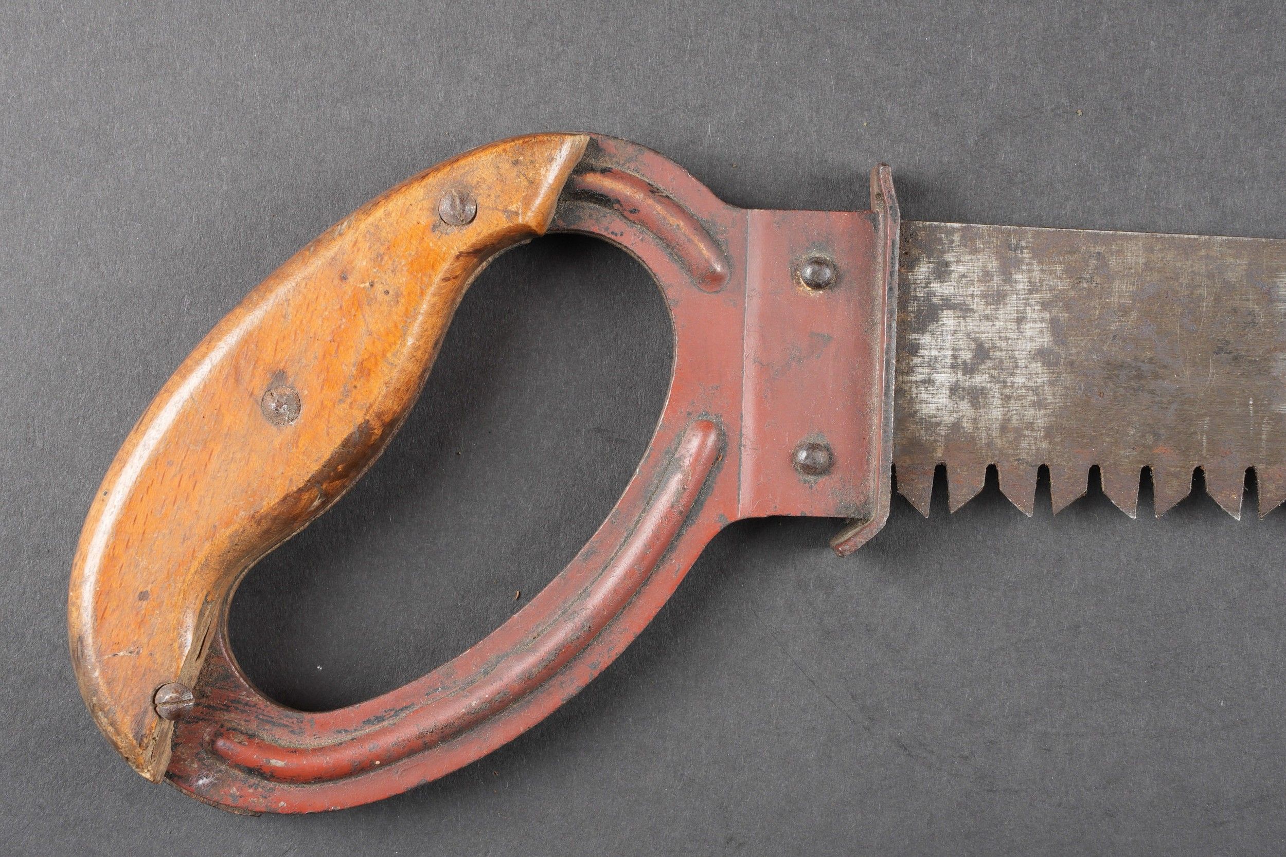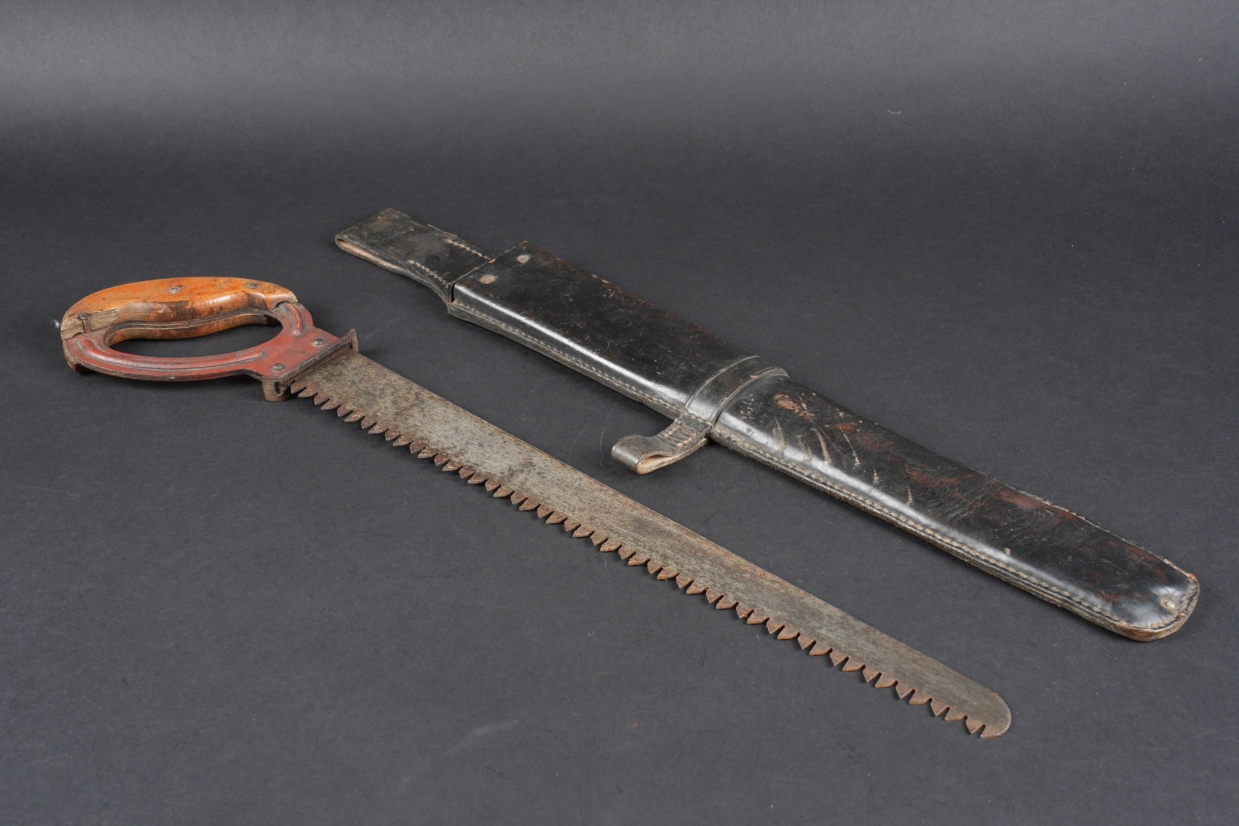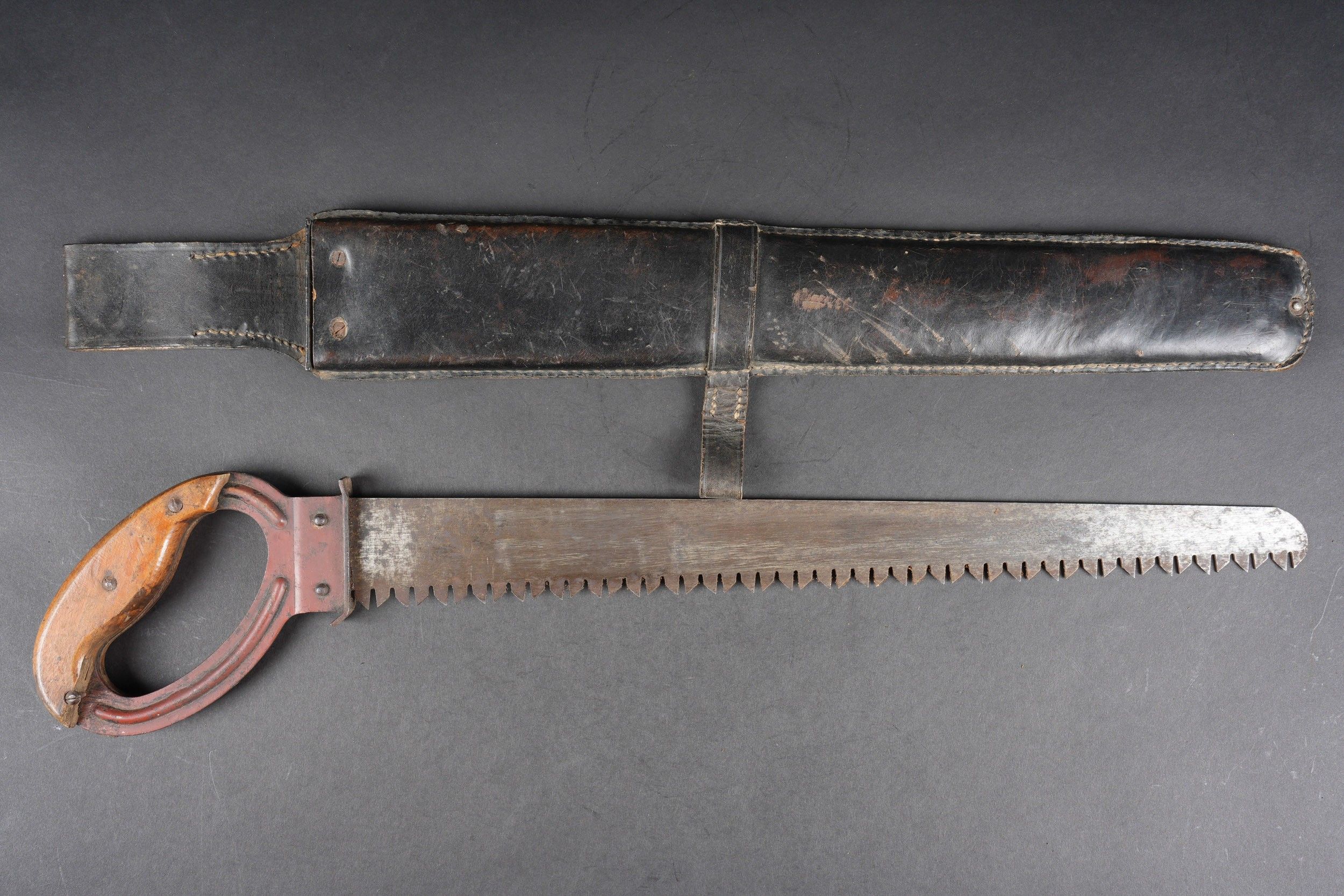 German pioneer saw. Wooden handle with some damage. Red metal parts, probably original rustproof paint. Blade complete but oxidised. Markings E Winterhoep. Date illegible. Metal case, covered with thick black leather. All fasteners present. Markings LH 1942. Some wear and patina. Condition II+. German pioneer saw Wooden handle with minor losses. Metal parts painted red, likely original anti-rust coating. Blade complete but oxidised. Marked E Winterhoep. Date illegible. Metal scabbard covered in thick black leather, all fastenings present. Marked LH 1942. Shows some wear and patina. Condition II+.