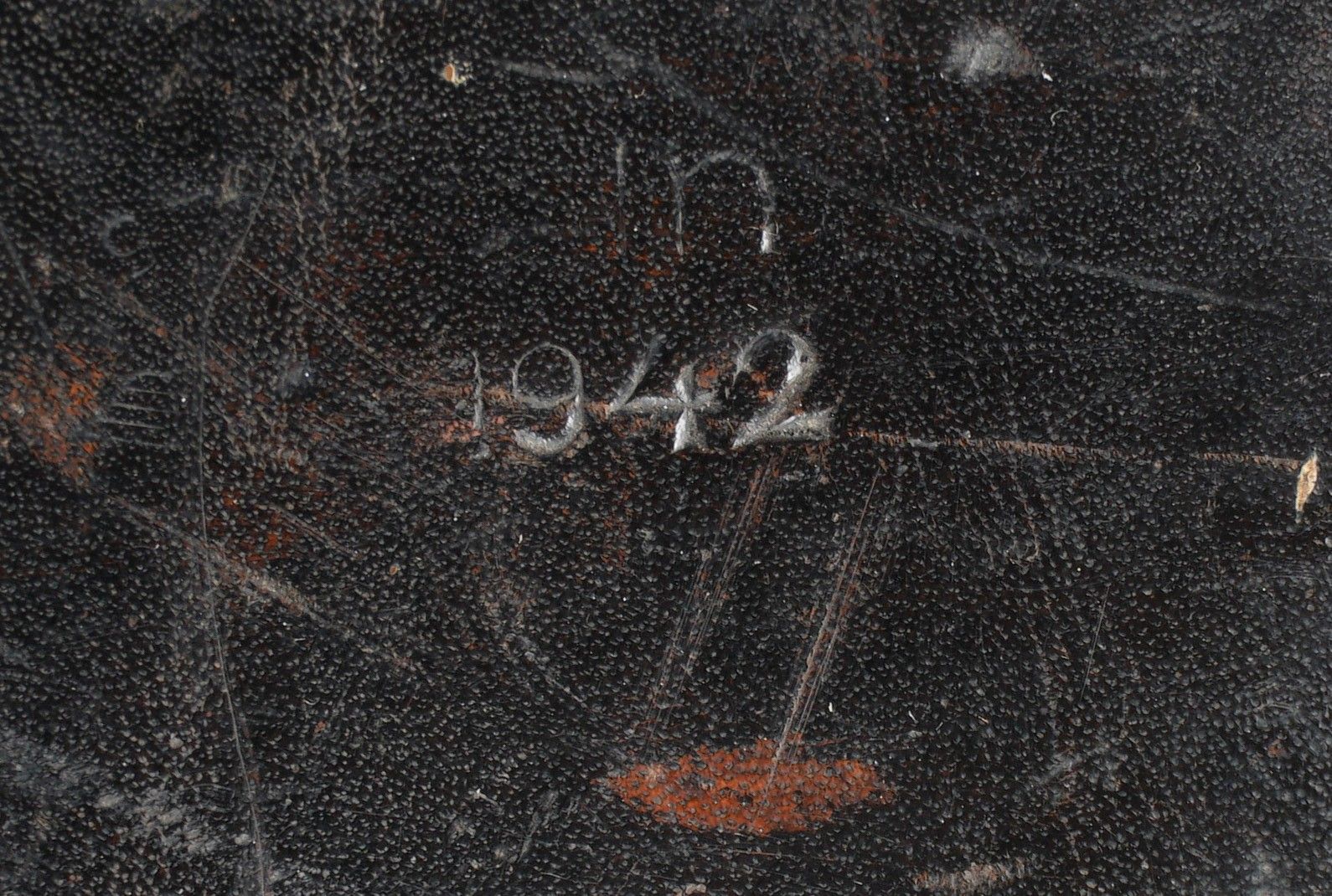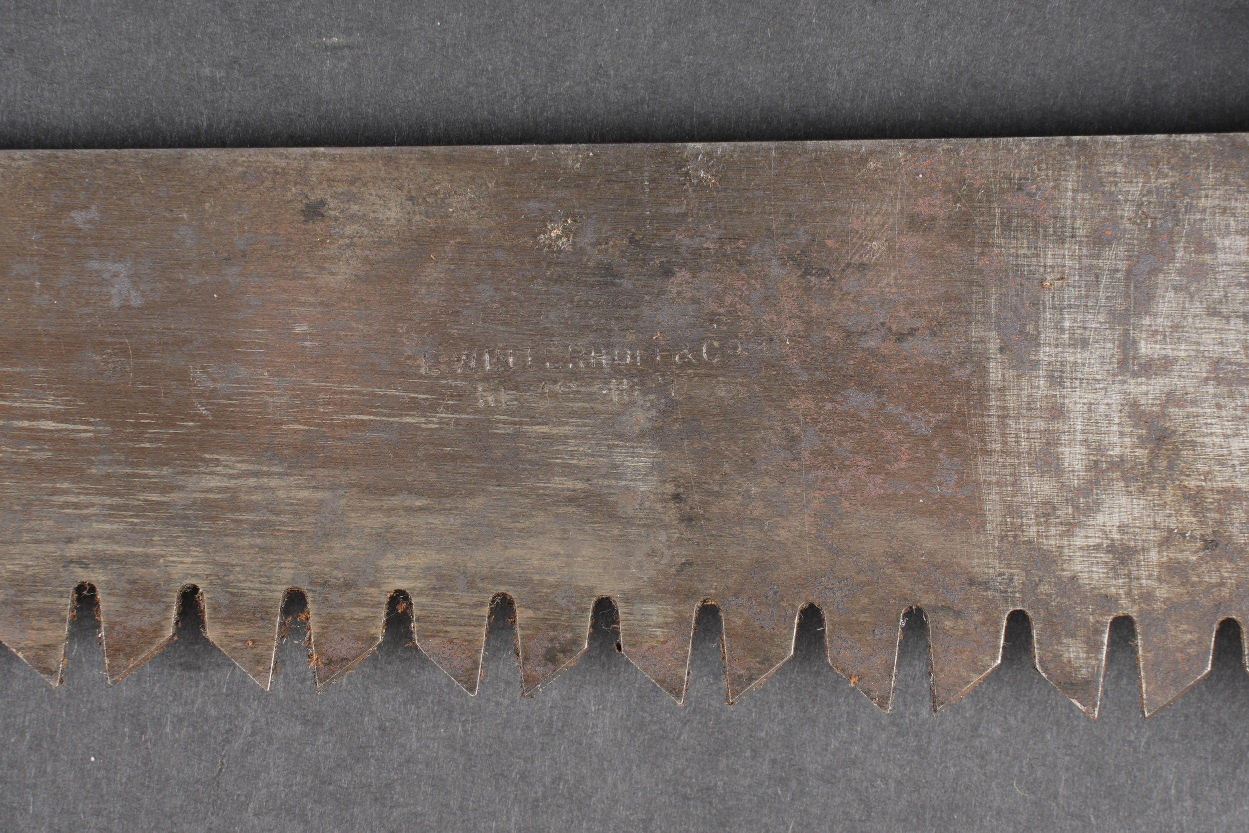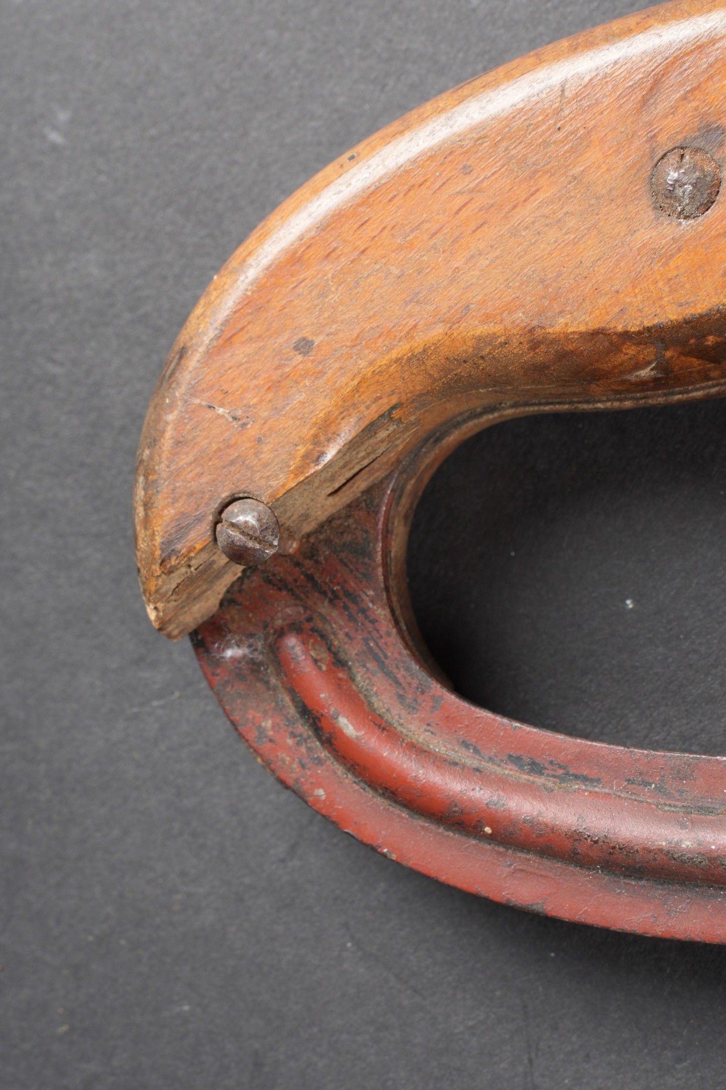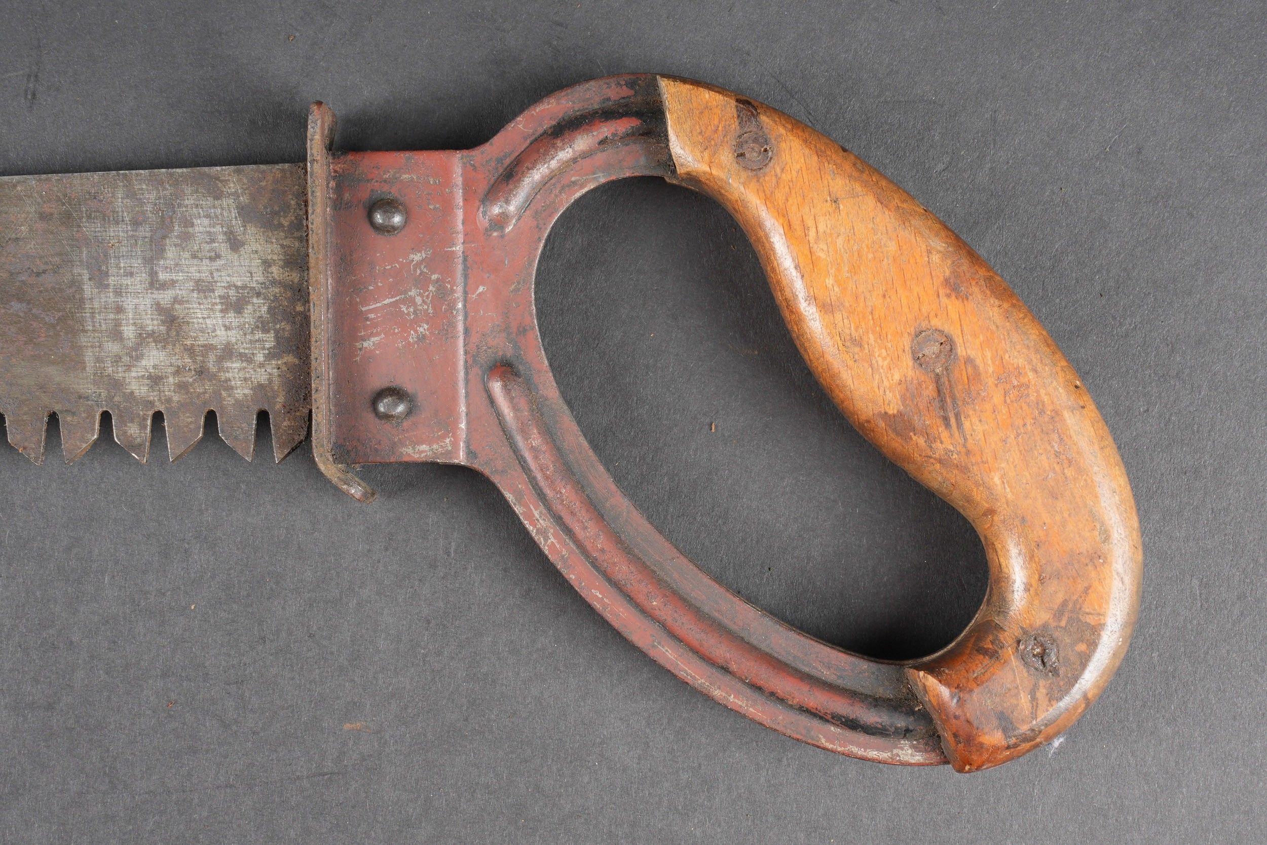 German pioneer saw. Wooden handle with some damage. Red metal parts, probably original rustproof paint. Blade complete but oxidised. Markings E Winterhoep. Date illegible. Metal case, covered with thick black leather. All fasteners present. Markings LH 1942. Some wear and patina. Condition II+. German pioneer saw Wooden handle with minor losses. Metal parts painted red, likely original anti-rust coating. Blade complete but oxidised. Marked E Winterhoep. Date illegible. Metal scabbard covered in thick black leather, all fastenings present. Marked LH 1942. Shows some wear and patina. Condition II+.