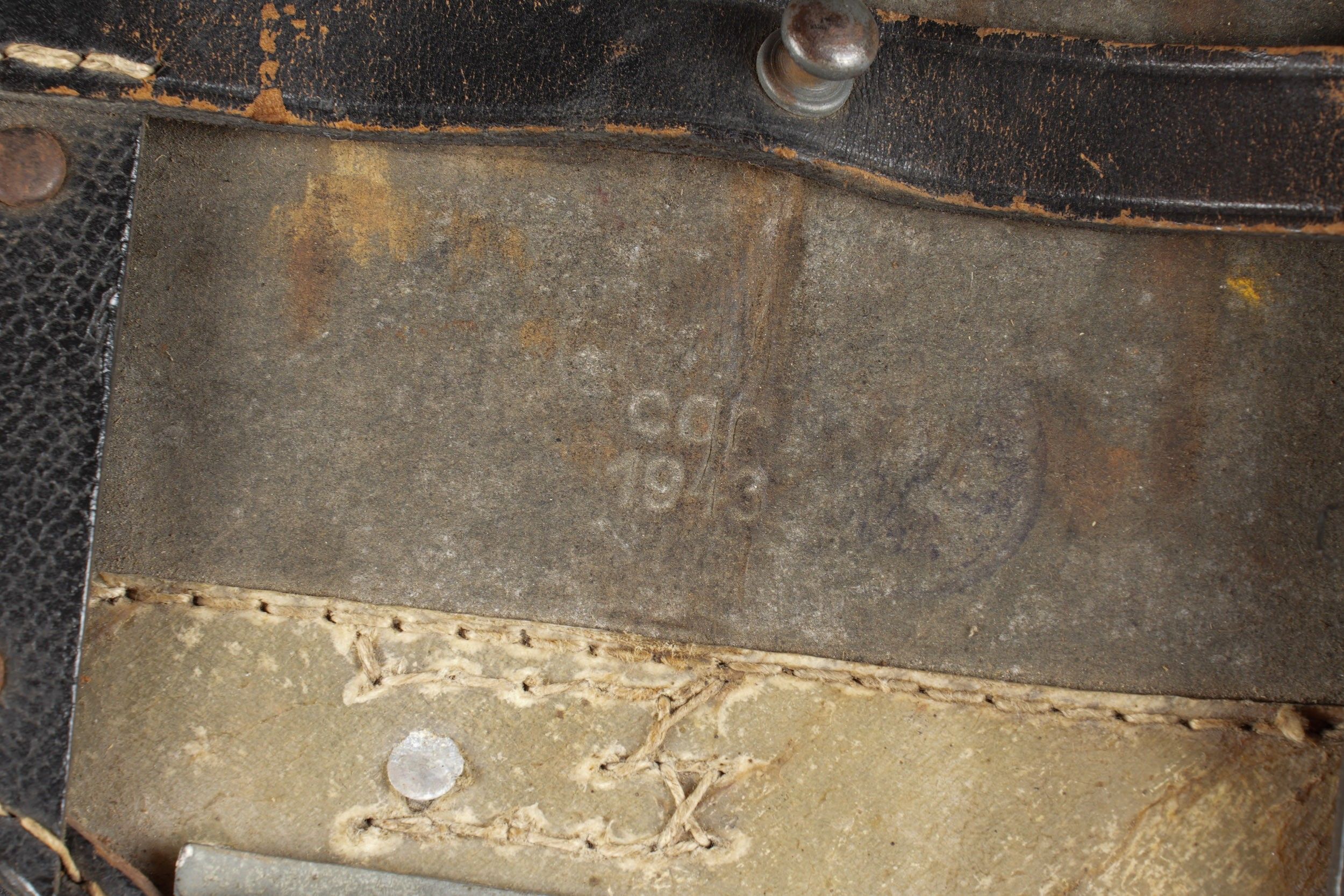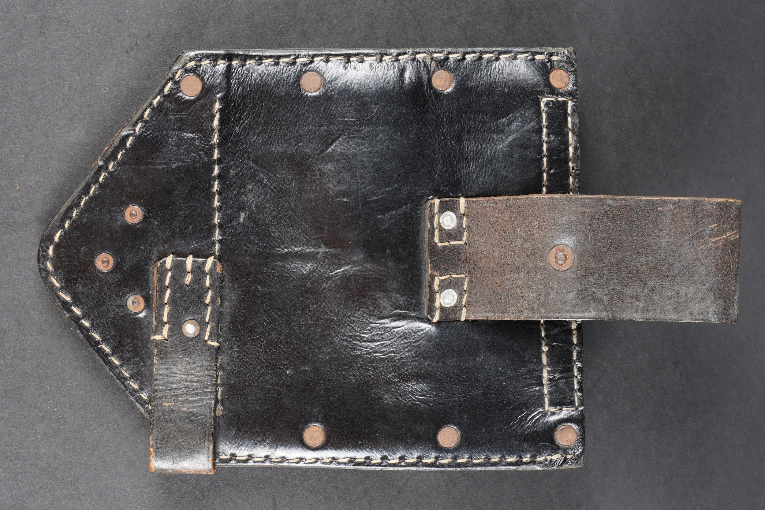 German shovel carrier. Model for folding shovel. Black leather, with metal reinforcements. All straps are present and complete. Made by CQR 1943. Some wear and patina. Condition II+. German shovel carrier Model for folding shovel. Black leather with metal reinforcements. All straps present and complete. Maker marked CQR 1943. Shows some wear and patina. Condition II+.