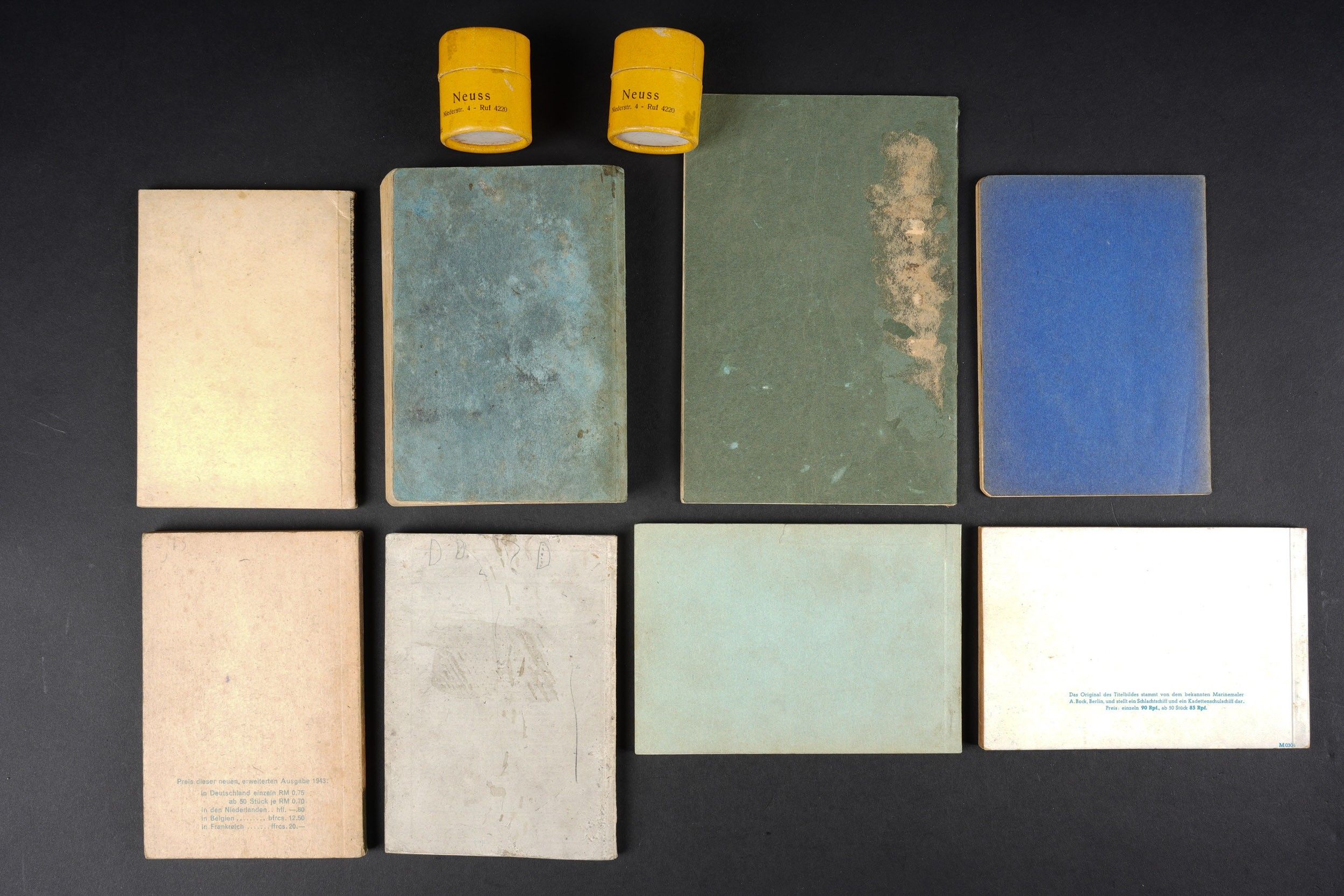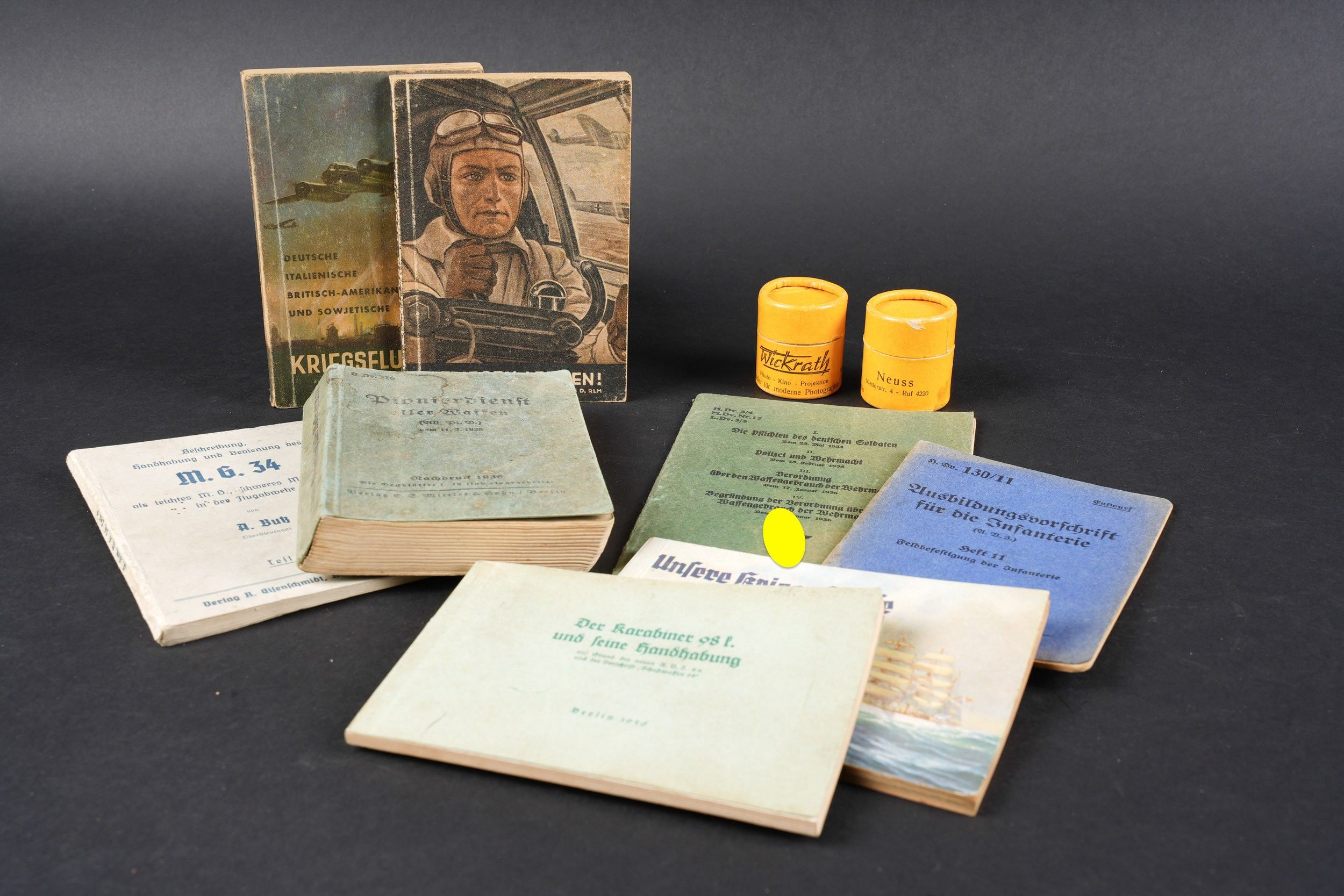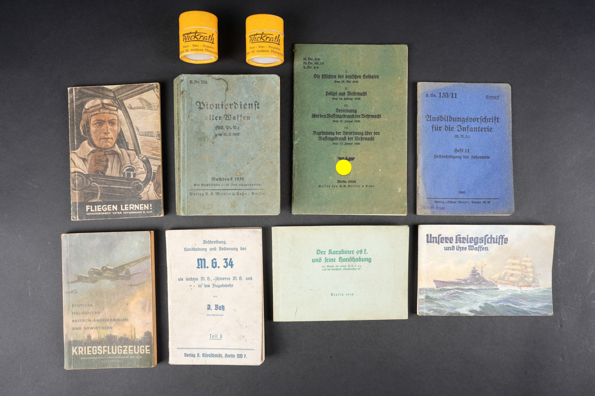 German instruction booklets. Comprising a booklet entitled Pionierdienst aller waffen, dated 1936. A booklet entitled Unsere Kriegschiffe. A booklet entitled Ausbildungsvorschrift für die Infanterie, dated 1940. A booklet entitled MG 34, teil 2, dated 1939. A booklet entitled Der Karabiner 98K, dated 1936. A booklet entitled Polizei und Wehrmacht, dated 1936. A booklet entitled Kriegsflugzeuge, dated 1943. A Fliegen Lernen booklet. Some wear and patina to be noted. Condition II+. German instruction booklets Including Pionierdienst aller Waffen 1936, Unsere Kriegschiffe, Ausbildungsvorschrift für die Infanterie 1940, MG 34 Teil 2 1939, Der Karabiner 98K 1936, Polizei und Wehrmacht 1936, Kriegsflugzeuge 1943, and Fliegen Lernen. Shows some wear and patina. Condition II+.