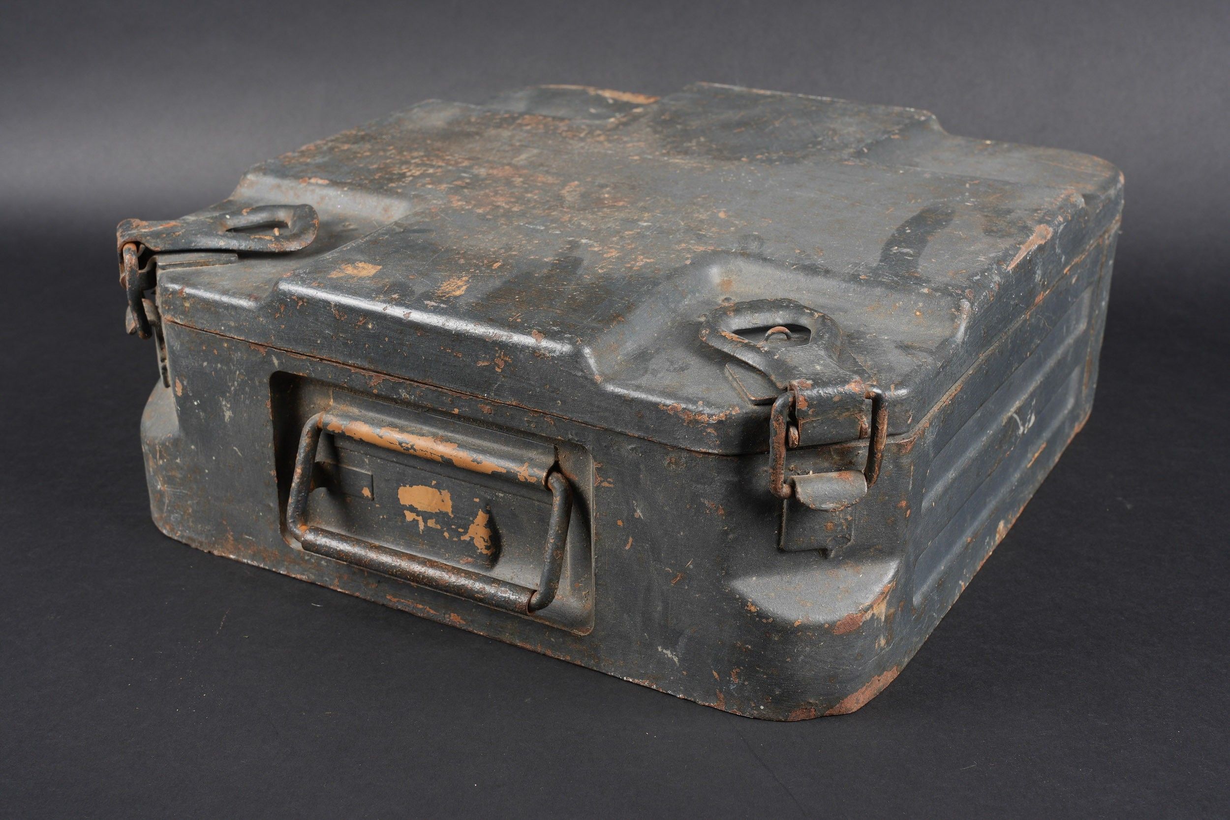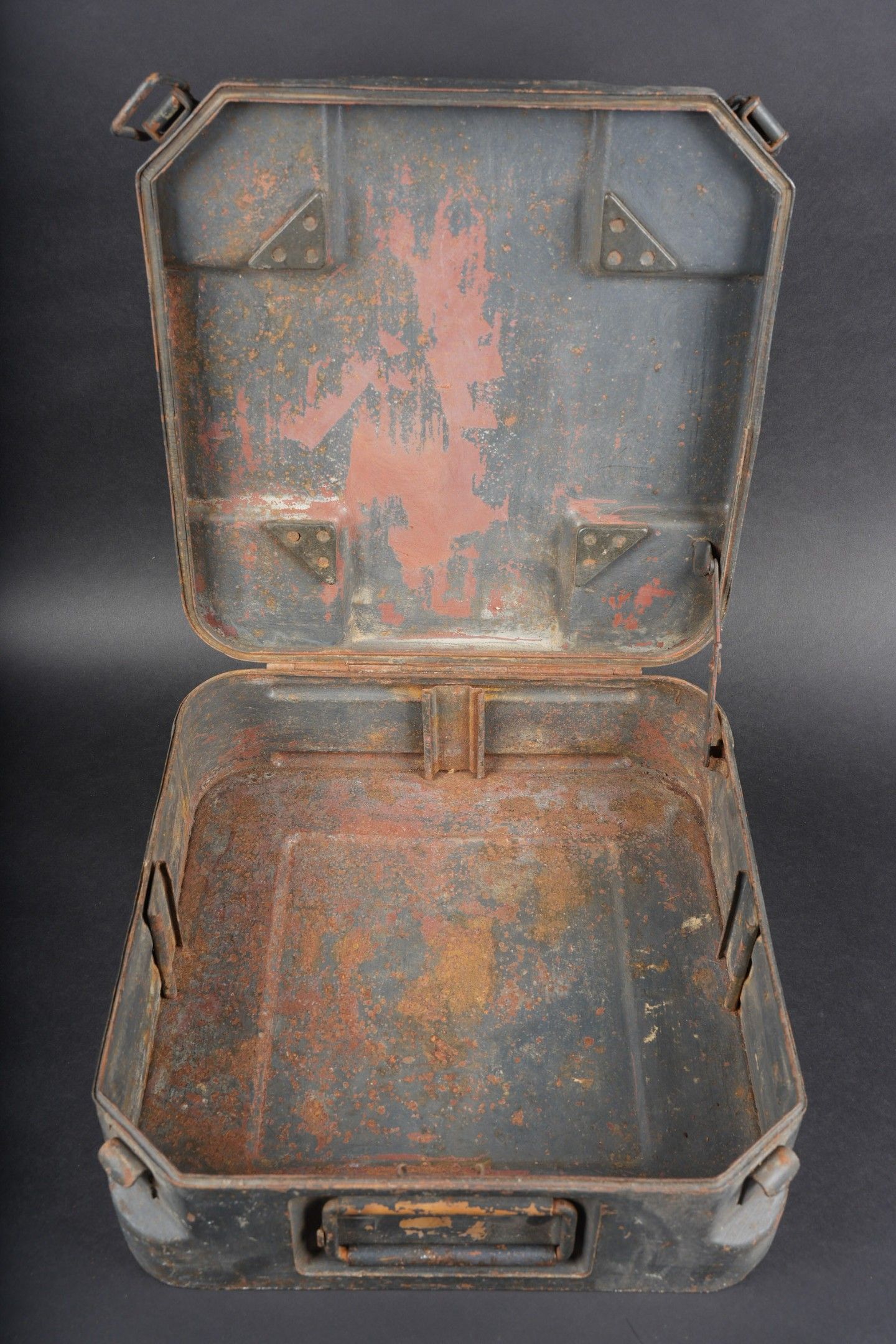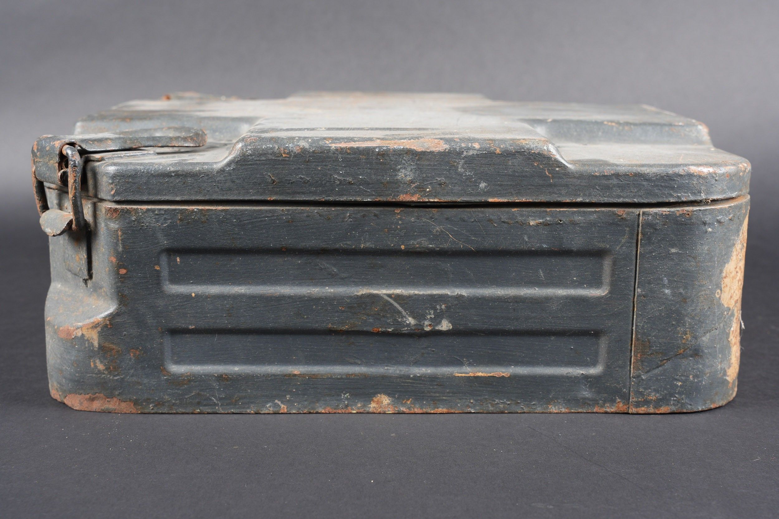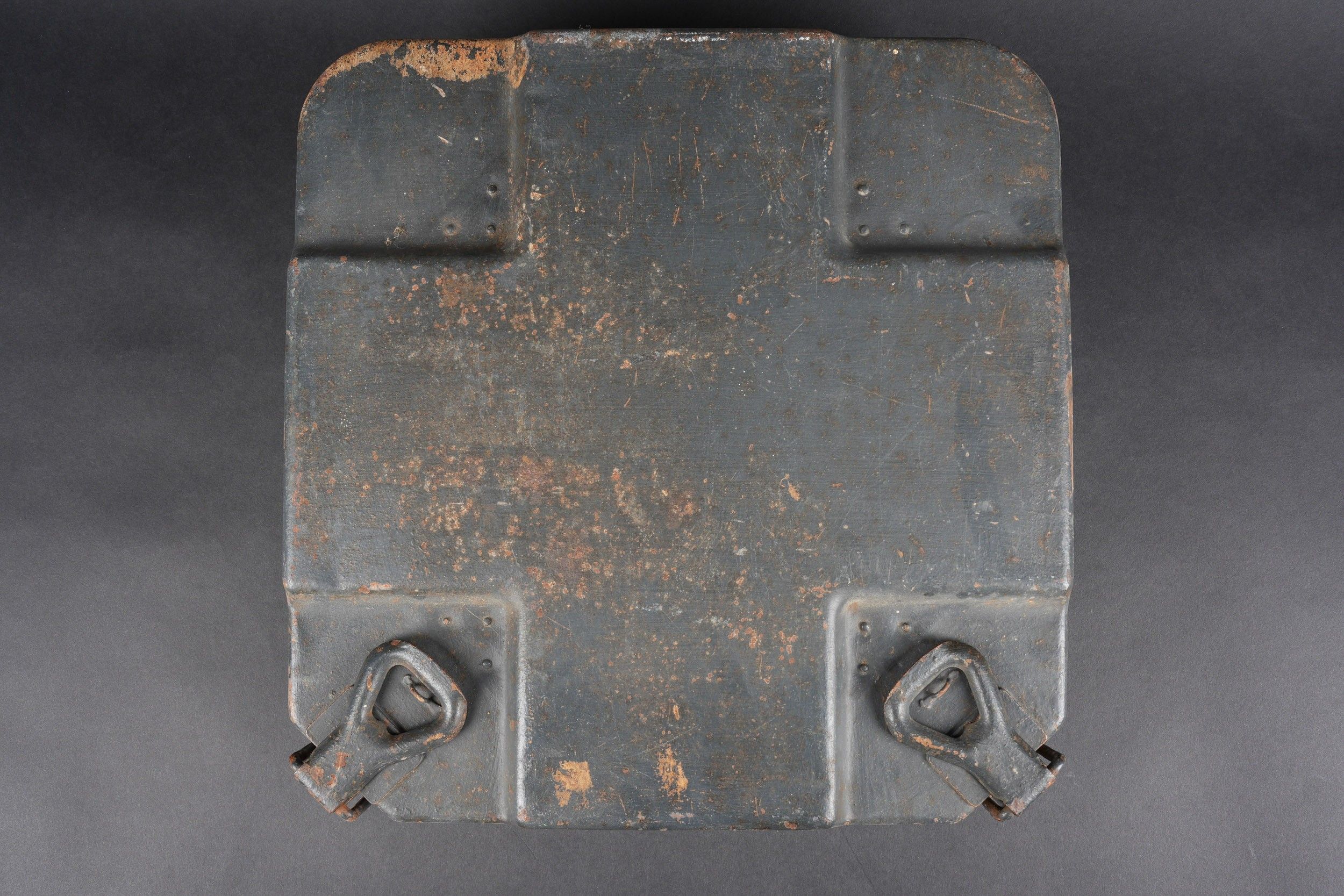 Case for tellermine. In metal, the closing hooks are present, as well as the carrying handle. Sand yellow paint overlaid with a grey paintbrush. Manufactured by JDQ42 with Waa eagle. The internal racks are present. Some wear and patina. Condition II+. Tellermine metal box Complete with closure hooks and carrying handle. Yellow-sand paint overpainted with grey by brush. Maker JDQ 42 with eagle Waa marking. Internal racks present. Shows some wear and patina. Condition II+.