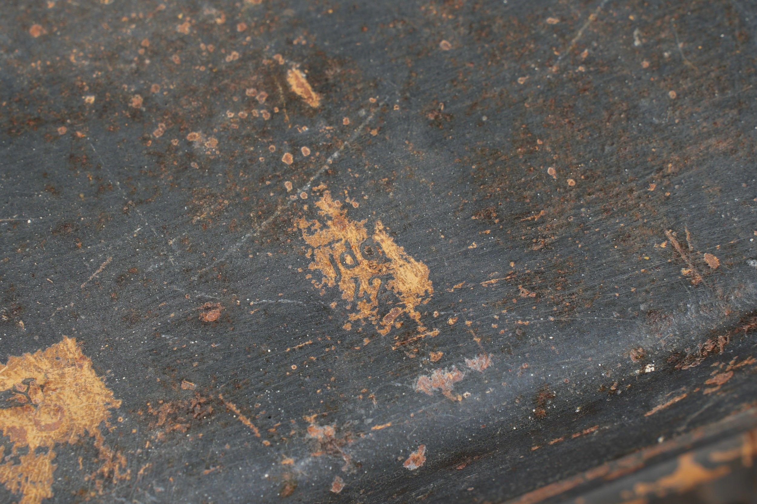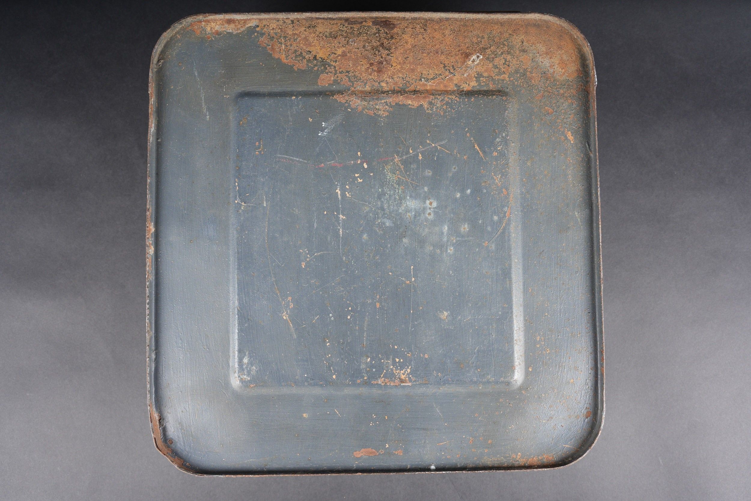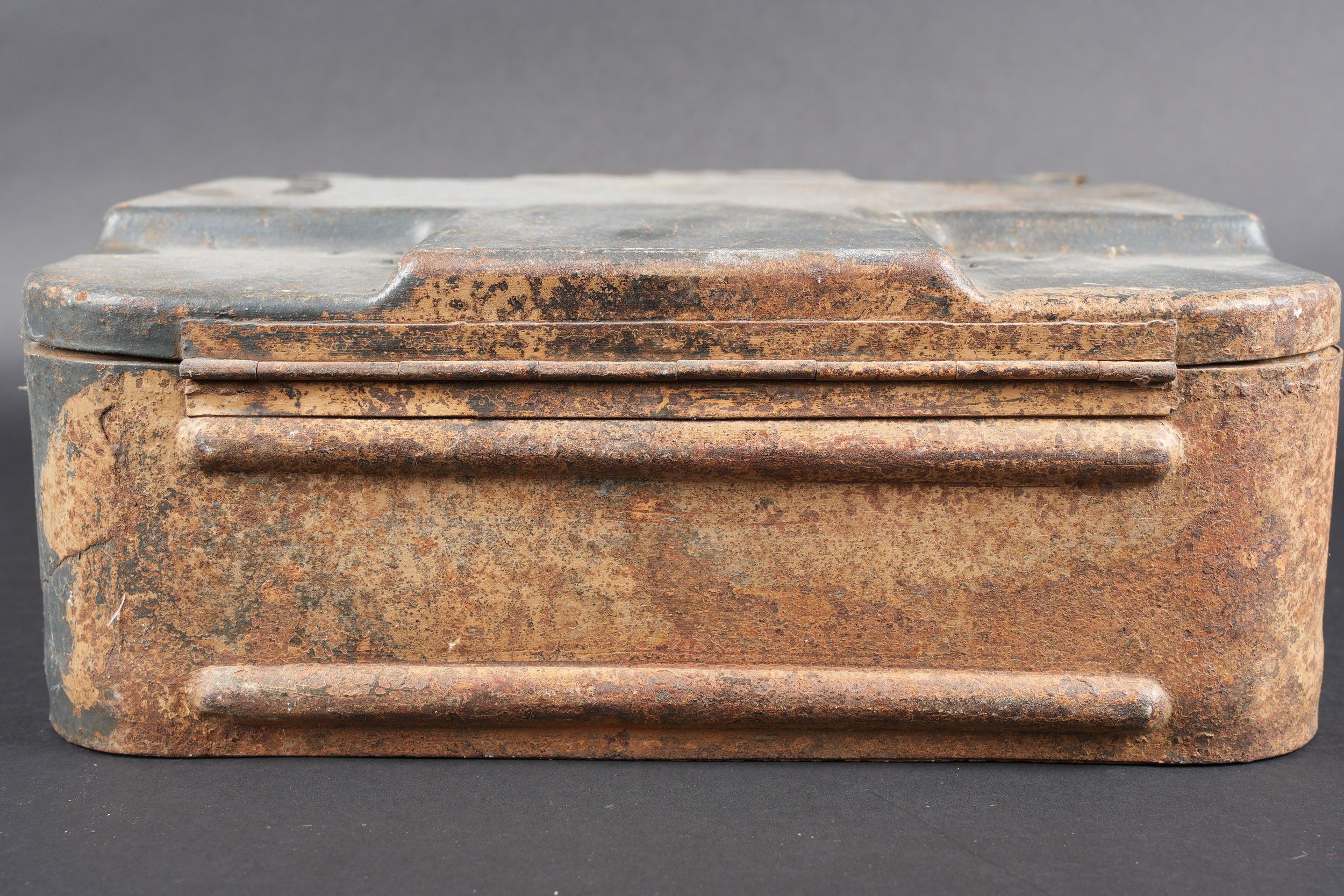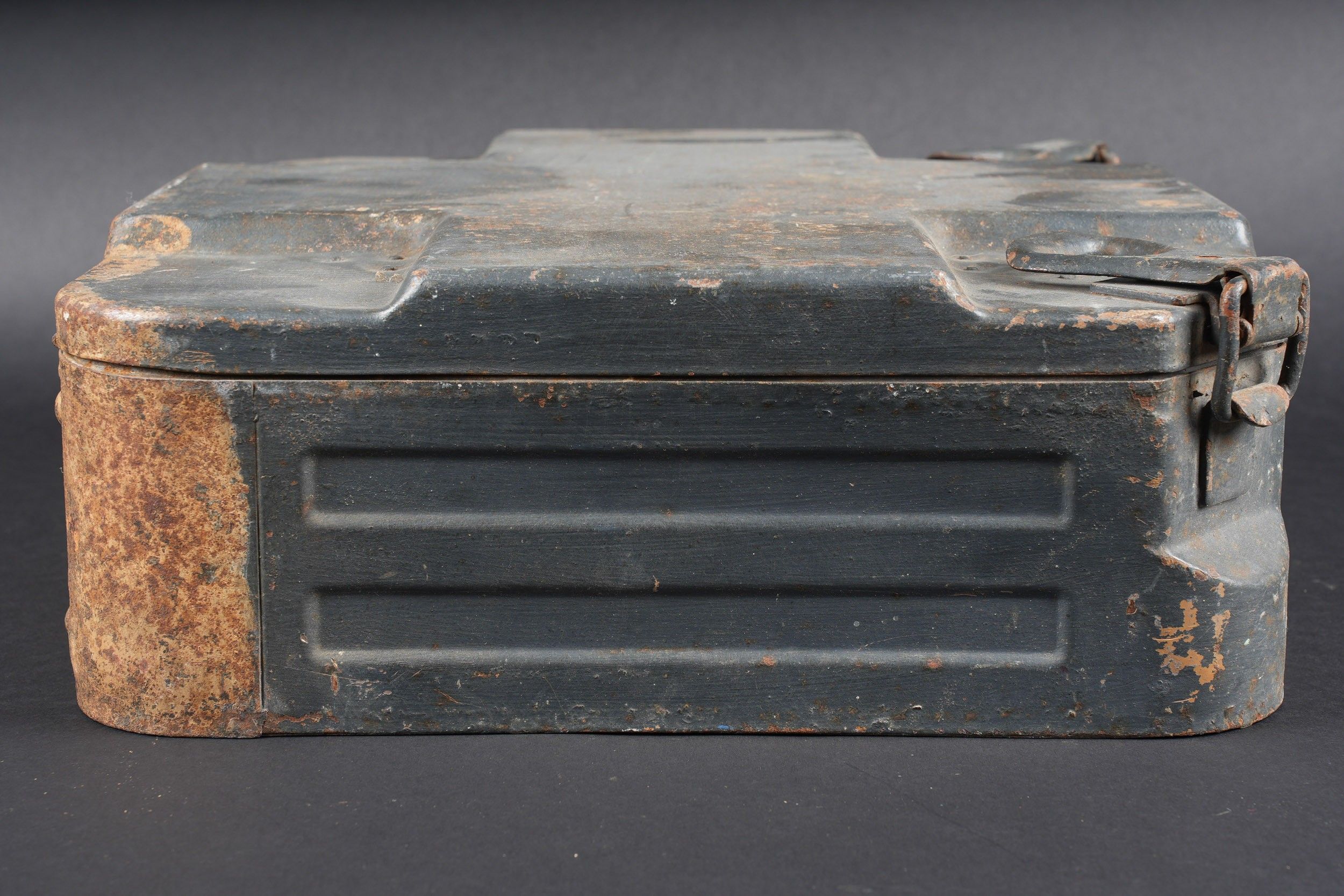 Case for tellermine. In metal, the closing hooks are present, as well as the carrying handle. Sand yellow paint overlaid with a grey paintbrush. Manufactured by JDQ42 with Waa eagle. The internal racks are present. Some wear and patina. Condition II+. Tellermine metal box Complete with closure hooks and carrying handle. Yellow-sand paint overpainted with grey by brush. Maker JDQ 42 with eagle Waa marking. Internal racks present. Shows some wear and patina. Condition II+.