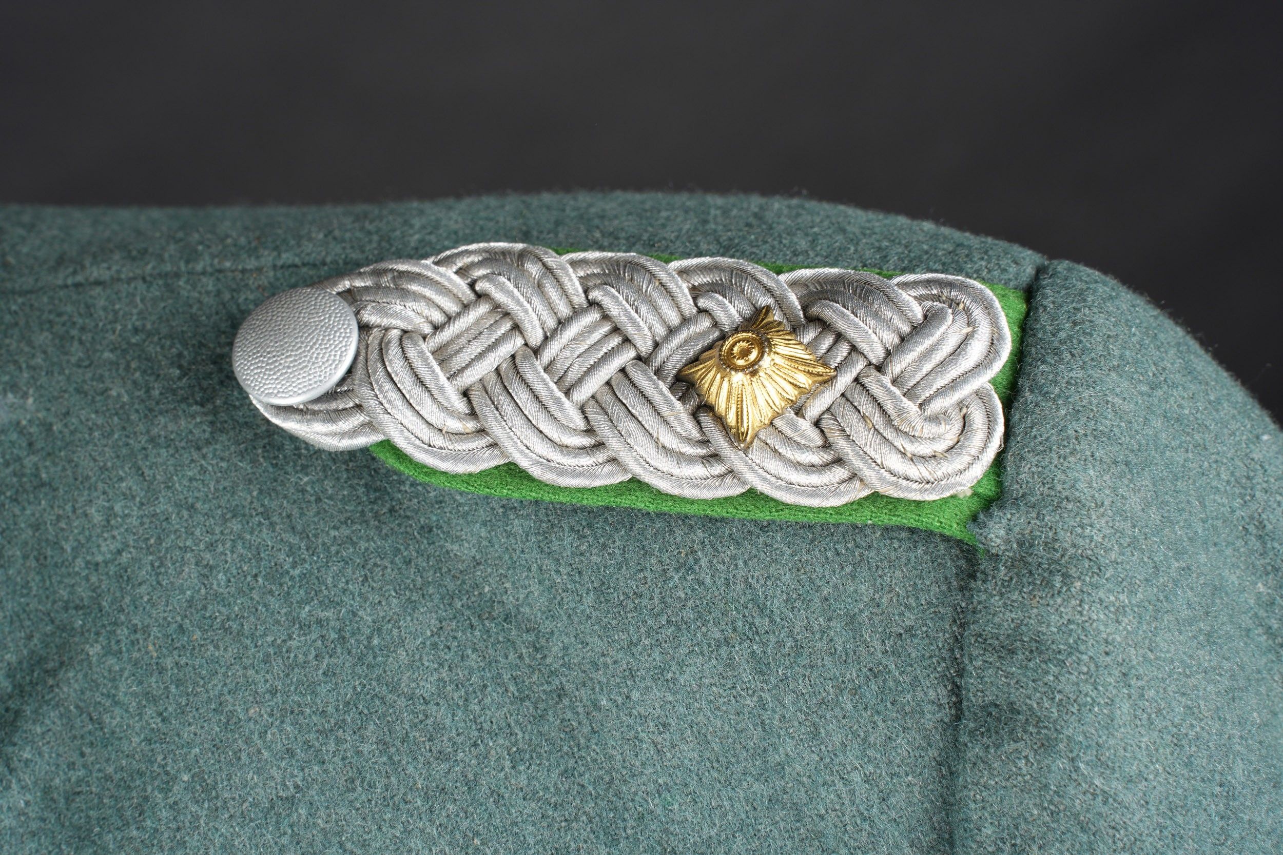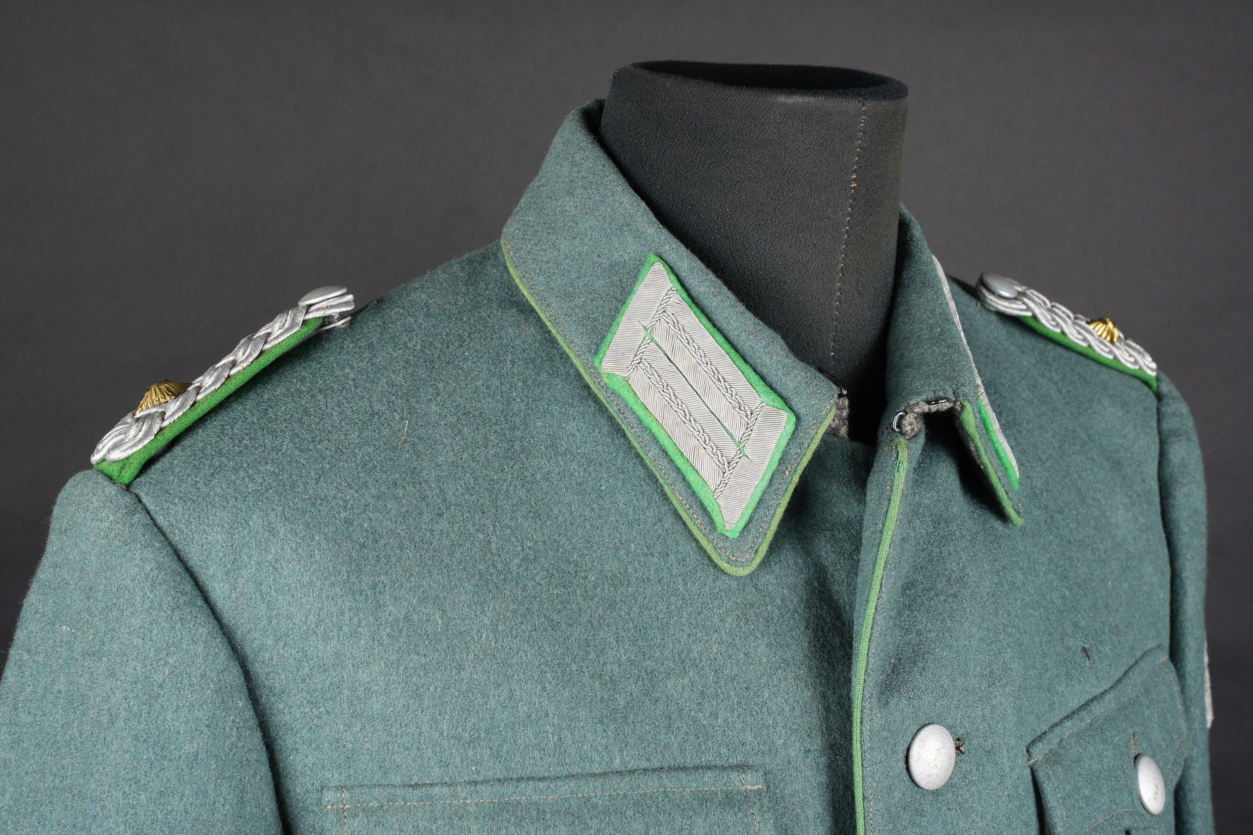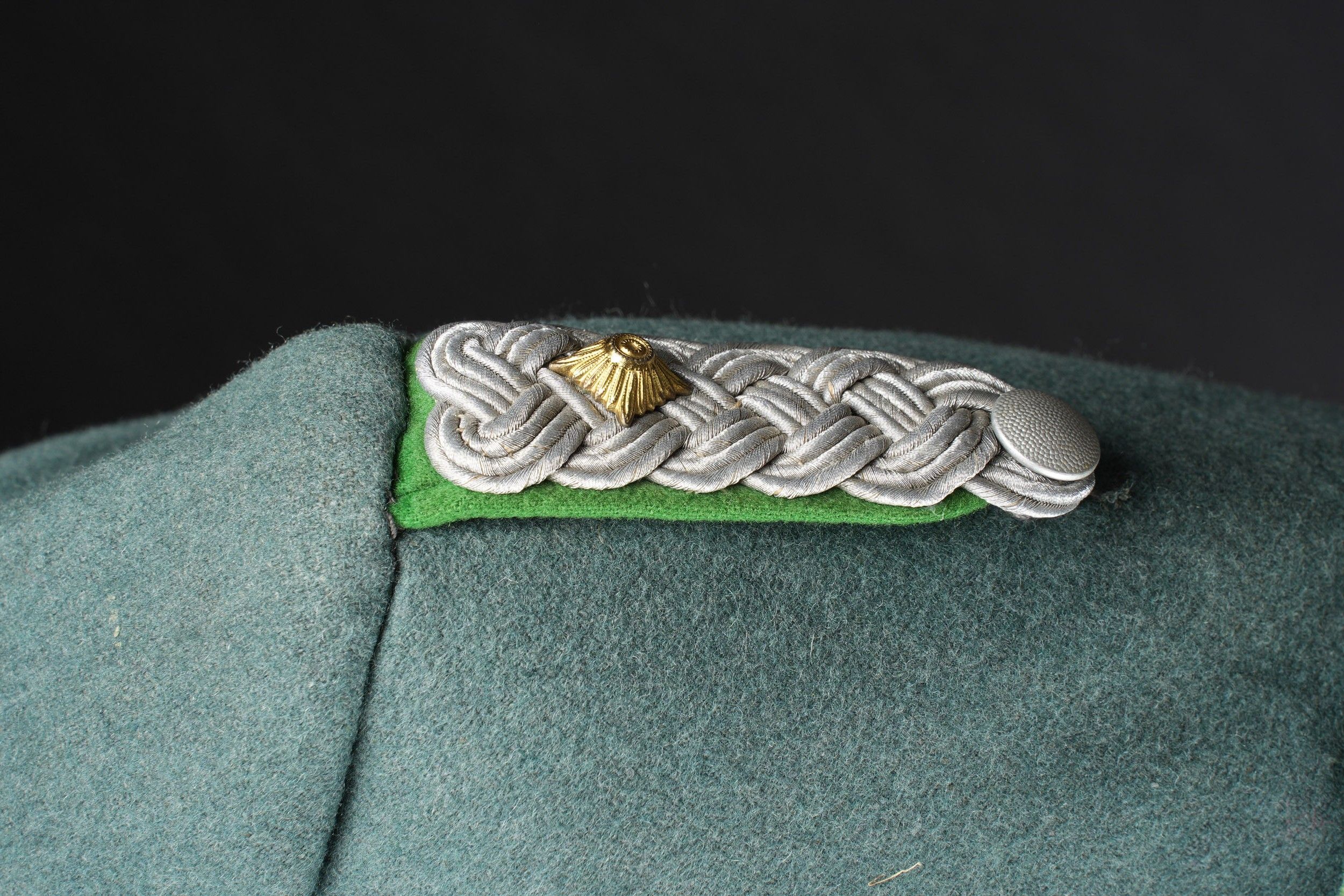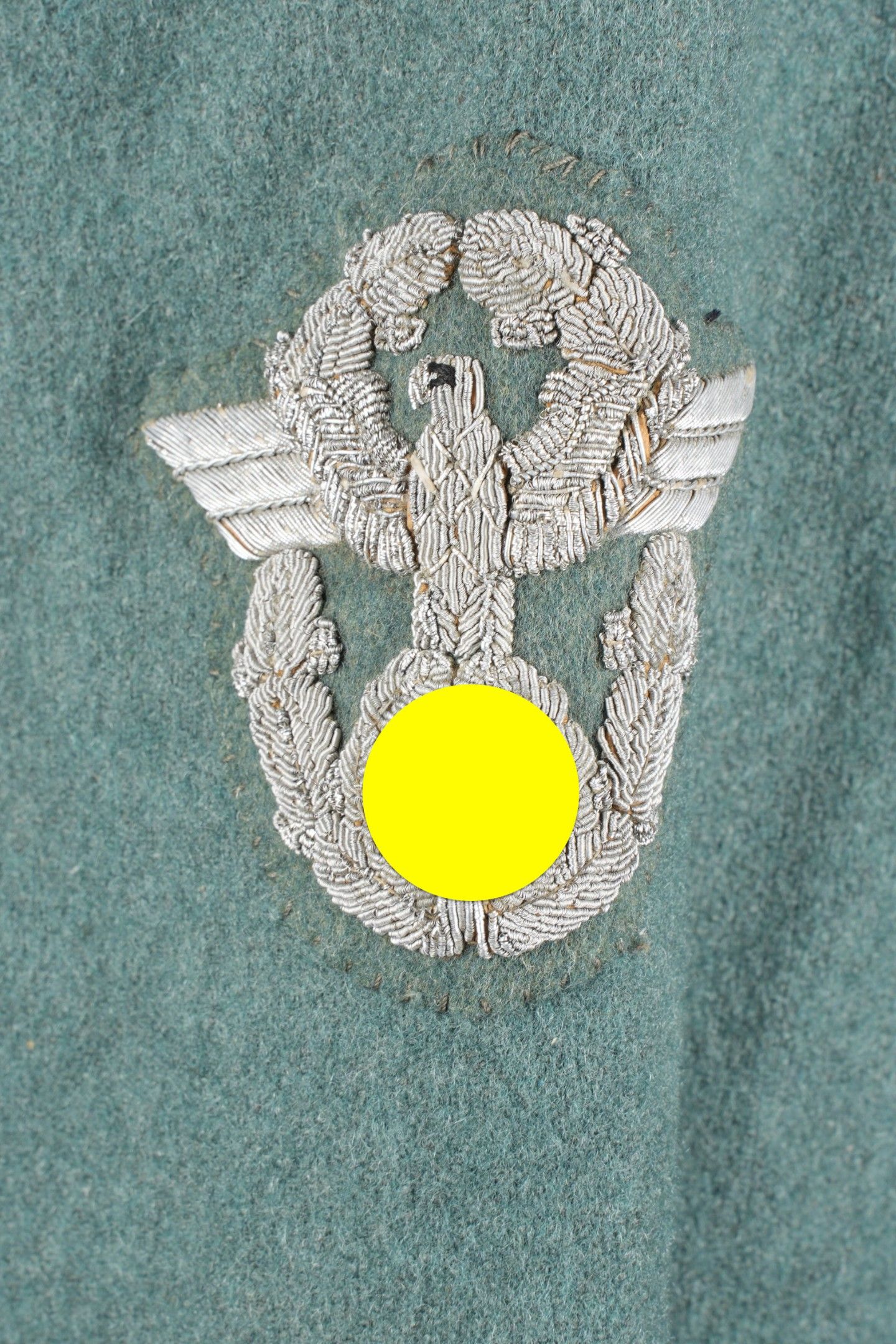 Polizei officer's jacket. Thick grey-green cloth. Light green piping on sleeves, buttonhole and collar. Hand-sewn officer's litzen on collar. Polizei officer's sleeve badge, in silver cannetille, hand-sewn. Oberstleutnant's shoulder tabs. Green sateen lined interior, no visible markings. There is some wear and patina to the piece, as well as stains and moth marks. Condition II+. Polizei officer tunic Heavy grey-green wool. Light green piping on cuffs, buttonhole edges, and collar. Hand-sewn officer Litzen on collar. Hand-embroidered silver wire Polizei officer sleeve insignia. Shoulder boards for an Oberstleutnant. Green satin lining, no visible markings. Shows some wear, patina, stains, and moth traces. Condition II+.