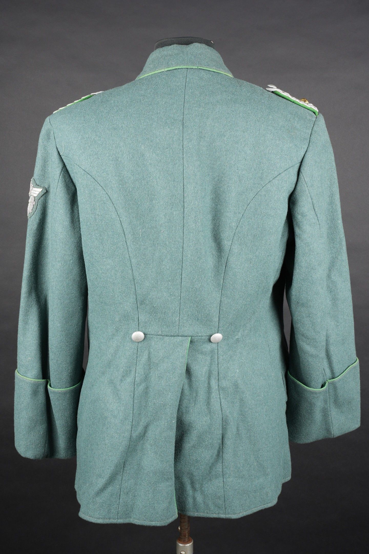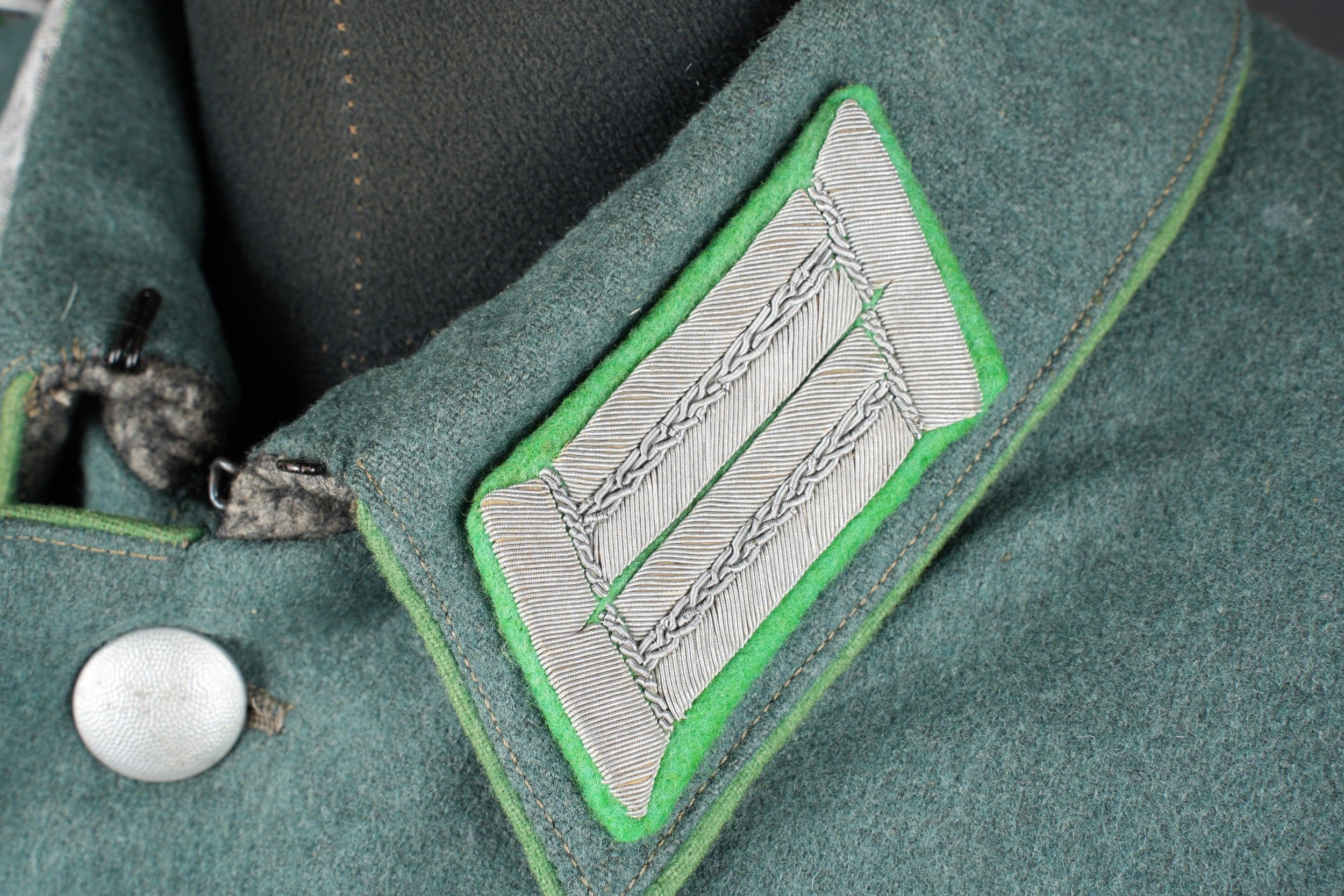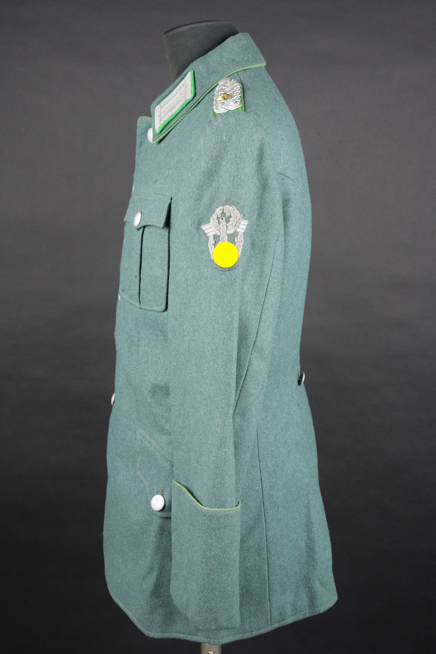 Polizei officer's jacket. Thick grey-green cloth. Light green piping on sleeves, buttonhole and collar. Hand-sewn officer's litzen on collar. Polizei officer's sleeve badge, in silver cannetille, hand-sewn. Oberstleutnant's shoulder tabs. Green sateen lined interior, no visible markings. There is some wear and patina to the piece, as well as stains and moth marks. Condition II+. Polizei officer tunic Heavy grey-green wool. Light green piping on cuffs, buttonhole edges, and collar. Hand-sewn officer Litzen on collar. Hand-embroidered silver wire Polizei officer sleeve insignia. Shoulder boards for an Oberstleutnant. Green satin lining, no visible markings. Shows some wear, patina, stains, and moth traces. Condition II+.