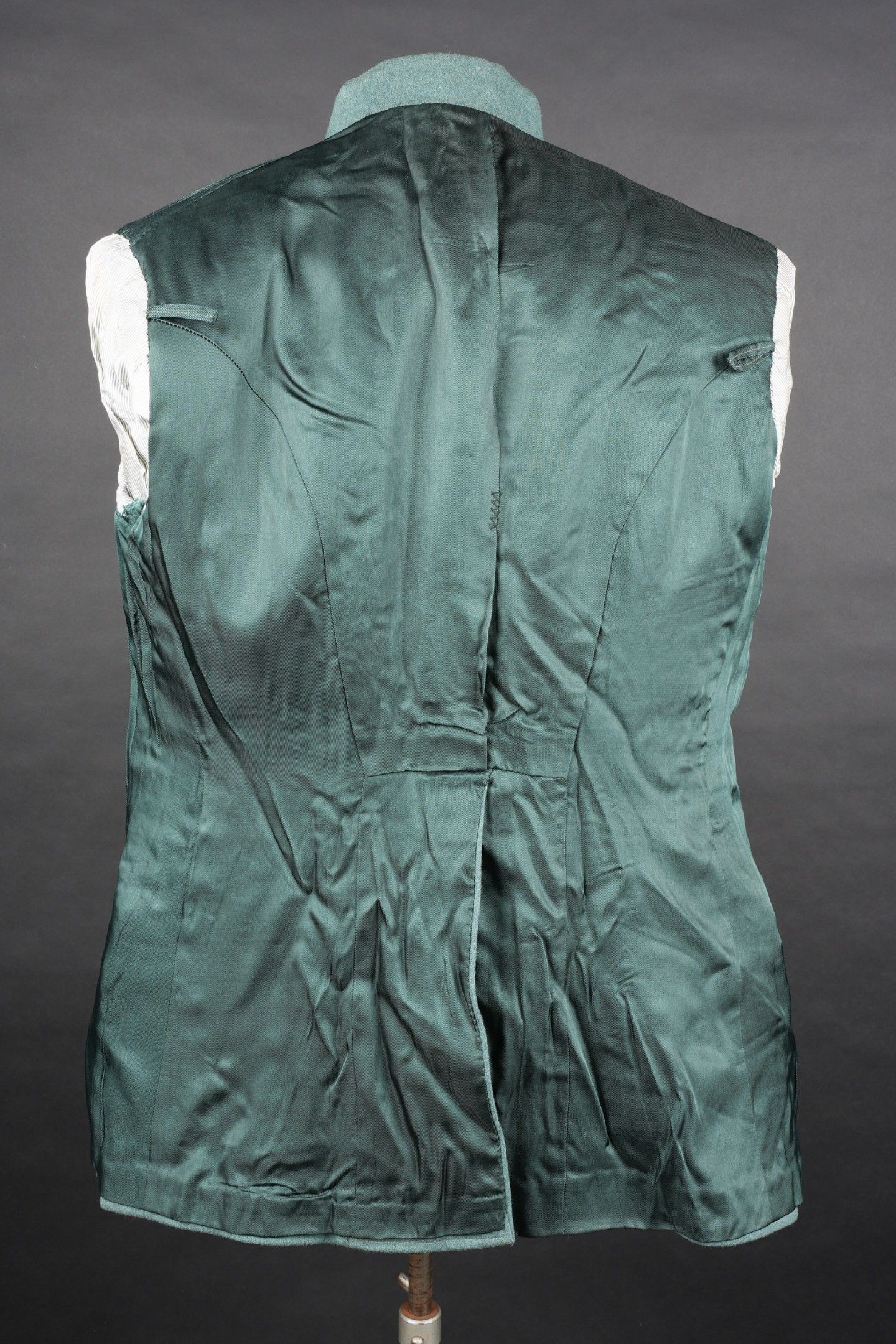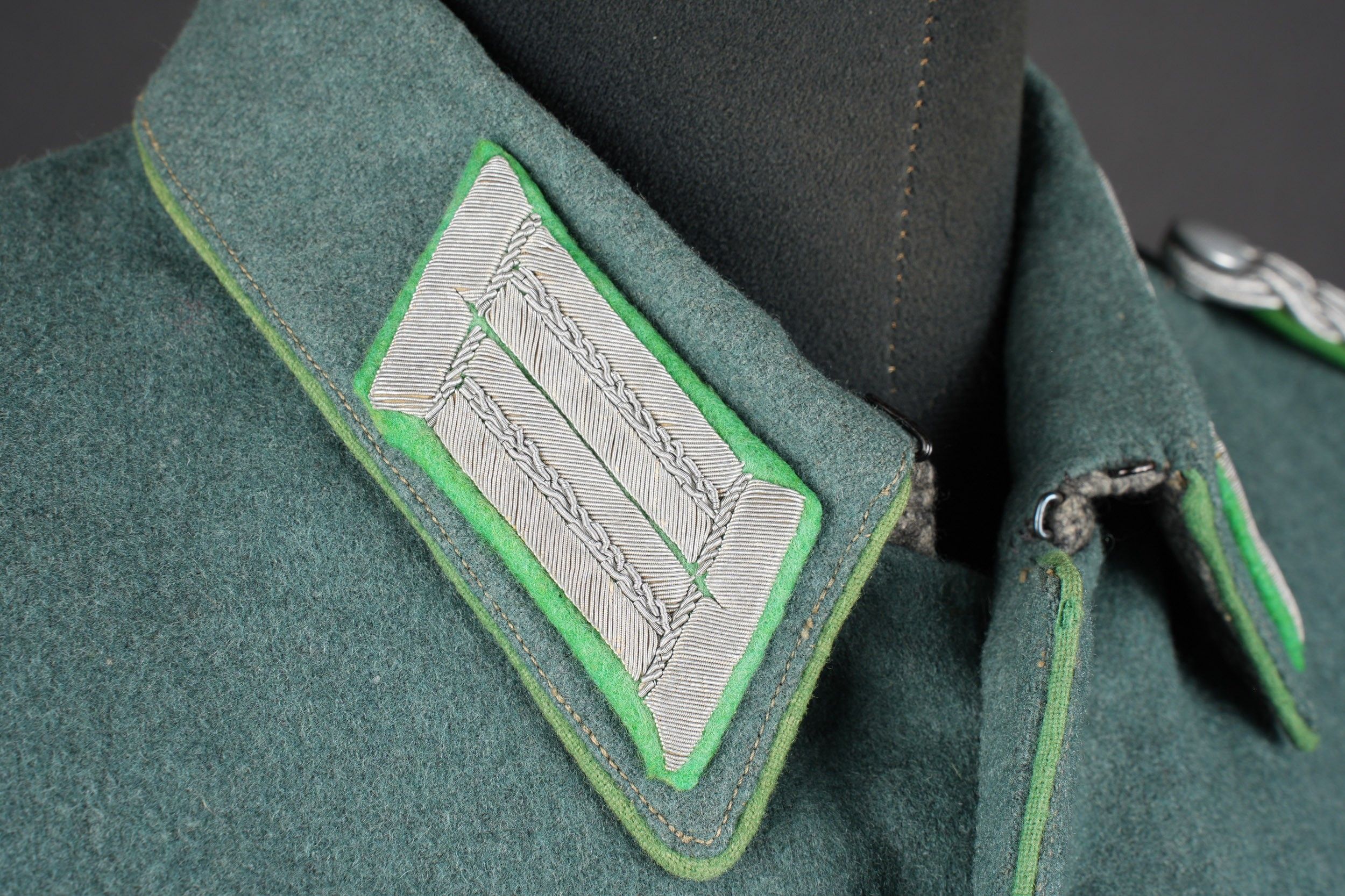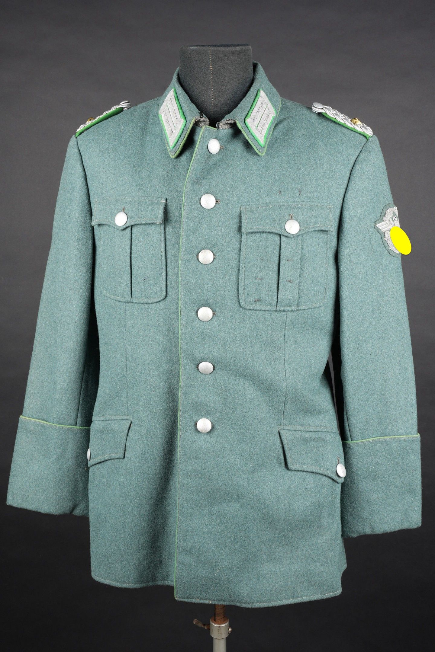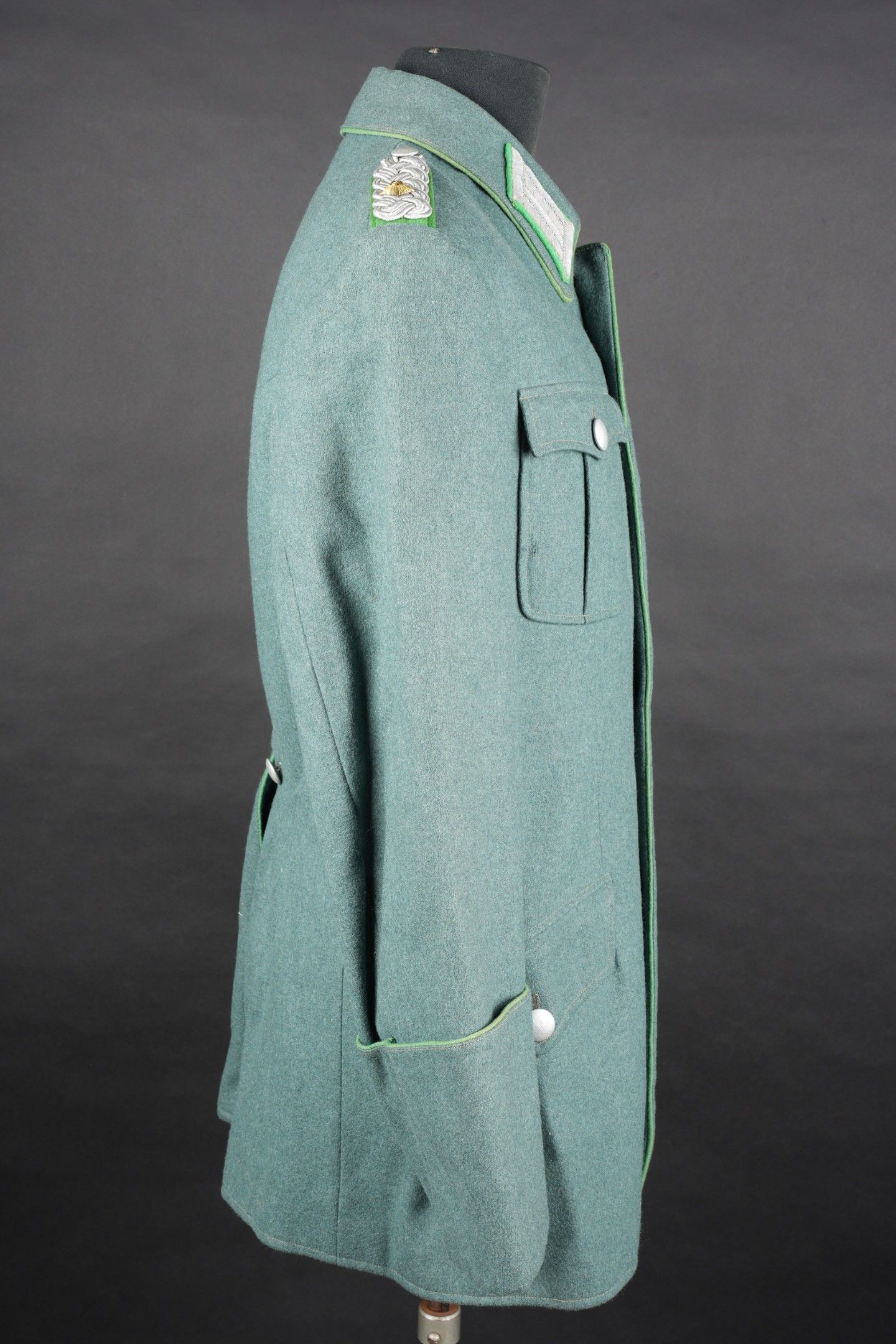 Polizei officer's jacket. Thick grey-green cloth. Light green piping on sleeves, buttonhole and collar. Hand-sewn officer's litzen on collar. Polizei officer's sleeve badge, in silver cannetille, hand-sewn. Oberstleutnant's shoulder tabs. Green sateen lined interior, no visible markings. There is some wear and patina to the piece, as well as stains and moth marks. Condition II+. Polizei officer tunic Heavy grey-green wool. Light green piping on cuffs, buttonhole edges, and collar. Hand-sewn officer Litzen on collar. Hand-embroidered silver wire Polizei officer sleeve insignia. Shoulder boards for an Oberstleutnant. Green satin lining, no visible markings. Shows some wear, patina, stains, and moth traces. Condition II+.