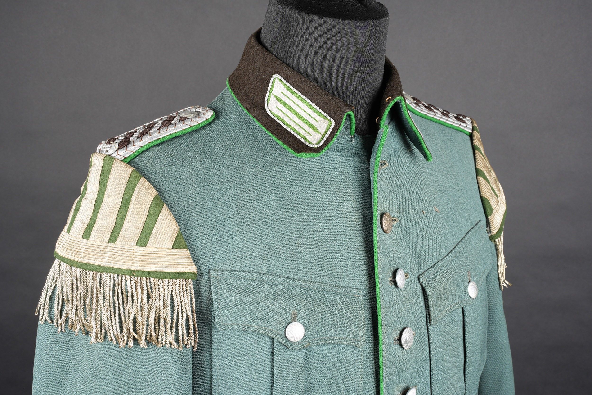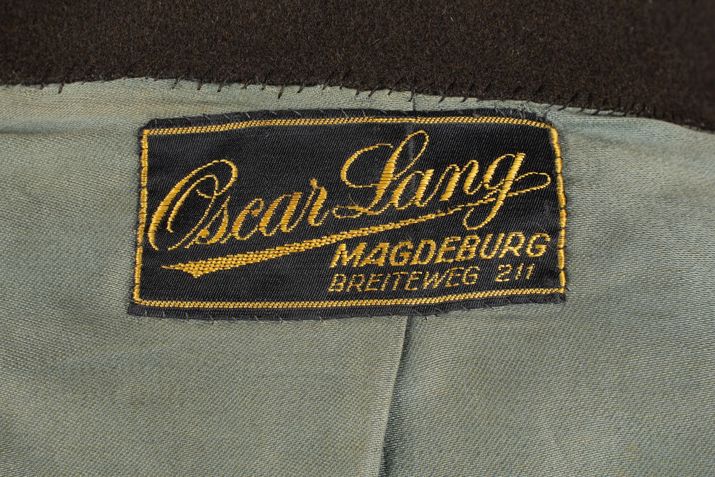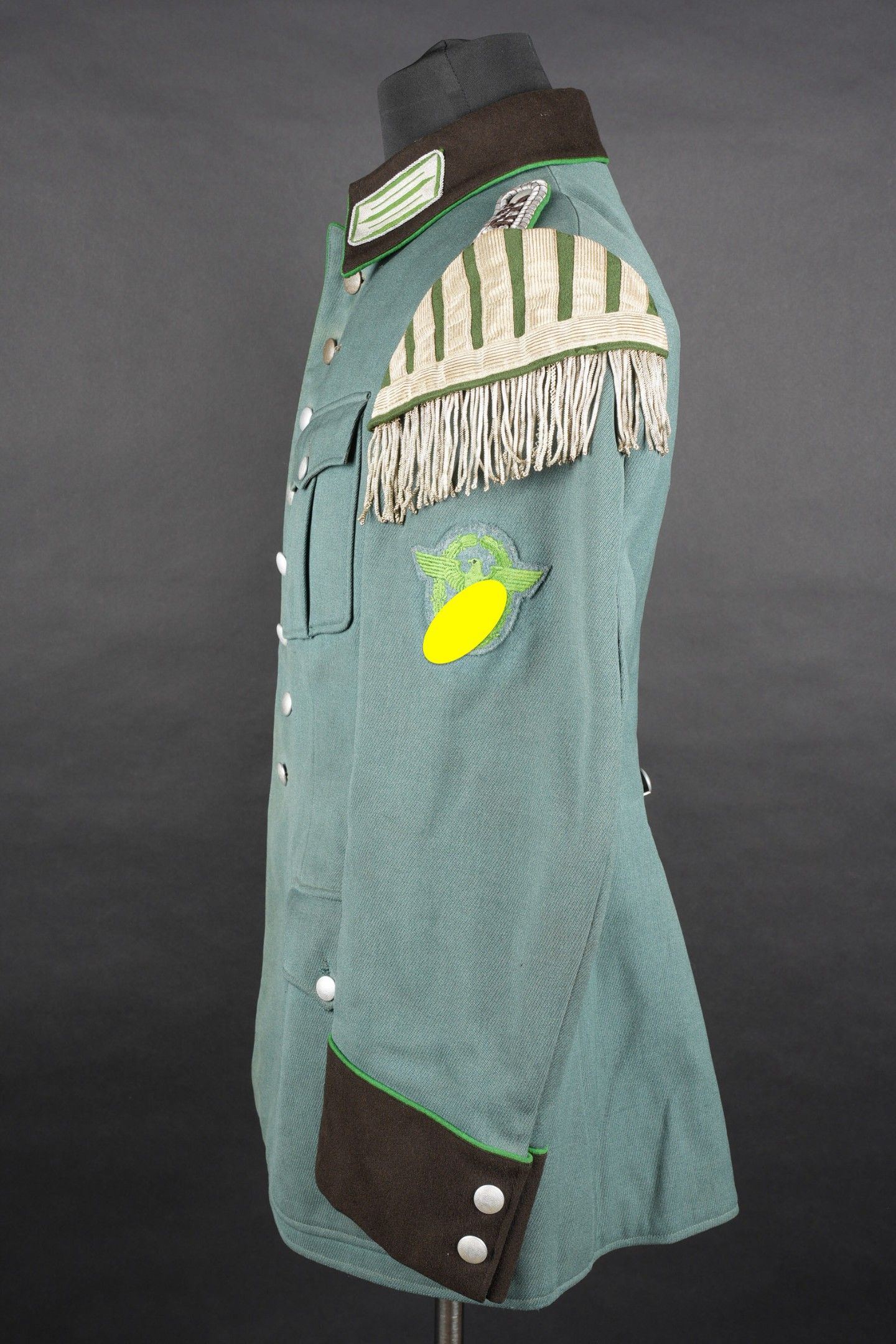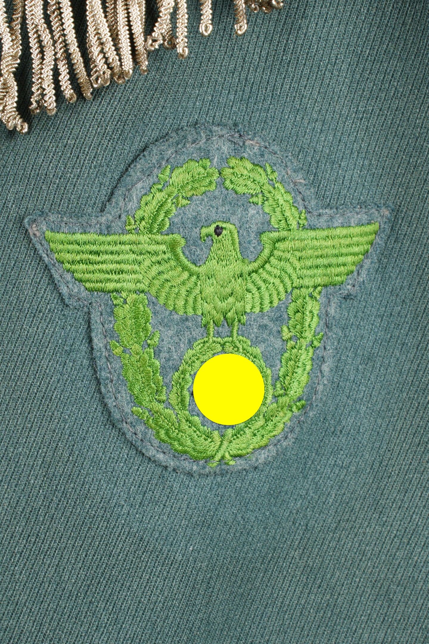 Polizei musician's jacket. In grey-green gabardine, all buttons are present. Collar lined with brown cloth. Hand-sewn non-commissioned officer's litzen. Hand-sewn Polizei sleeve eagle. Polizei honeycomb. Meister shoulder tabs. The badges and honeycombs have not been removed in order to check the back. Lined with green sateen. Label of the tailor Oscar Lange Magdeburg. There is some wear and patina to the piece, as well as stains and moth marks. Condition II+. Polizei musician tunic Grey-green gabardine, all buttons present. Brown wool collar lining. Hand-sewn NCO Litzen and hand-sewn Polizei sleeve eagle. Polizei honeycomb musician's badge. Shoulder boards for Meister. Insignia and sleeve patches not removed for examination. Green satin lining with tailor's label Oscar Lange, Magdeburg. Shows wear, patina, stains, and moth traces. Condition II+.