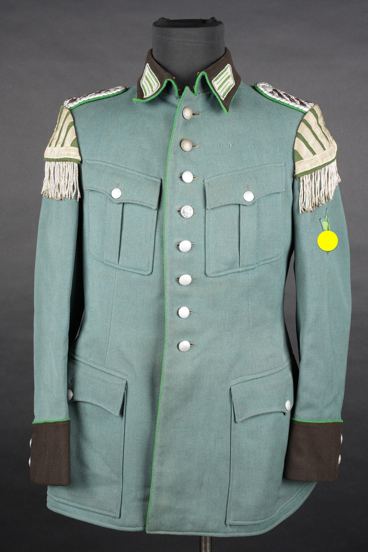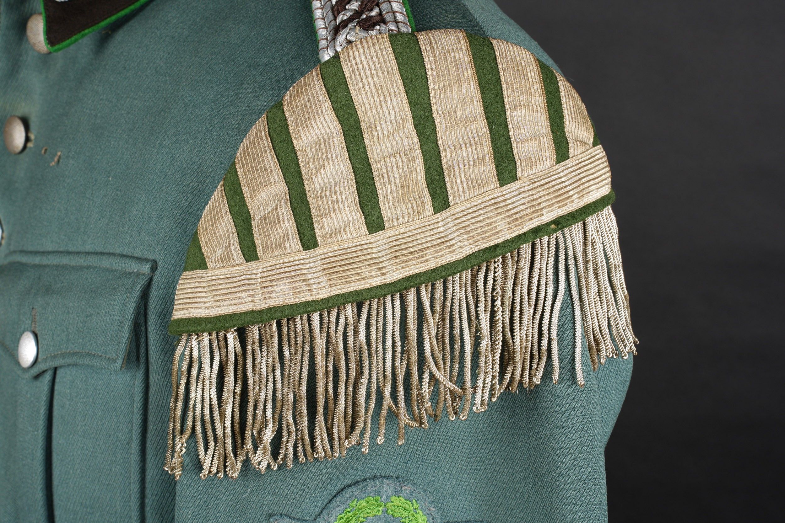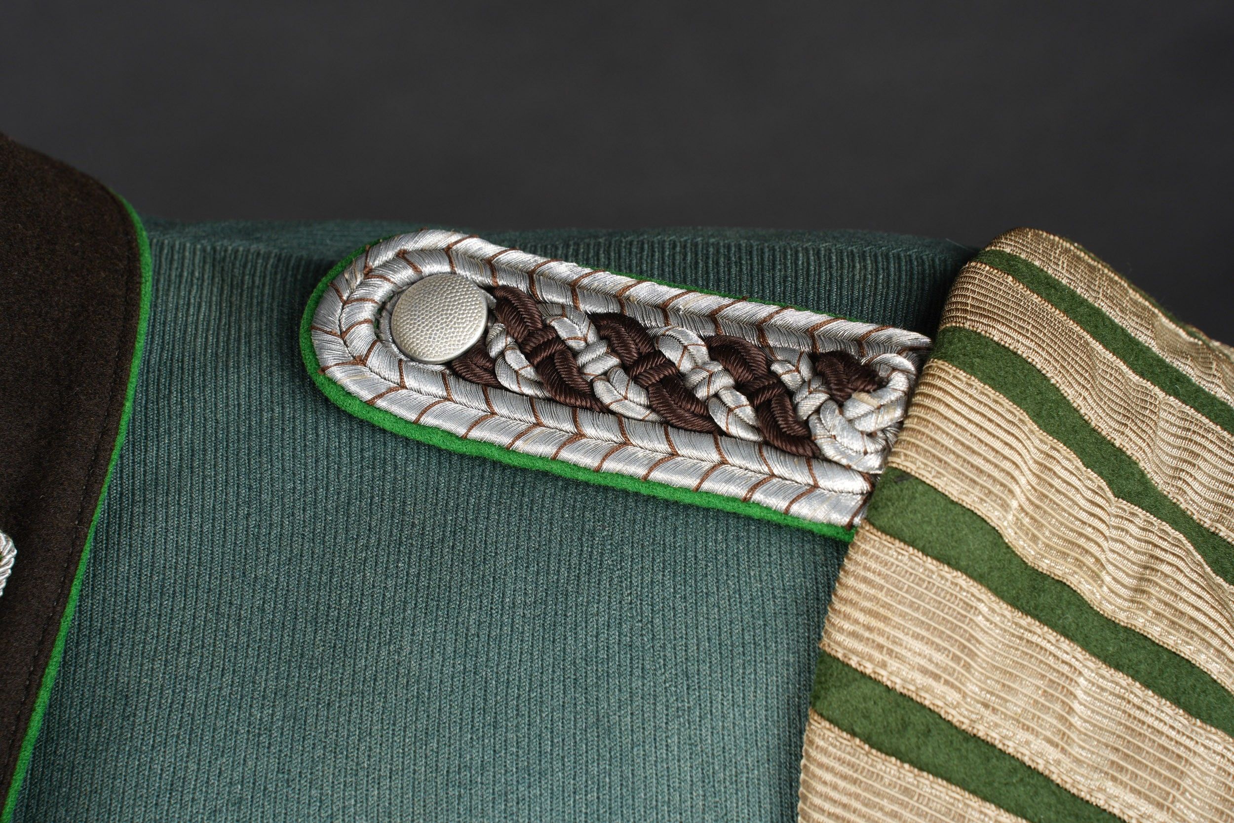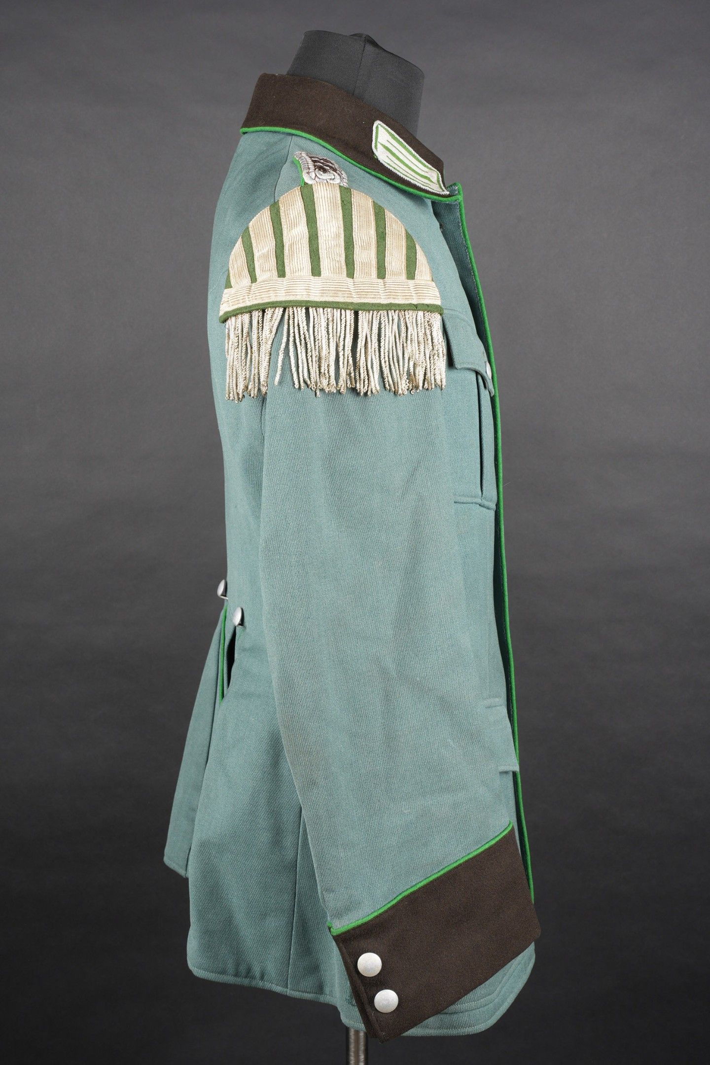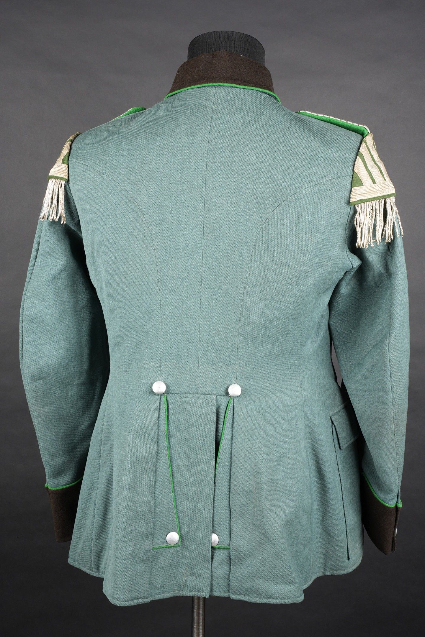 Polizei musician's jacket. In grey-green gabardine, all buttons are present. Collar lined with brown cloth. Hand-sewn non-commissioned officer's litzen. Hand-sewn Polizei sleeve eagle. Polizei honeycomb. Meister shoulder tabs. The badges and honeycombs have not been removed in order to check the back. Lined with green sateen. Label of the tailor Oscar Lange Magdeburg. There is some wear and patina to the piece, as well as stains and moth marks. Condition II+. Polizei musician tunic Grey-green gabardine, all buttons present. Brown wool collar lining. Hand-sewn NCO Litzen and hand-sewn Polizei sleeve eagle. Polizei honeycomb musician's badge. Shoulder boards for Meister. Insignia and sleeve patches not removed for examination. Green satin lining with tailor's label Oscar Lange, Magdeburg. Shows wear, patina, stains, and moth traces. Condition II+.