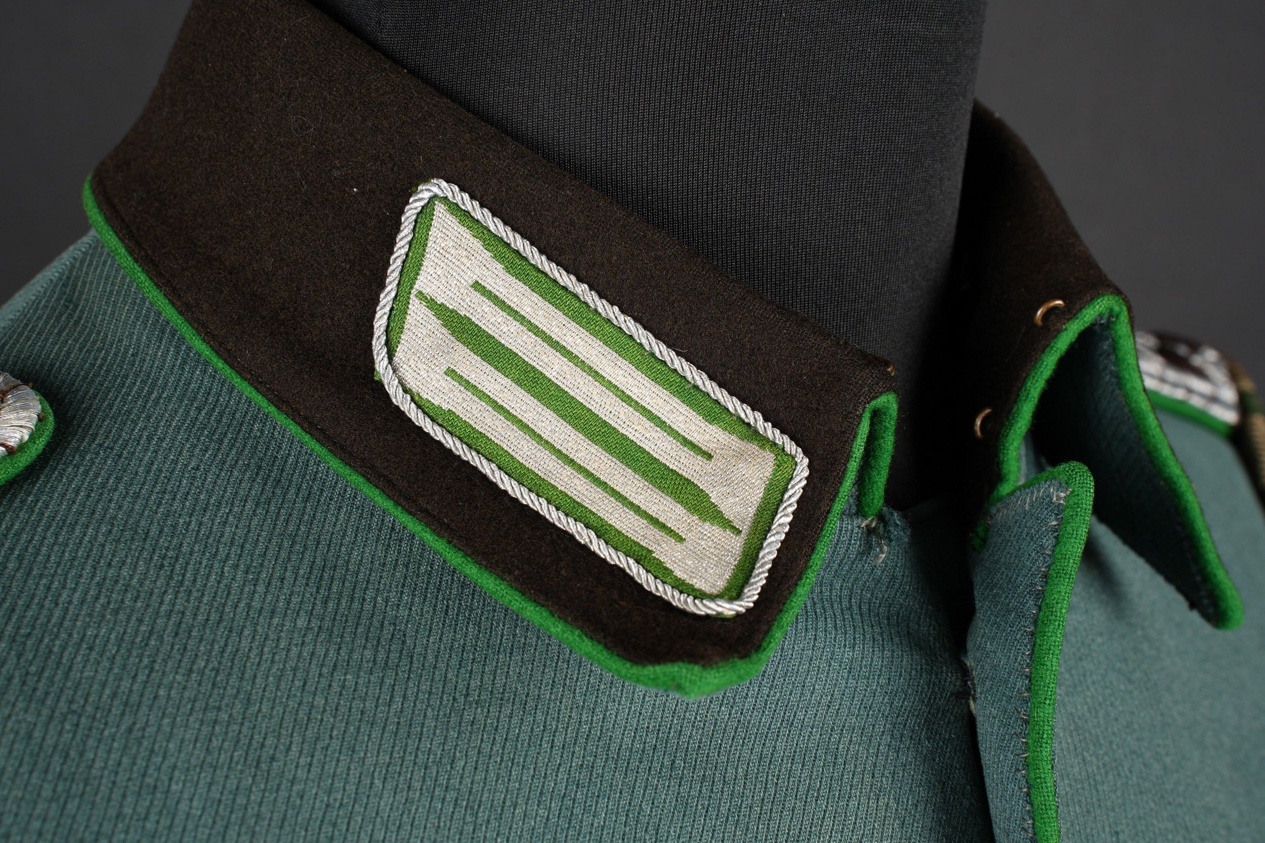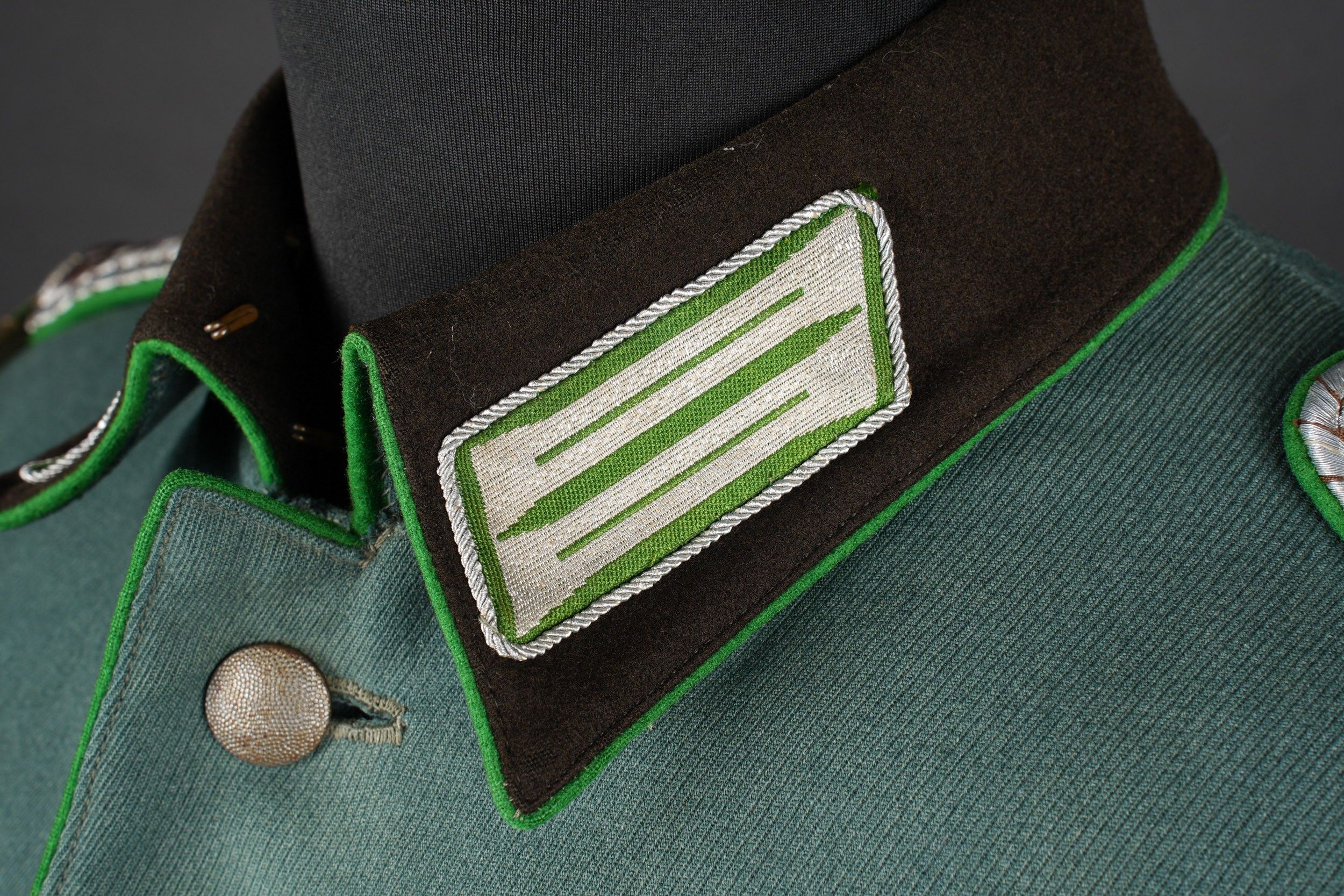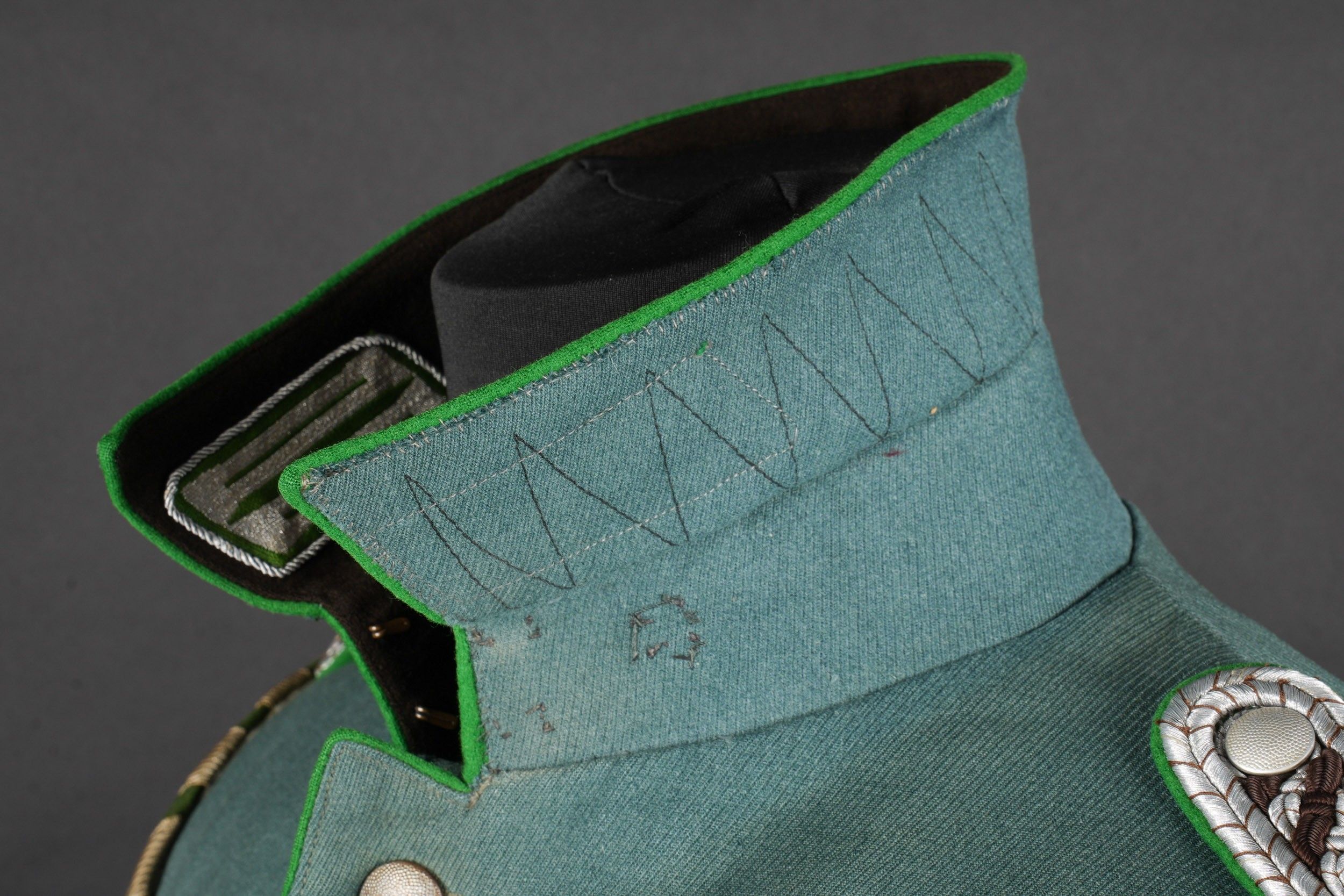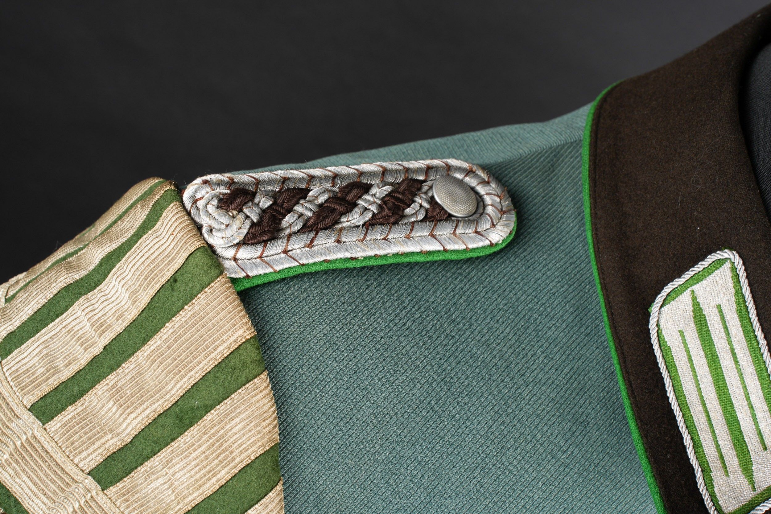 Polizei musician's jacket. In grey-green gabardine, all buttons are present. Collar lined with brown cloth. Hand-sewn non-commissioned officer's litzen. Hand-sewn Polizei sleeve eagle. Polizei honeycomb. Meister shoulder tabs. The badges and honeycombs have not been removed in order to check the back. Lined with green sateen. Label of the tailor Oscar Lange Magdeburg. There is some wear and patina to the piece, as well as stains and moth marks. Condition II+. Polizei musician tunic Grey-green gabardine, all buttons present. Brown wool collar lining. Hand-sewn NCO Litzen and hand-sewn Polizei sleeve eagle. Polizei honeycomb musician's badge. Shoulder boards for Meister. Insignia and sleeve patches not removed for examination. Green satin lining with tailor's label Oscar Lange, Magdeburg. Shows wear, patina, stains, and moth traces. Condition II+.
