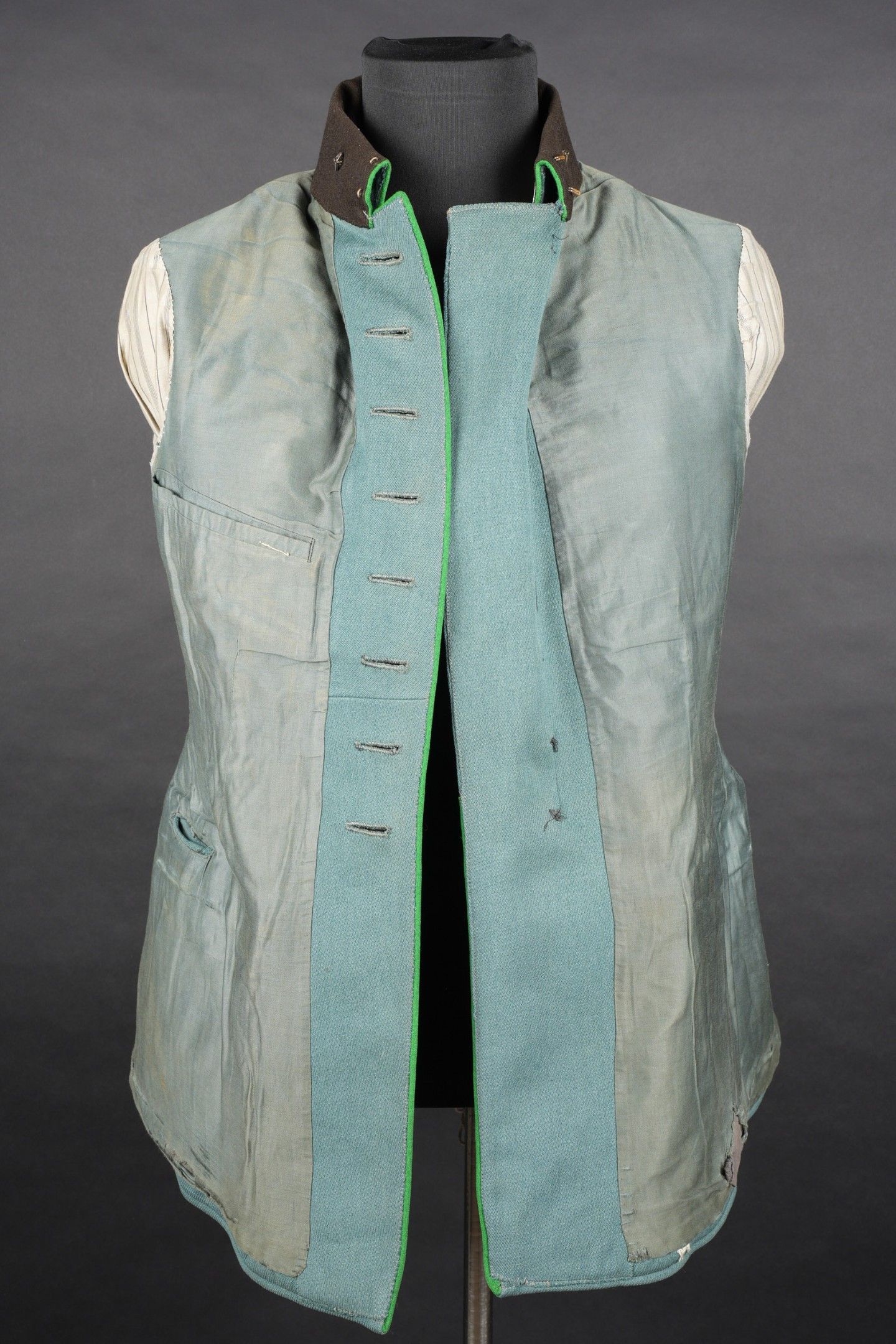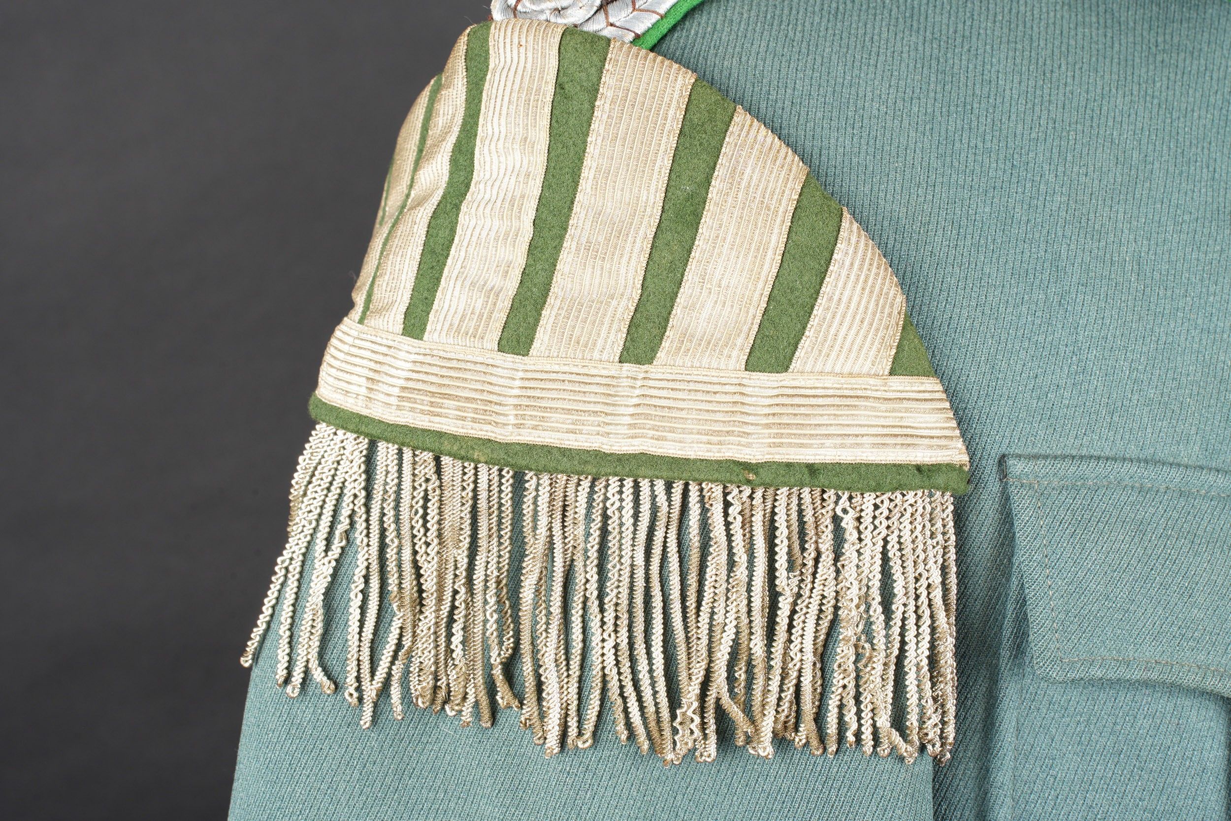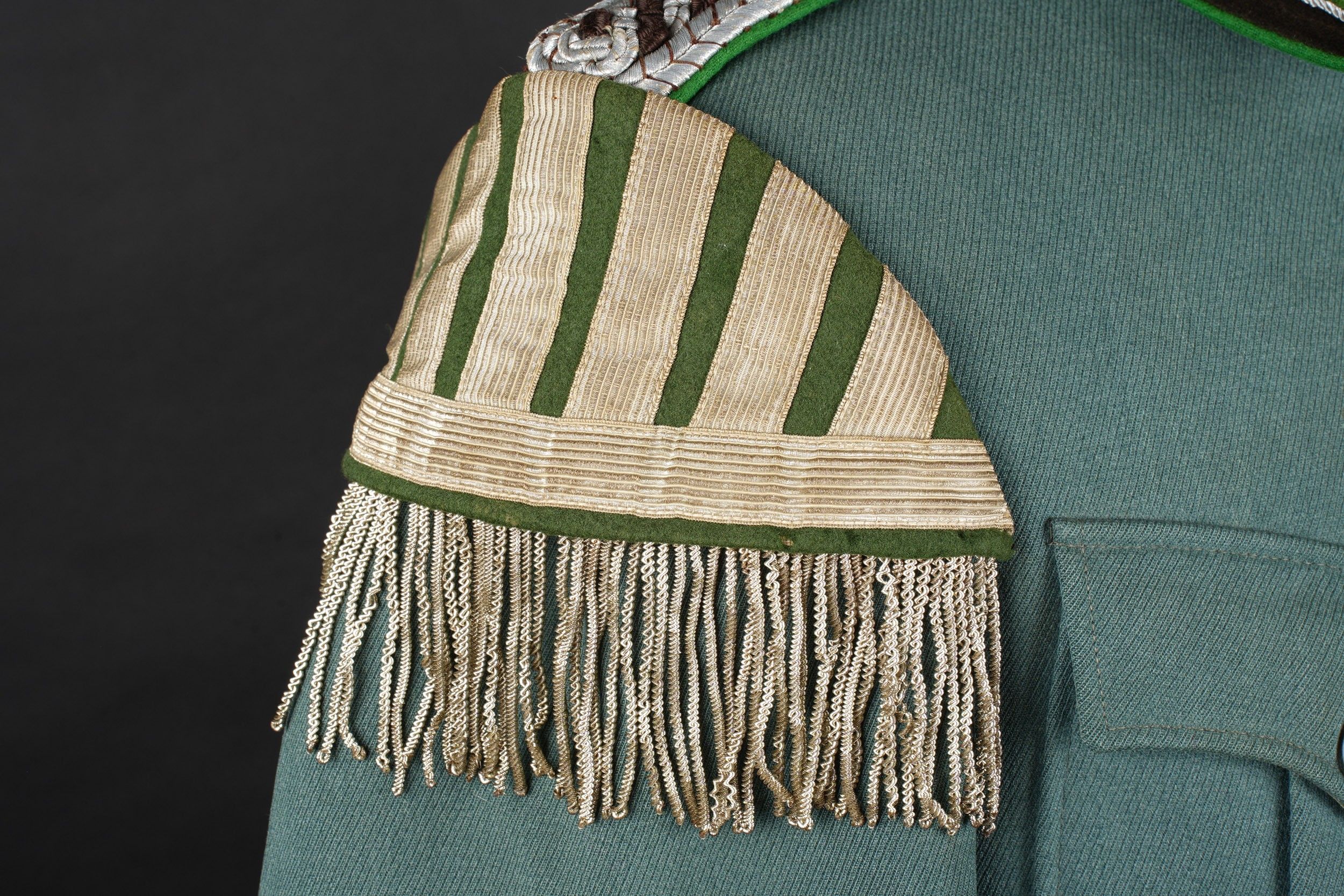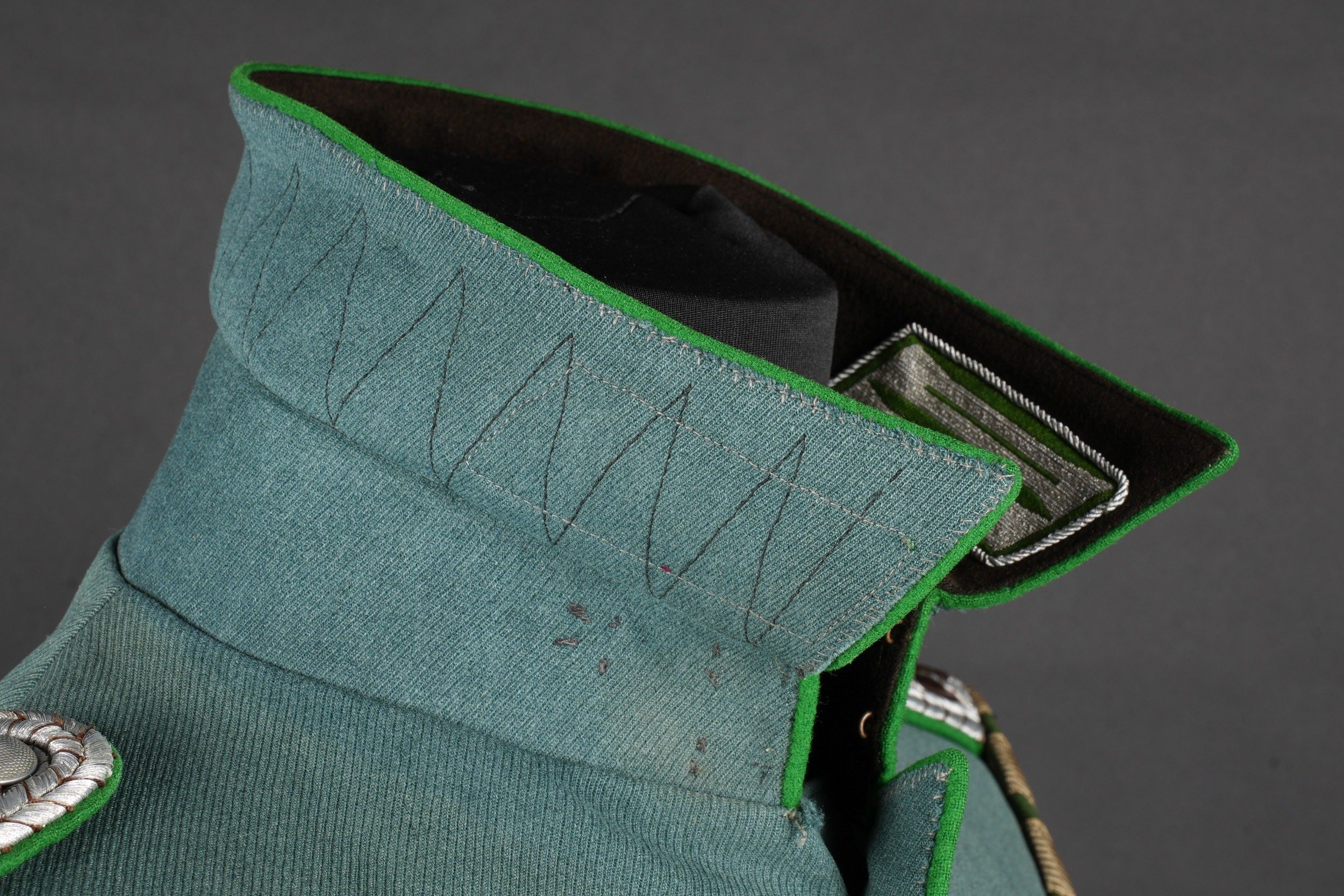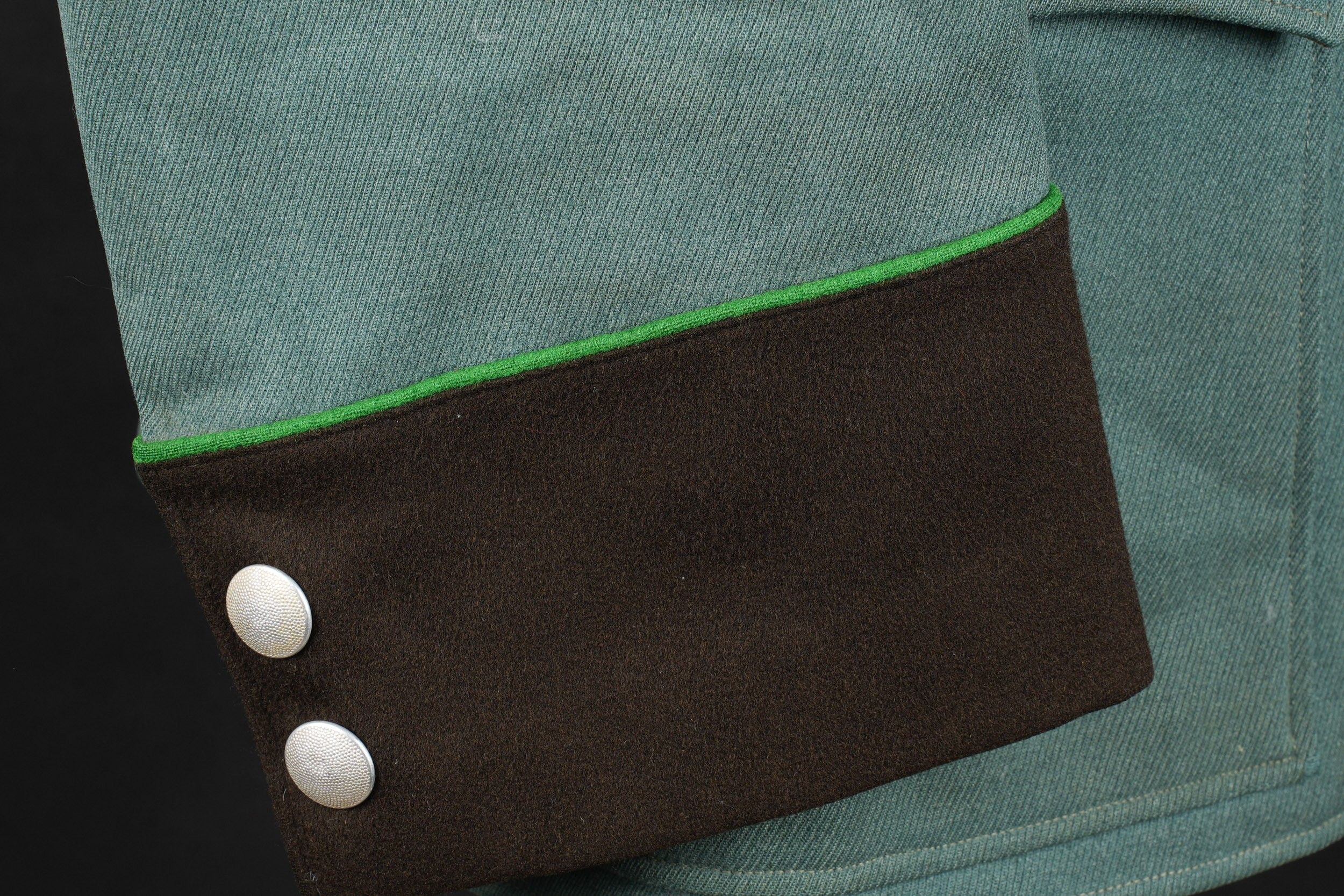 Polizei musician's jacket. In grey-green gabardine, all buttons are present. Collar lined with brown cloth. Hand-sewn non-commissioned officer's litzen. Hand-sewn Polizei sleeve eagle. Polizei honeycomb. Meister shoulder tabs. The badges and honeycombs have not been removed in order to check the back. Lined with green sateen. Label of the tailor Oscar Lange Magdeburg. There is some wear and patina to the piece, as well as stains and moth marks. Condition II+. Polizei musician tunic Grey-green gabardine, all buttons present. Brown wool collar lining. Hand-sewn NCO Litzen and hand-sewn Polizei sleeve eagle. Polizei honeycomb musician's badge. Shoulder boards for Meister. Insignia and sleeve patches not removed for examination. Green satin lining with tailor's label Oscar Lange, Magdeburg. Shows wear, patina, stains, and moth traces. Condition II+.