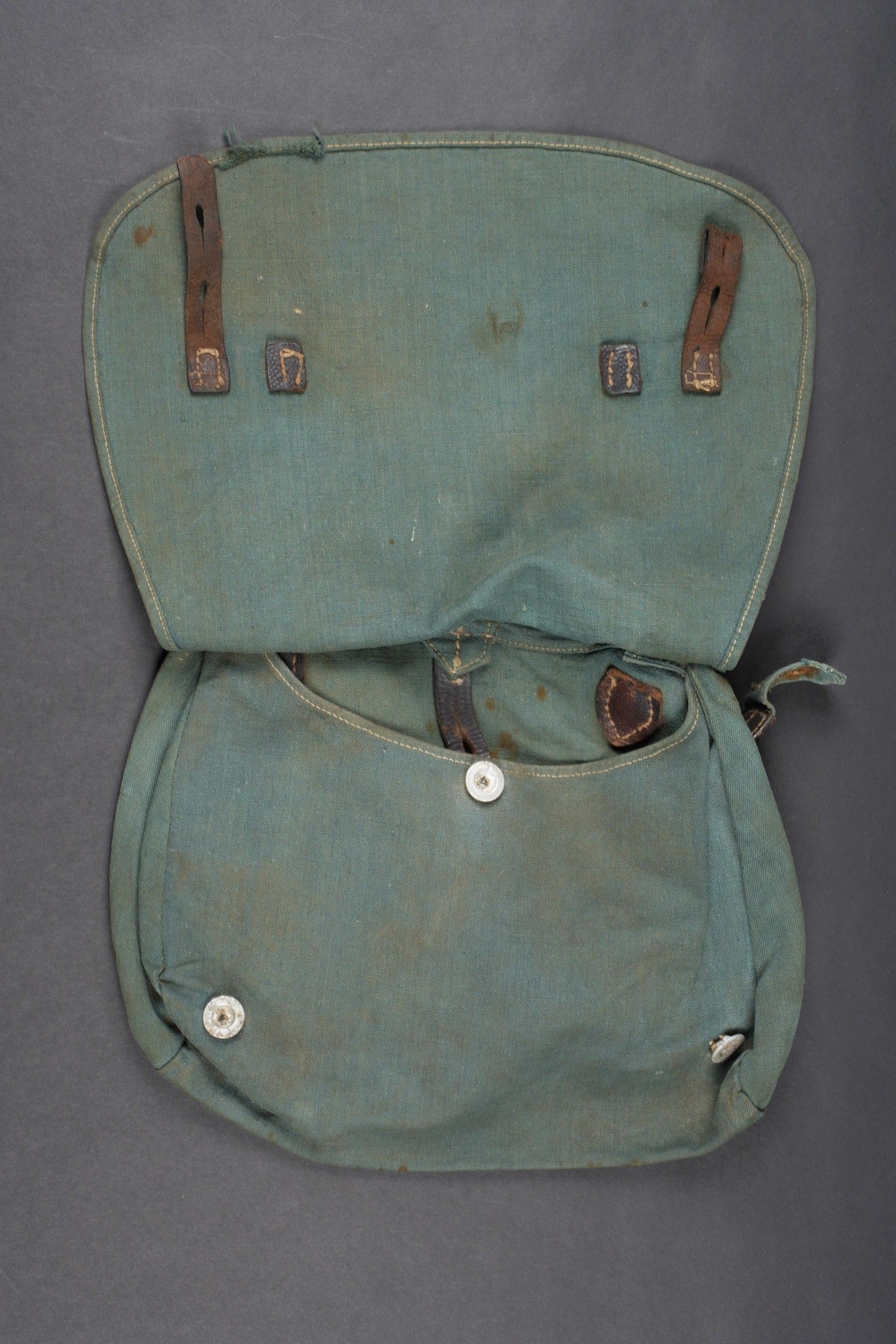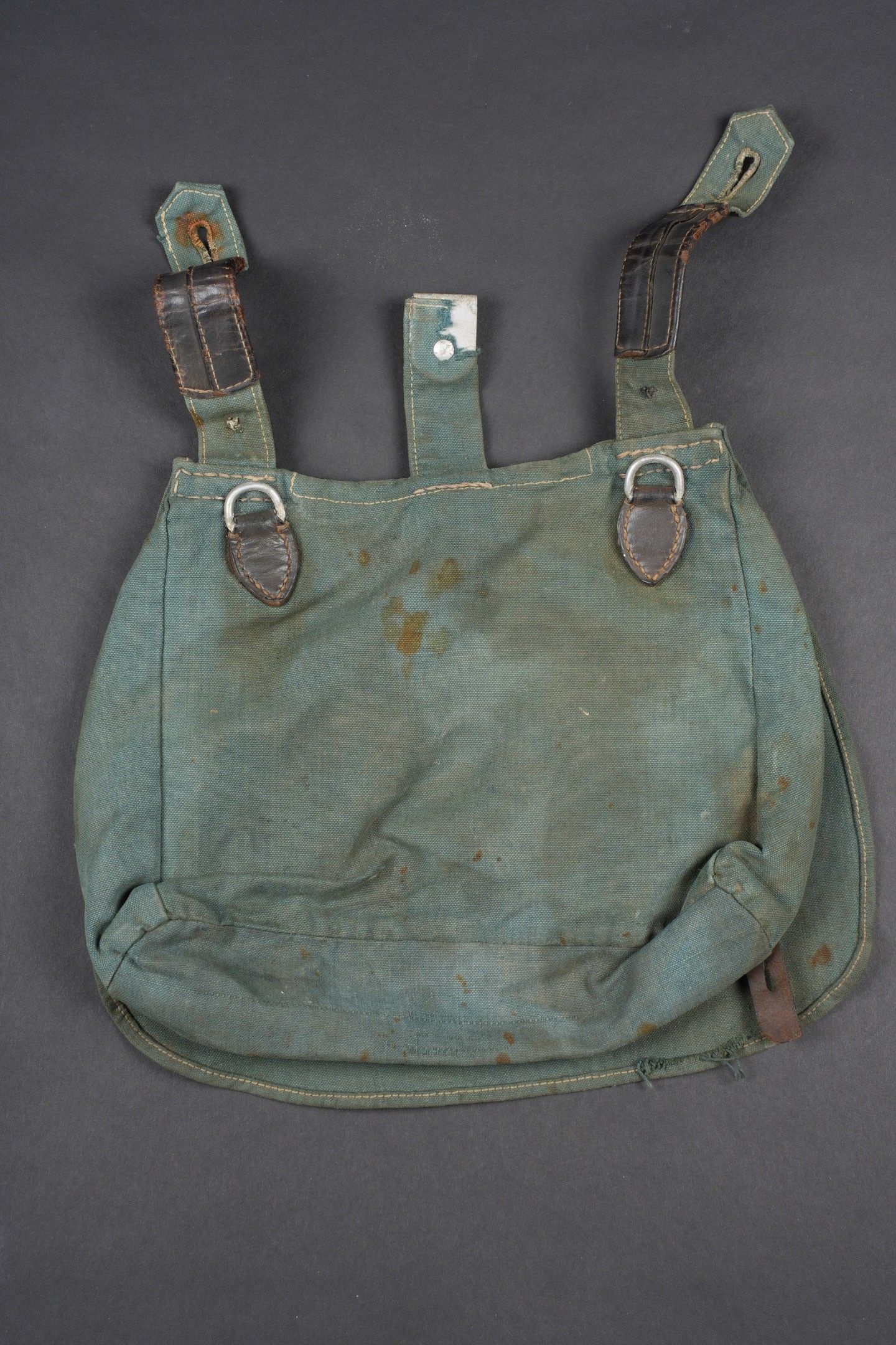 Polizei bread bag. Grey-green fabric and black leather. The carrying strap is missing. No visible markings. There is some wear and patina to the item, as well as stains and tears. Condition II+. Polizei bread bag Made of grey-green fabric and black leather. Carrying strap missing. No visible markings. Shows some wear and patina, with stains and small tears. Condition II+.