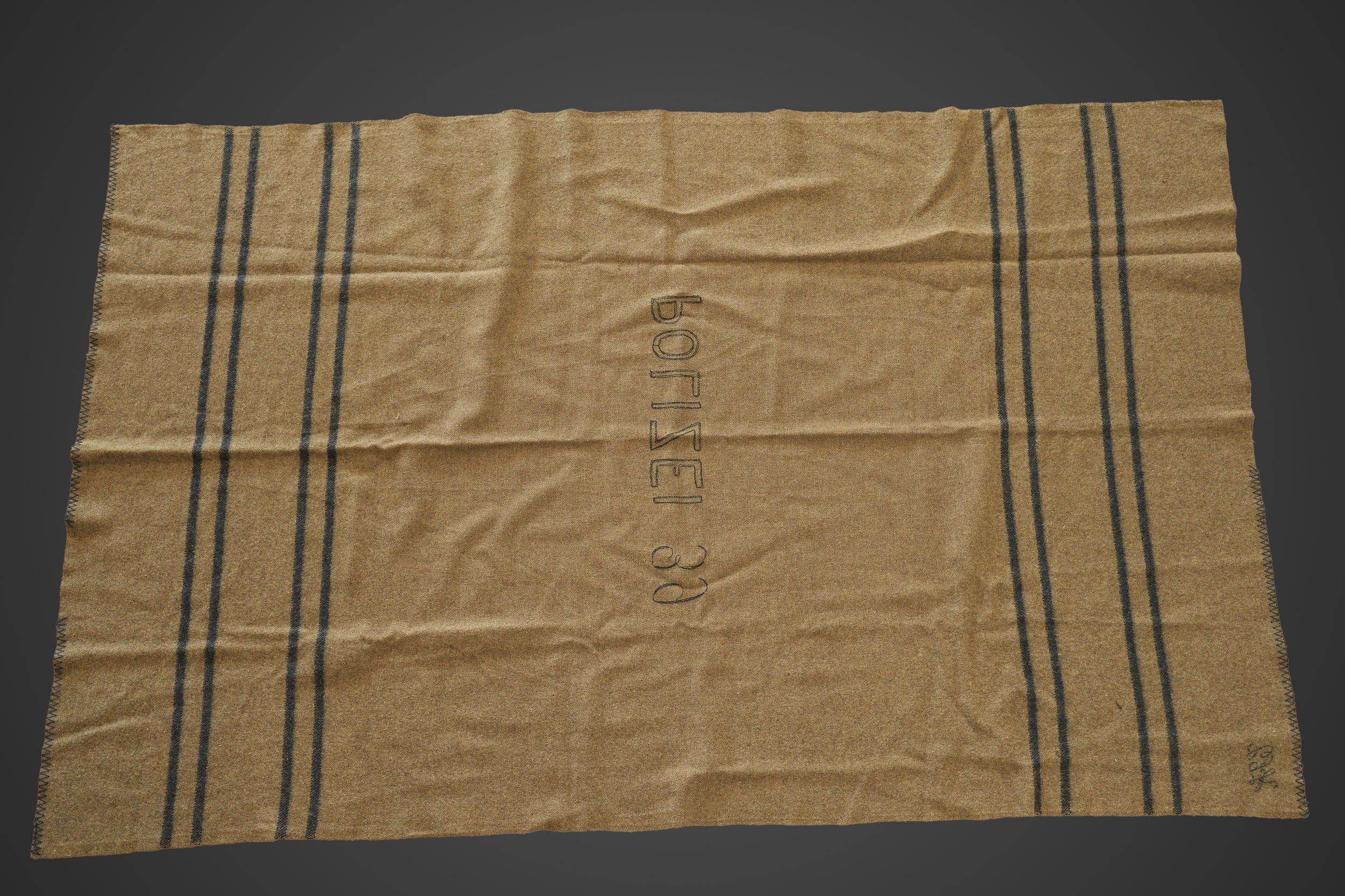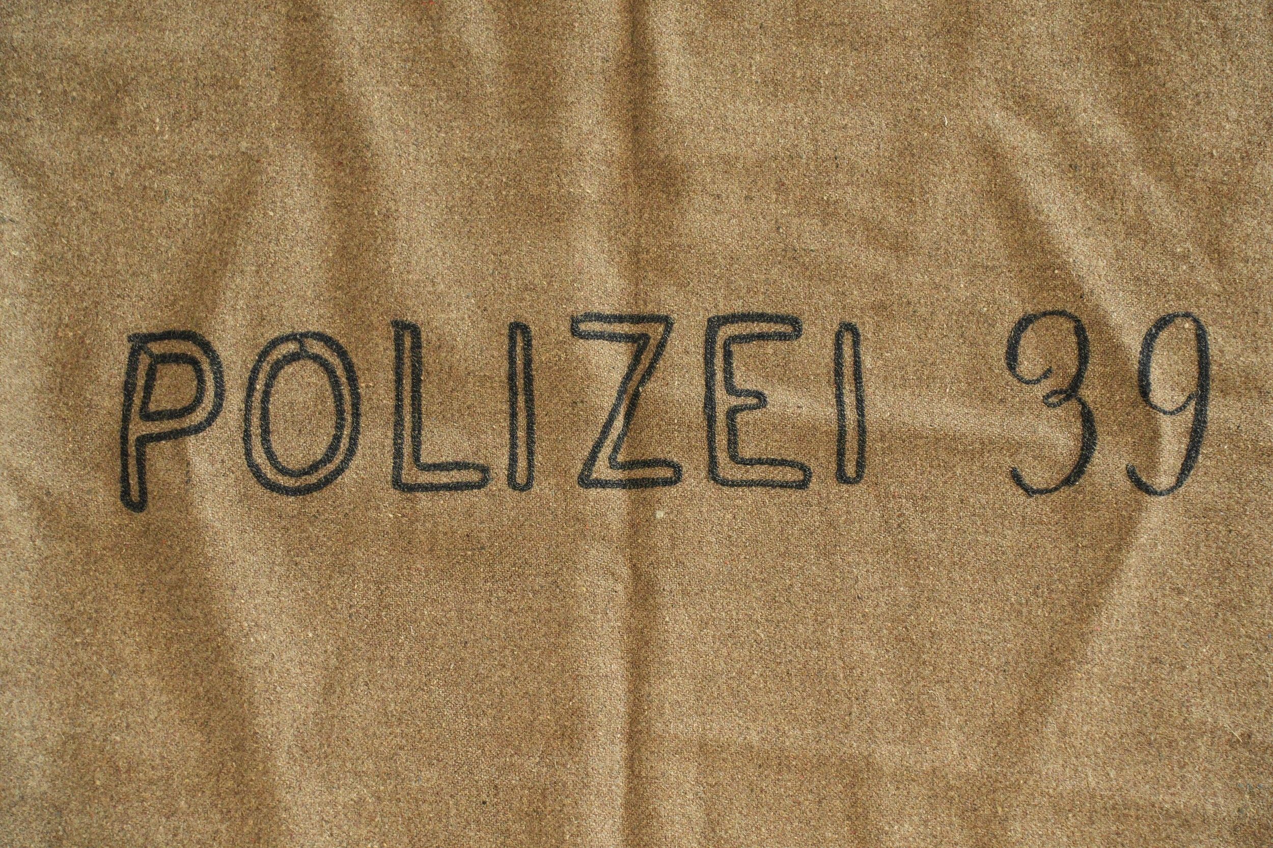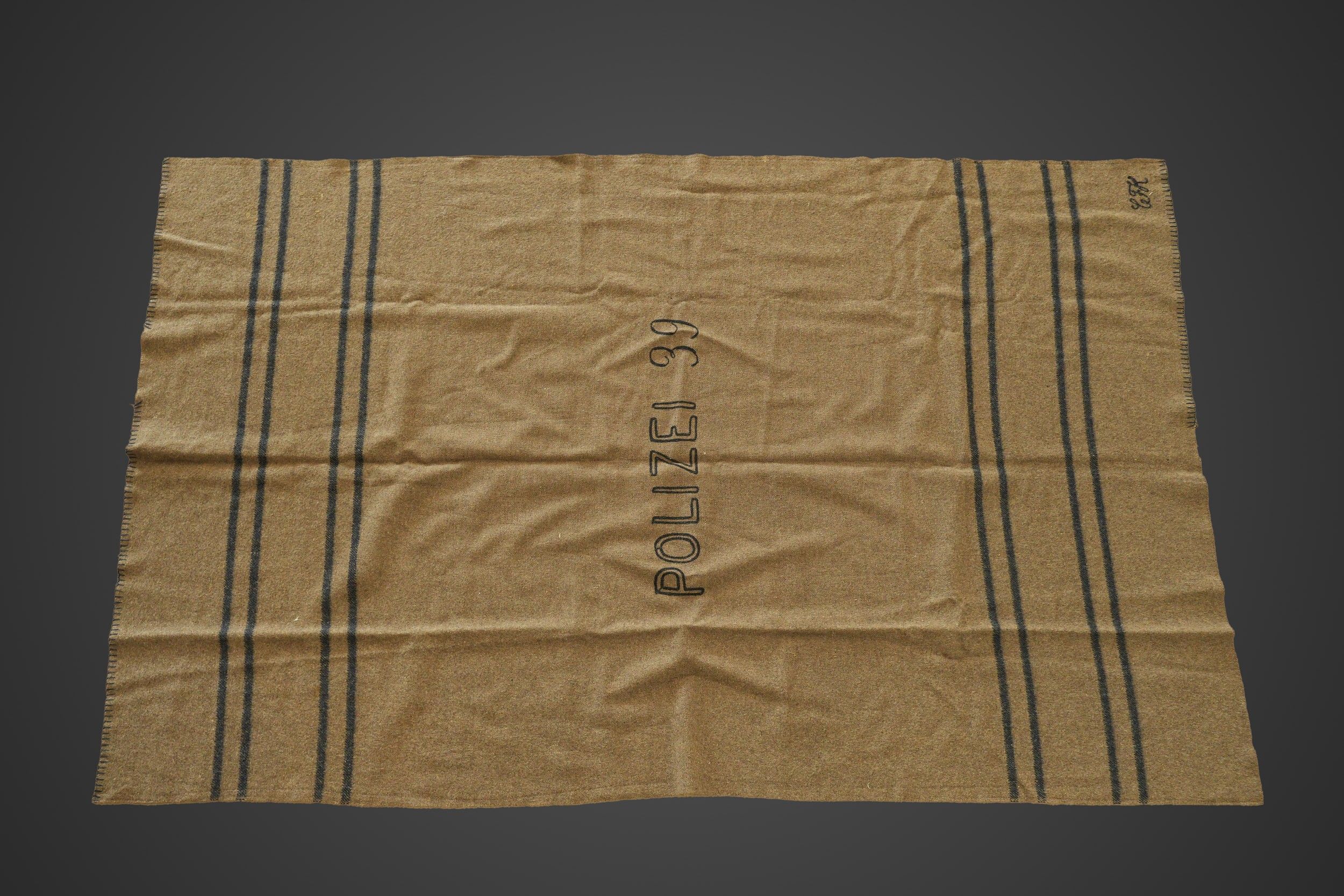 Polizei blanket. In brown cloth. Embroidered Polizei 39 and CFK markings. Some wear and patina to be noted, as well as a few moth marks. Condition II+. Polizei blanket Brown wool blanket, embroidered marking Polizei 39 and CFK. Shows some wear and patina, with minor moth traces. Condition II+.