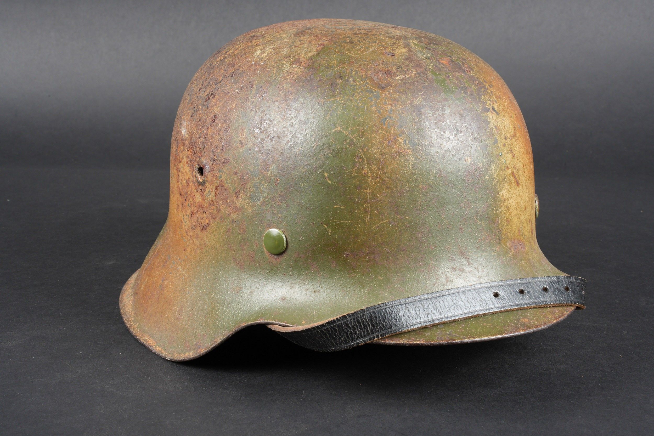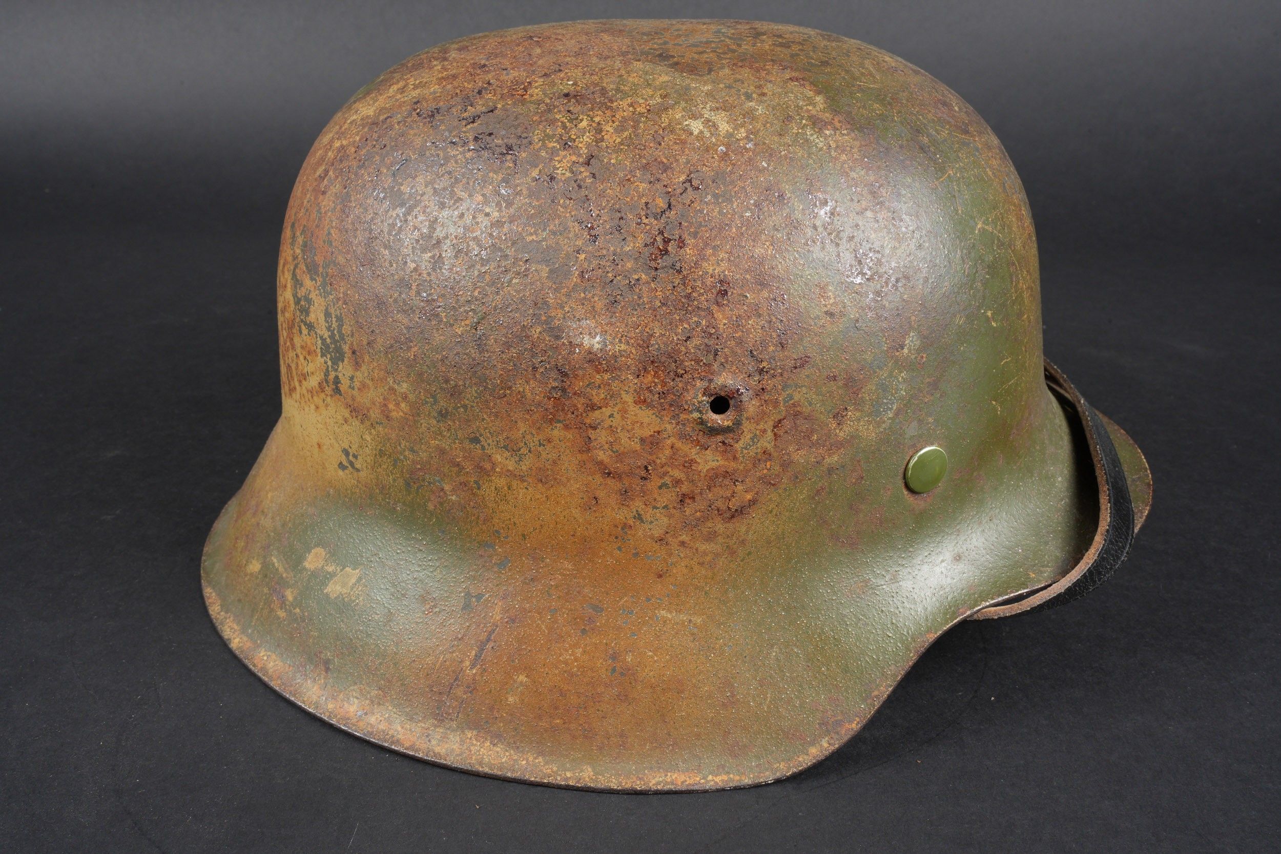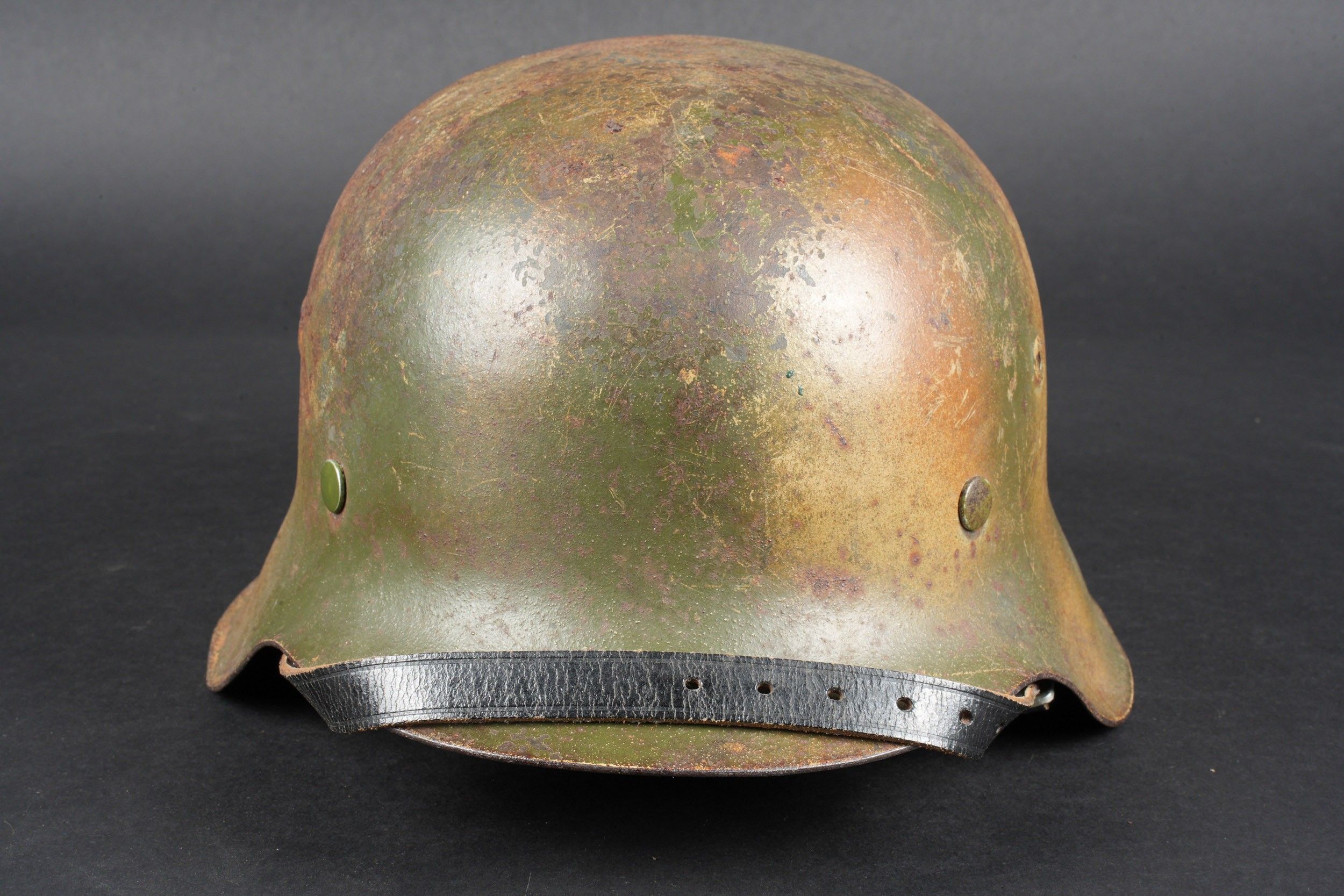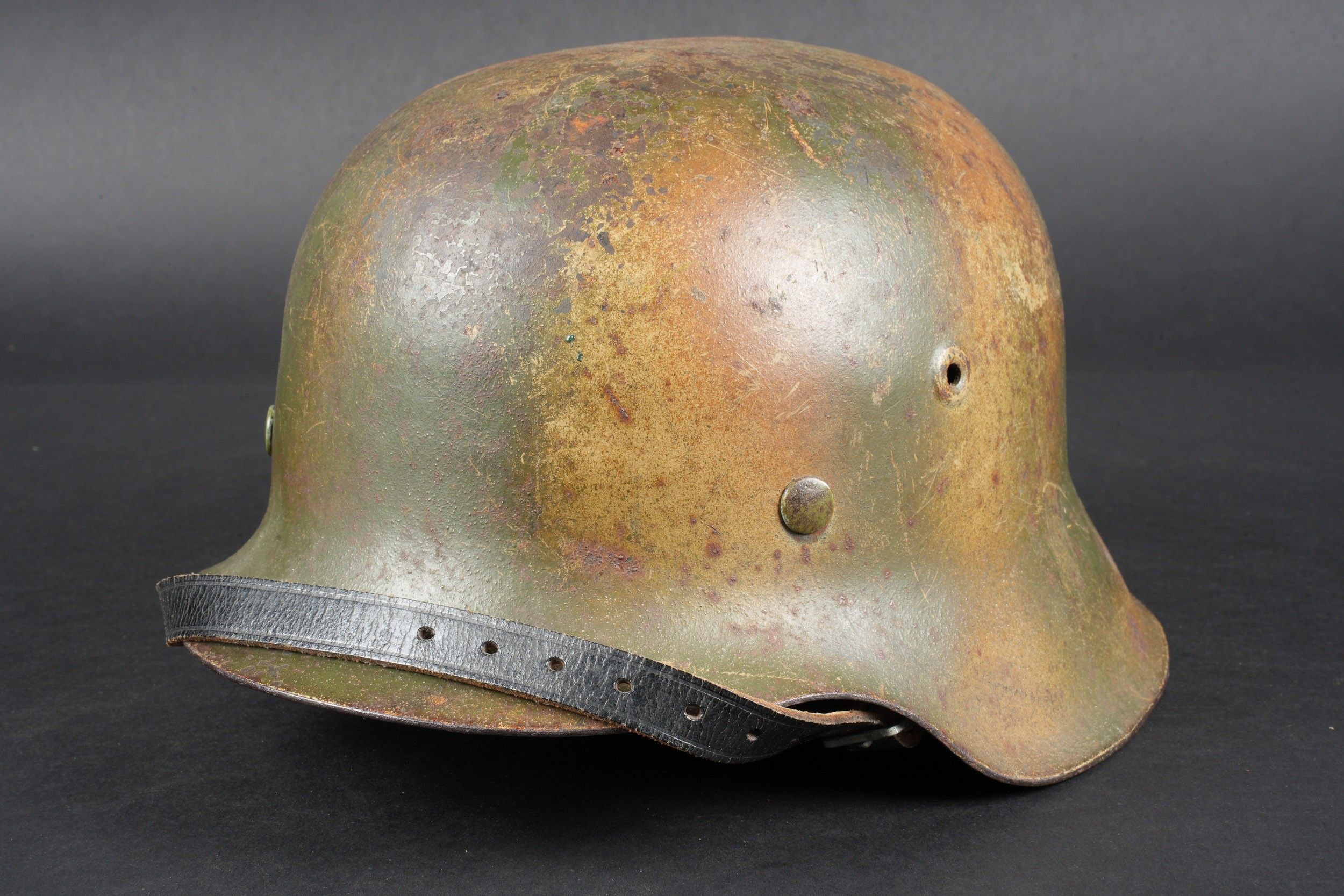 Camouflaged Heer helmet. M-42 helmet shell. Made by EF 64. Lot number 363. Complete leather cap. Drawstring is present. Relatively soft leather. Black leather chinstrap, made by FTB 4. Two rivets are repainted later. Two-tone green camouflage paint at 70%. Some wear and patina. Condition II+. Heer camouflage helmet M42 shell, maker EF 64, lot number 363. Complete leather liner with drawstring, supple leather. Black leather chinstrap, maker FTB 4. Two rivets repainted postwar. Two-tone greenochre camouflage paint retained at 70%. Shows some wear and patina. Condition II+.