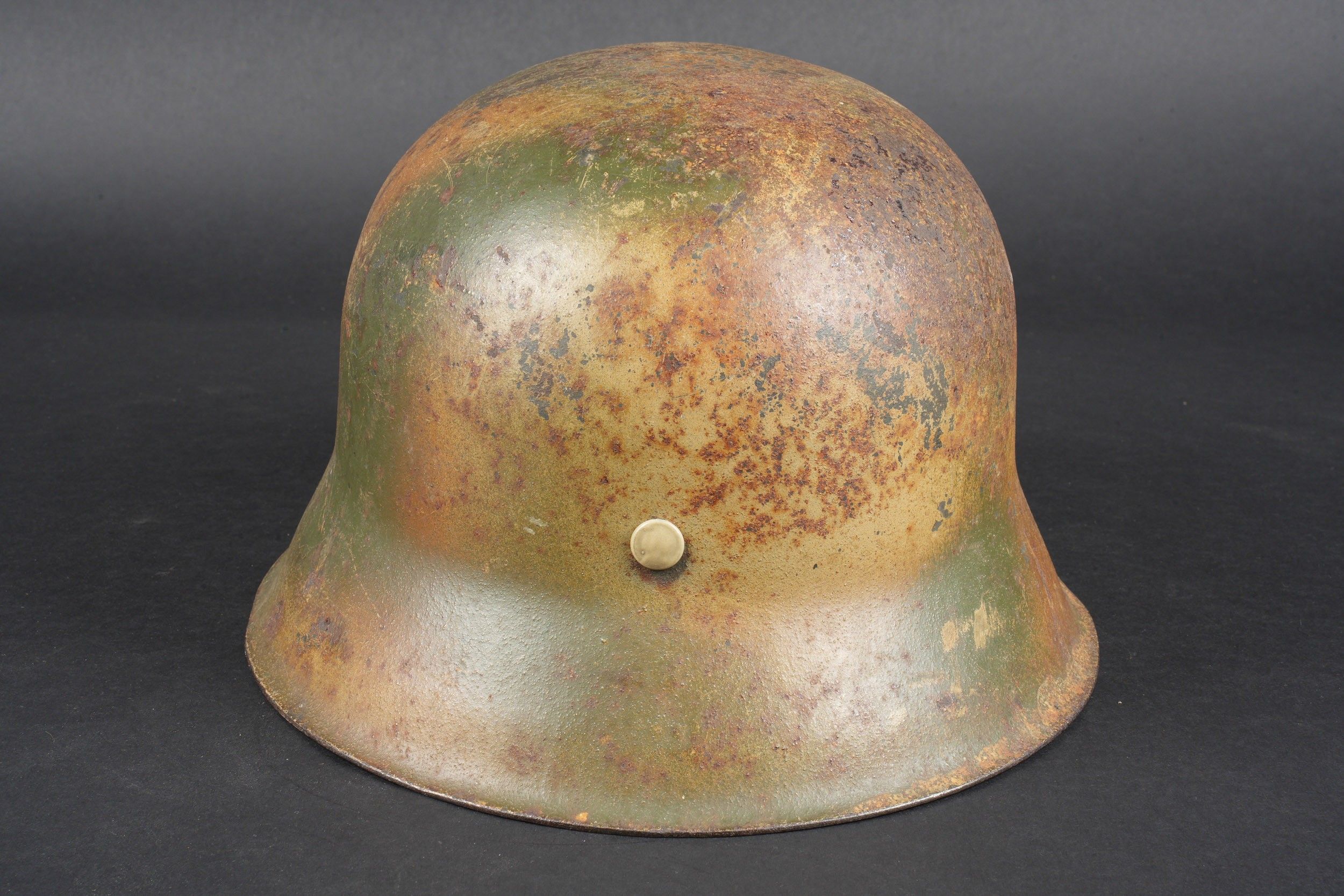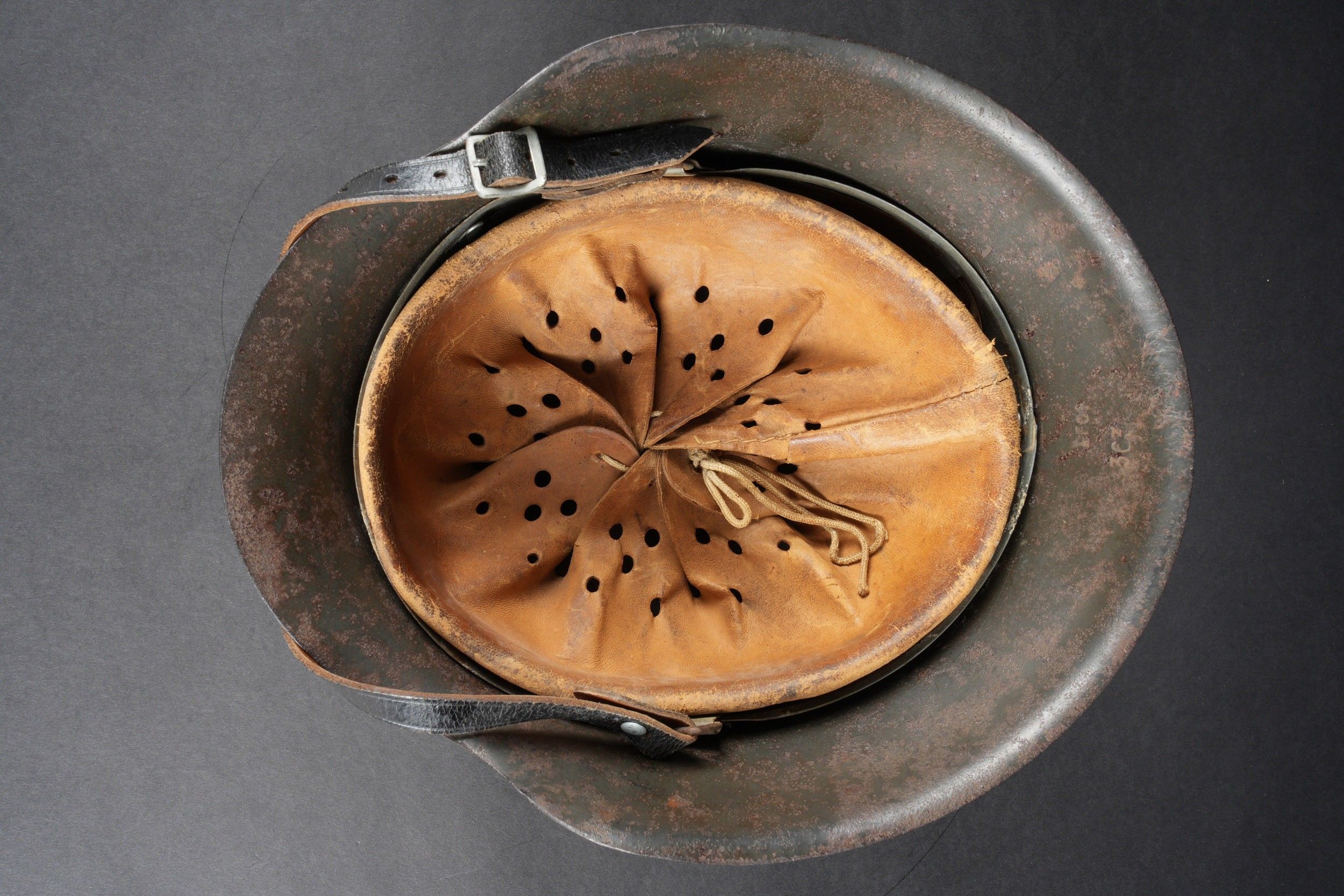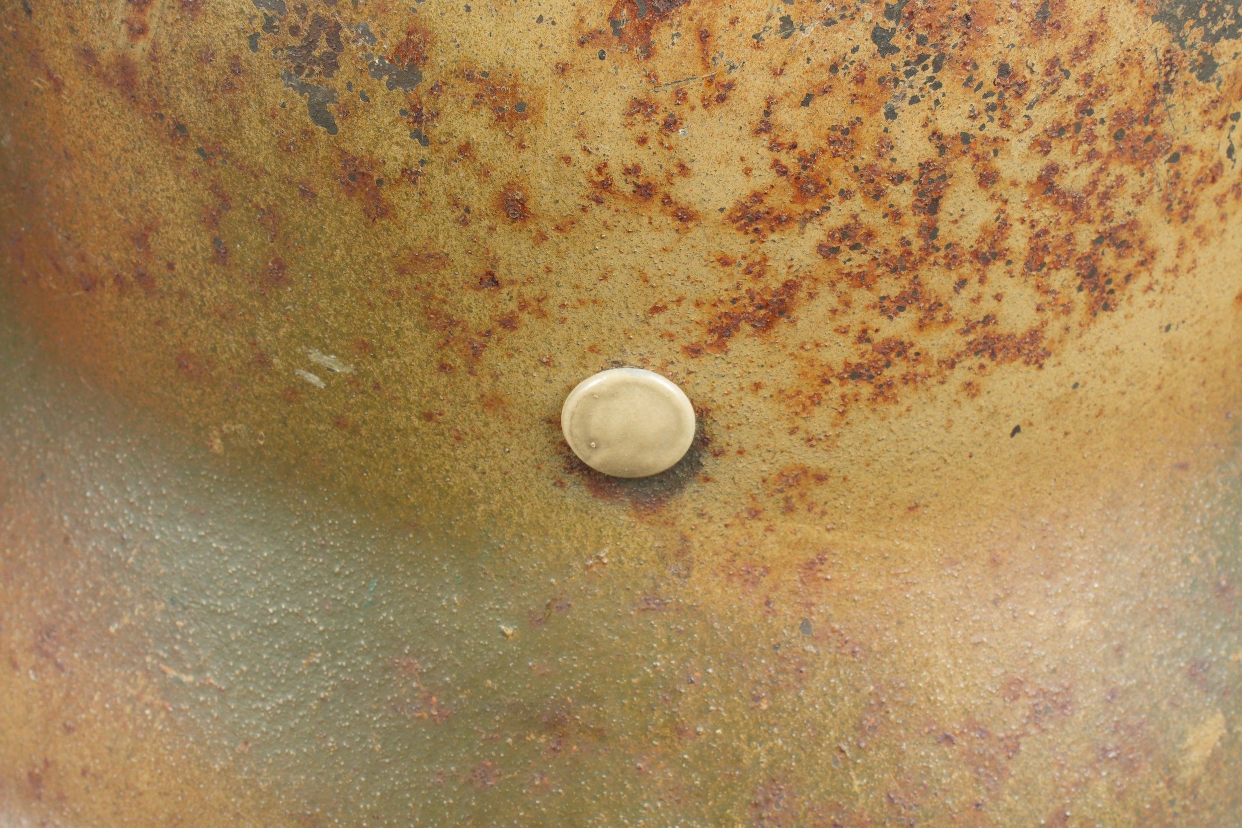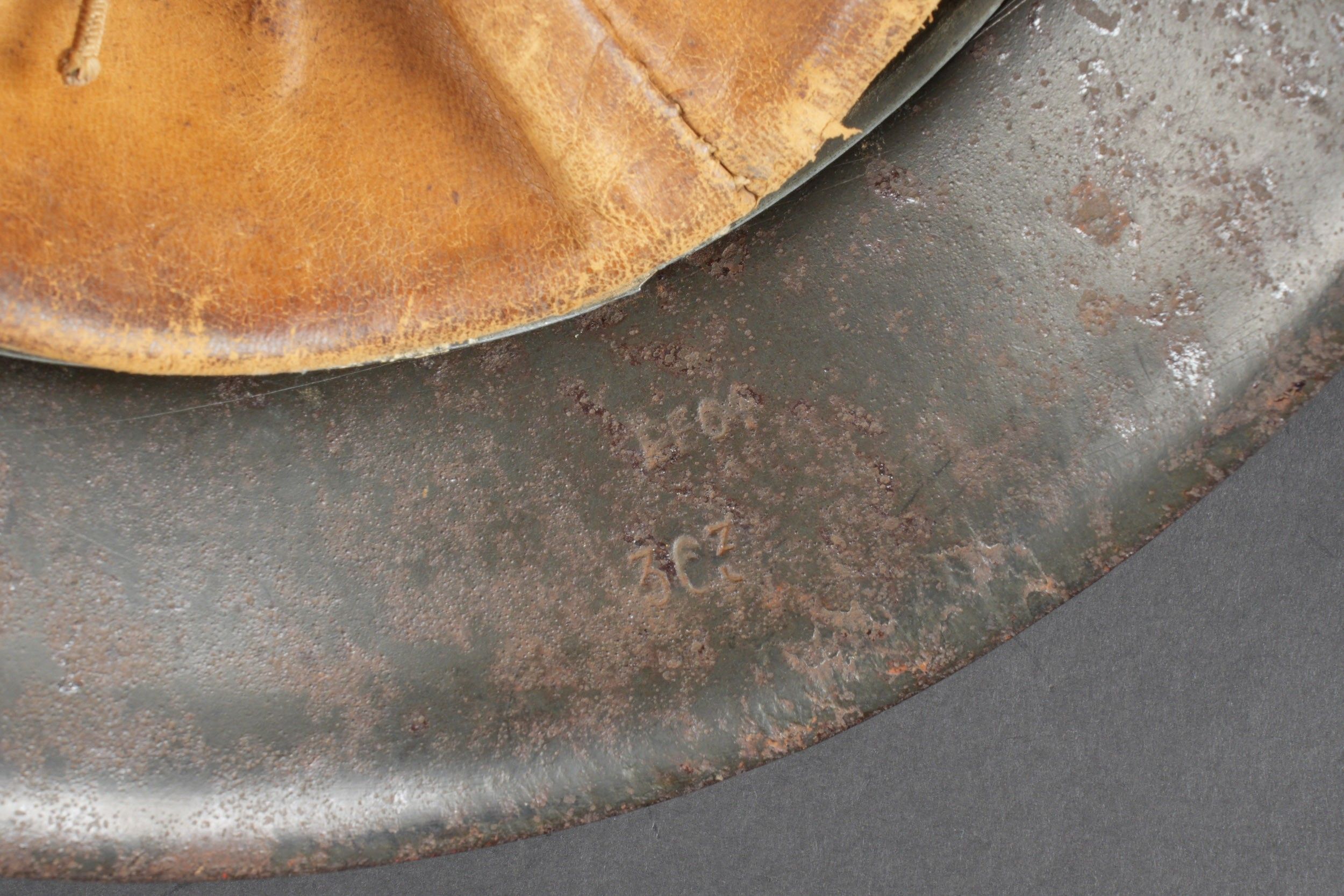 Camouflaged Heer helmet. M-42 helmet shell. Made by EF 64. Lot number 363. Complete leather cap. Drawstring is present. Relatively soft leather. Black leather chinstrap, made by FTB 4. Two rivets are repainted later. Two-tone green camouflage paint at 70%. Some wear and patina. Condition II+. Heer camouflage helmet M42 shell, maker EF 64, lot number 363. Complete leather liner with drawstring, supple leather. Black leather chinstrap, maker FTB 4. Two rivets repainted postwar. Two-tone greenochre camouflage paint retained at 70%. Shows some wear and patina. Condition II+.