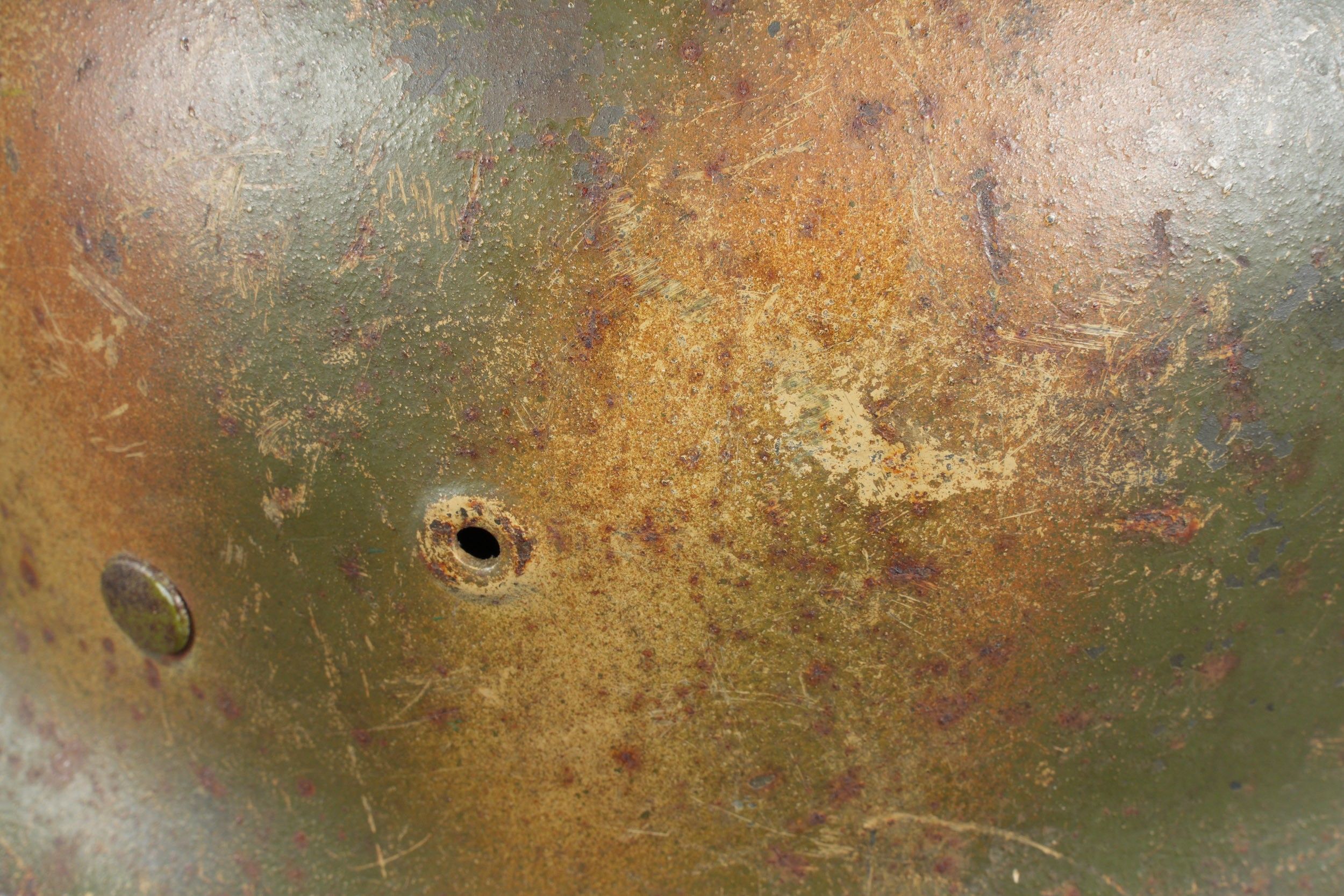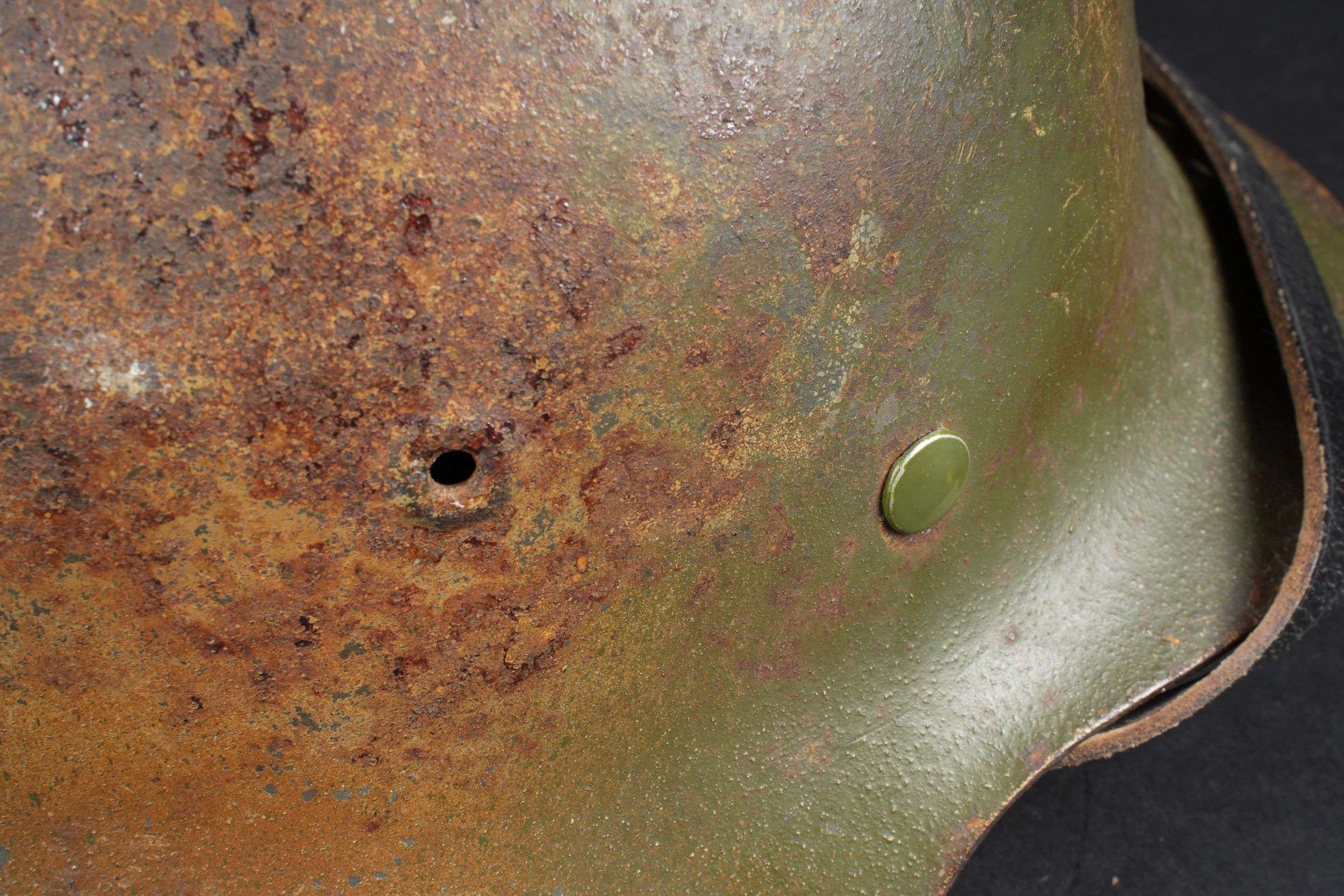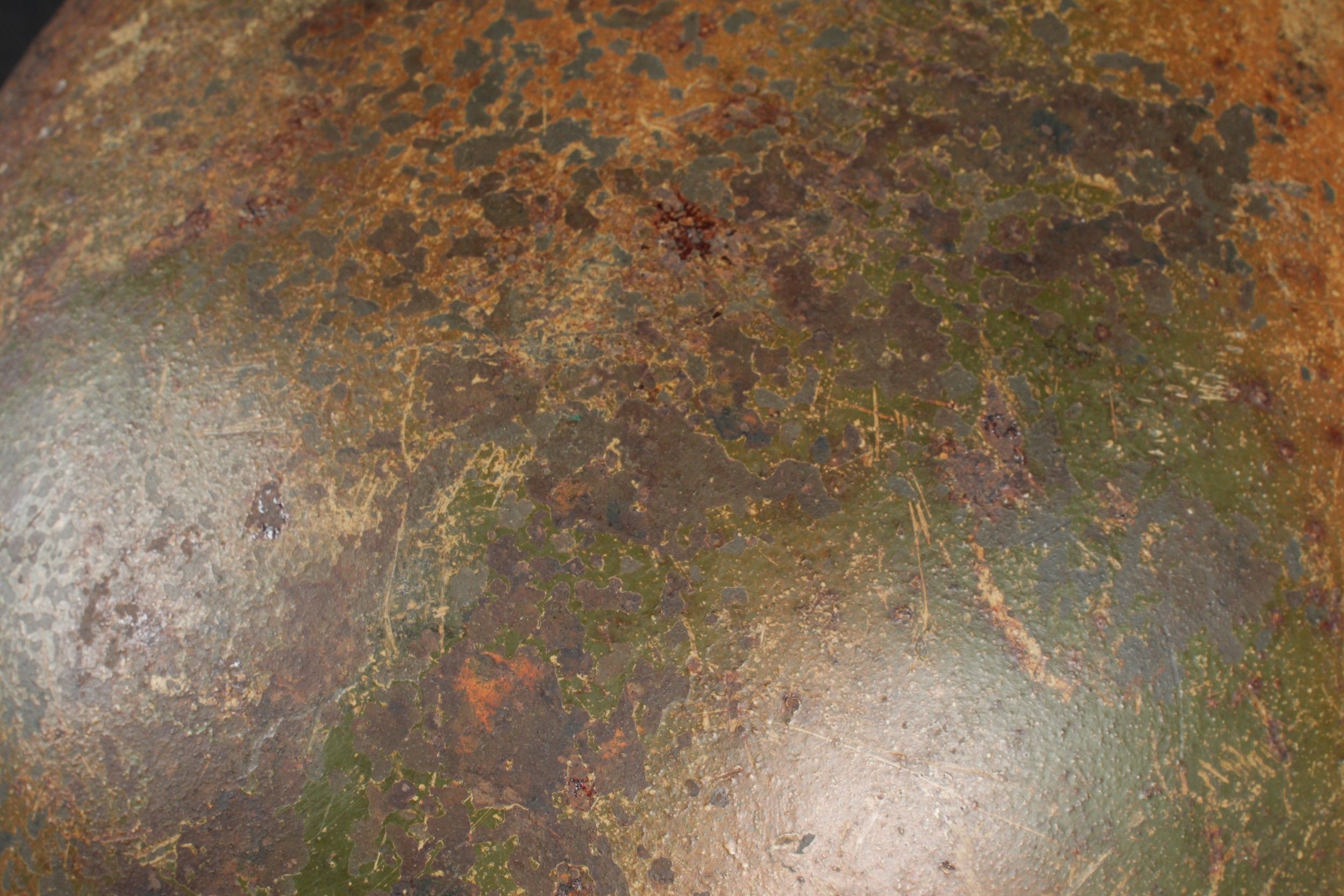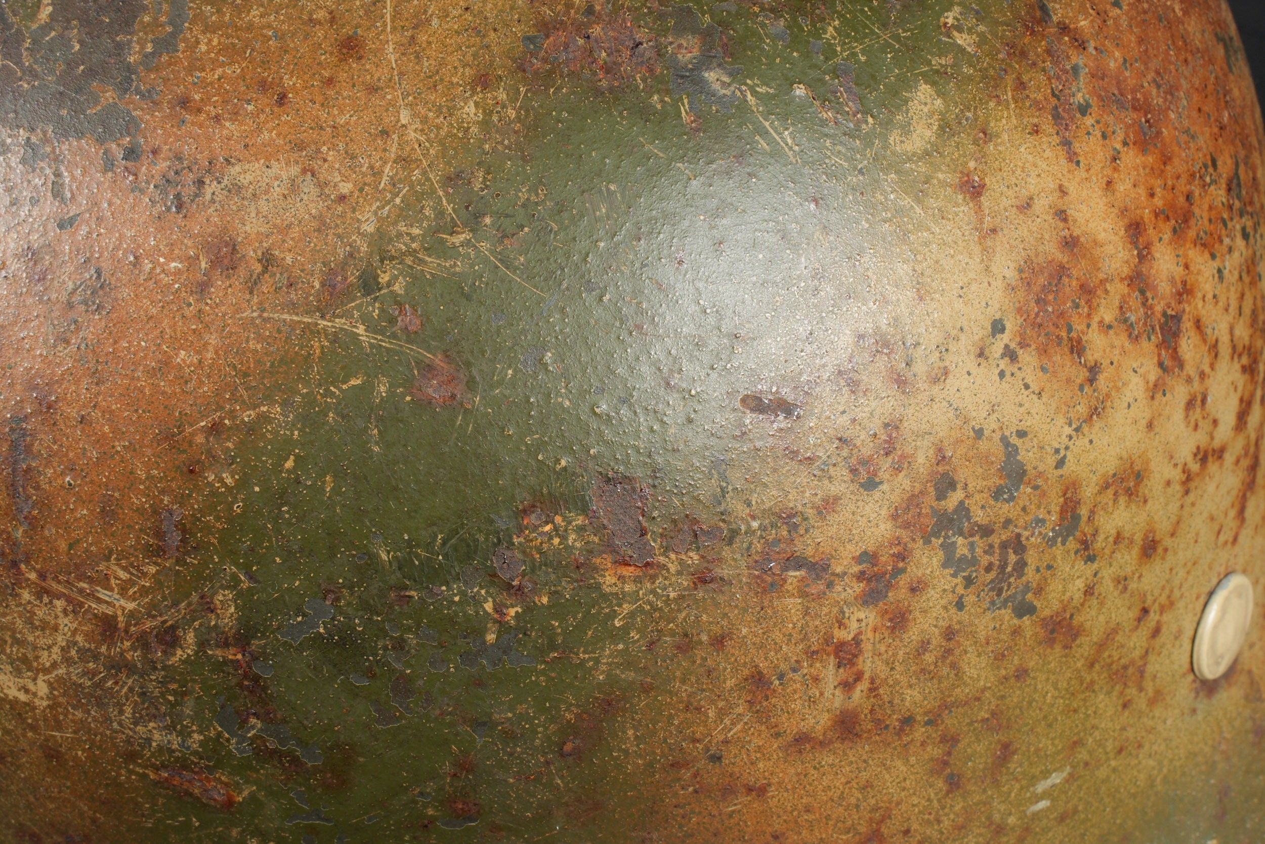 Camouflaged Heer helmet. M-42 helmet shell. Made by EF 64. Lot number 363. Complete leather cap. Drawstring is present. Relatively soft leather. Black leather chinstrap, made by FTB 4. Two rivets are repainted later. Two-tone green camouflage paint at 70%. Some wear and patina. Condition II+. Heer camouflage helmet M42 shell, maker EF 64, lot number 363. Complete leather liner with drawstring, supple leather. Black leather chinstrap, maker FTB 4. Two rivets repainted postwar. Two-tone greenochre camouflage paint retained at 70%. Shows some wear and patina. Condition II+.
